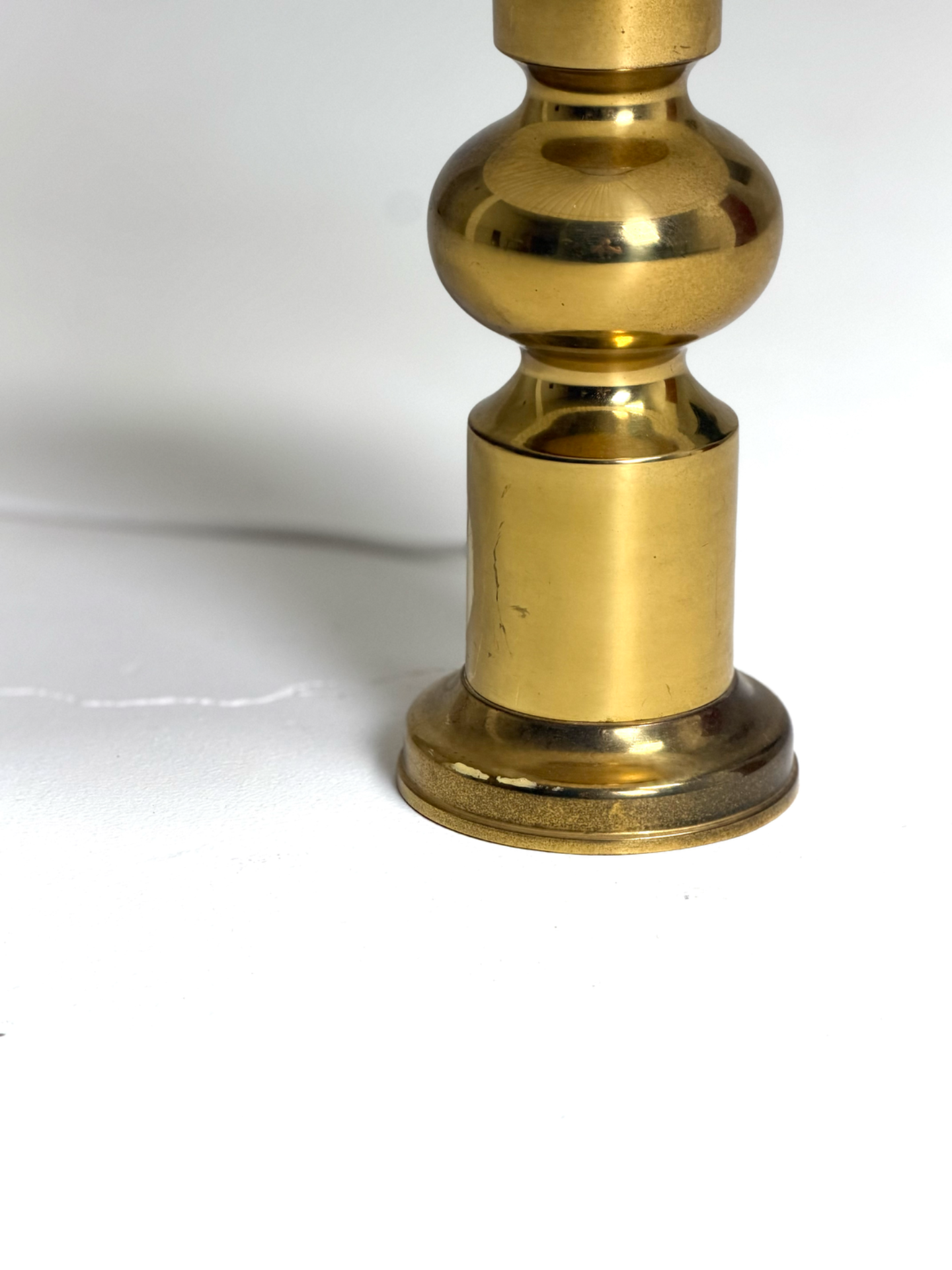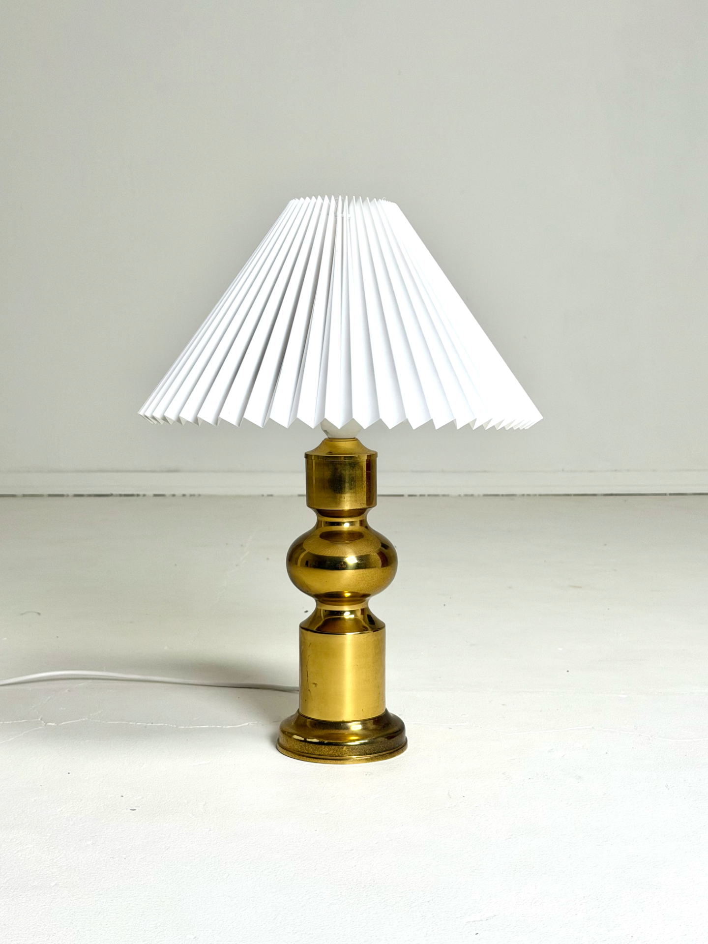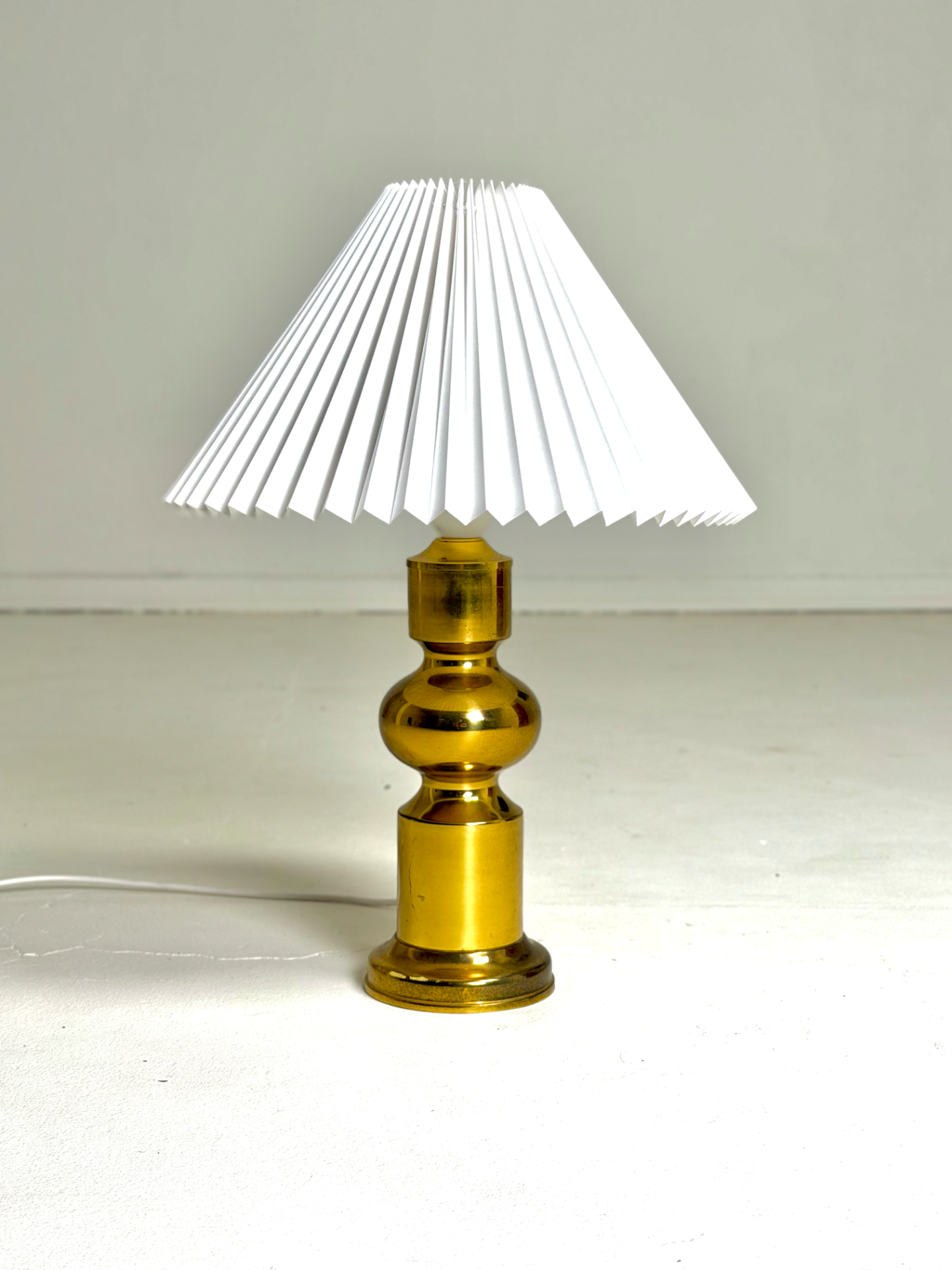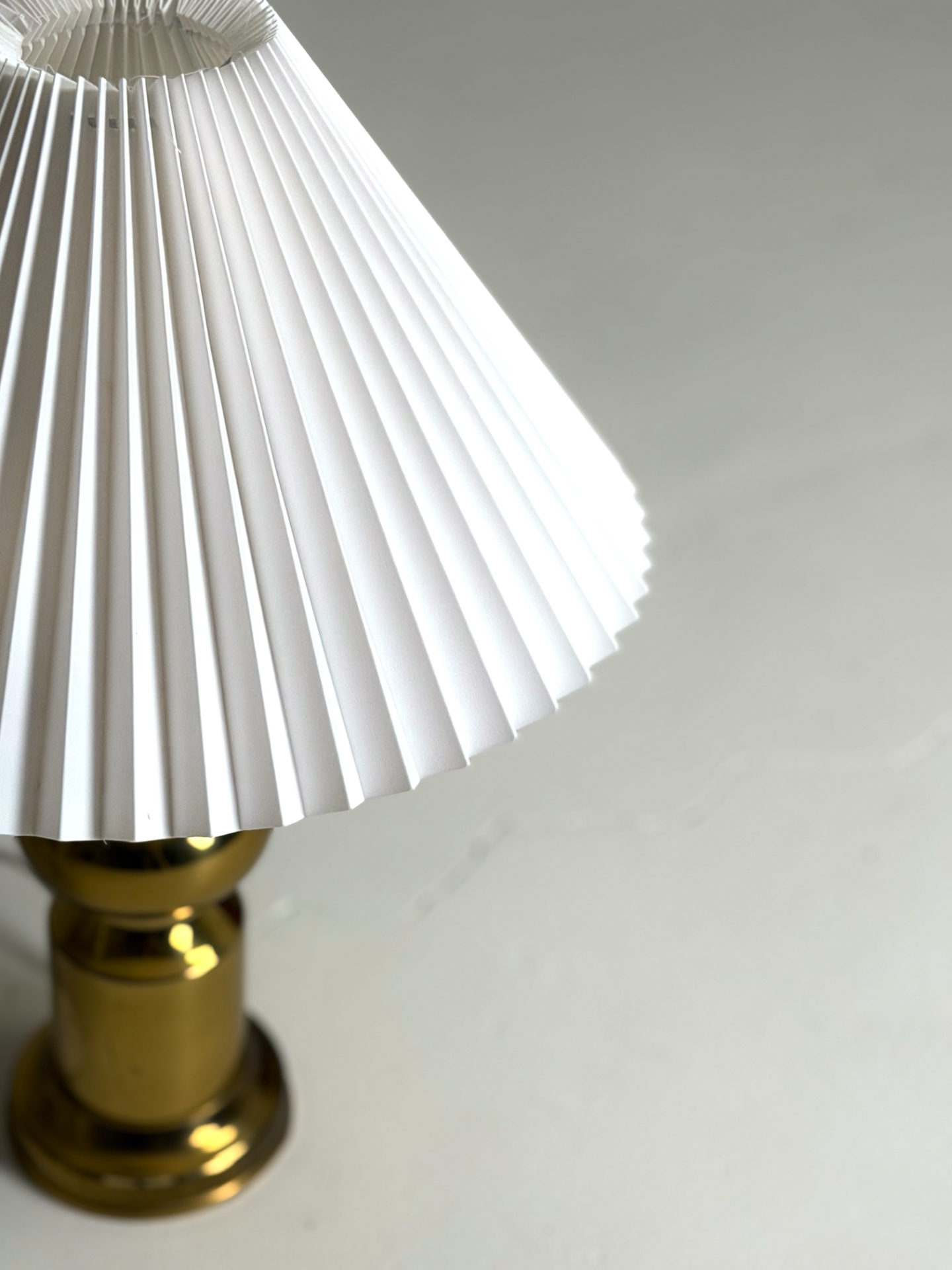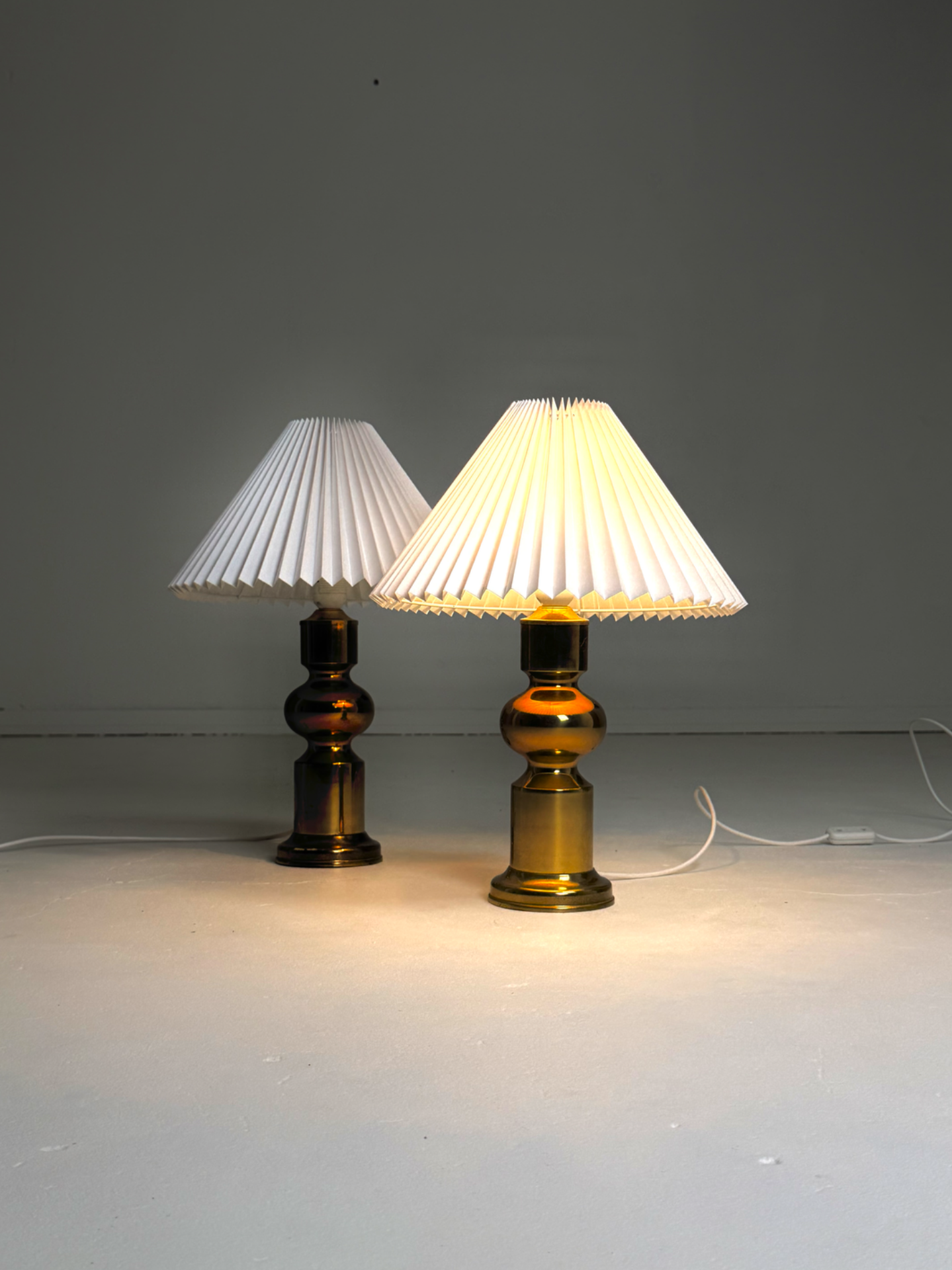 Elegantti ja näyttävä messinkinen pöytävalaisinpari 1960–70-luvun Tanskasta. Valaisimissa on kauniisti muotoiltu, kiiltäväpintainen messinkirunko ja ajattomat valkoiset laskosvarjostimet, jotka levittävät pehmeää valoa. Valmistaja Laoni. Täydellinen pari yöpöydille tai sivupöytien molemmin puolin tuomaan symmetriaa ja klassista tyyliä sisustukseen.