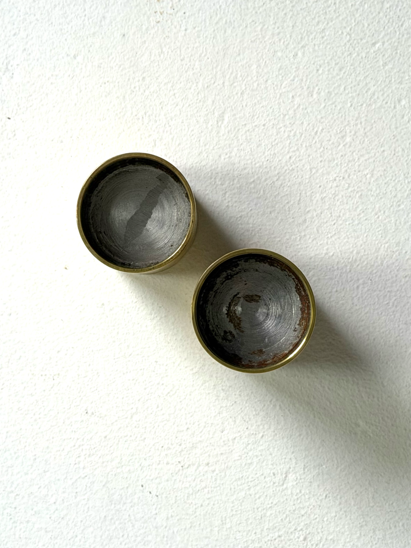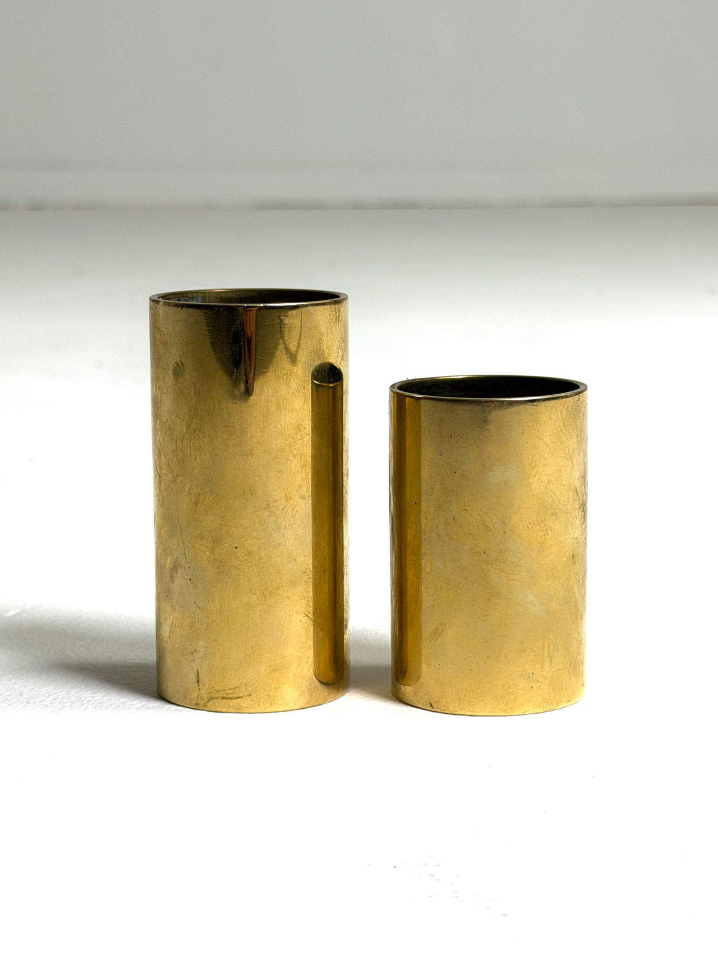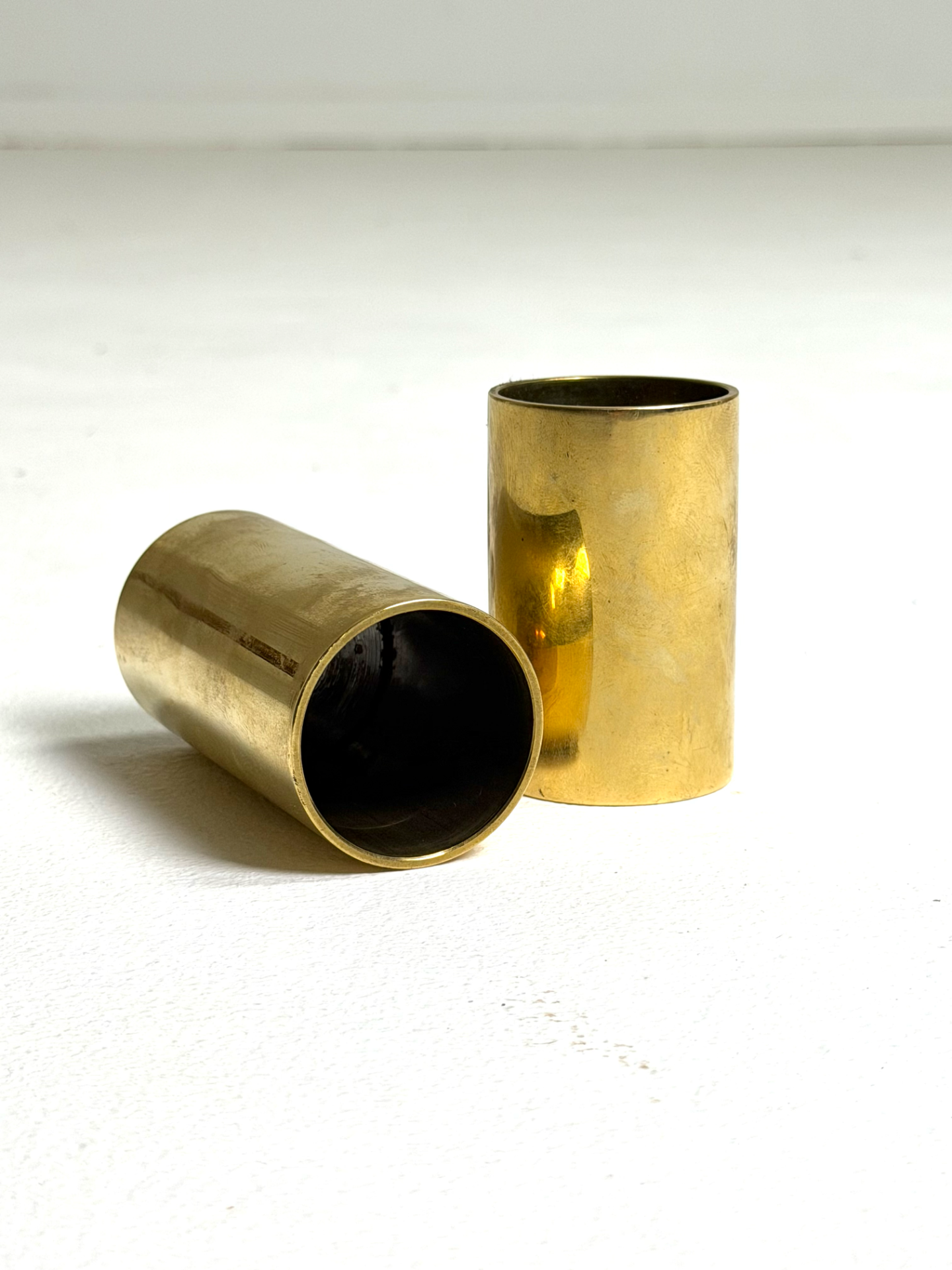 Elegantit messinkiset tuikkuastiat 1960–70-luvun Tanskasta. Minimalistinen sylinterimäinen muoto ja lämmin messingin patina luovat tunnelmallisen valon ja ajattoman ilmeen.