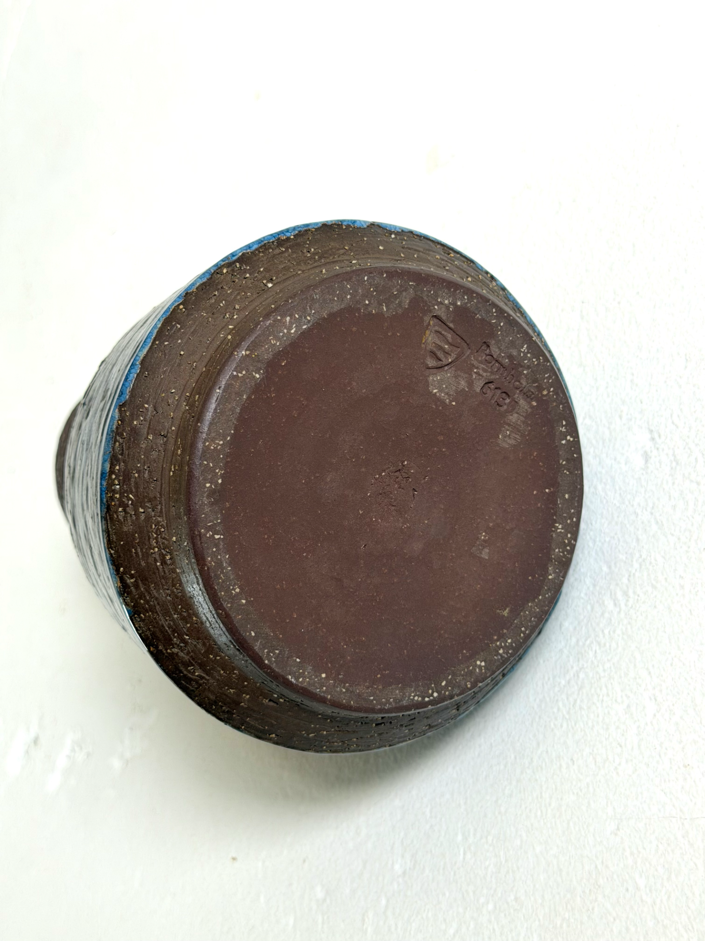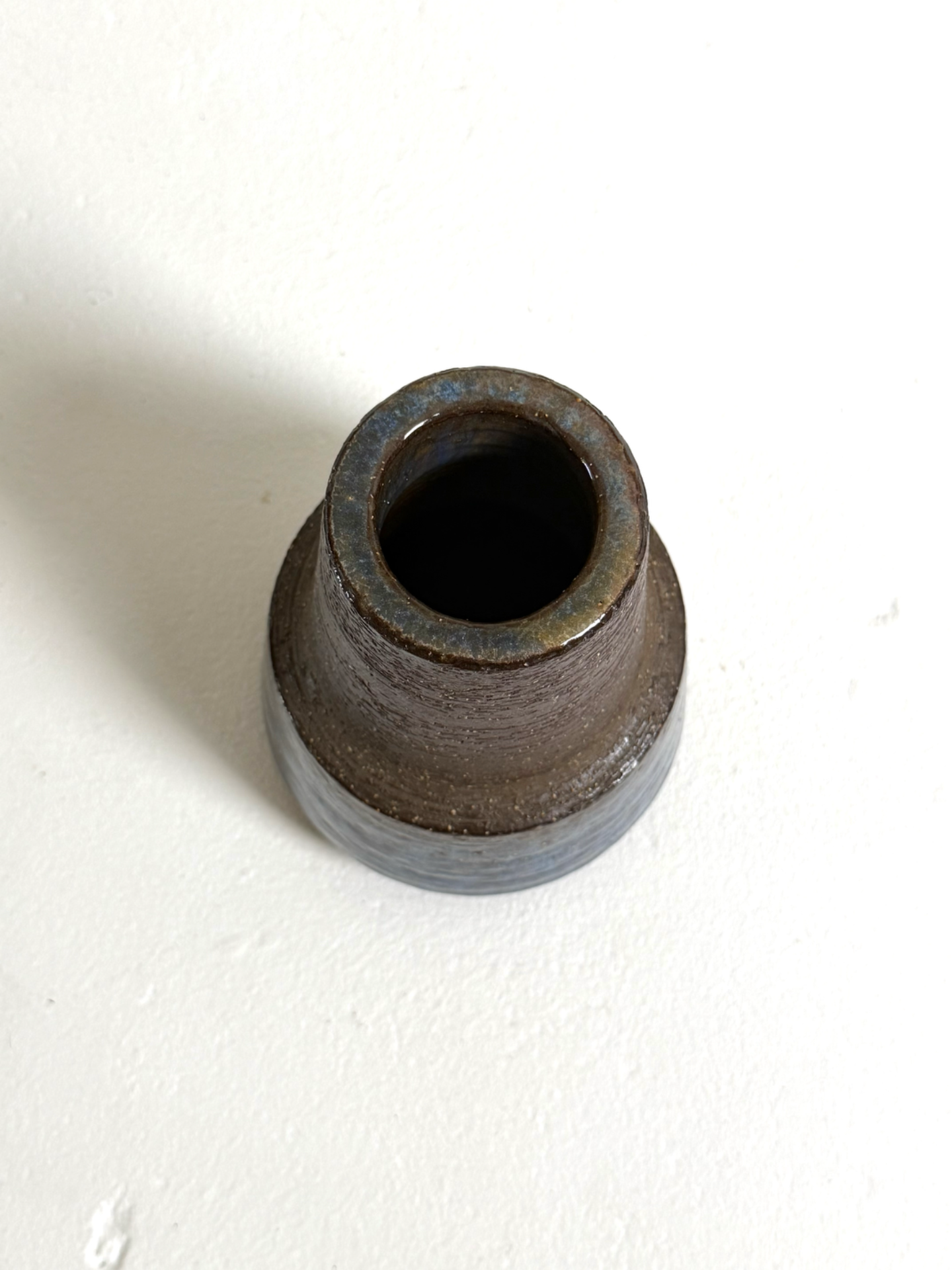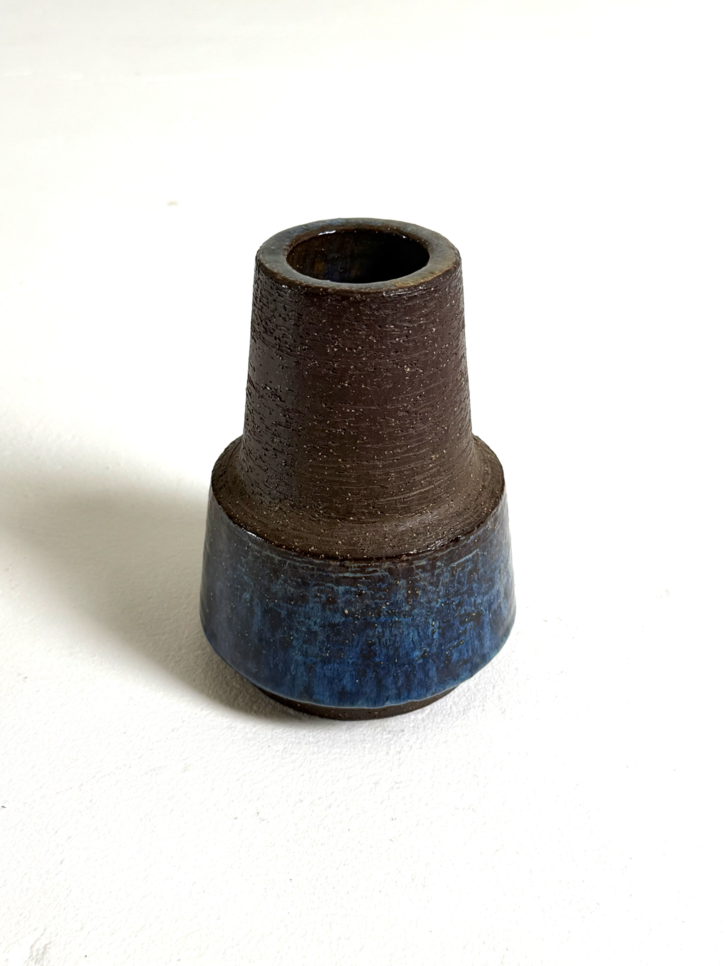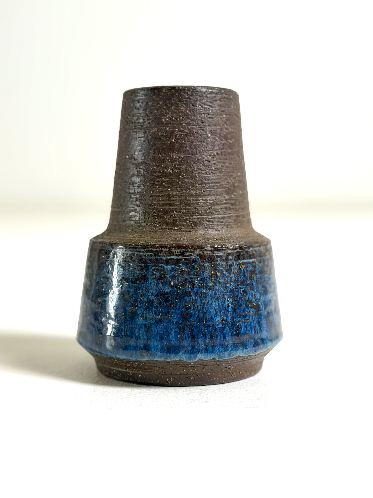 Tyylikäs tanskalainen keraaminen vaasi, jonka on suunnitellut Michael Andersen ja valmistanut Bornholmin keramiikkatehdas 1960-luvulla. Veistoksellinen muoto yhdistyy kauniiseen, kaksisävyiseen lasitteeseen: syvä, elävä sininen alaosassa ja rouhea, maanläheinen ruskea yläosassa.