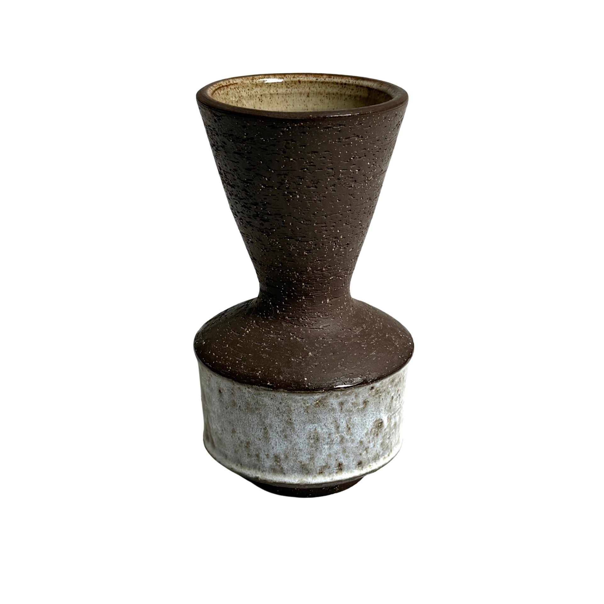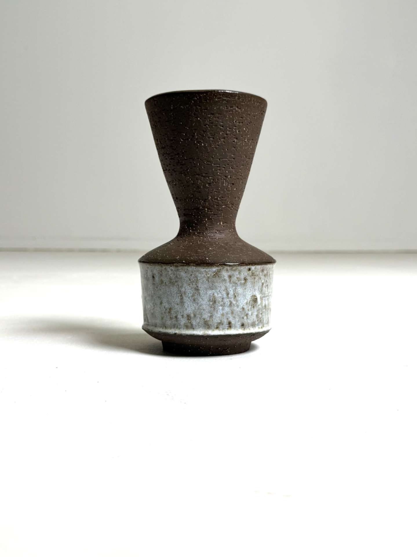 Tanskalaisen keramiikkamestarin Michael Andersenin 1960-luvulla suunnittelema vaasi. Valmistettu Bornholmissa. Veistoksellinen muoto ja kaunis kontrasti mattaruskean ja vaalean lasitteen välillä tekevät tästä maljakosta näyttävän esineen sellaisenaan tai osana asetelmaa. Laadukas vintage-esine keräilijälle tai estetiikkaa arvostavalle.