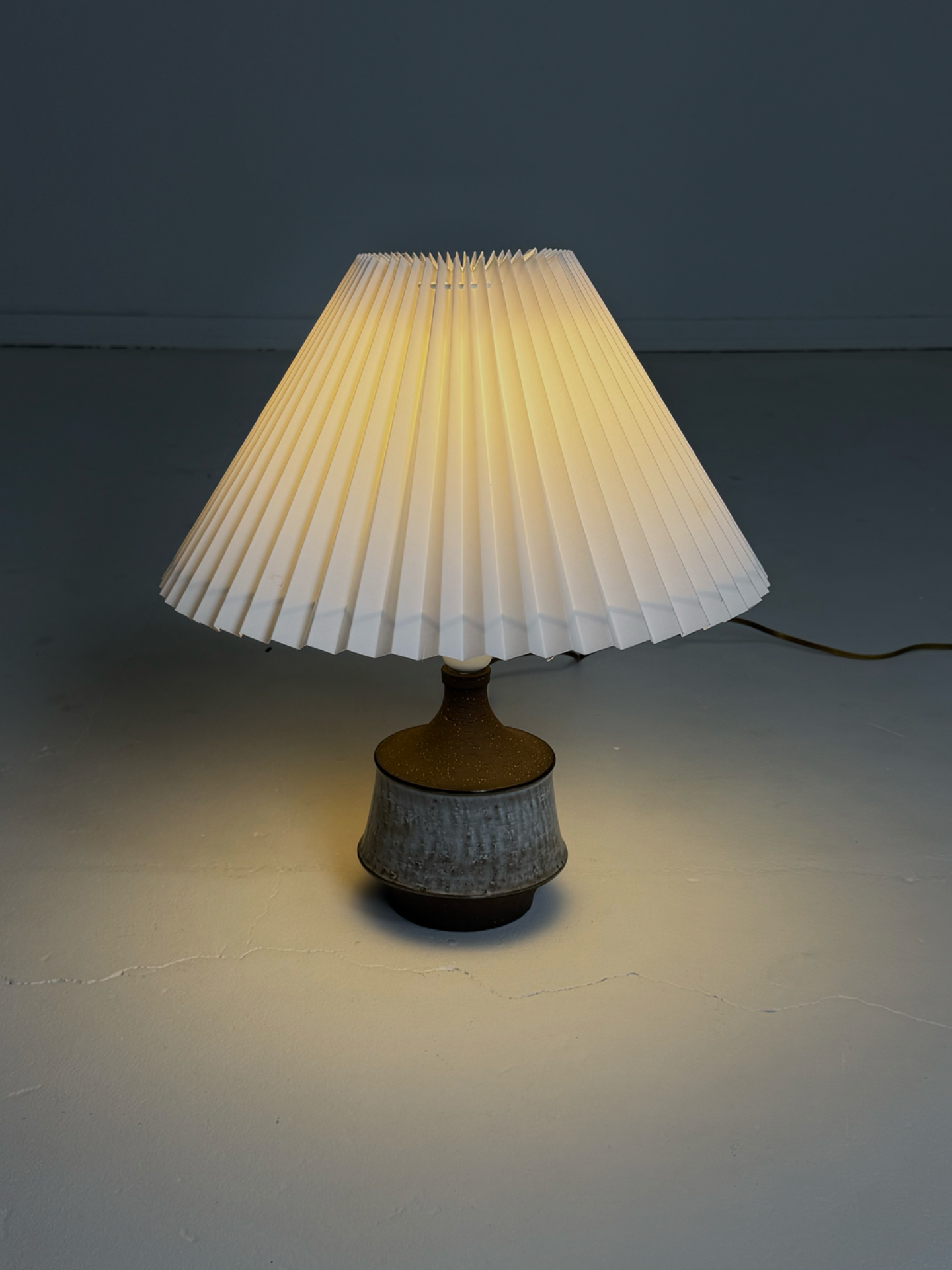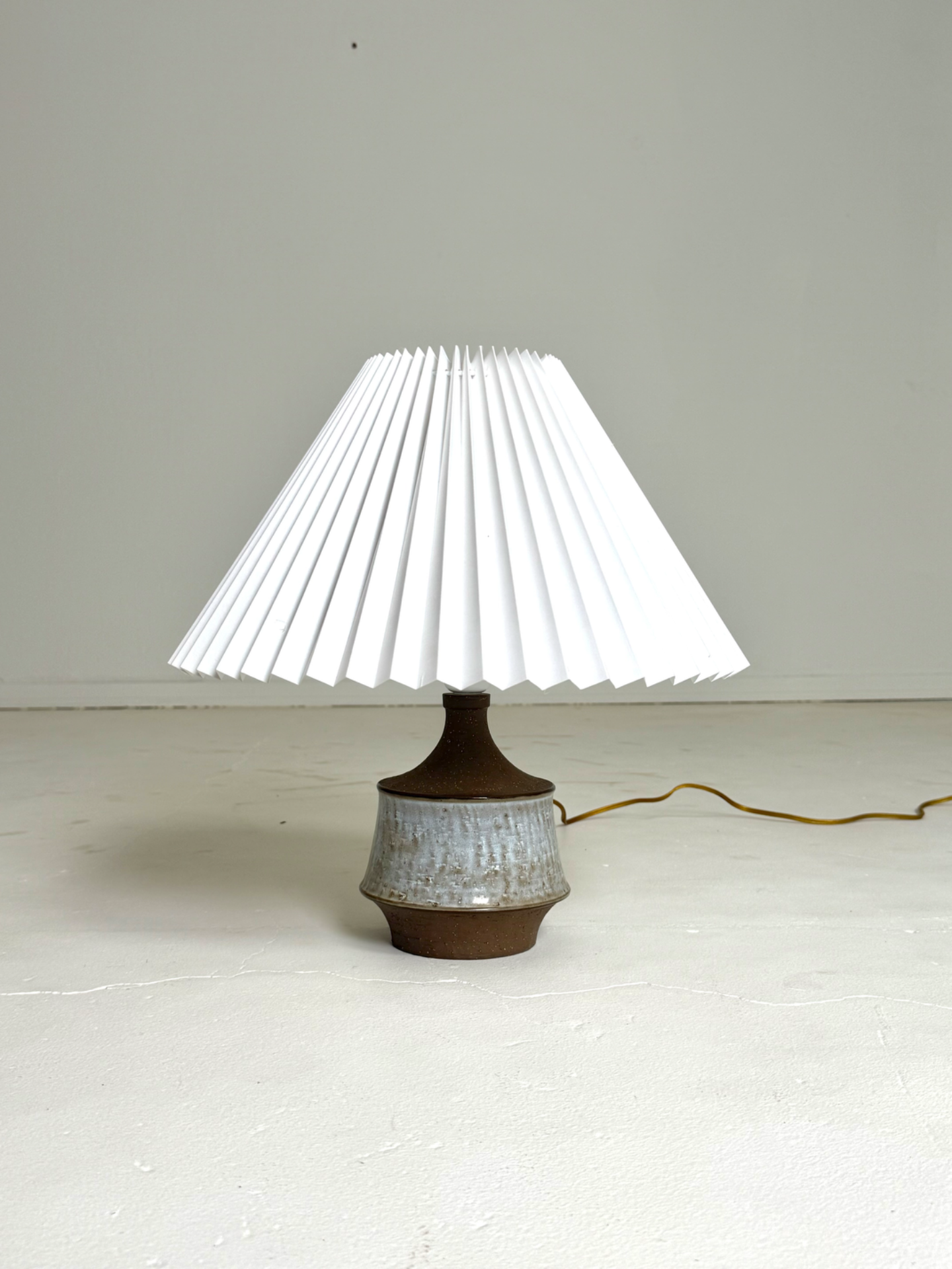 Kaunis keraaminen pöytävalaisin, suunnittelijana Michael Andersen. Valmistaja Michael Andersen & Søn, Tanska, 1960-luku. Valaisimen lasitus on hillitty ja maanläheinen, yhdistyen valkoiseen laskosvarjostimeen elegantilla tavalla. Täydellinen lisä skandinaaviseen sisustukseen – tuo tilaan pehmeää valoa ja vintage-henkeä.