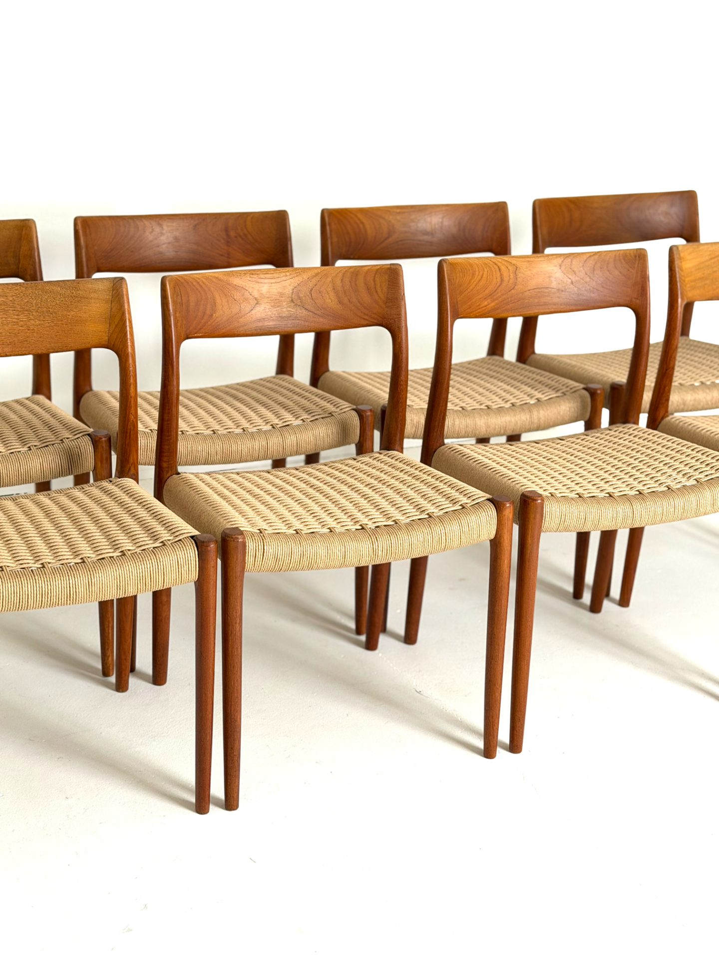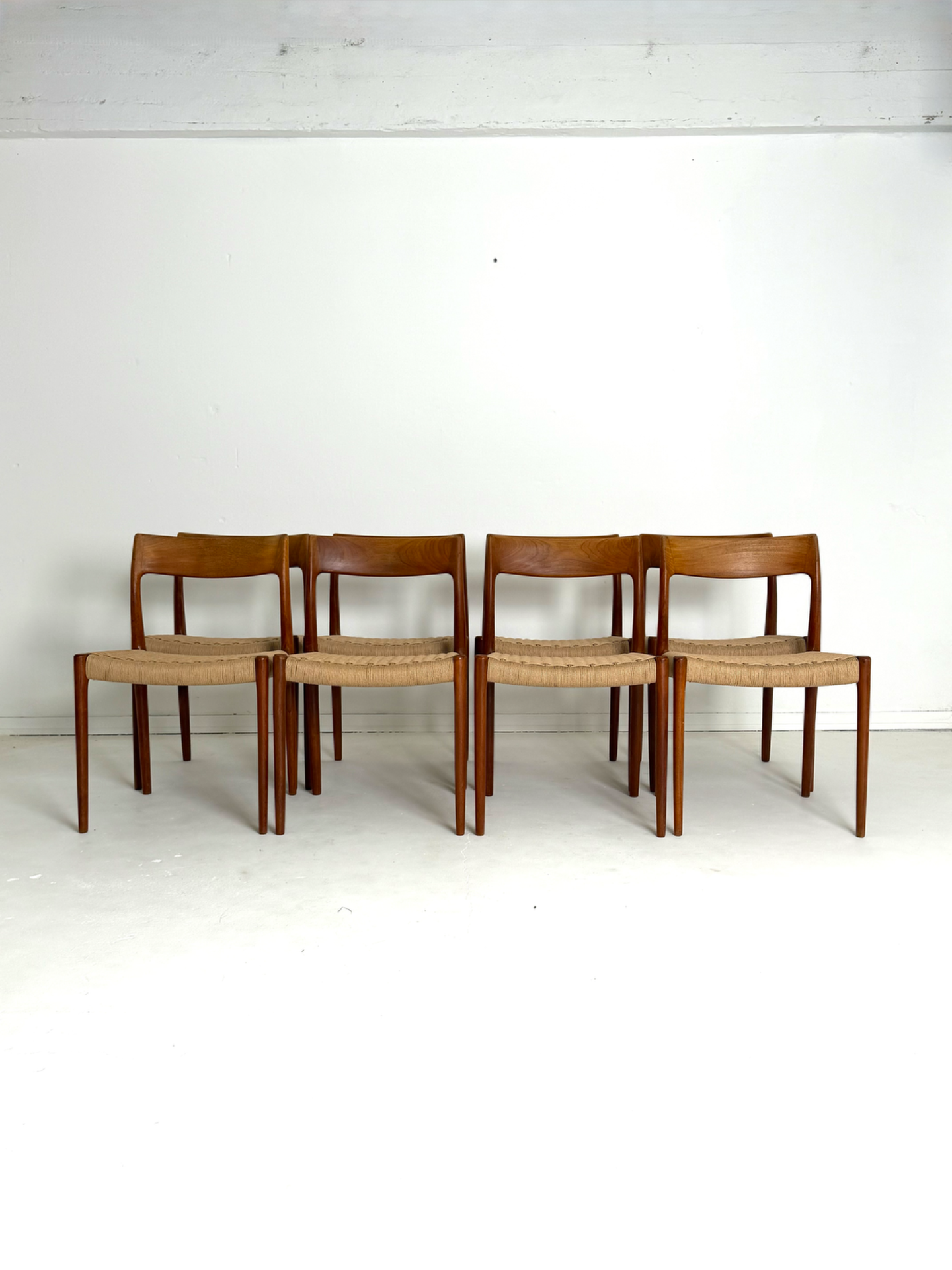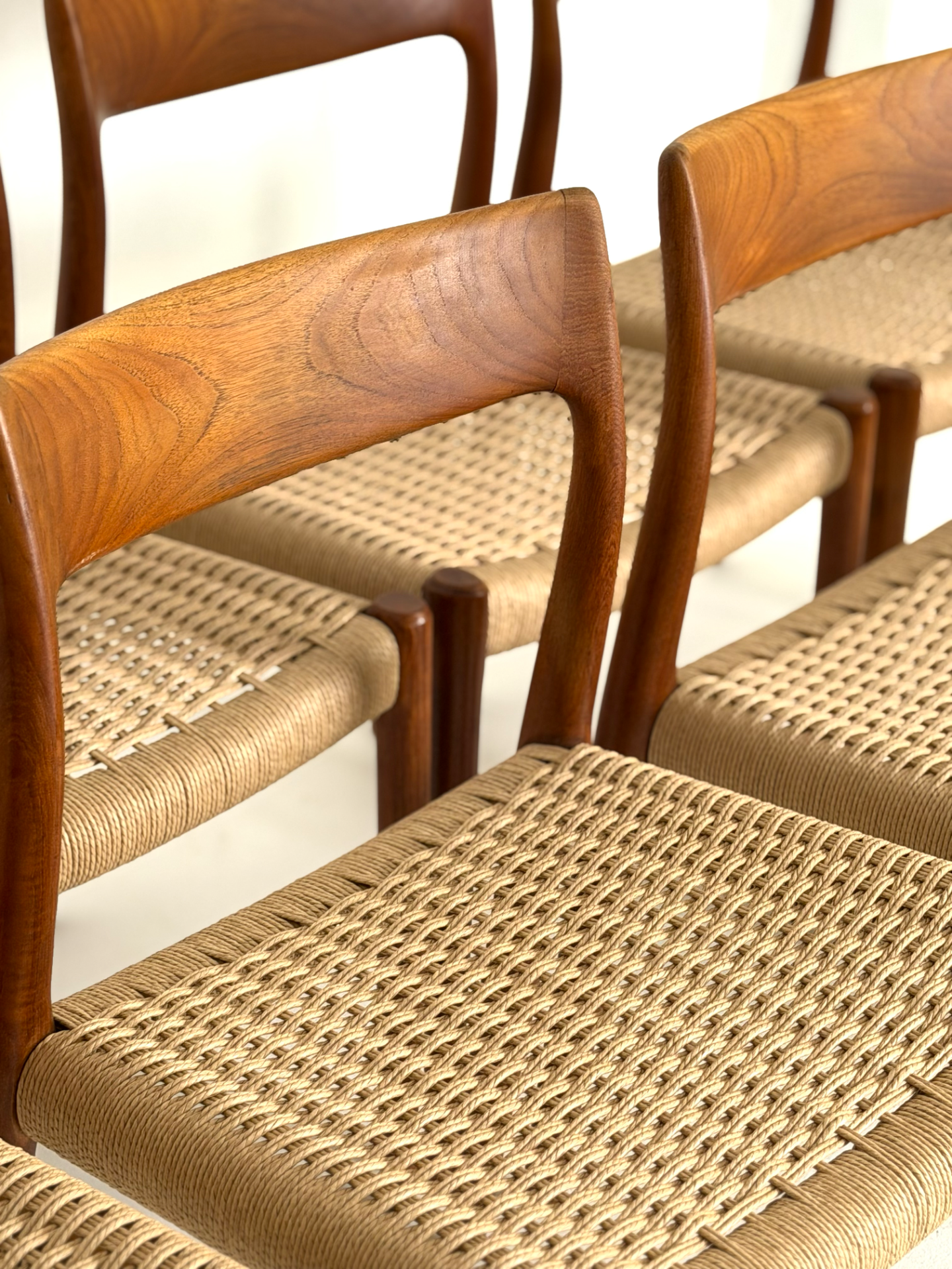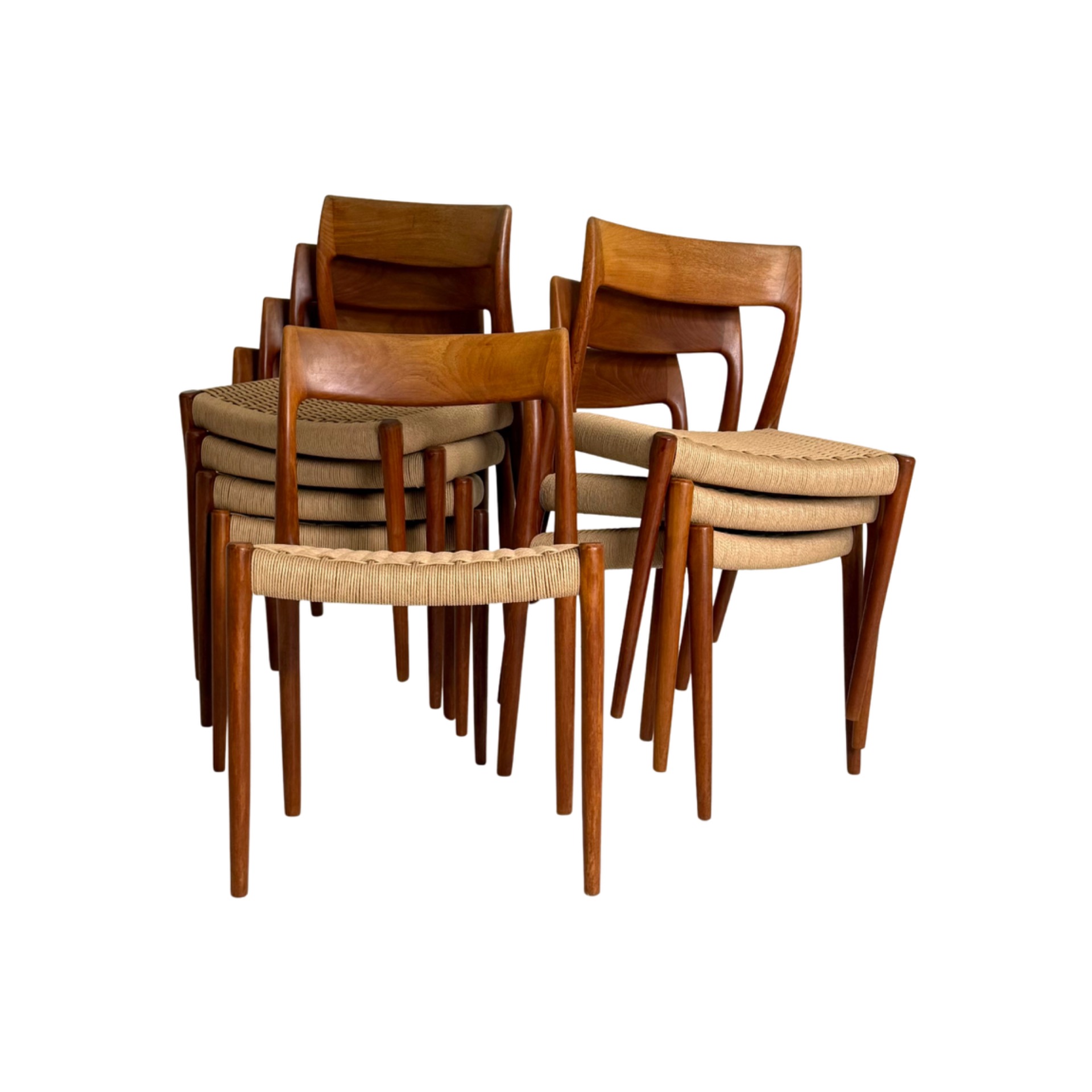An iconic Danish classic by Niels Otto Møller – the model 77 dining chair, crafted in teak by J. L. Møllers Møbelfabrik. This rare set features new hand-woven paper cord seats, faithfully restored to preserve the original Scandinavian craftsmanship. Elegant, ergonomic, and timelessly stylish, these chairs are perfect for collectors and lovers of mid-century design.