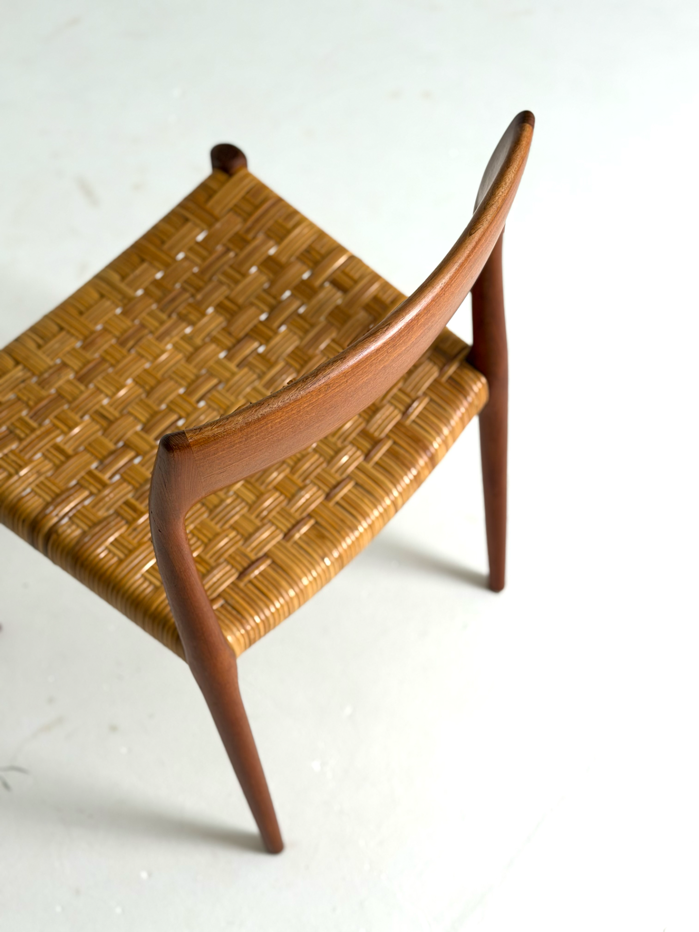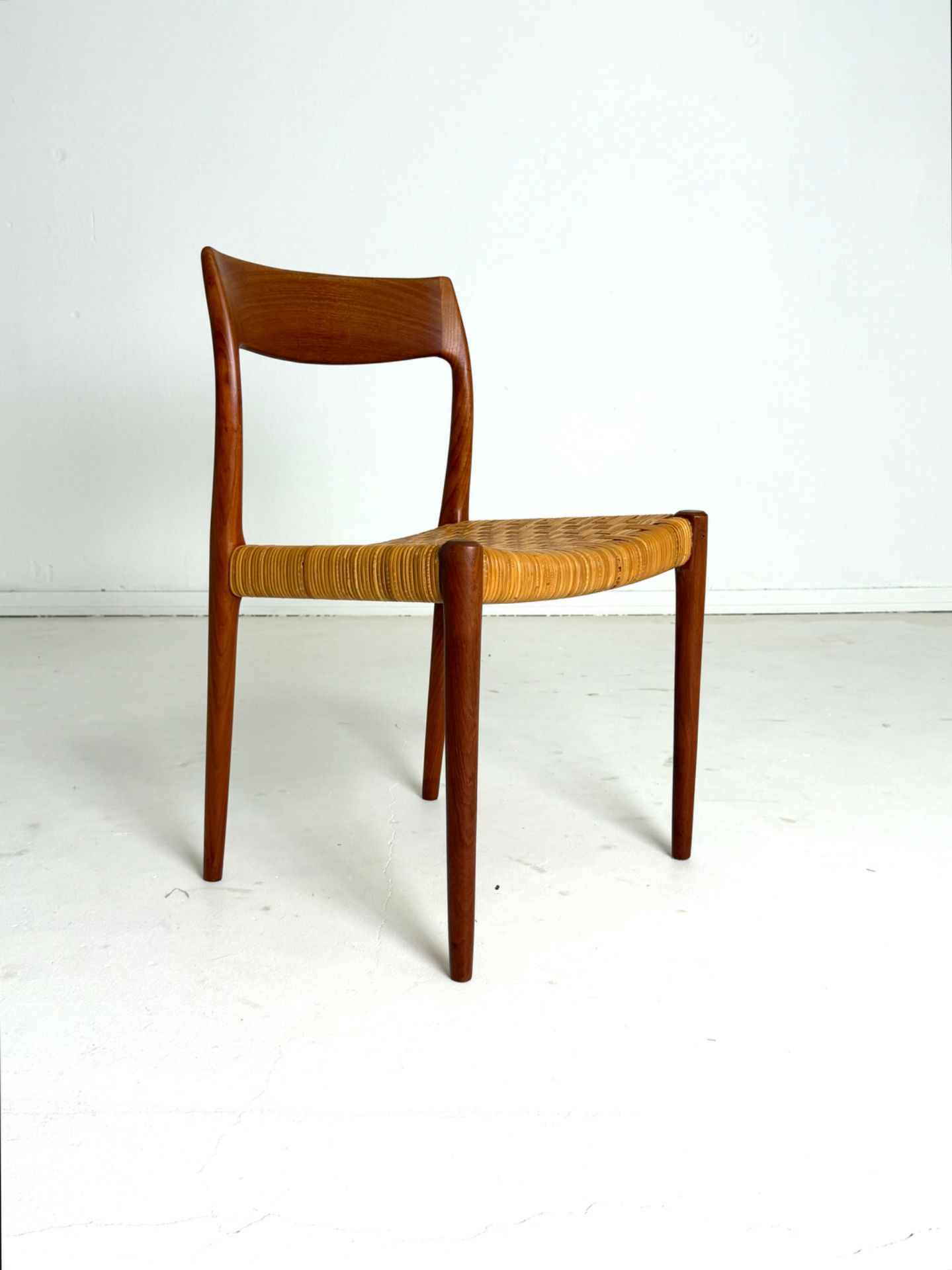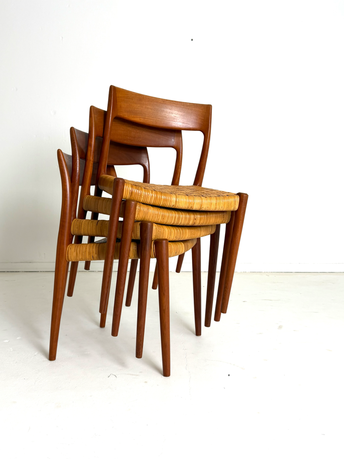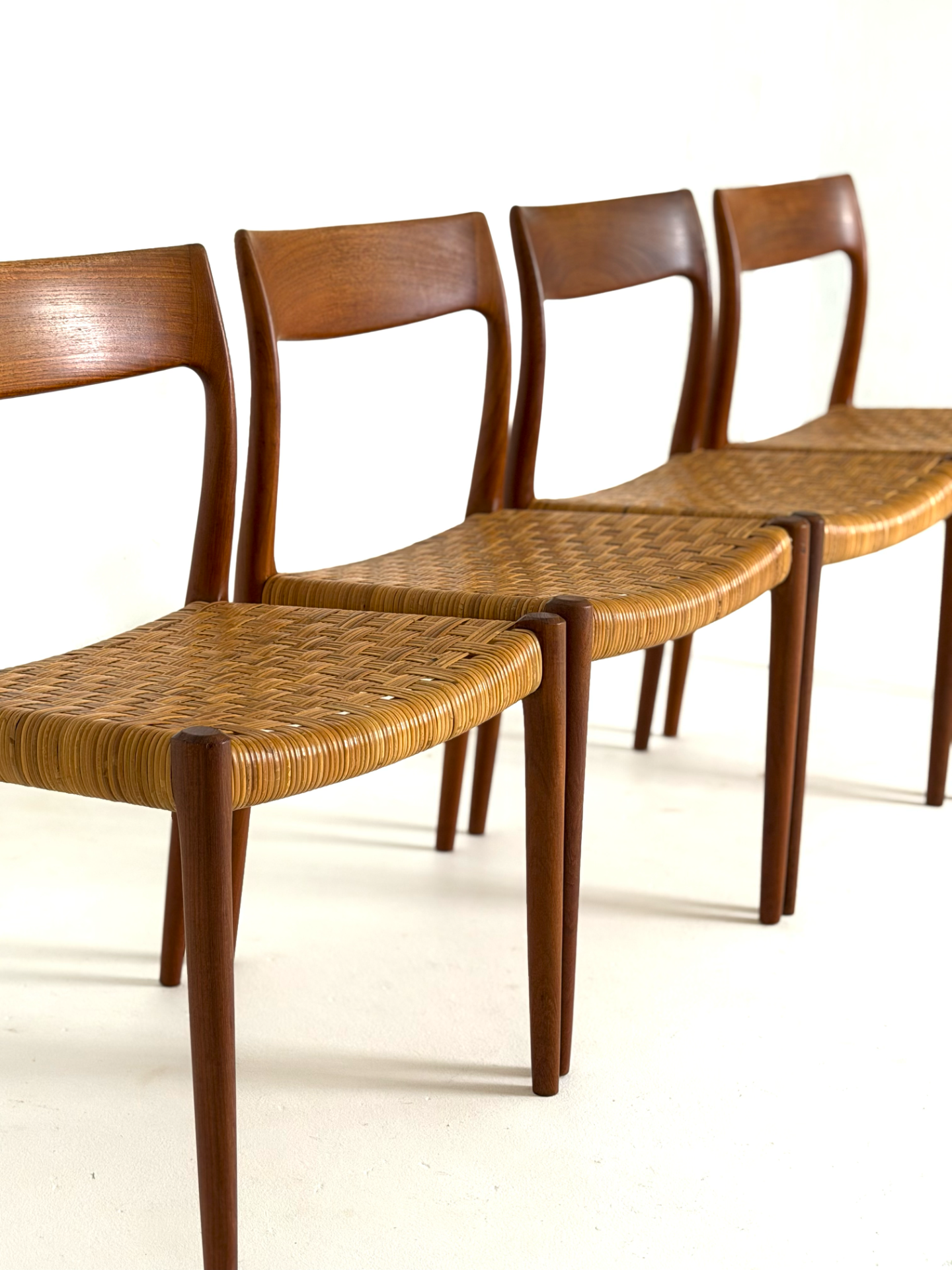 Sarja neljästä Niels Otto Møllerin suunnittelemasta mallin 77 tuolista. Tuolit on valmistettu massiivitiikistä, ja niissä on alkuperäinen, harvinainen rottinkipunosistuin. Elegantti ja kevyt muotokieli yhdistyy kestävyyteen ja istuinmukavuuteen. Valmistaja J. L. Møllers Møbelfabrik, Tanska. Huippuluokan esimerkki tanskalaisesta designista.
