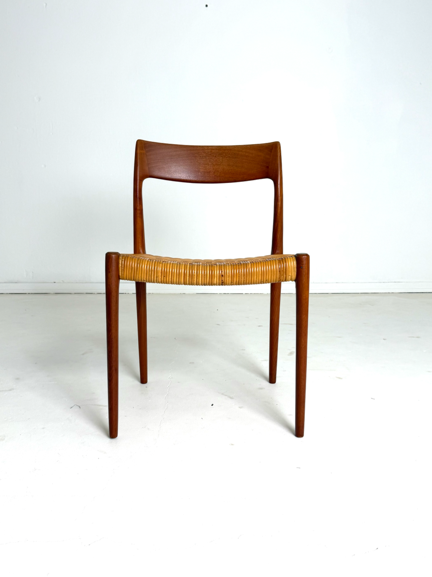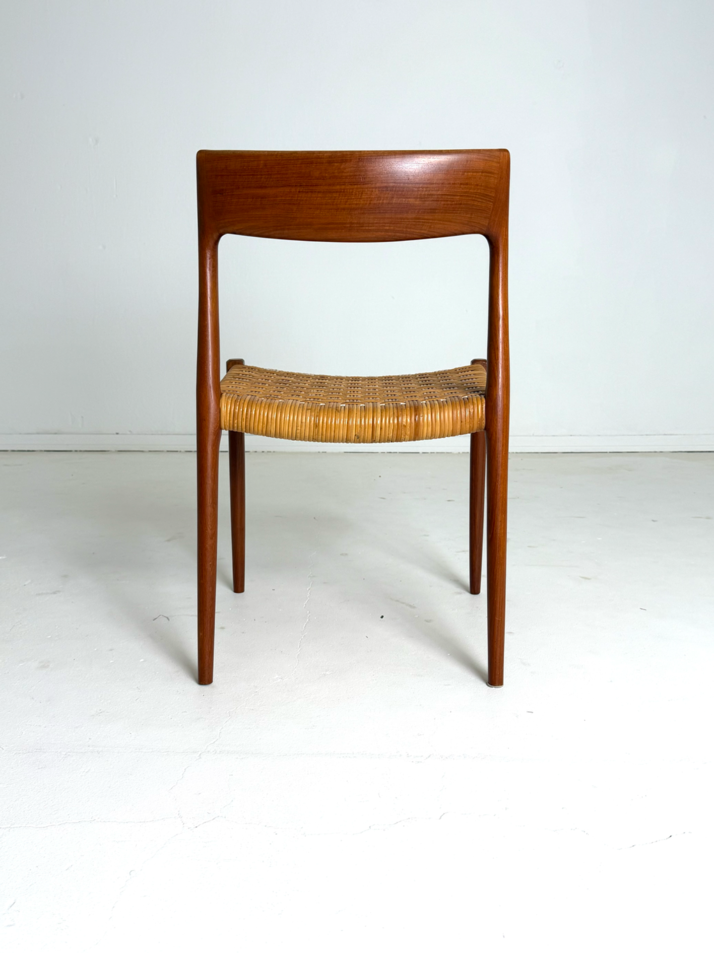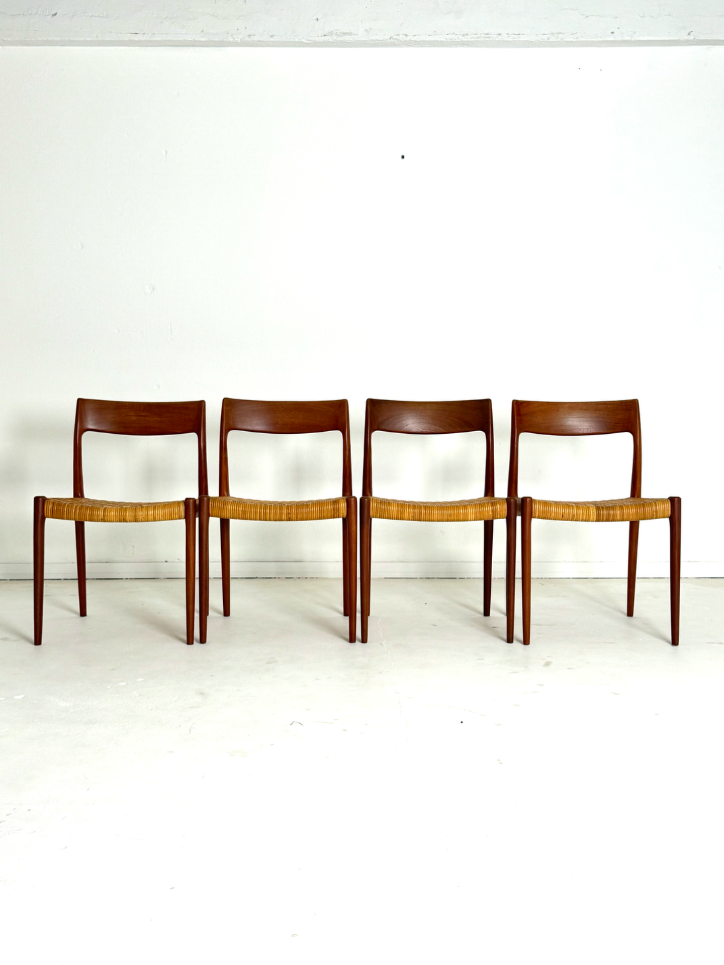 Sarja neljästä Niels Otto Møllerin suunnittelemasta mallin 77 tuolista. Tuolit on valmistettu massiivitiikistä, ja niissä on alkuperäinen, harvinainen rottinkipunosistuin. Elegantti ja kevyt muotokieli yhdistyy kestävyyteen ja istuinmukavuuteen. Valmistaja J. L. Møllers Møbelfabrik, Tanska. Huippuluokan esimerkki tanskalaisesta designista.