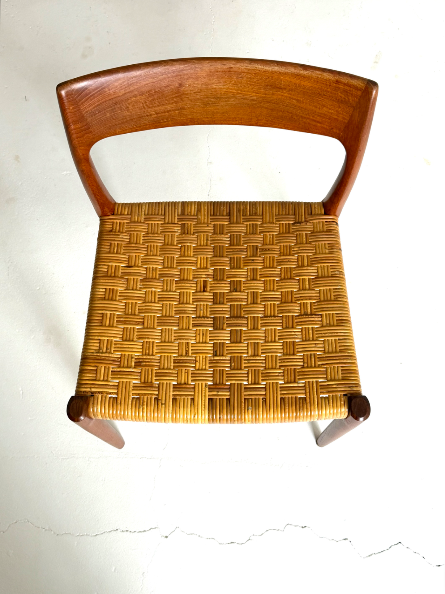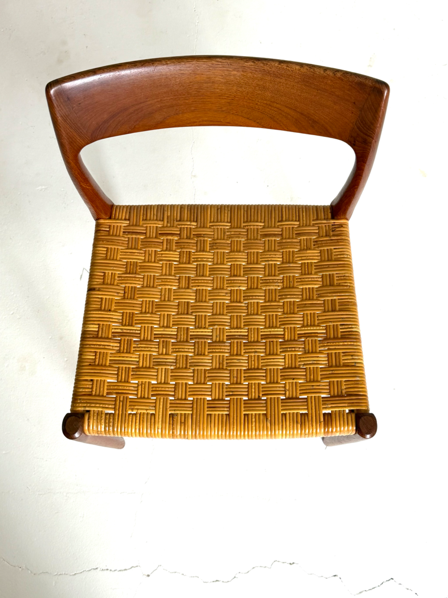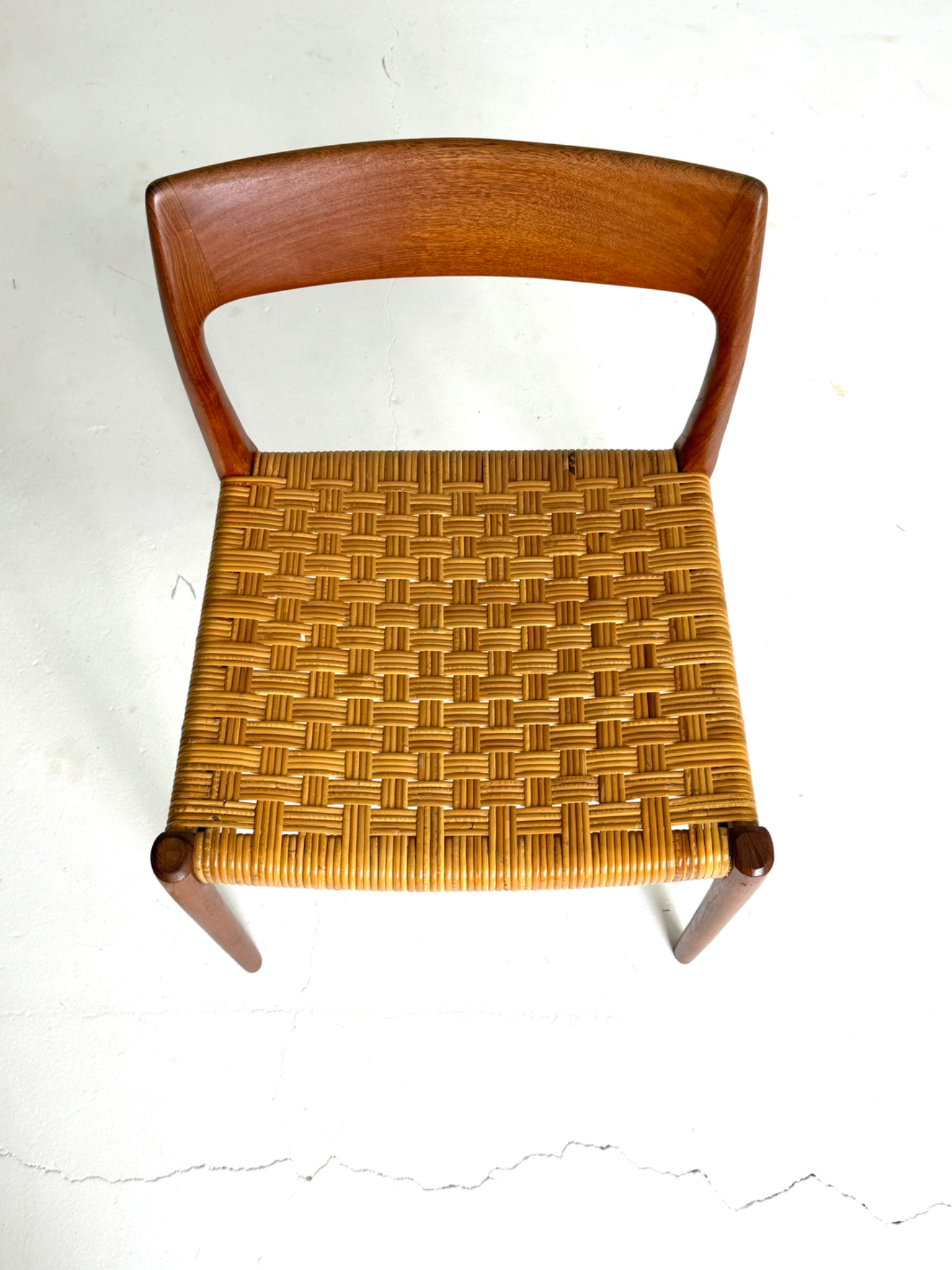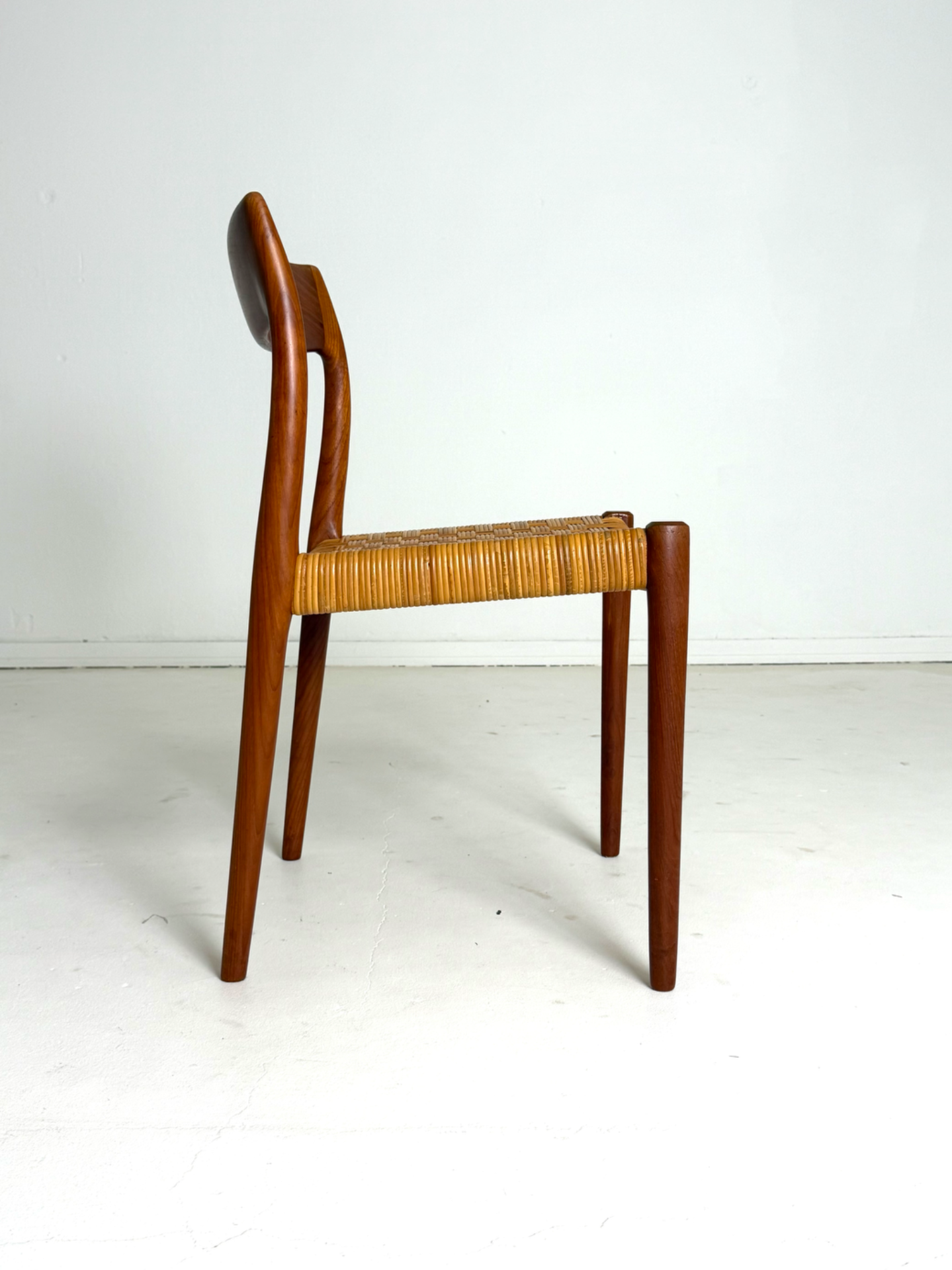 Sarja neljästä Niels Otto Møllerin suunnittelemasta mallin 77 tuolista. Tuolit on valmistettu massiivitiikistä, ja niissä on alkuperäinen, harvinainen rottinkipunosistuin. Elegantti ja kevyt muotokieli yhdistyy kestävyyteen ja istuinmukavuuteen. Valmistaja J. L. Møllers Møbelfabrik, Tanska. Huippuluokan esimerkki tanskalaisesta designista.