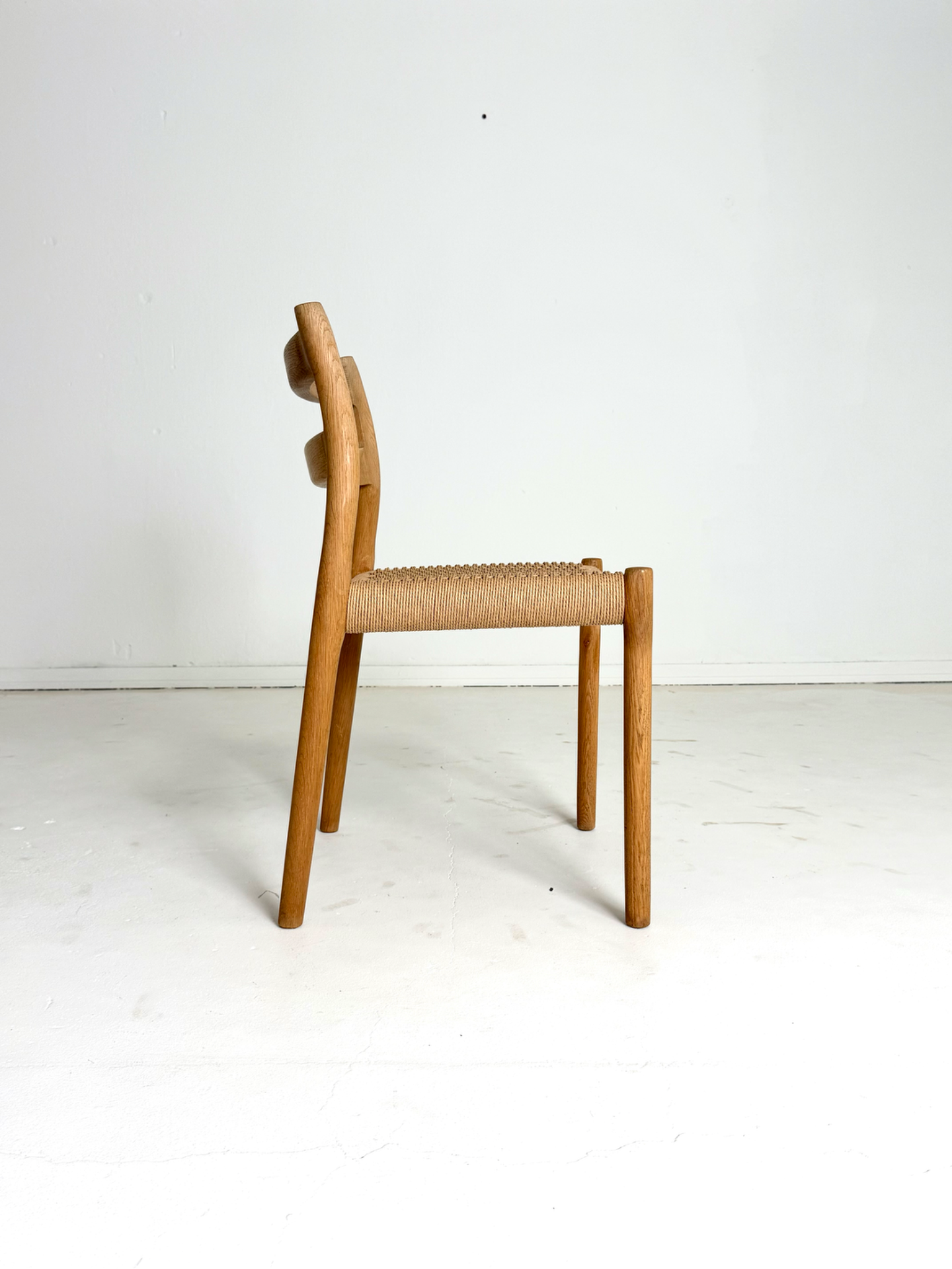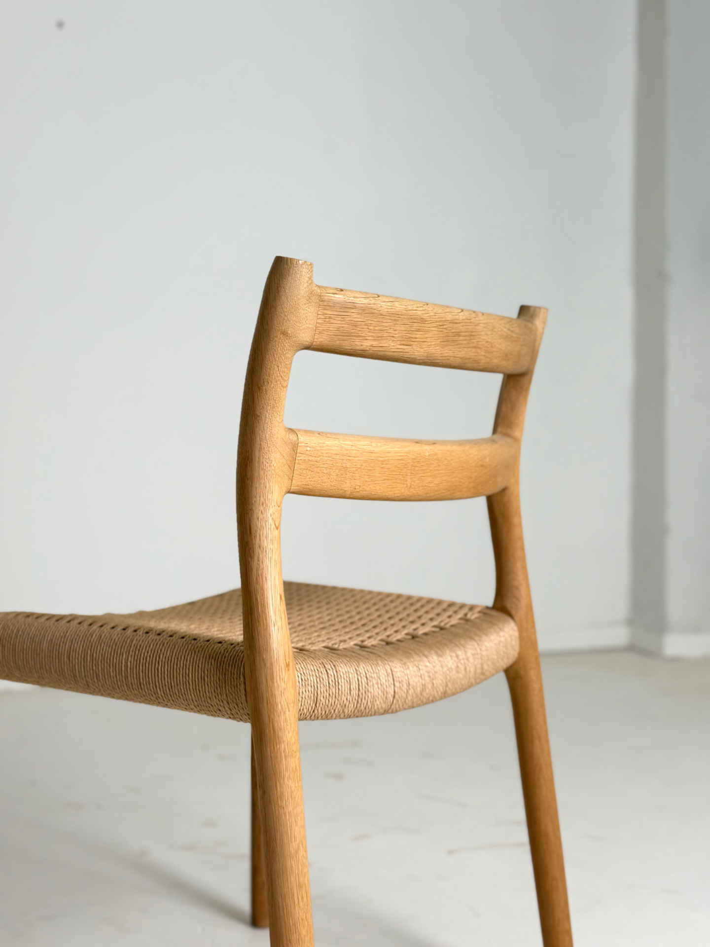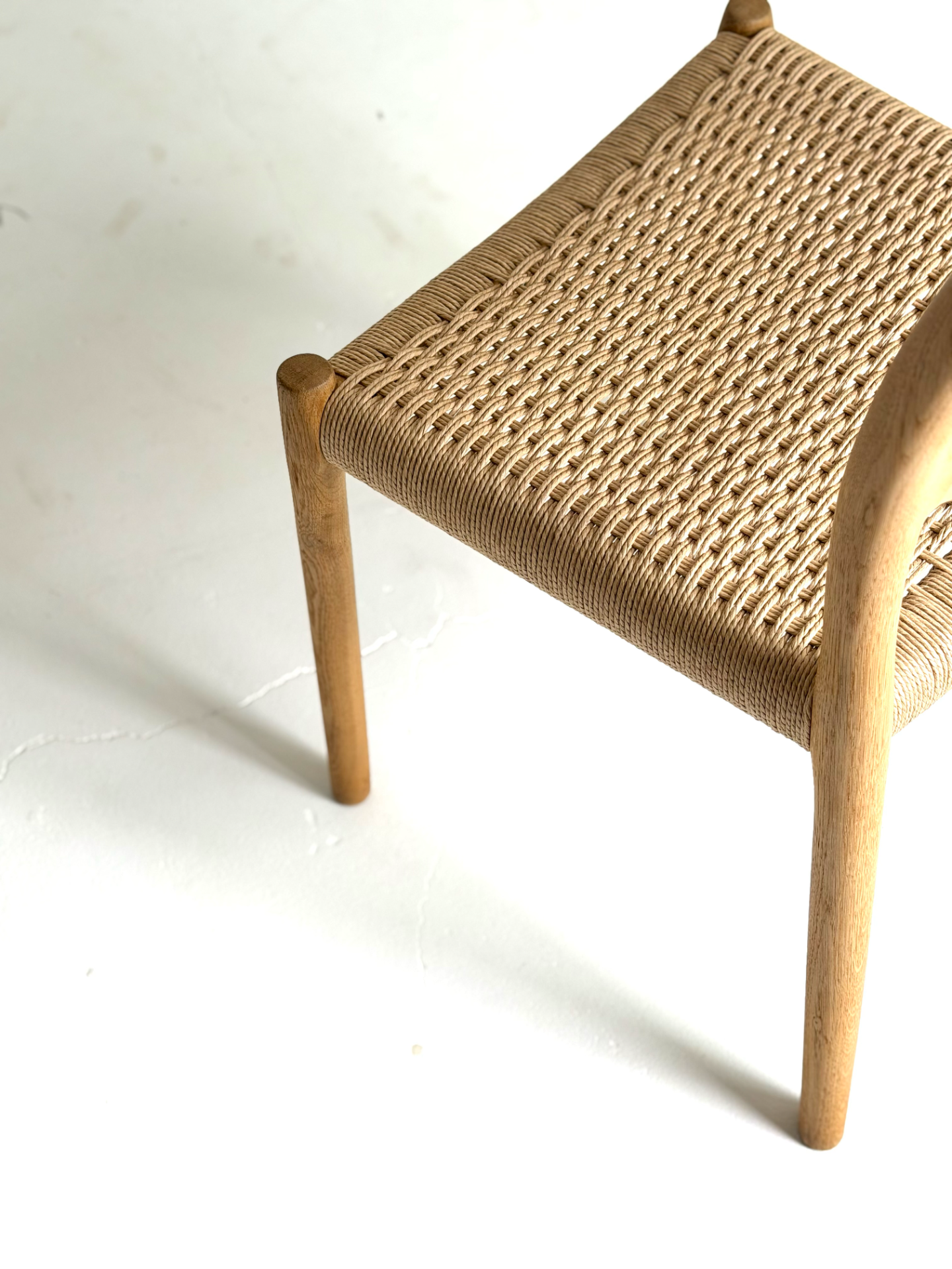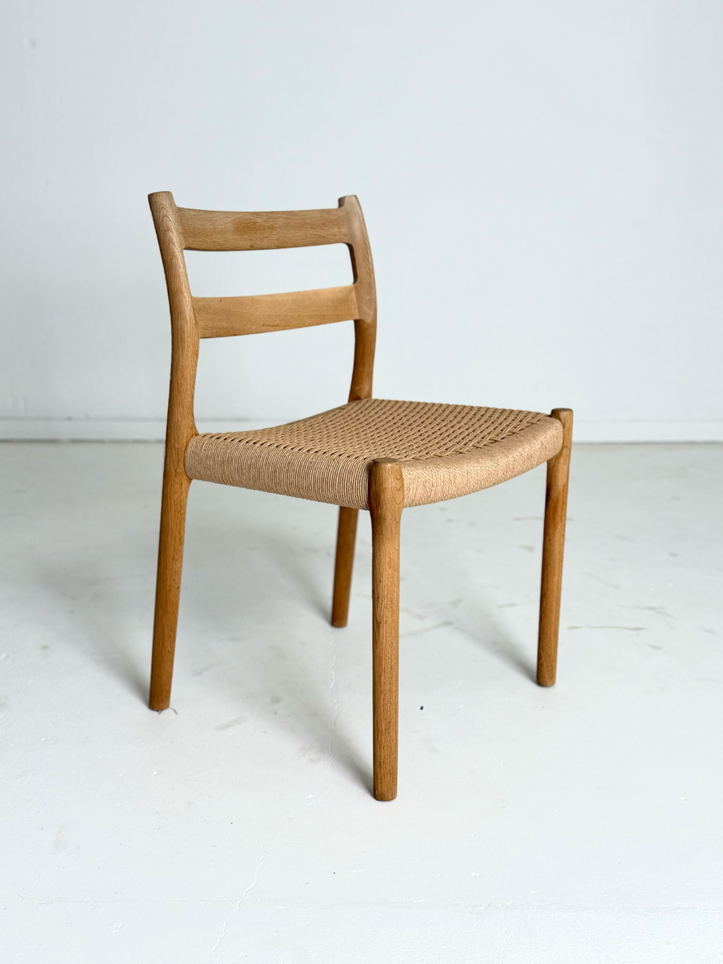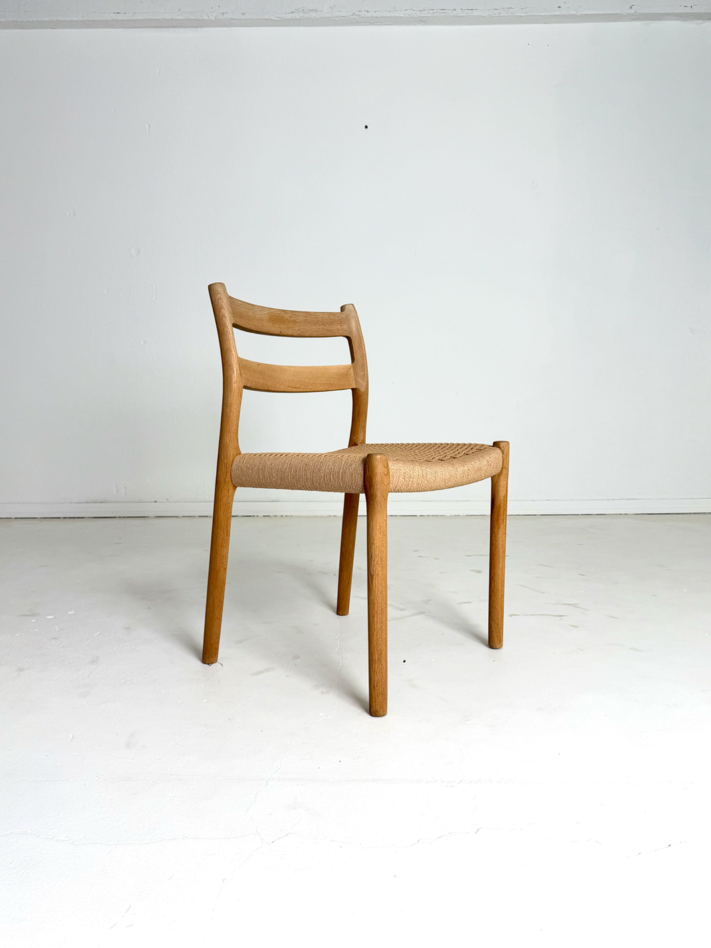 Ajattoman tyylikkäät Niels Otto Møllerin suunnittelemat 84-mallin ruokapöydäntuolit 1970-luvulta. Tuolit ovat valmistettu massiivitammesta, ja niissä on kauniisti kaareutuva selkänoja sekä uudet käsintehdyt paperinarupunot. Tämä tuolimalli on tunnettu istuinmukavuudestaan ja hienostuneesta muotoilustaan. Klassinen tanskalainen käsityötaito näkyy jokaisessa yksityiskohdassa. Täydellinen valinta skandinaaviseen sisustukseen.