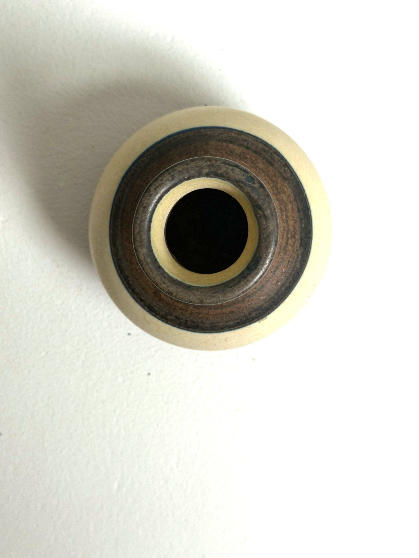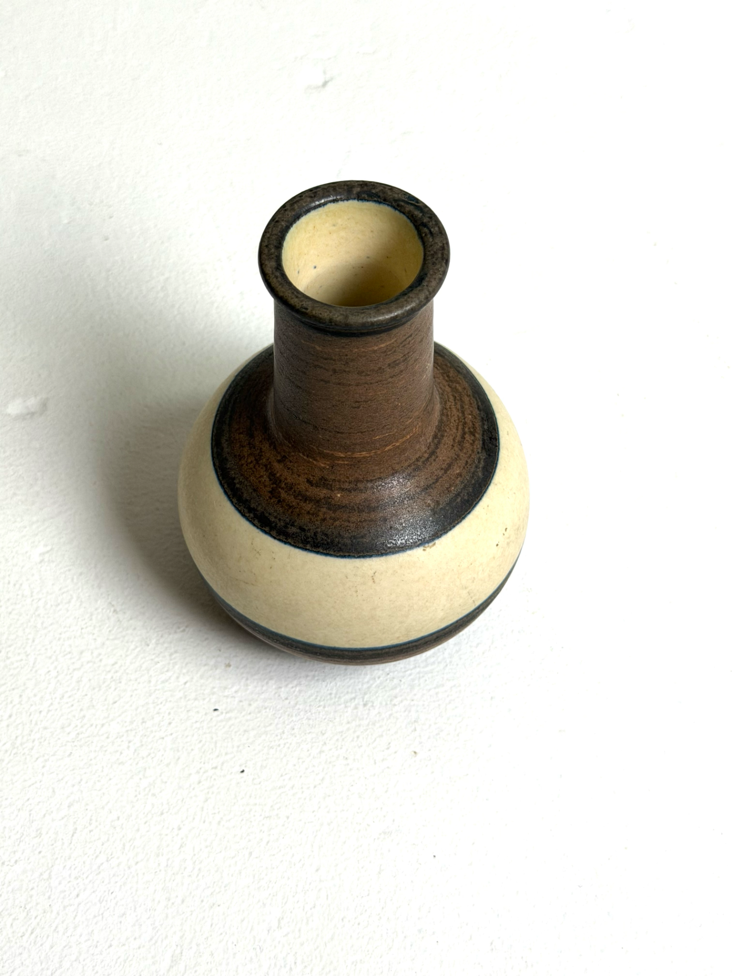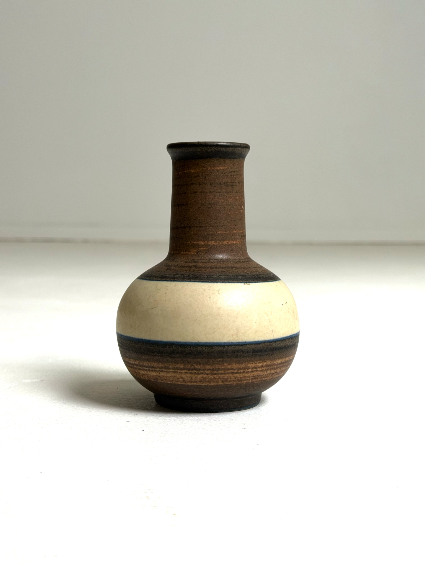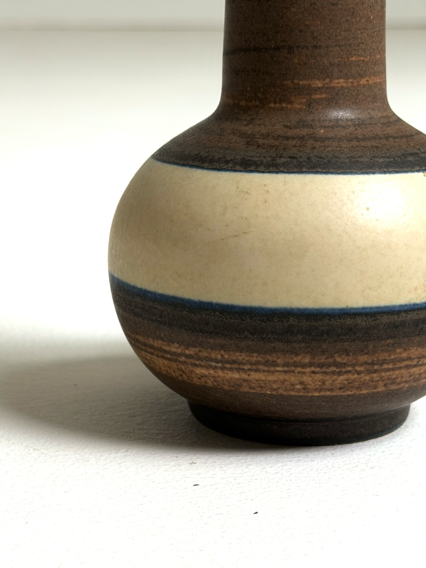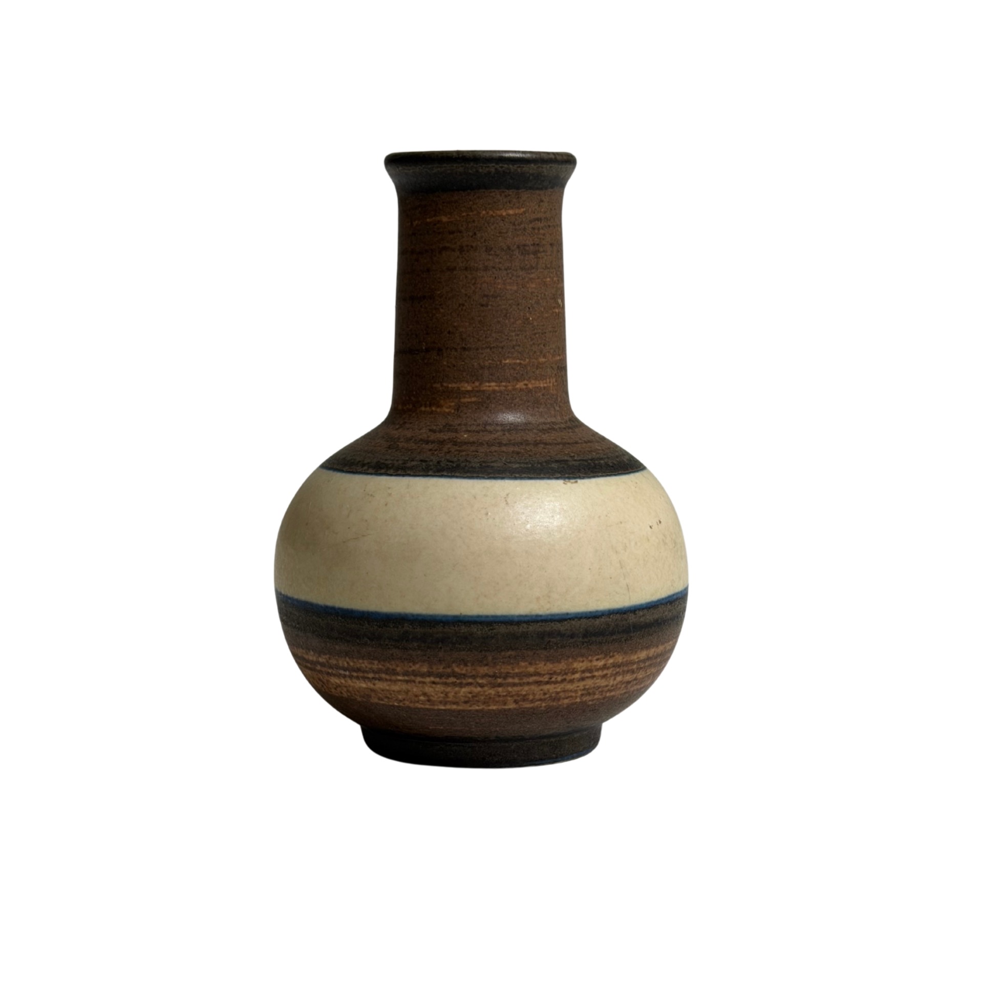 Kaunis vintage-keraaminen maljakko tanskalaiselta Okela keramiikkatehtaalta 1960-luvulta. Maljakossa on harmoninen muoto ja rauhallinen, luonnonläheinen värimaailma. Mattalasitteiset ruskeat, sinertävät ja vaaleat raidat korostavat käsityön leimaa. Tyylikäs yksityiskohta hyllylle tai pöydälle – toimii sellaisenaan tai pienen kukkakimpun kanssa.