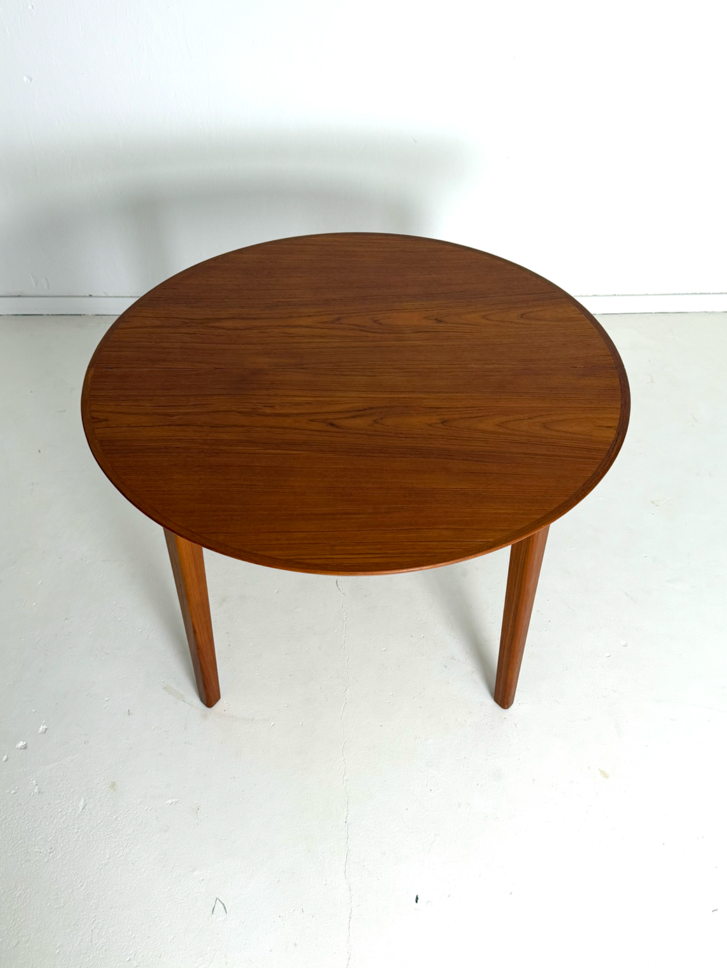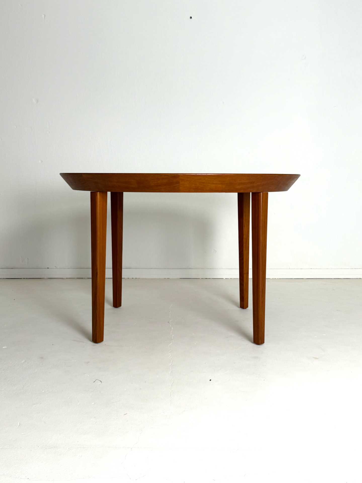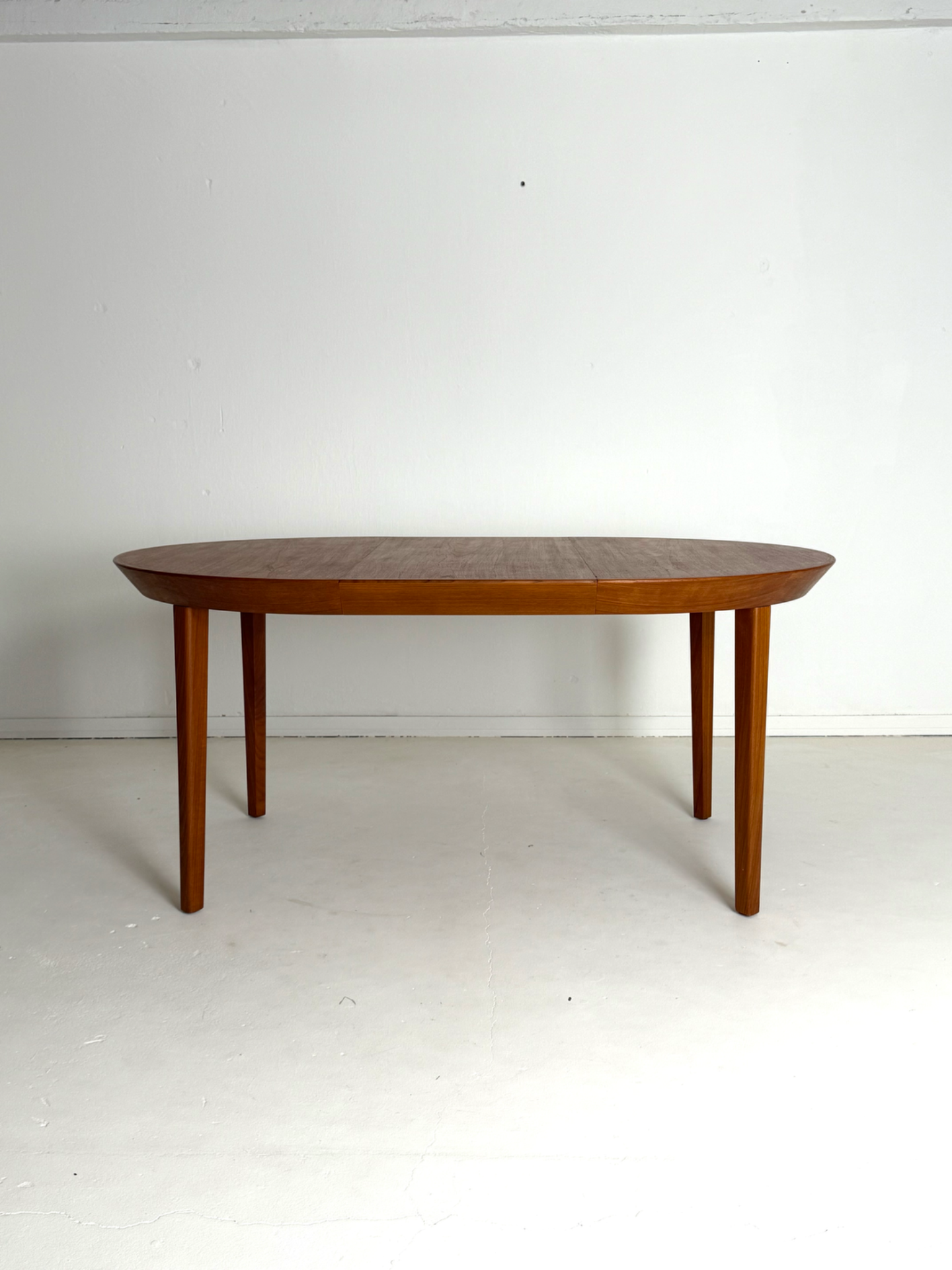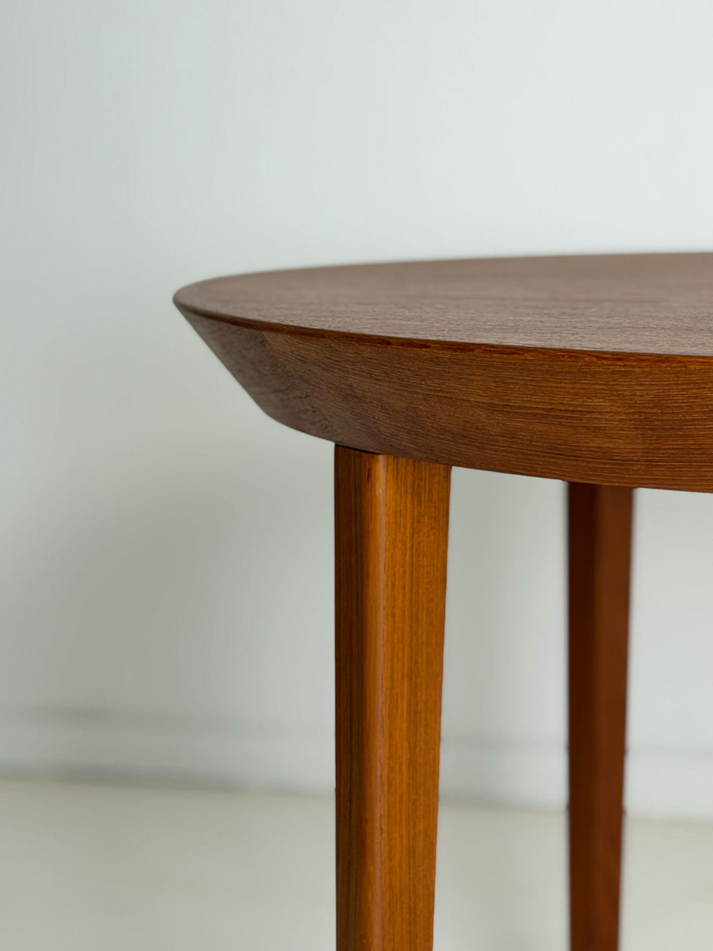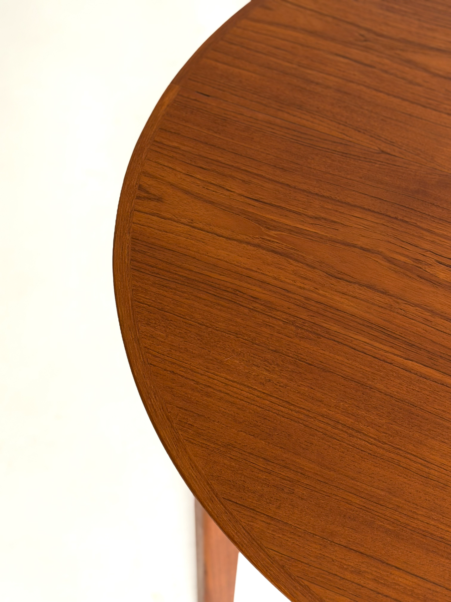 Ole Haldin suunnittelema jatkettava pyöreä pöytä, valmistaja Gudme Møbelfabrik, 1960-luku, Tanska. Elegantti muotoilu ja laadukas tiikkiviimeistely. Pöydässä on kaksi erillistä jatkopalaa, joiden avulla pöydän kokoa voidaan helposti kasvattaa. Ajaton vintage-pöytä, joka soveltuu niin keittiöön kuin erilliseen ruokailutilaankin.
