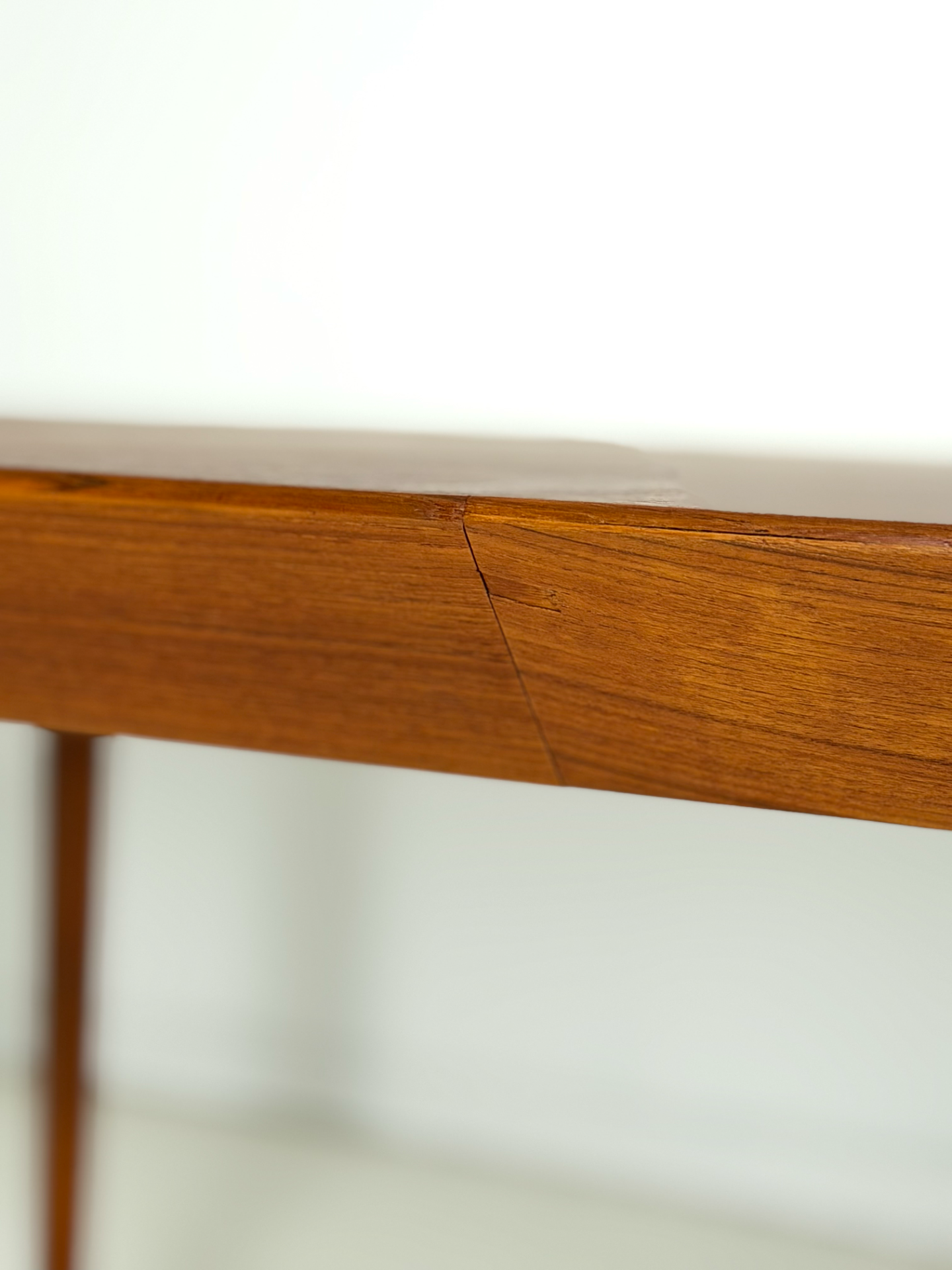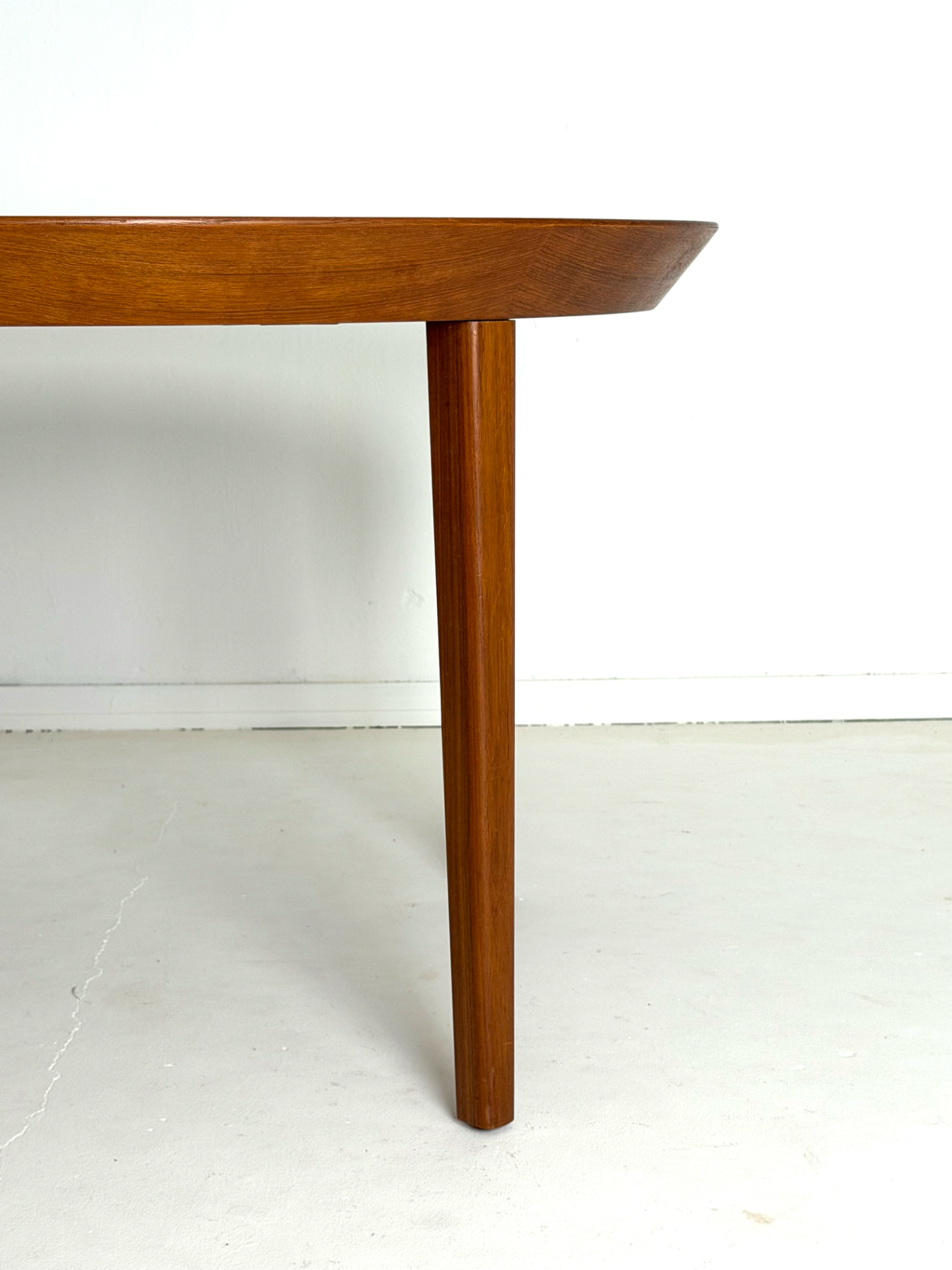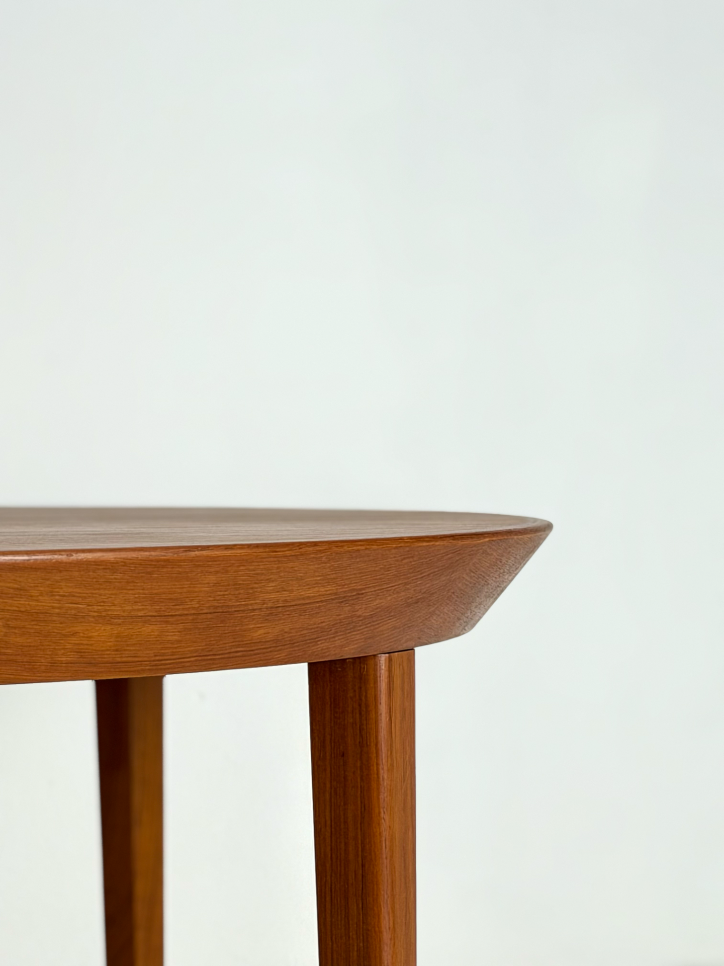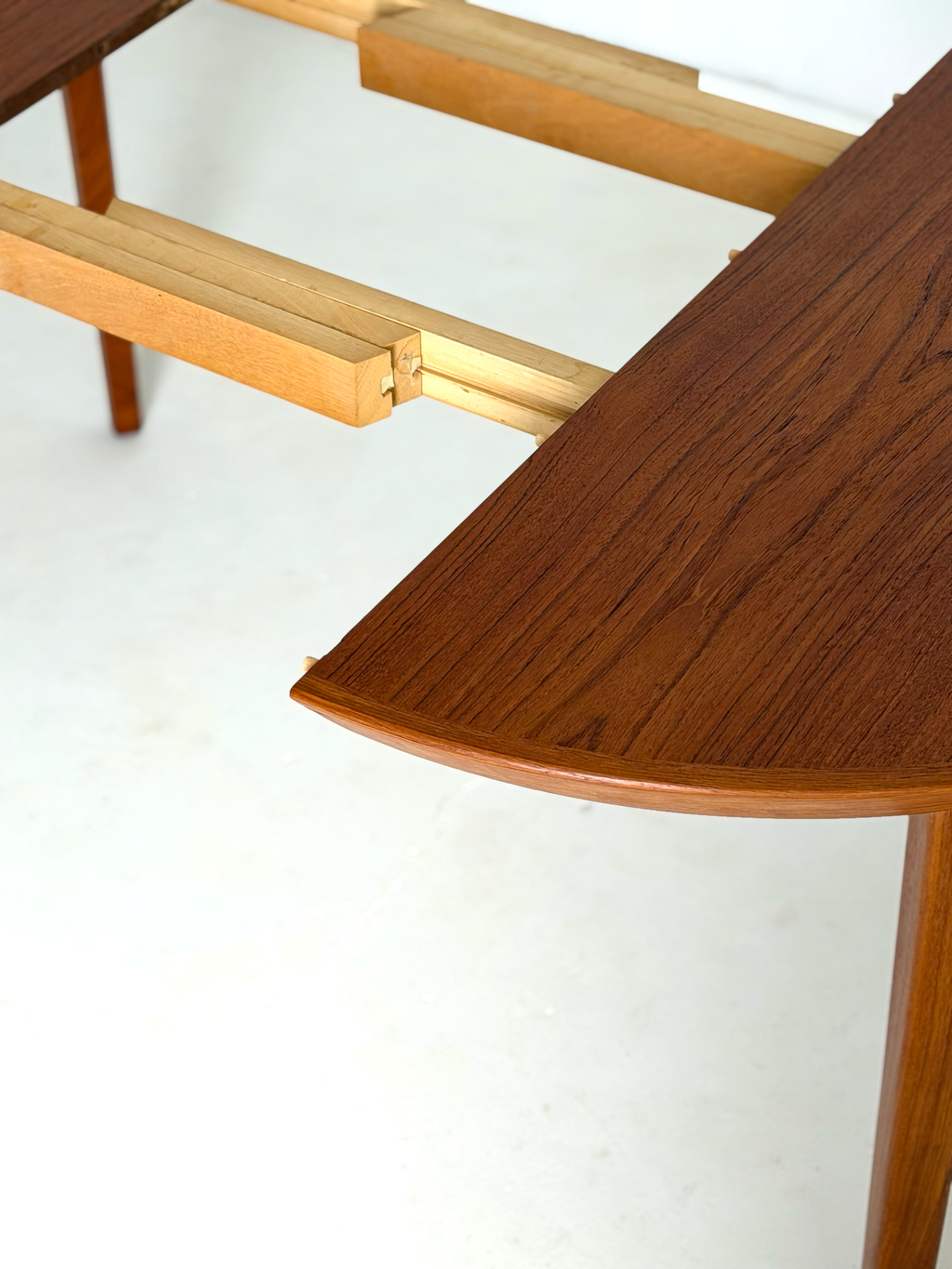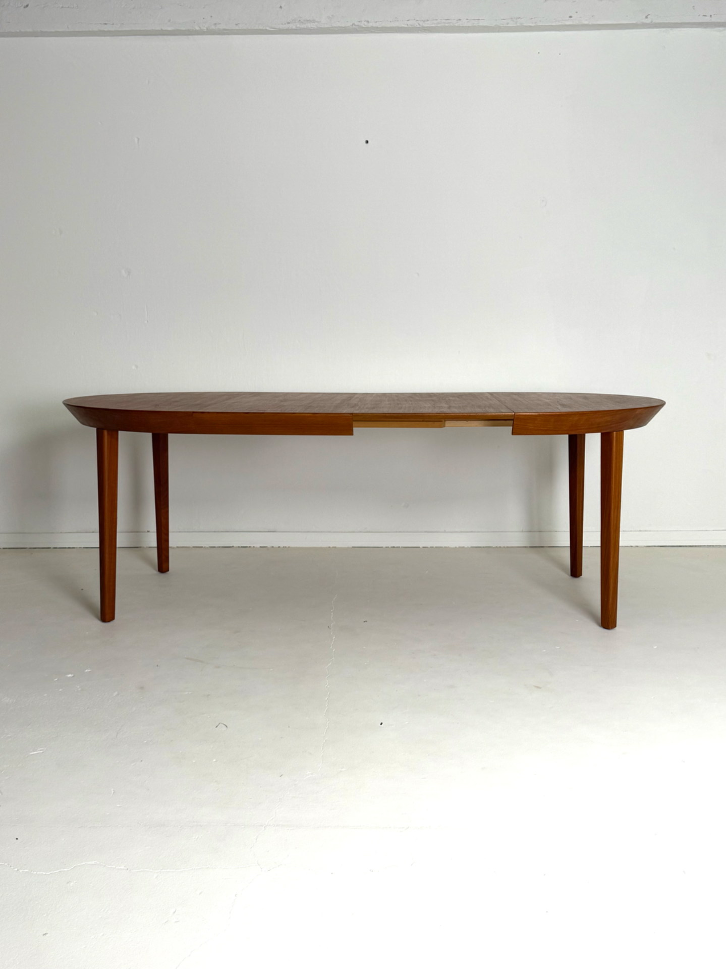 Ole Haldin suunnittelema jatkettava pyöreä pöytä, valmistaja Gudme Møbelfabrik, 1960-luku, Tanska. Elegantti muotoilu ja laadukas tiikkiviimeistely. Pöydässä on kaksi erillistä jatkopalaa, joiden avulla pöydän kokoa voidaan helposti kasvattaa. Ajaton vintage-pöytä, joka soveltuu niin keittiöön kuin erilliseen ruokailutilaankin.