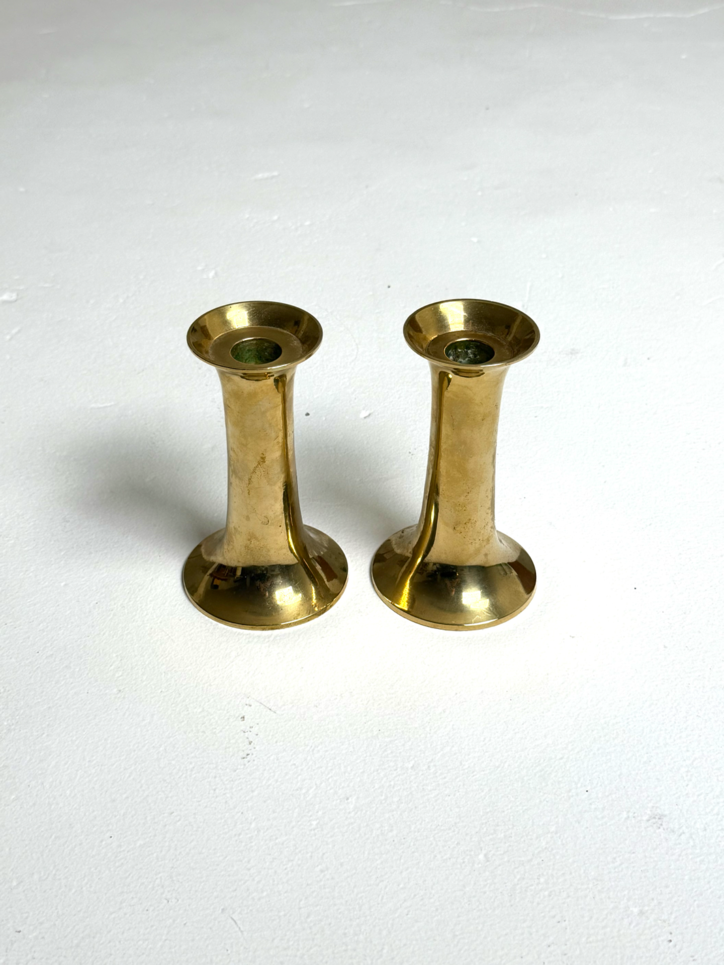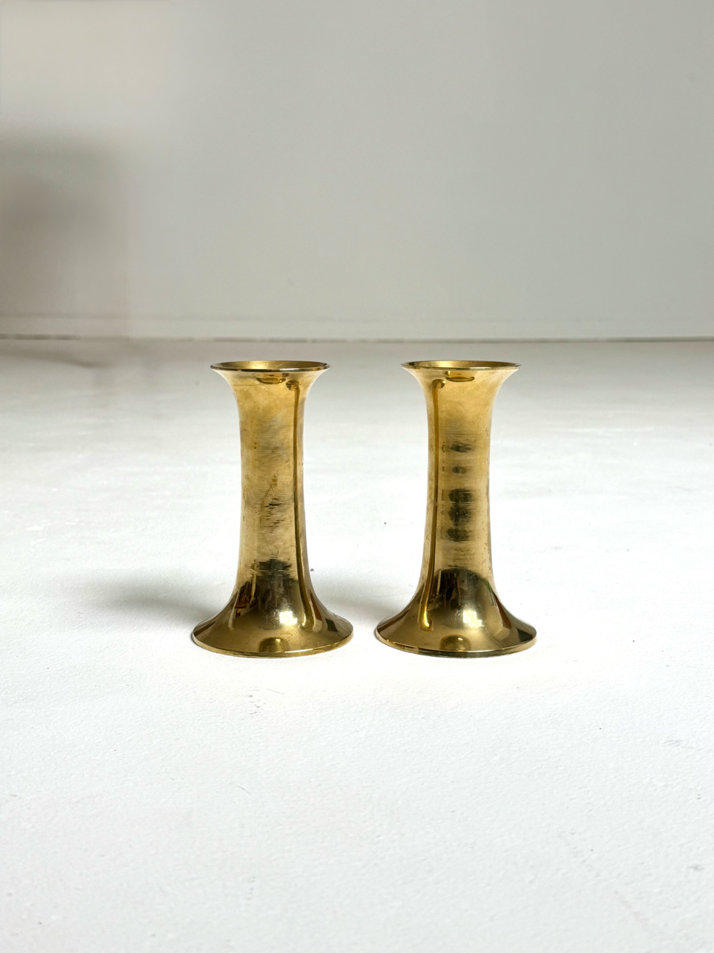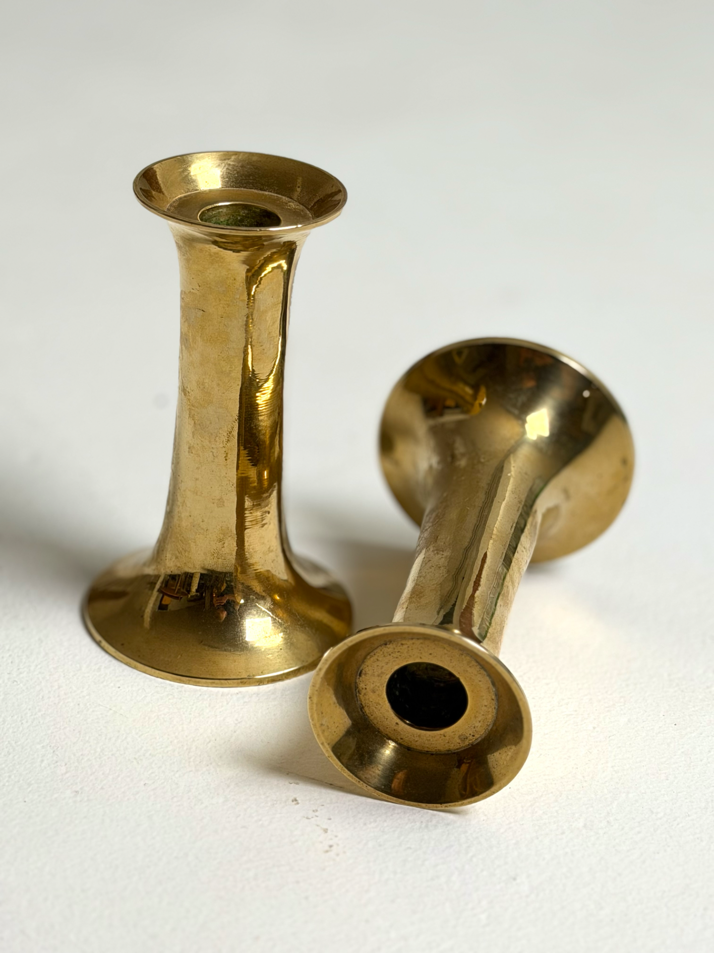 A timeless and elegant pair of candlesticks from 1960s Denmark. The trumpet-shaped design reflects the simplicity and harmony of Scandinavian craftsmanship. Made of solid brass with a beautiful vintage patina, these pieces add warmth and style to any interior.