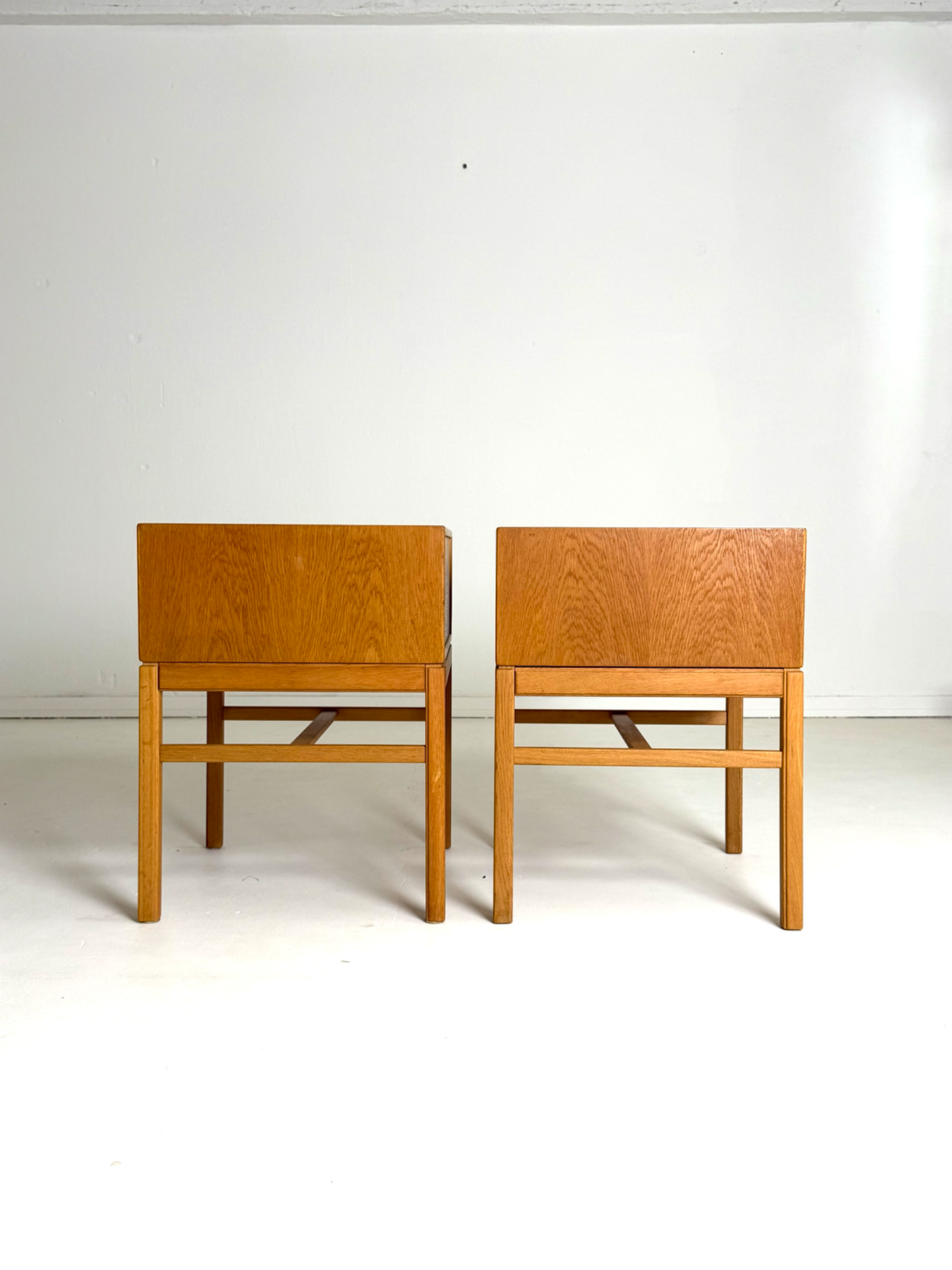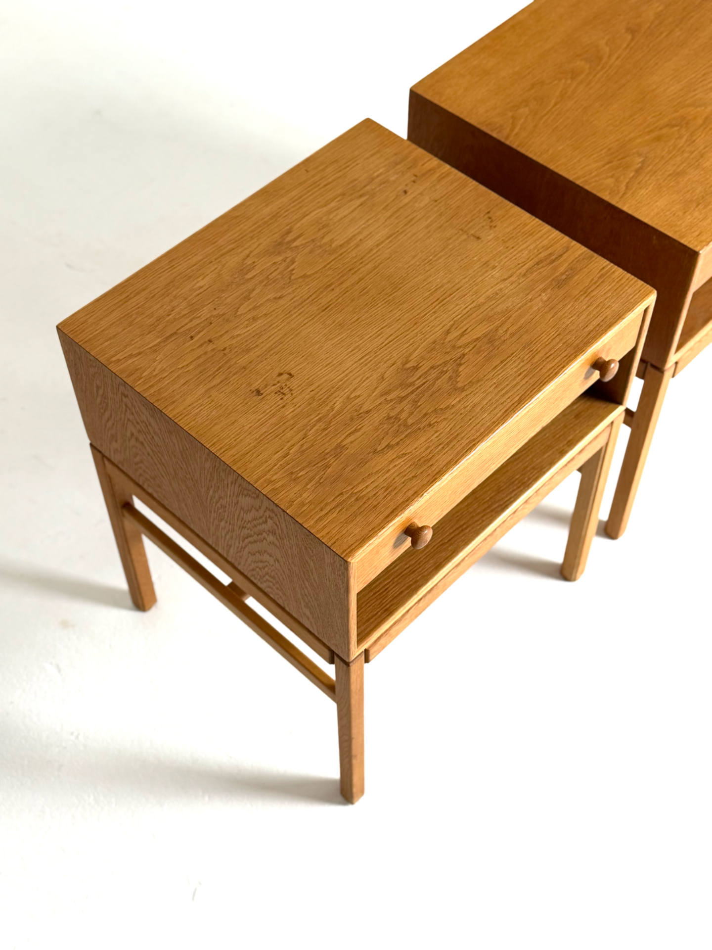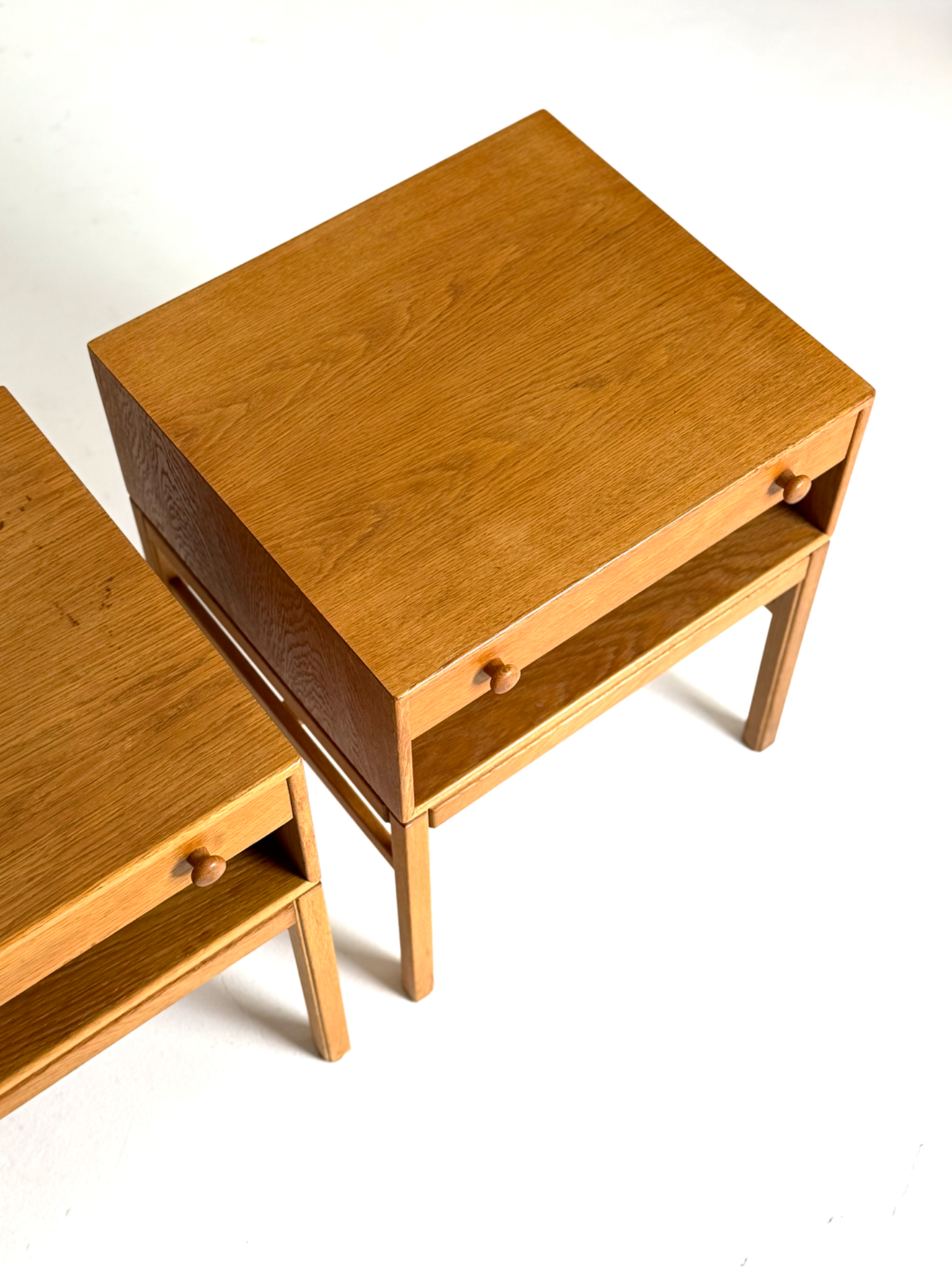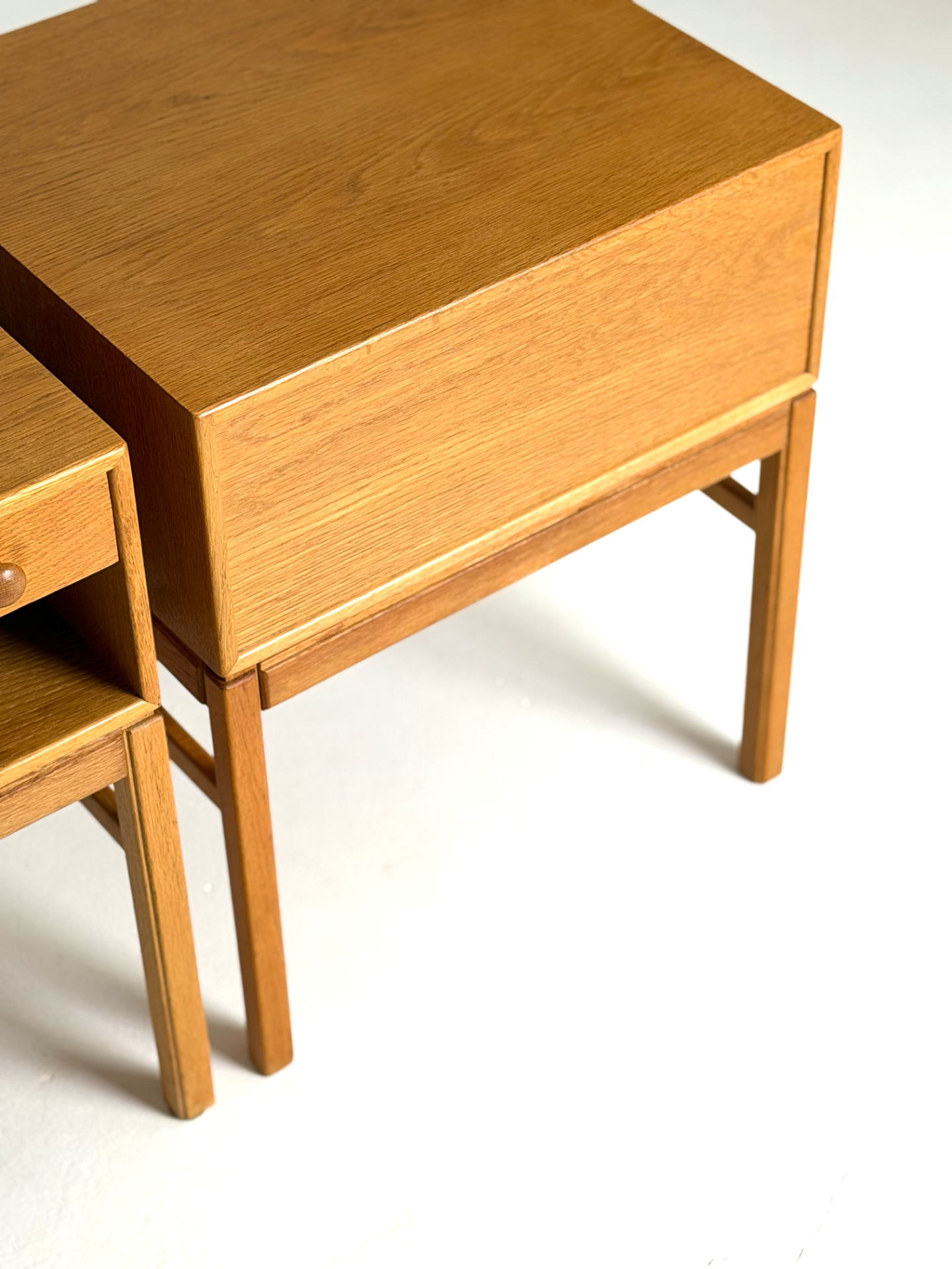 Refined and minimal oak bedside tables designed by Sven Engström & Gunnar Myrstrand. Model "Casino", manufactured by Tingströms Möbelfabrik in Sweden during the 1960s–70s. Each table includes a drawer and open shelf for practical storage. Scandinavian craftsmanship and timeless elegance in oak.