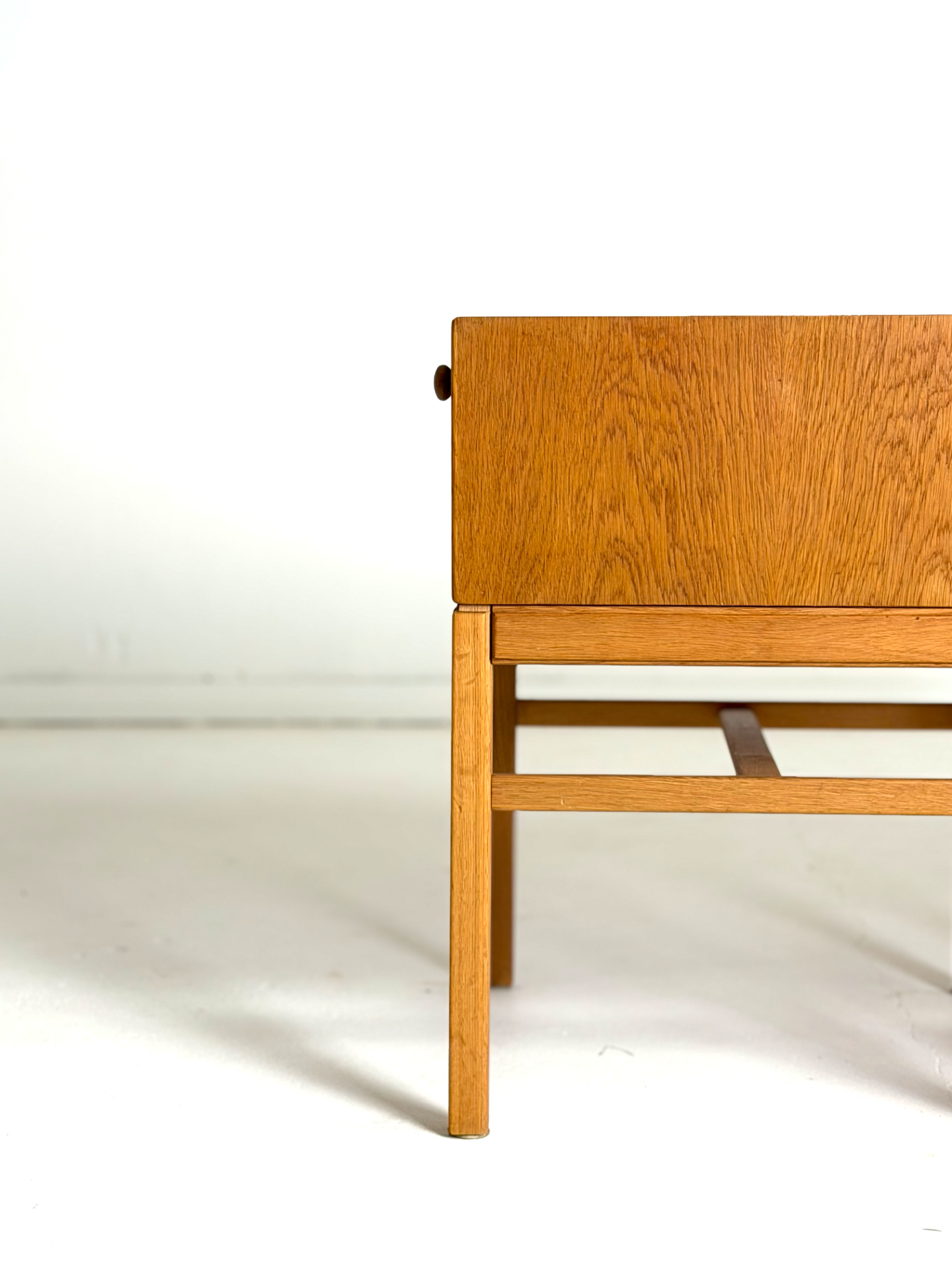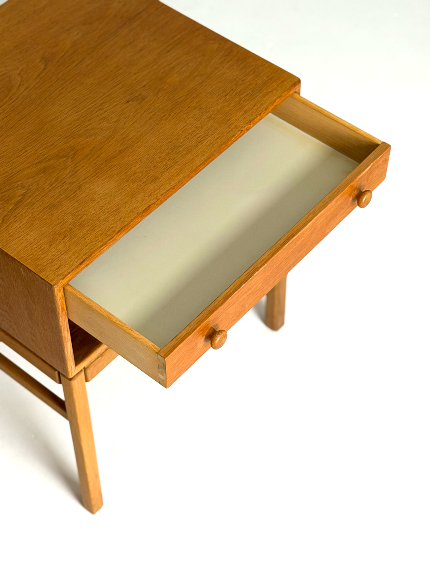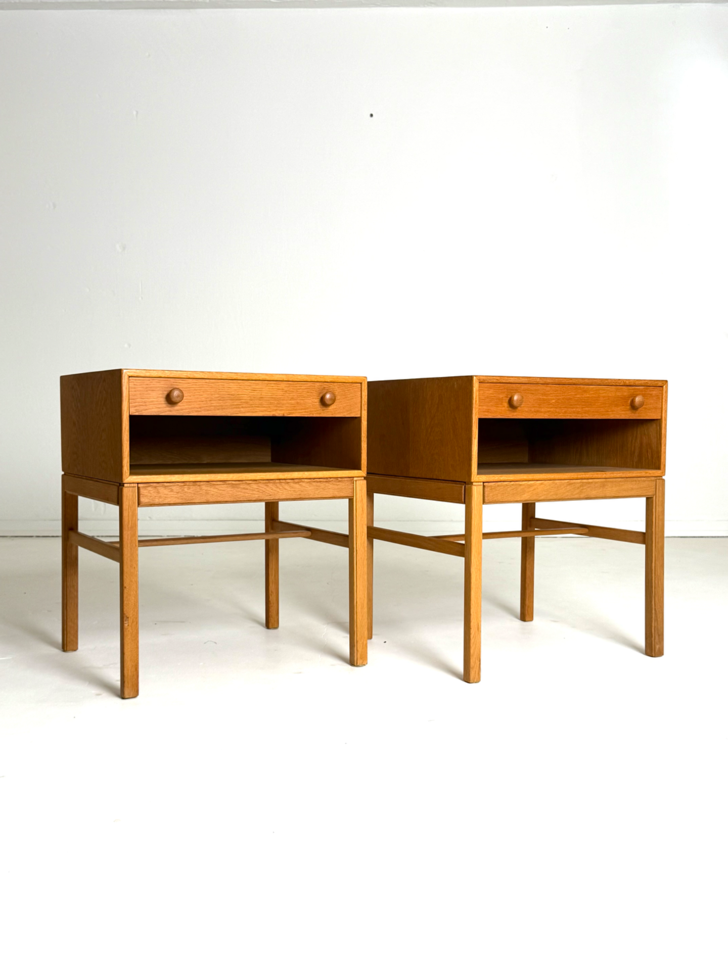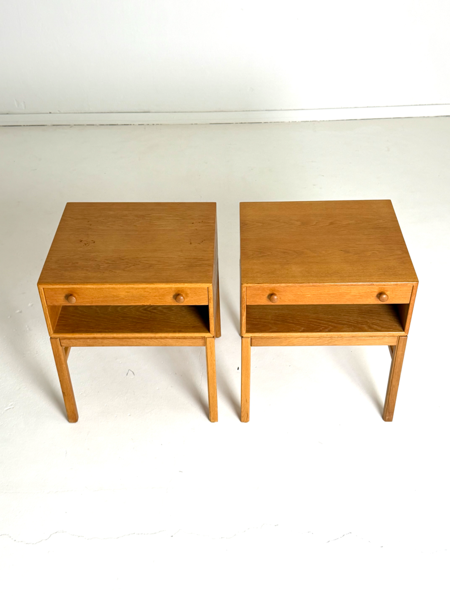 Refined and minimal oak bedside tables designed by Sven Engström & Gunnar Myrstrand. Model "Casino", manufactured by Tingströms Möbelfabrik in Sweden during the 1960s–70s. Each table includes a drawer and open shelf for practical storage. Scandinavian craftsmanship and timeless elegance in oak.