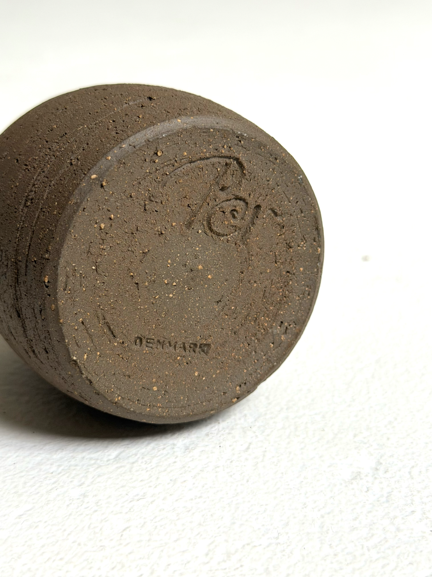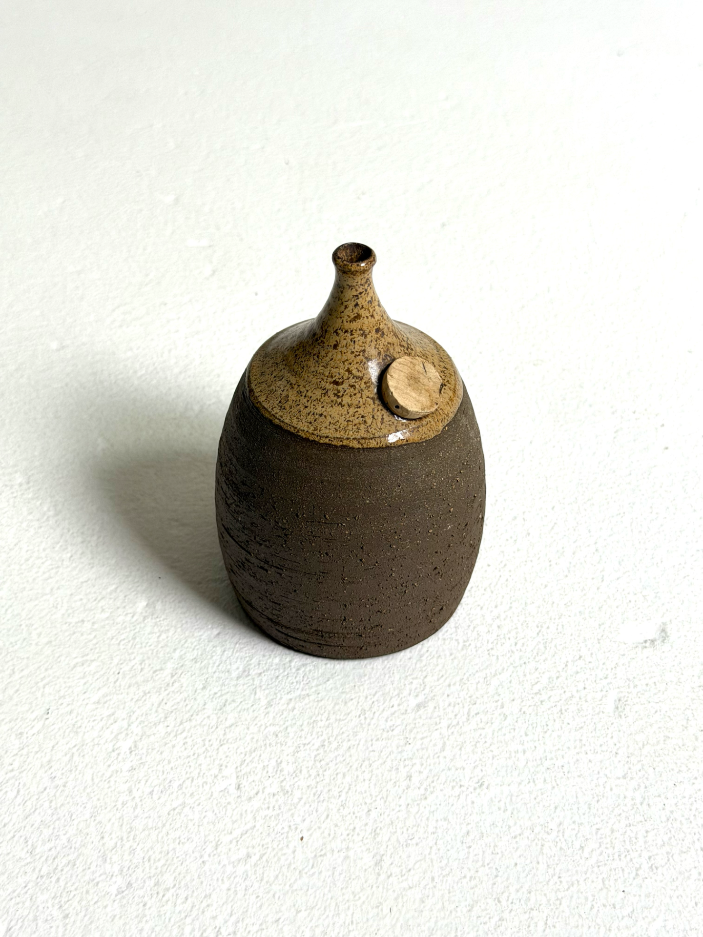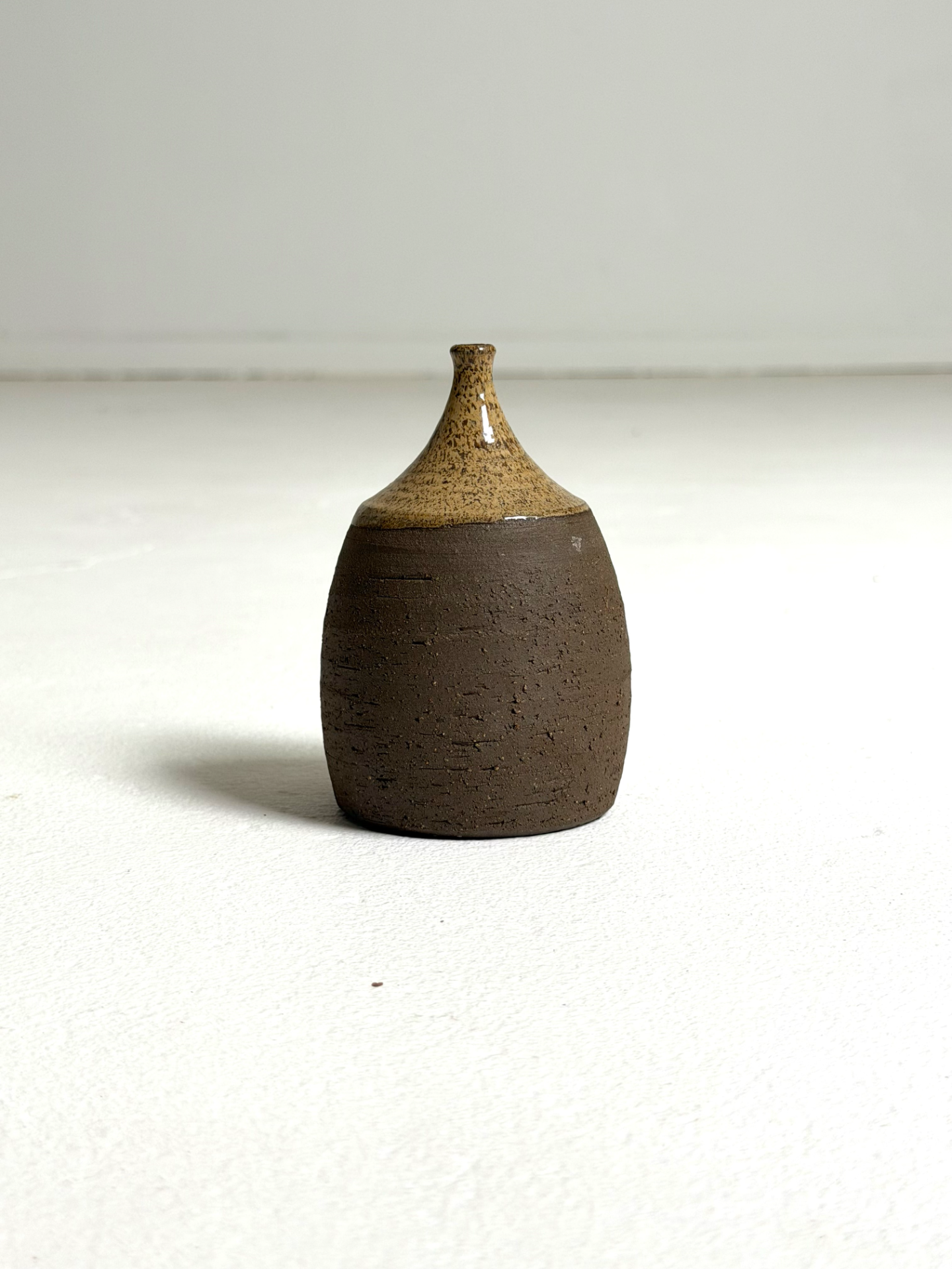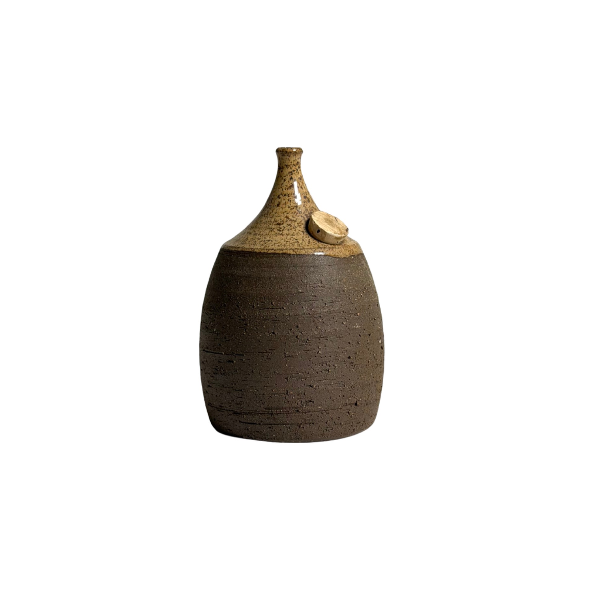 Viehättävä pieni keramiikkamaljakko 1970-luvulta, suunnittelijana tanskalainen keramiikkataiteilija Per Steffen Petersen. Esine muistuttaa muodoltaan vanhaa öljylamppua, ja siinä yhdistyvät lasitetut sekä rosoisen mattaiset pinnat kauniissa maanläheisissä sävyissä. Täydellinen lisä vintage-kokoelmaan tai persoonalliseksi yksityiskohdaksi sisustukseen.