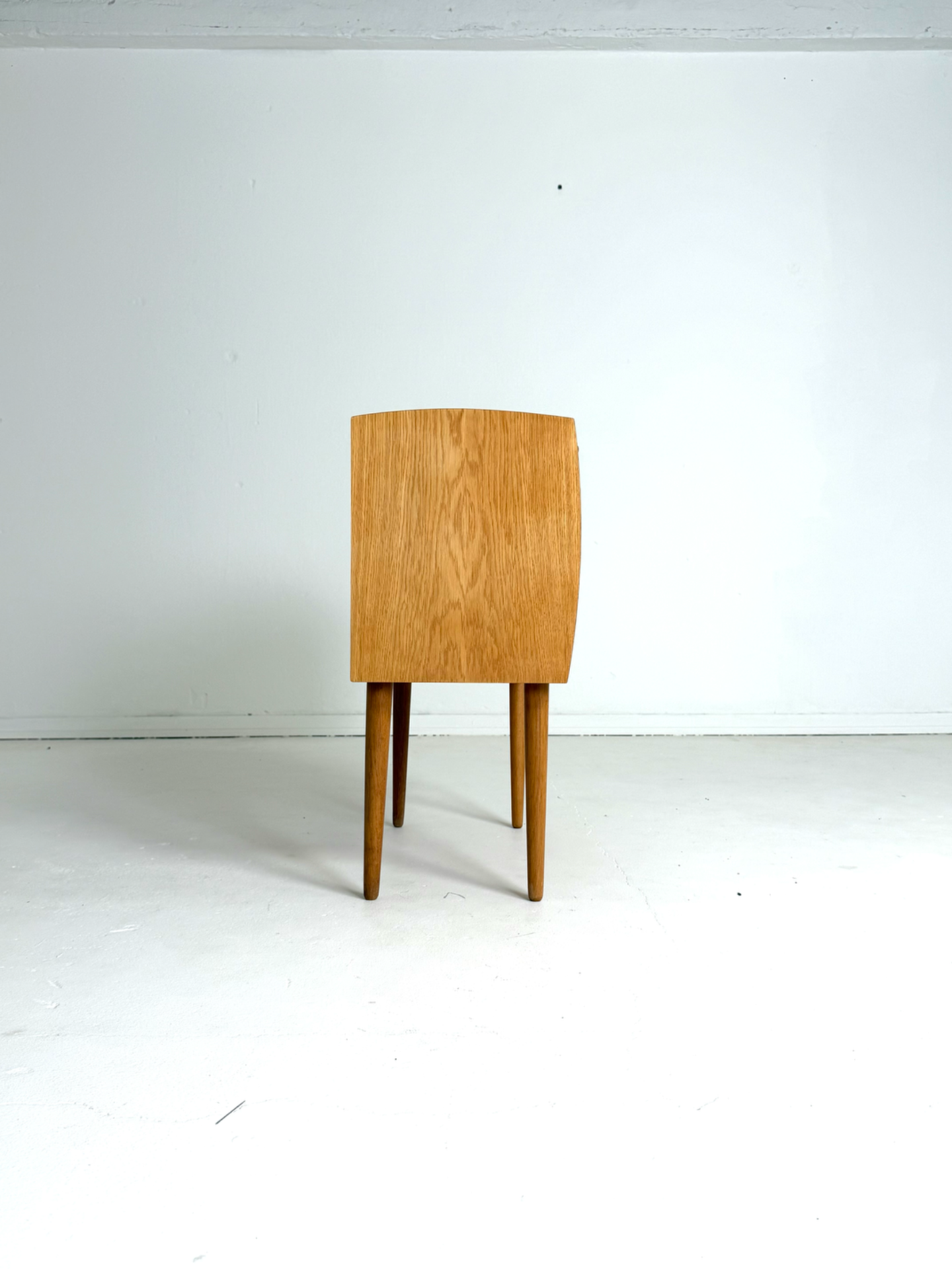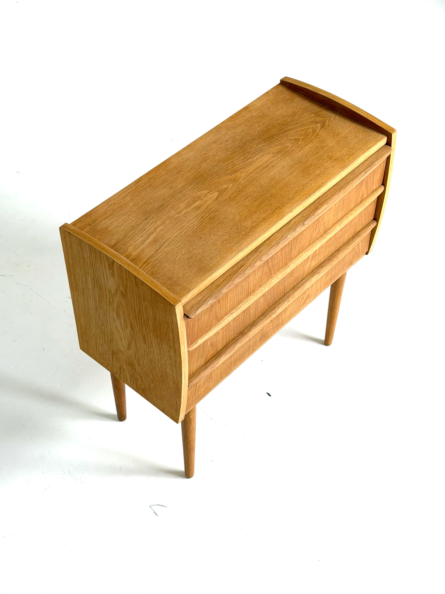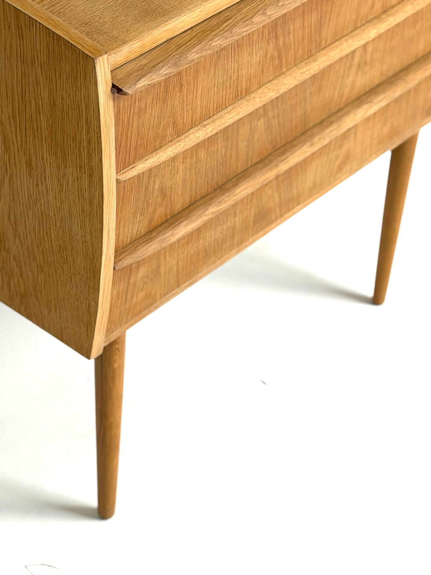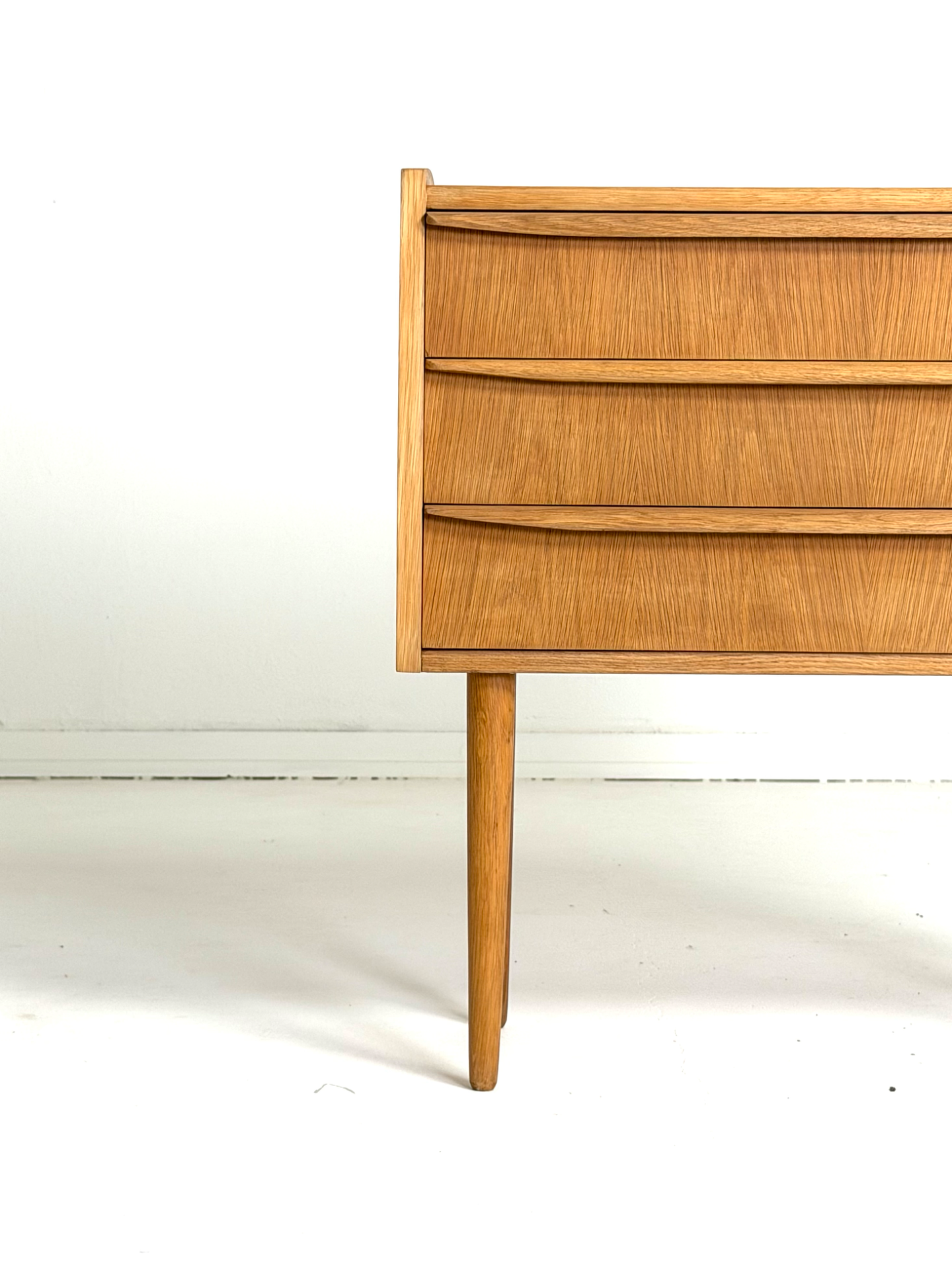 Kaunis ja siro vintage-lipasto 1960-luvun Tanskasta. Kolme laatikkoa ja kauniisti muotoillut vetimet tuovat lipastolle pehmeän ja ajattoman ilmeen. Tammiviilu korostaa luonnollista puunsyykuviota, ja korkeat kartiomaiset jalat antavat keveyttä kokonaisuuteen. Täydellinen yöpöydäksi, eteiseen tai pieneen säilytystarpeeseen.