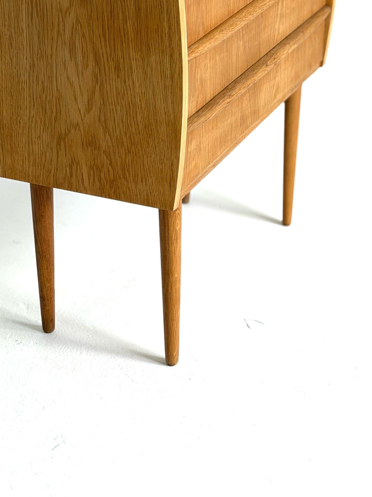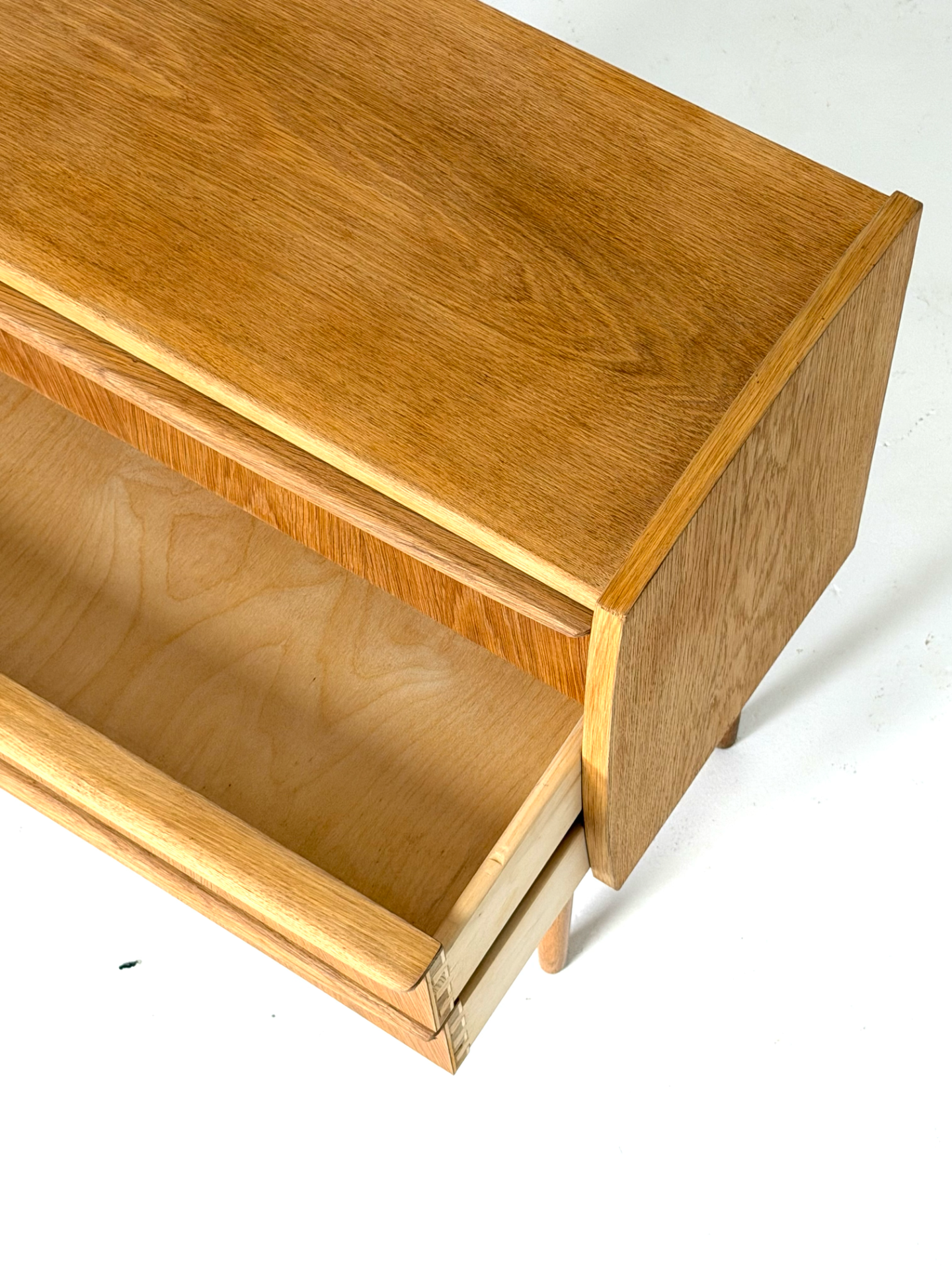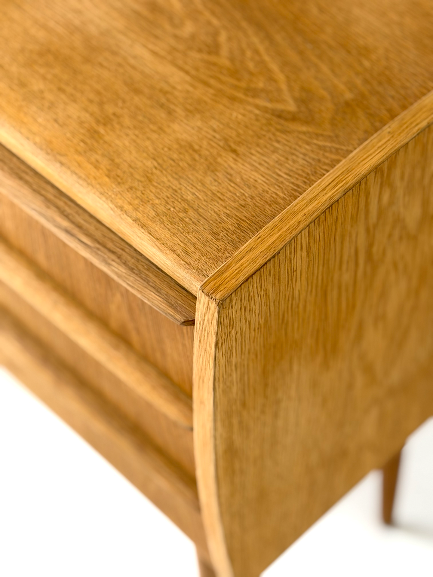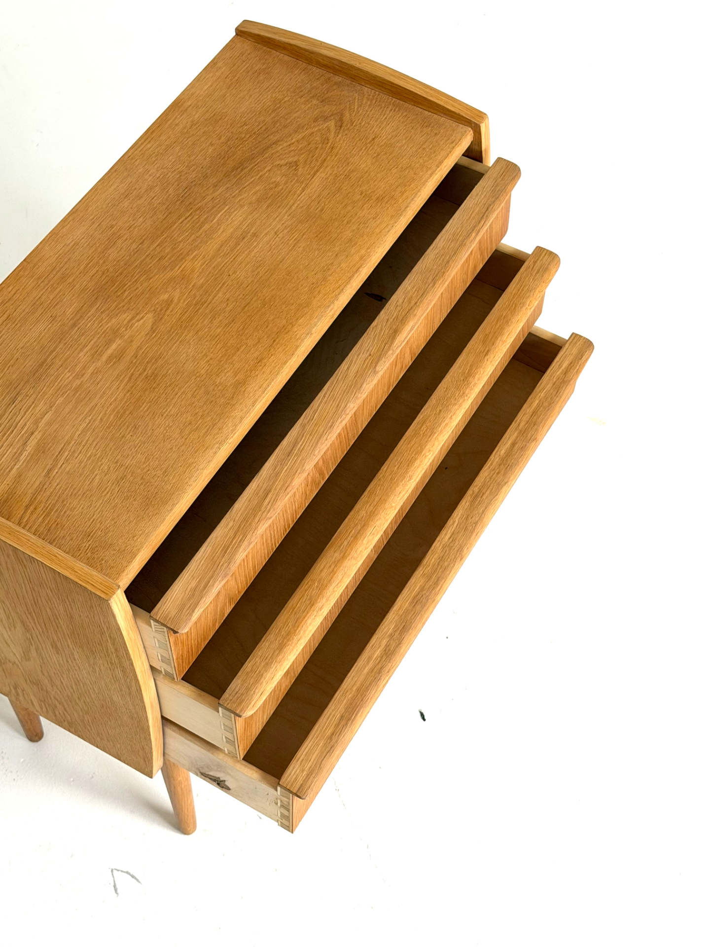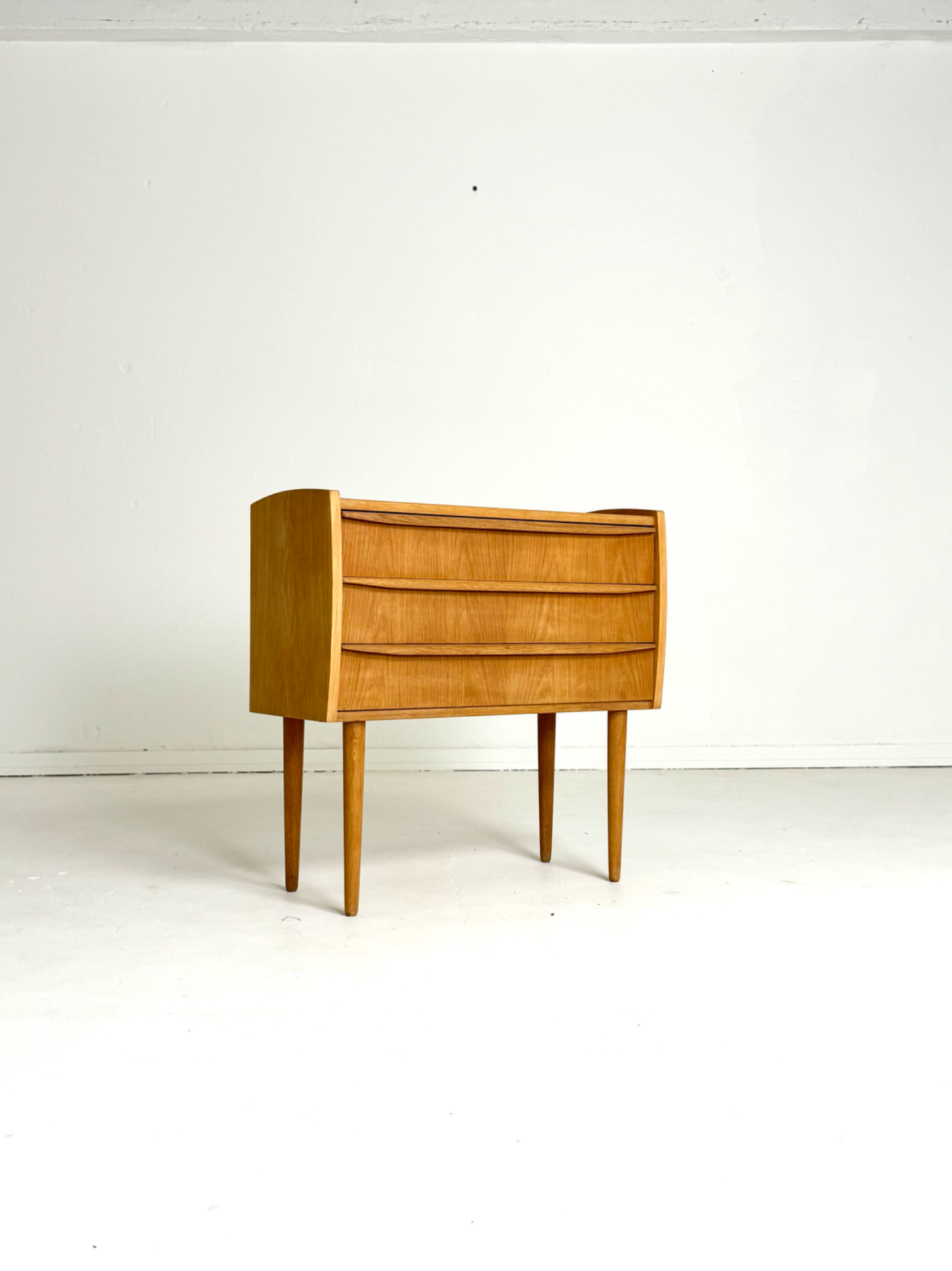 Kaunis ja siro vintage-lipasto 1960-luvun Tanskasta. Kolme laatikkoa ja kauniisti muotoillut vetimet tuovat lipastolle pehmeän ja ajattoman ilmeen. Tammiviilu korostaa luonnollista puunsyykuviota, ja korkeat kartiomaiset jalat antavat keveyttä kokonaisuuteen. Täydellinen yöpöydäksi, eteiseen tai pieneen säilytystarpeeseen.