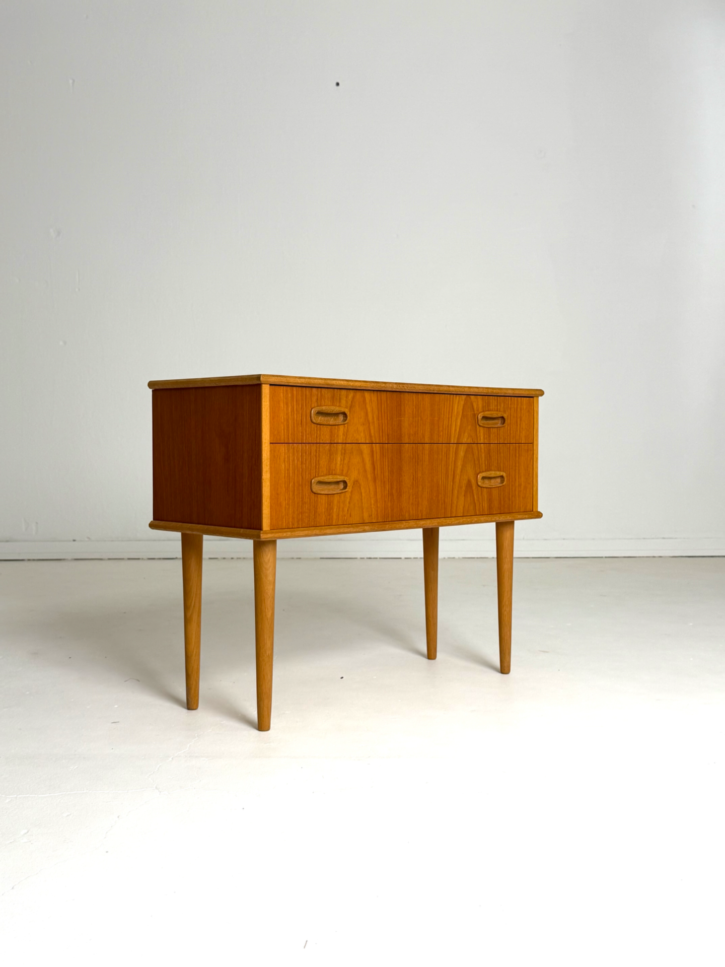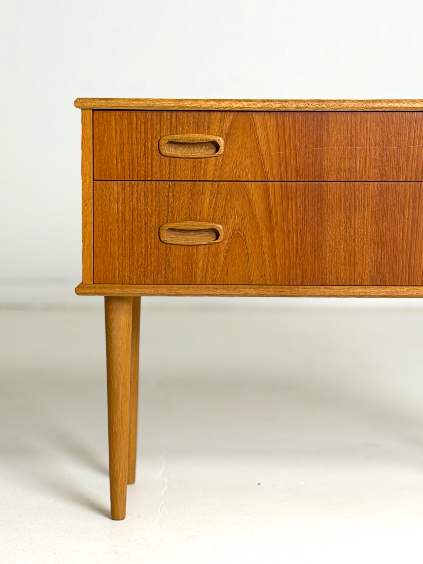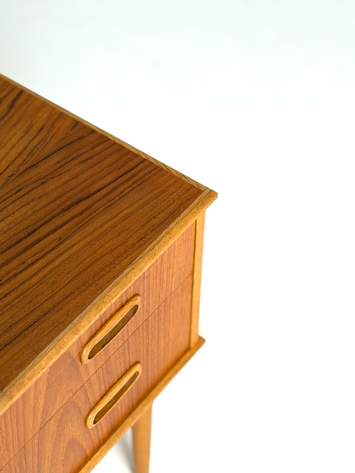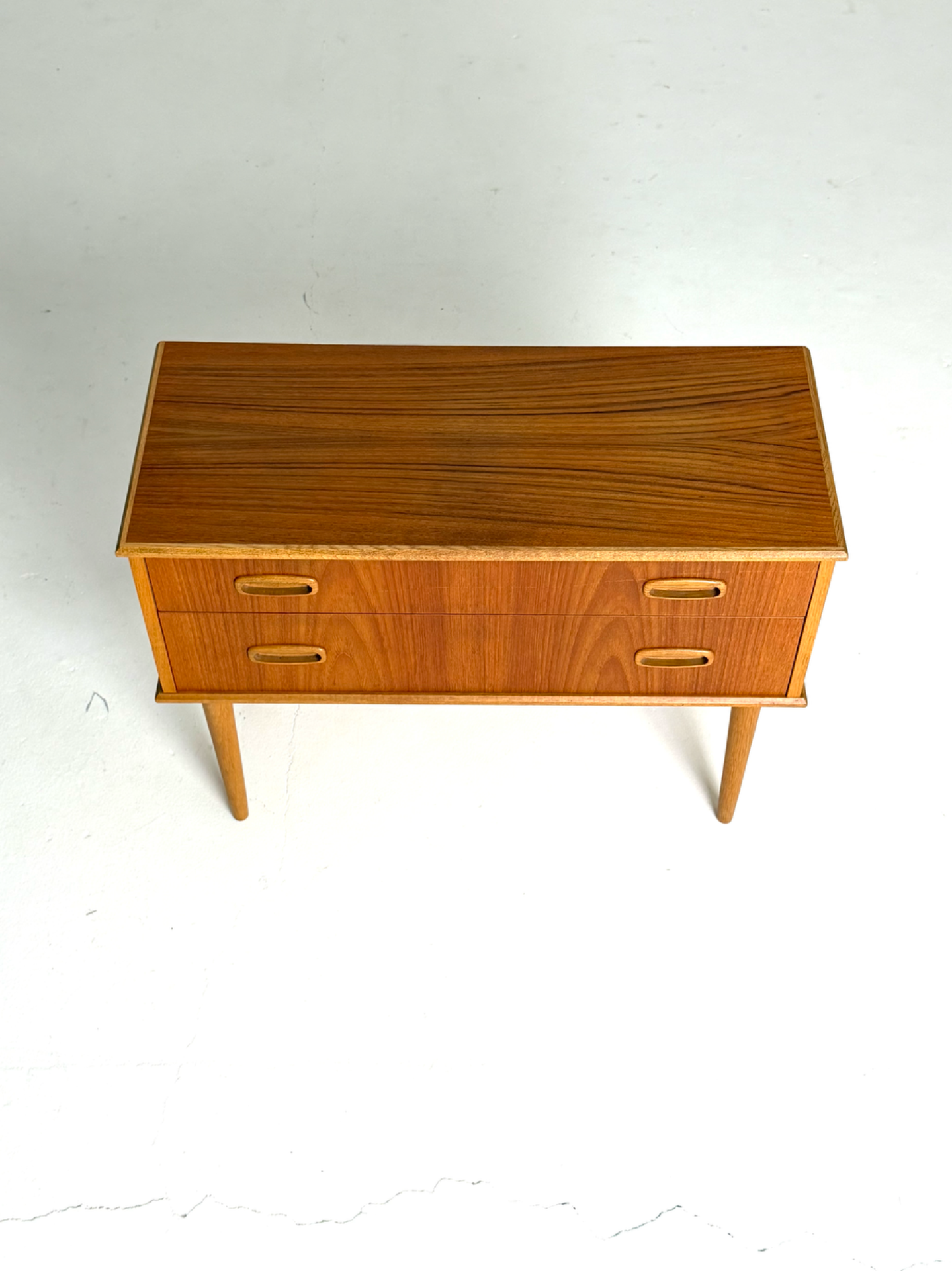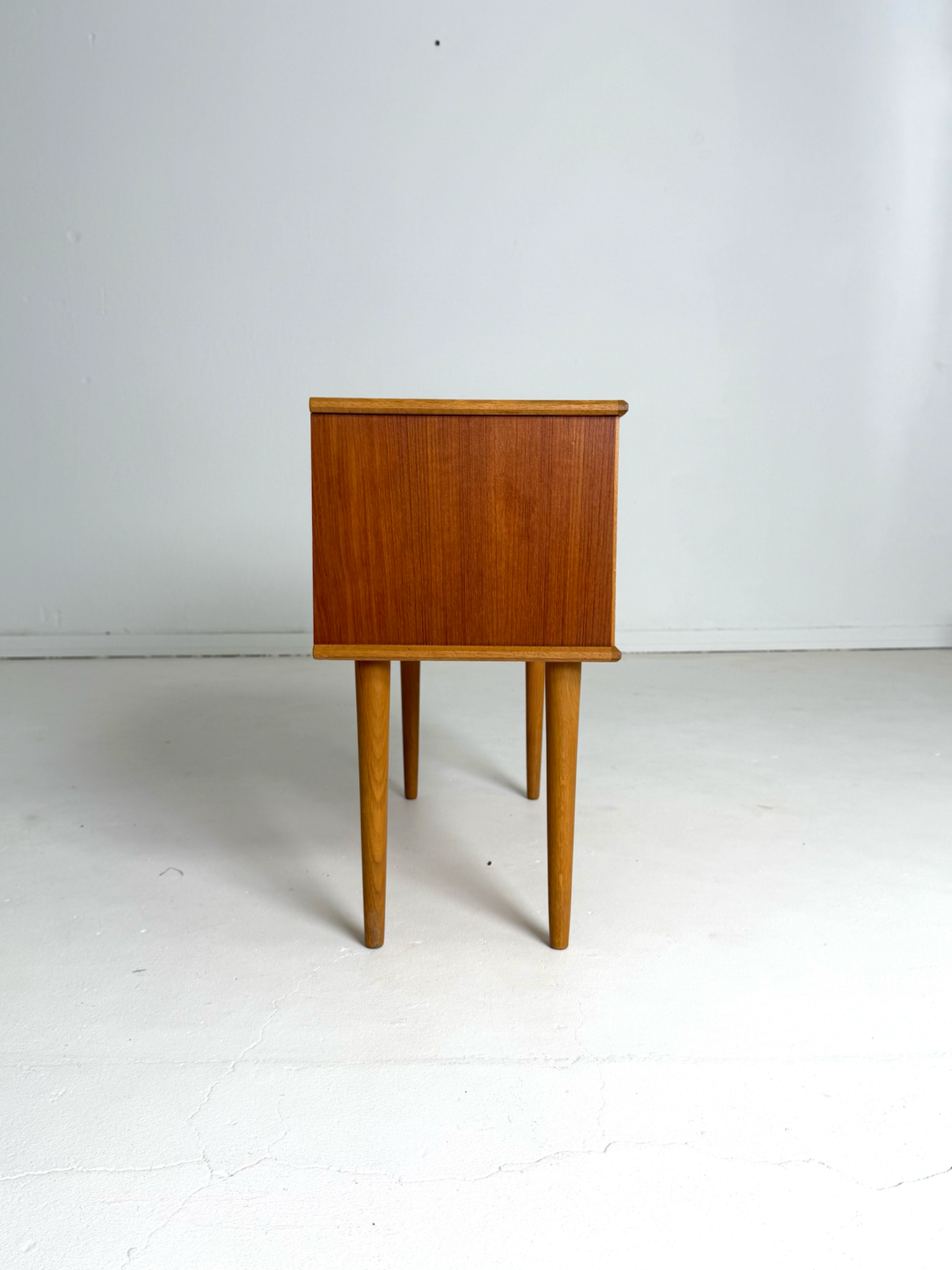 Tyylikäs pieni vintage-lipasto, joka toimii erinomaisesti myös yöpöytänä. Lipasto on valmistettu lämpimän sävyisestä tiikistä, ja sitä kehystävät kauniit tammiset reunalistat sekä sirot, sorvatut jalat. Aikakaudelle tyypilliset upotetut vetimet viimeistelevät ilmeen. Ruotsalaista muotoilua 1960-luvulta, joka tuo kotiin ajattoman ja skandinaavisen tunnelman.