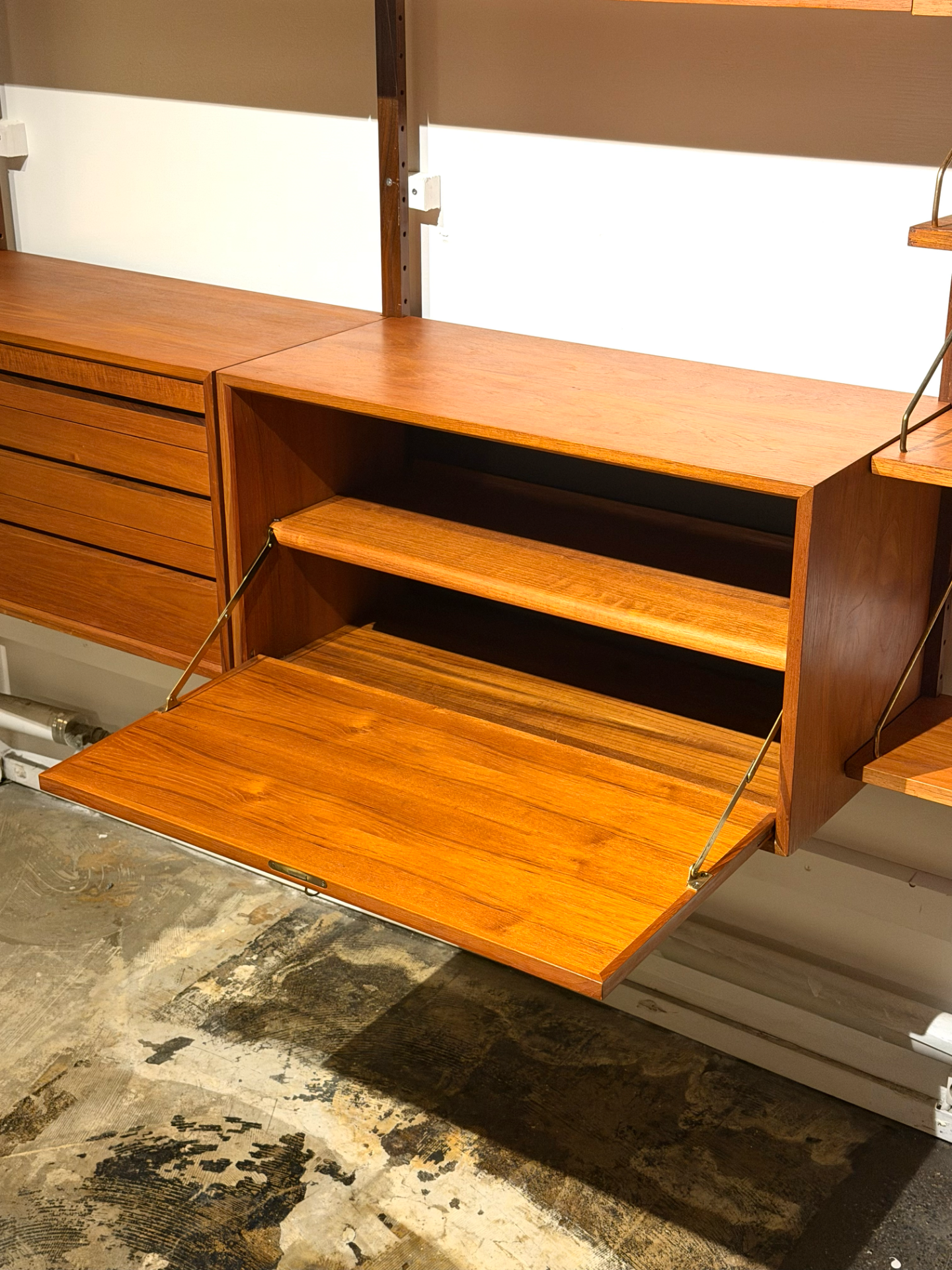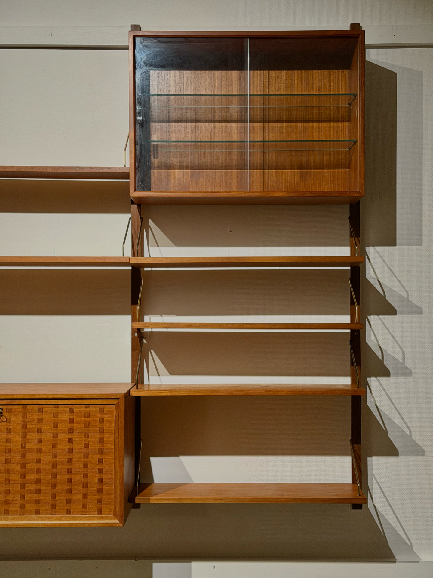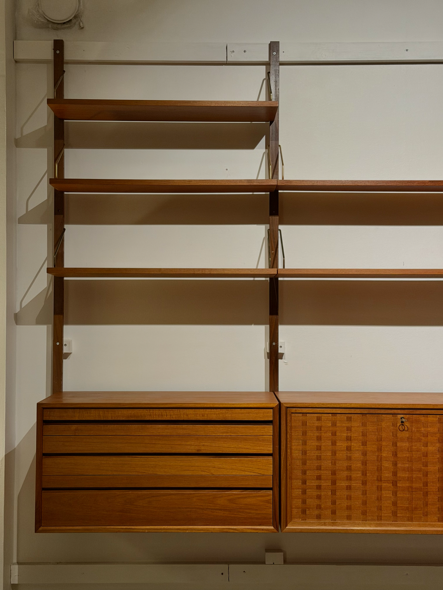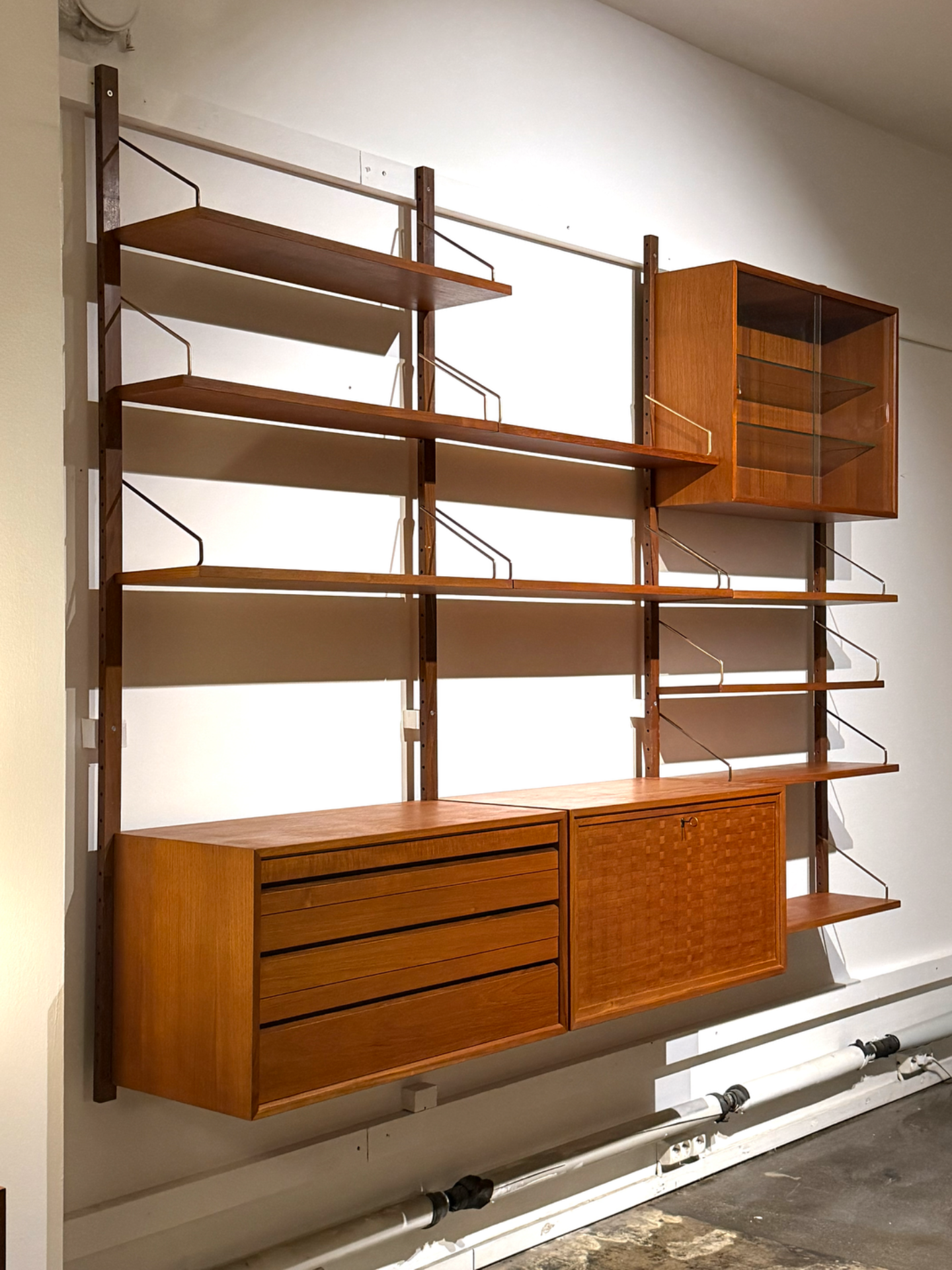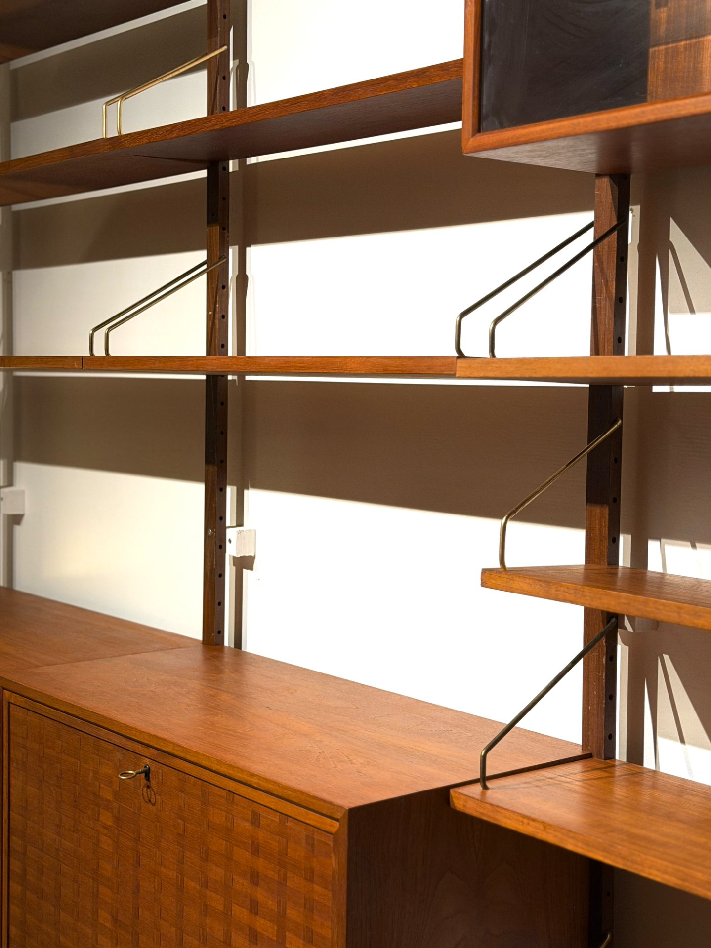 Tyylikäs ja muunneltava Royal System -hyllyjärjestelmä, suunnittelija Poul Cadovius. Valmistettu tiikistä ja varustettu messinkisillä kannattimilla. Kokonaisuus sisältää yhdeksän hyllyä, kaapin, laatikoston sekä vitriinikaapin. Ajaton tanskalainen designklassikko, joka toimii loistavasti niin työtilassa kuin olohuoneessakin.