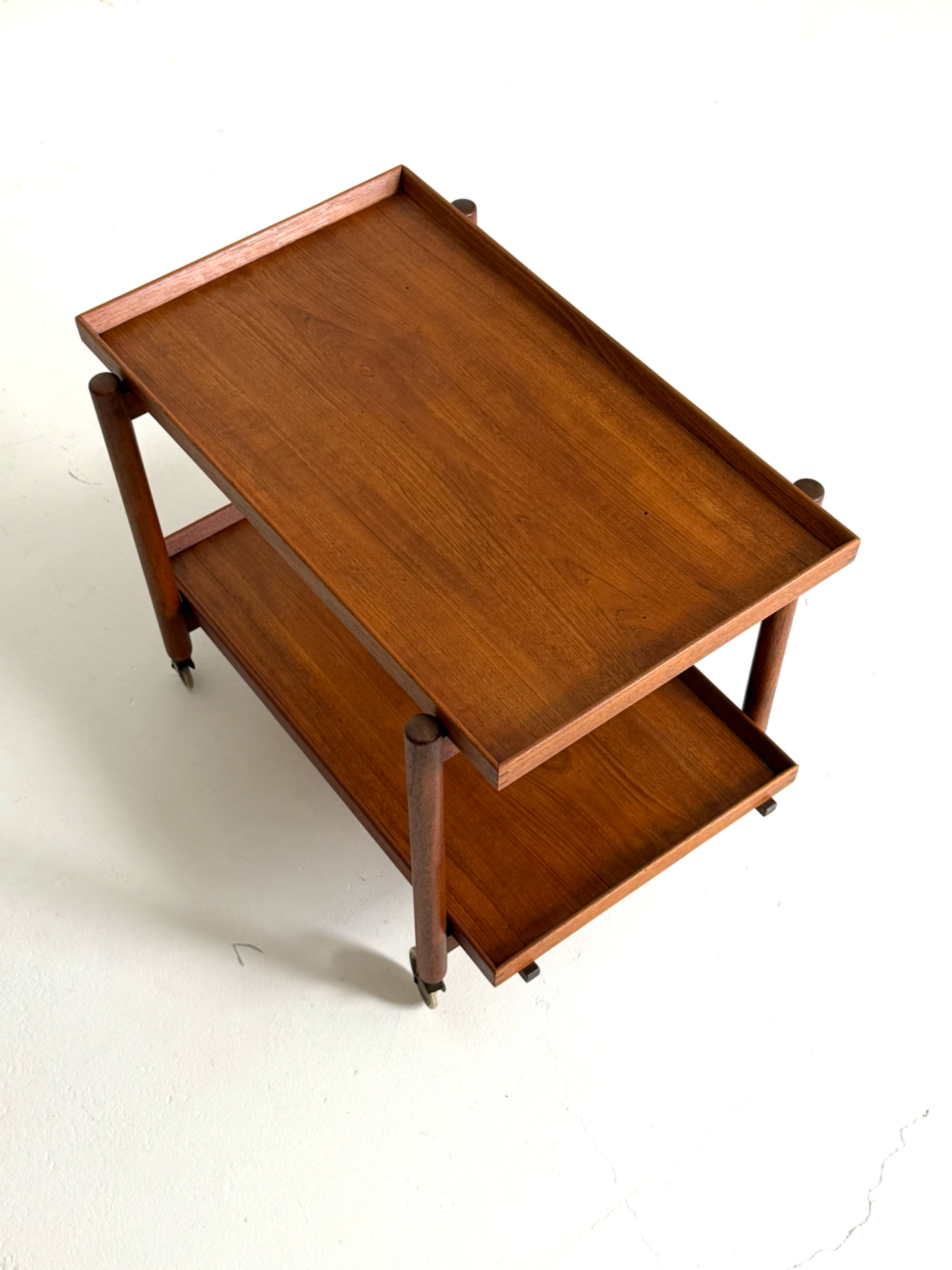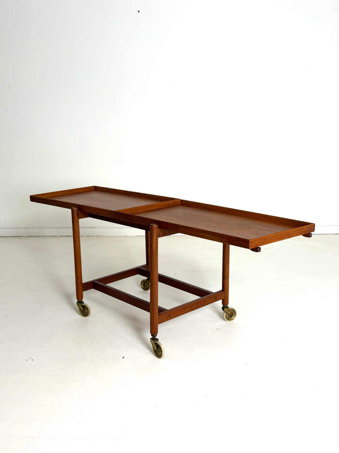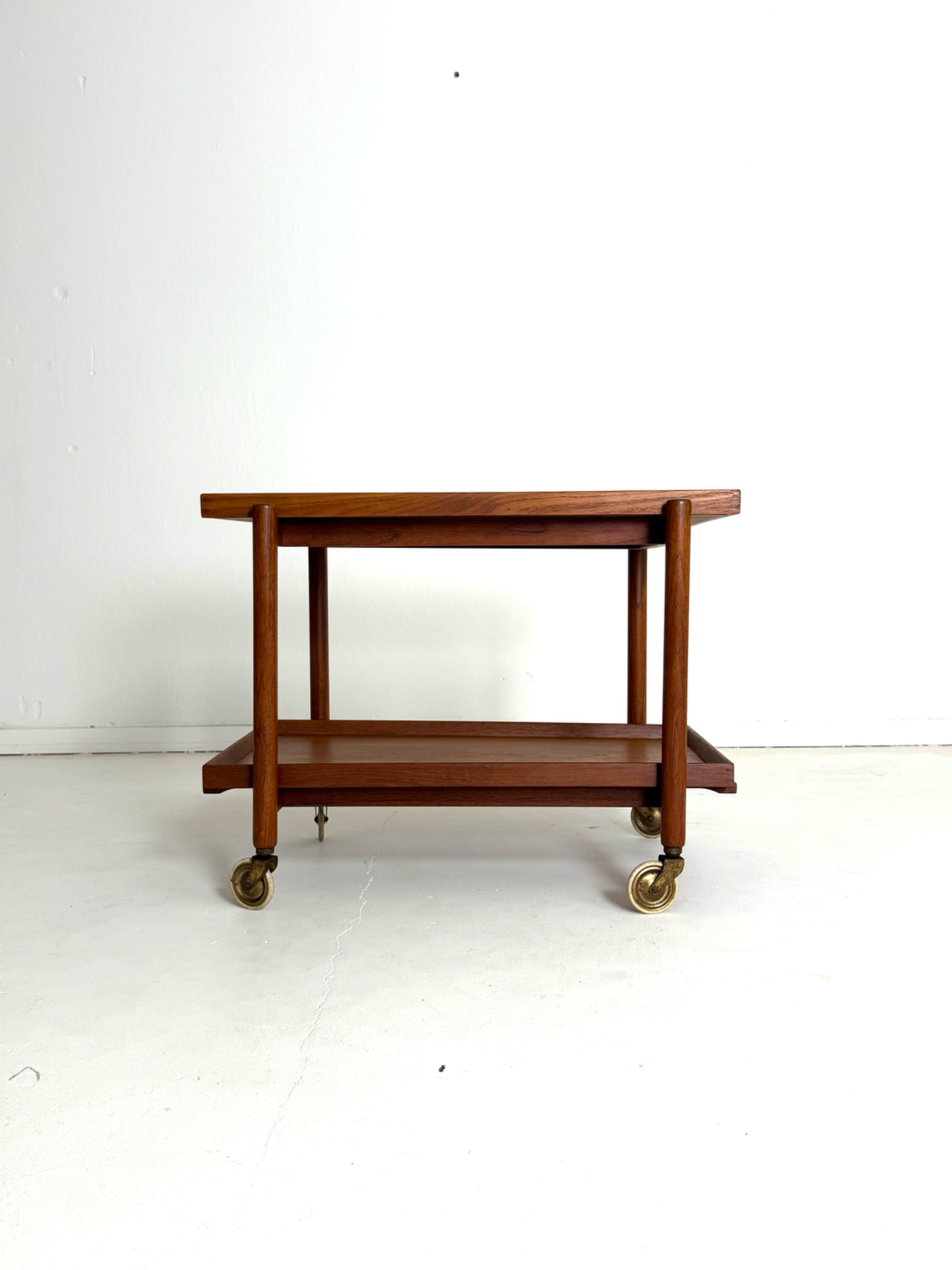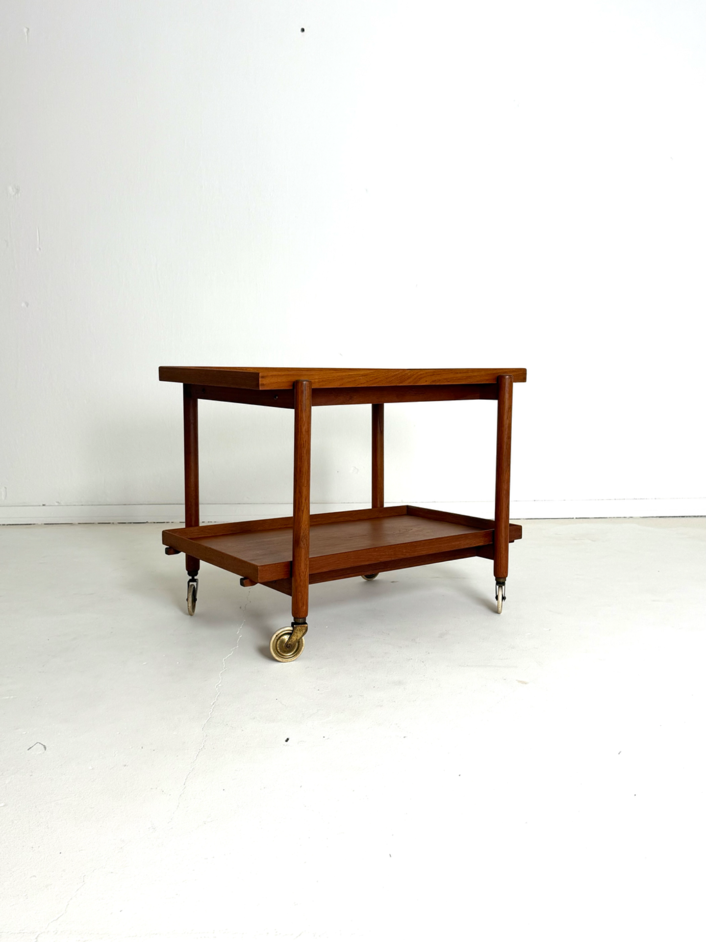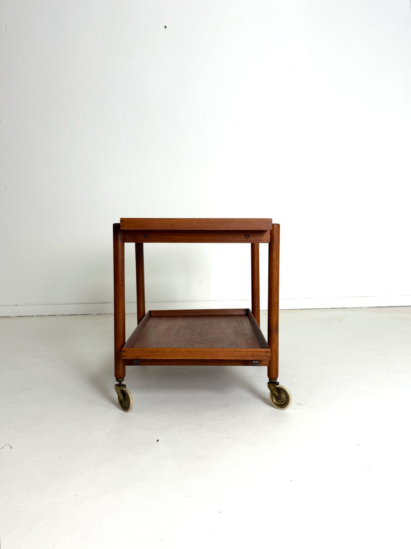 Kevyt rakenne, sirot mittasuhteet ja kauniisti patinoitunut tiikki luovat elegantin kokonaisuuden. Messinkiset pyörät viimeistelevät ilmeen ja tuovat helppoa liikuteltavuutta.