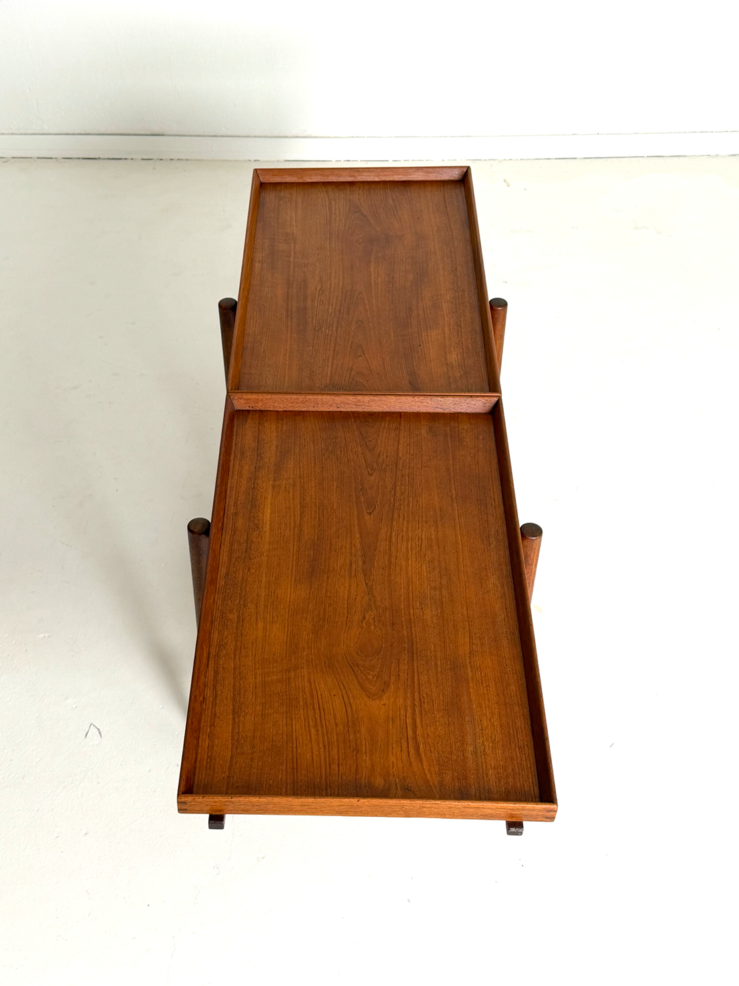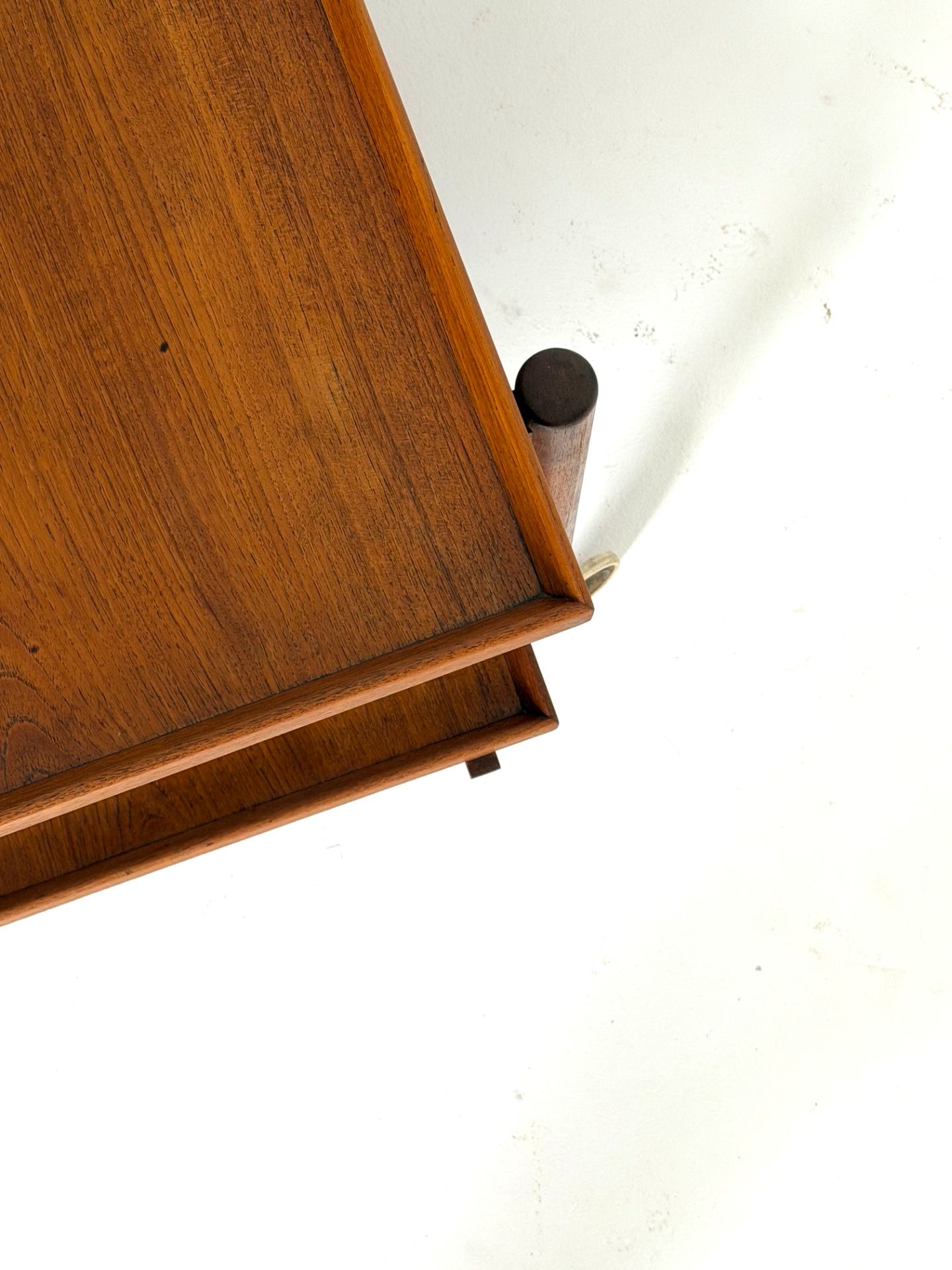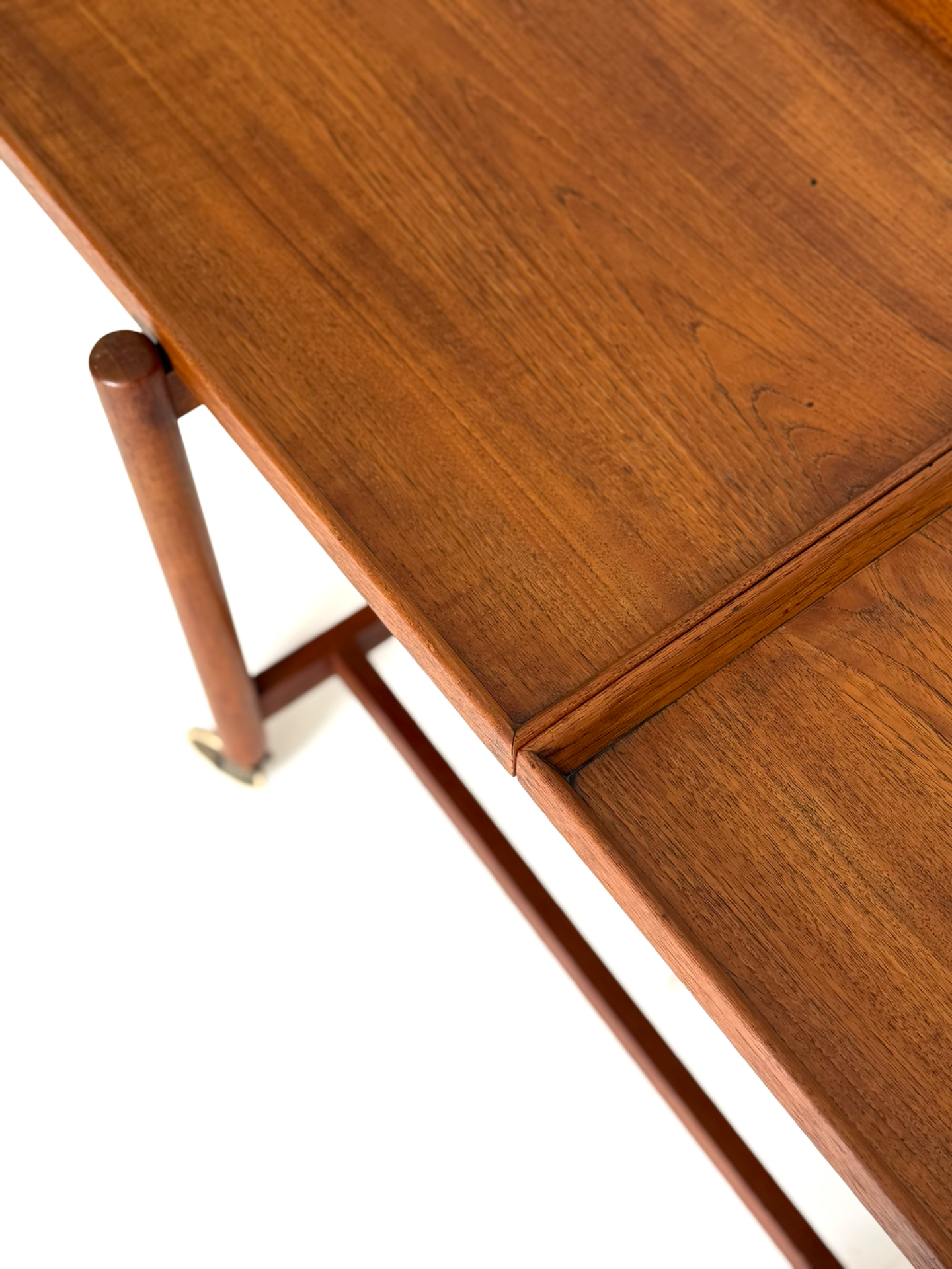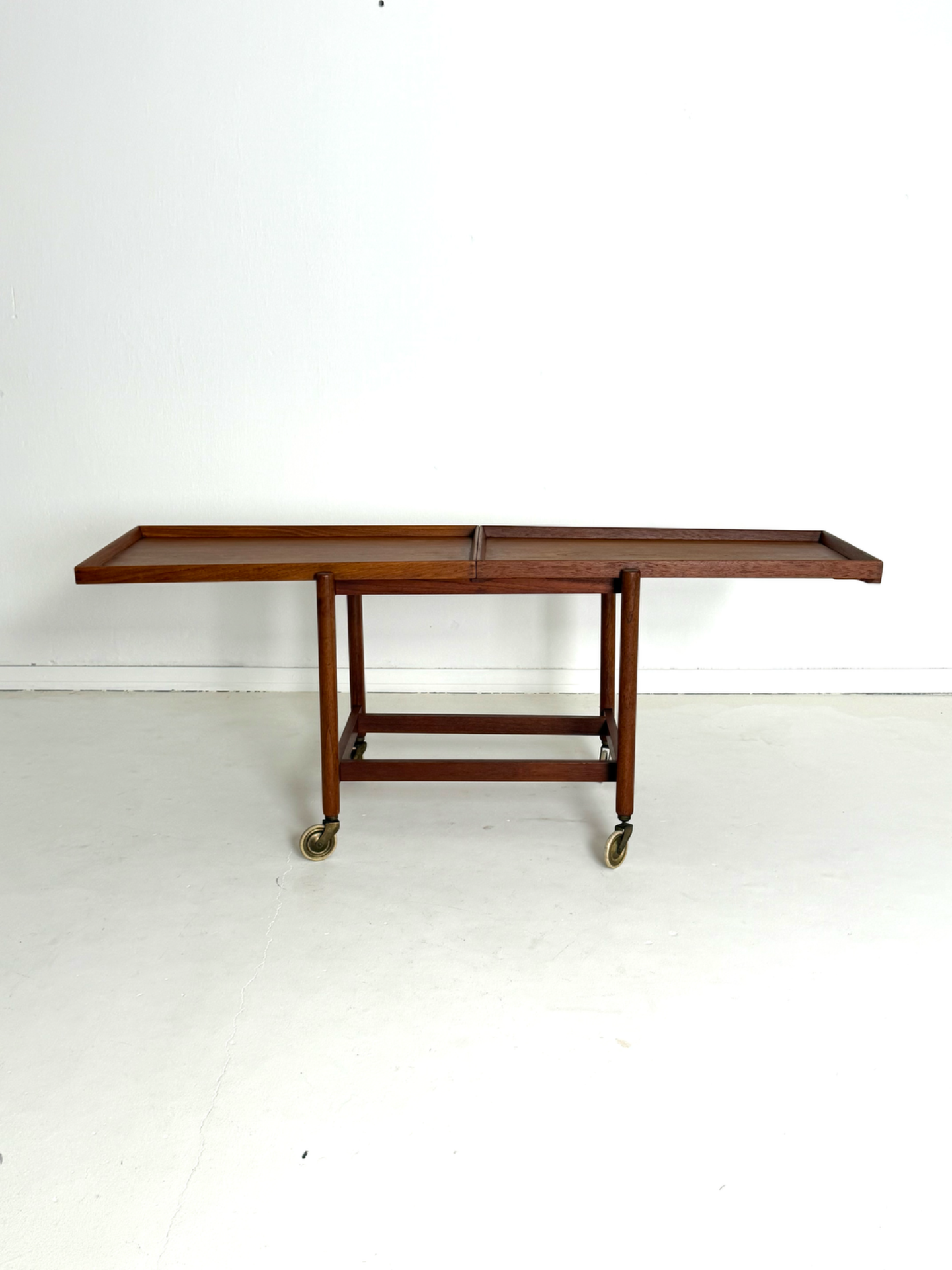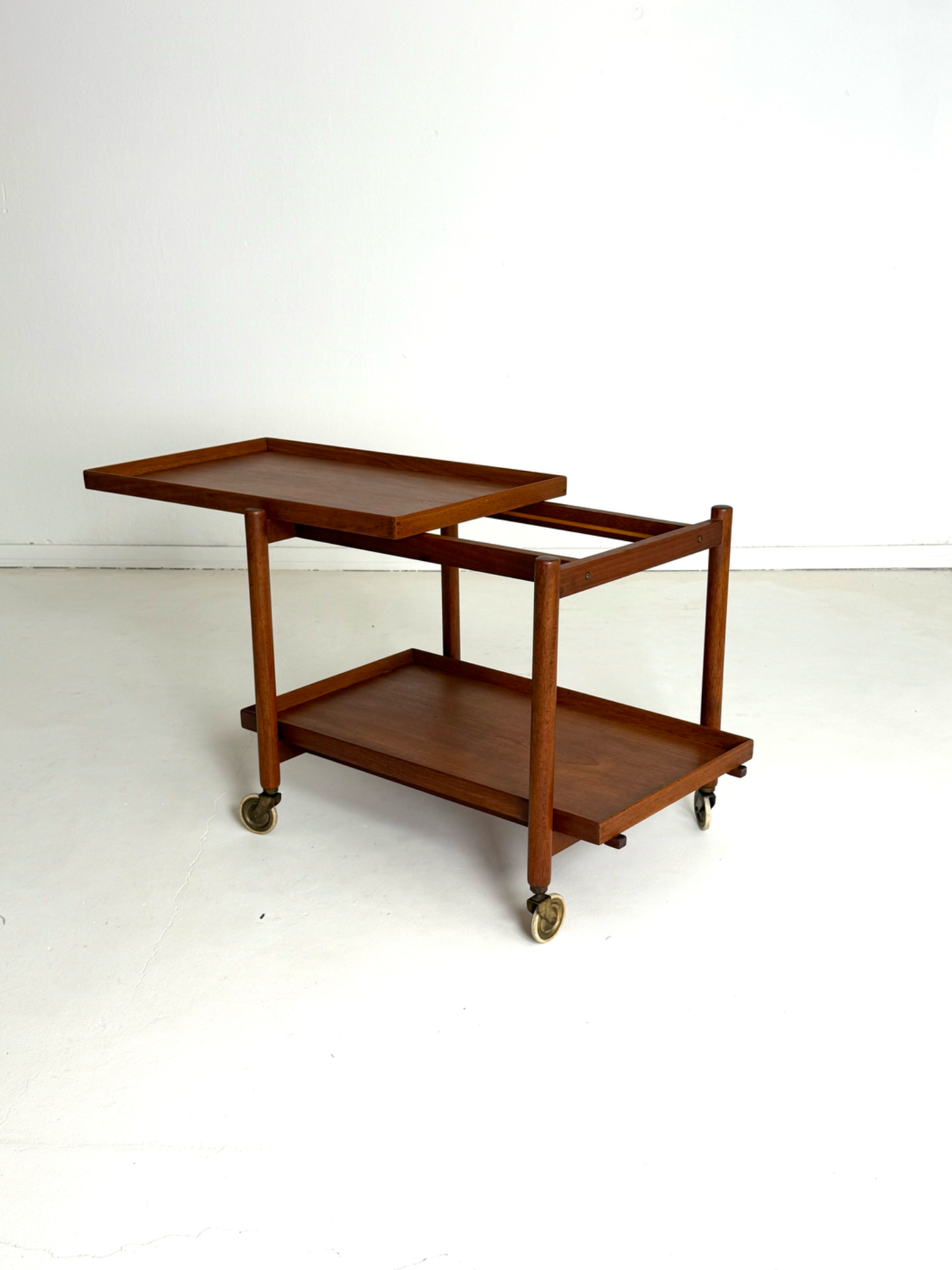 Kevyt rakenne, sirot mittasuhteet ja kauniisti patinoitunut tiikki luovat elegantin kokonaisuuden. Messinkiset pyörät viimeistelevät ilmeen ja tuovat helppoa liikuteltavuutta.
