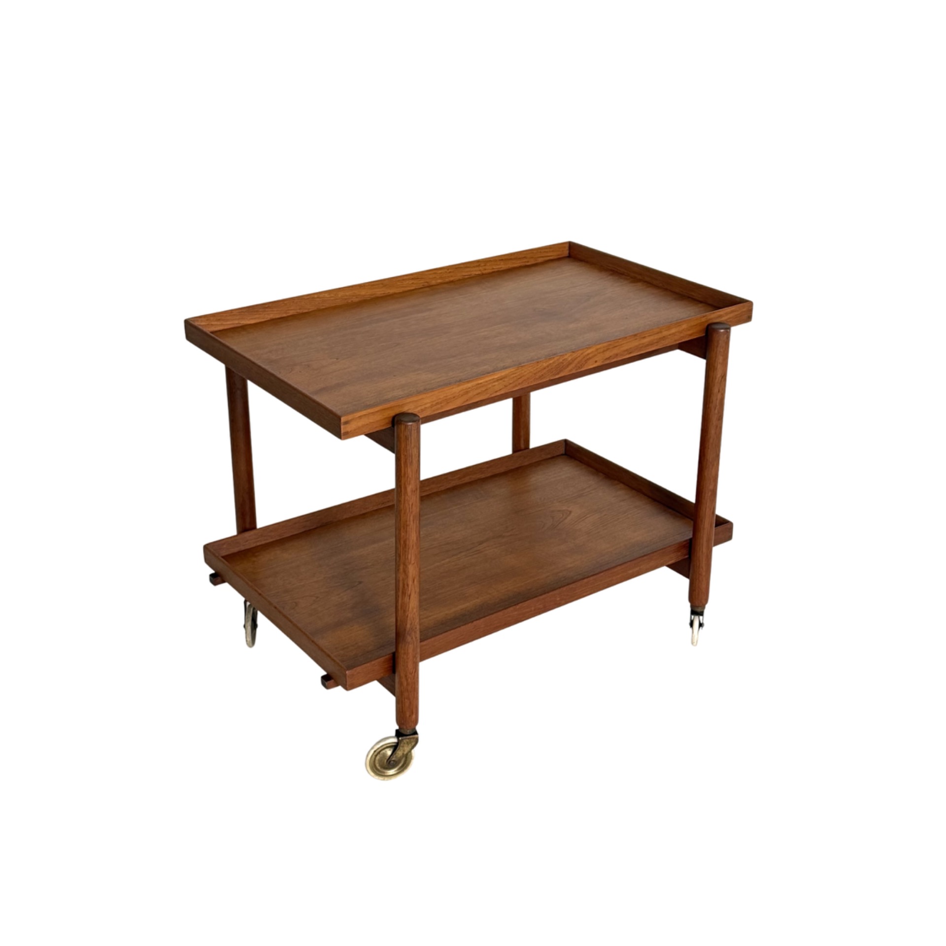 Tyylikäs ja oivaltavasti suunniteltu tarjoiluvaunu Poul Hundevadilta 1950-luvulta. Valmistettu laadukkaasta tiikistä Vamdrupin huonekalutehtaalla – esimerkki tanskalaisen designin funktionaalisuudesta ja ajattomasta estetiikasta.