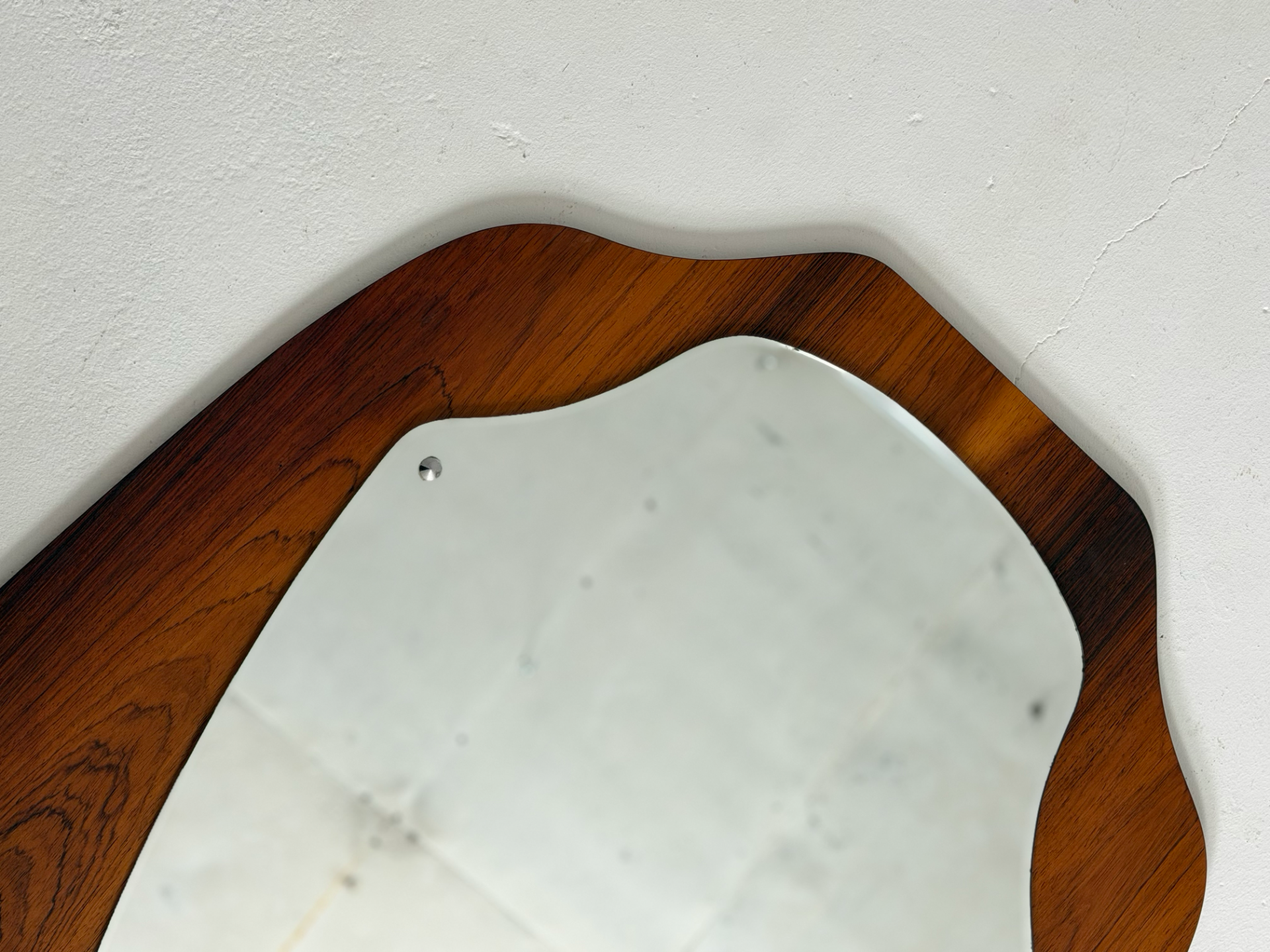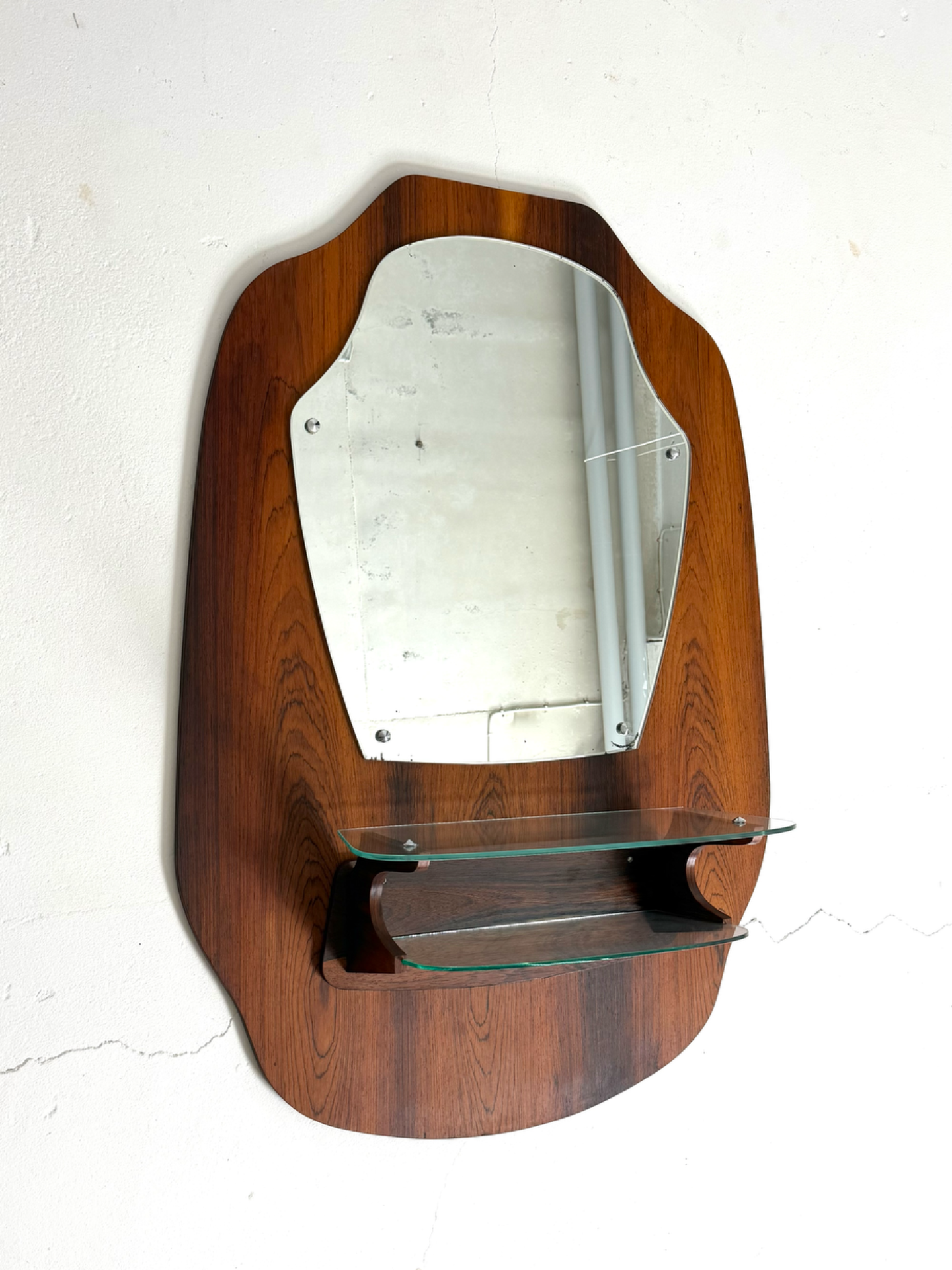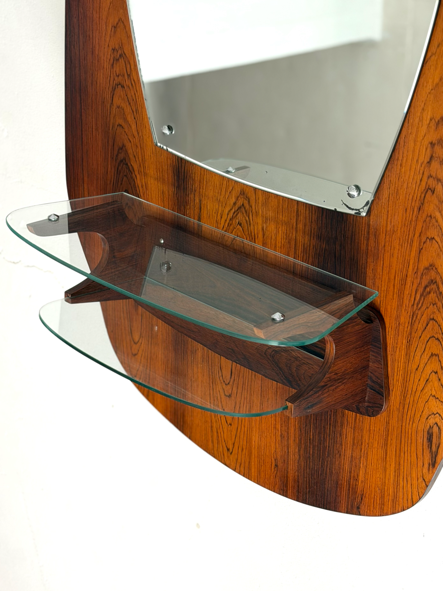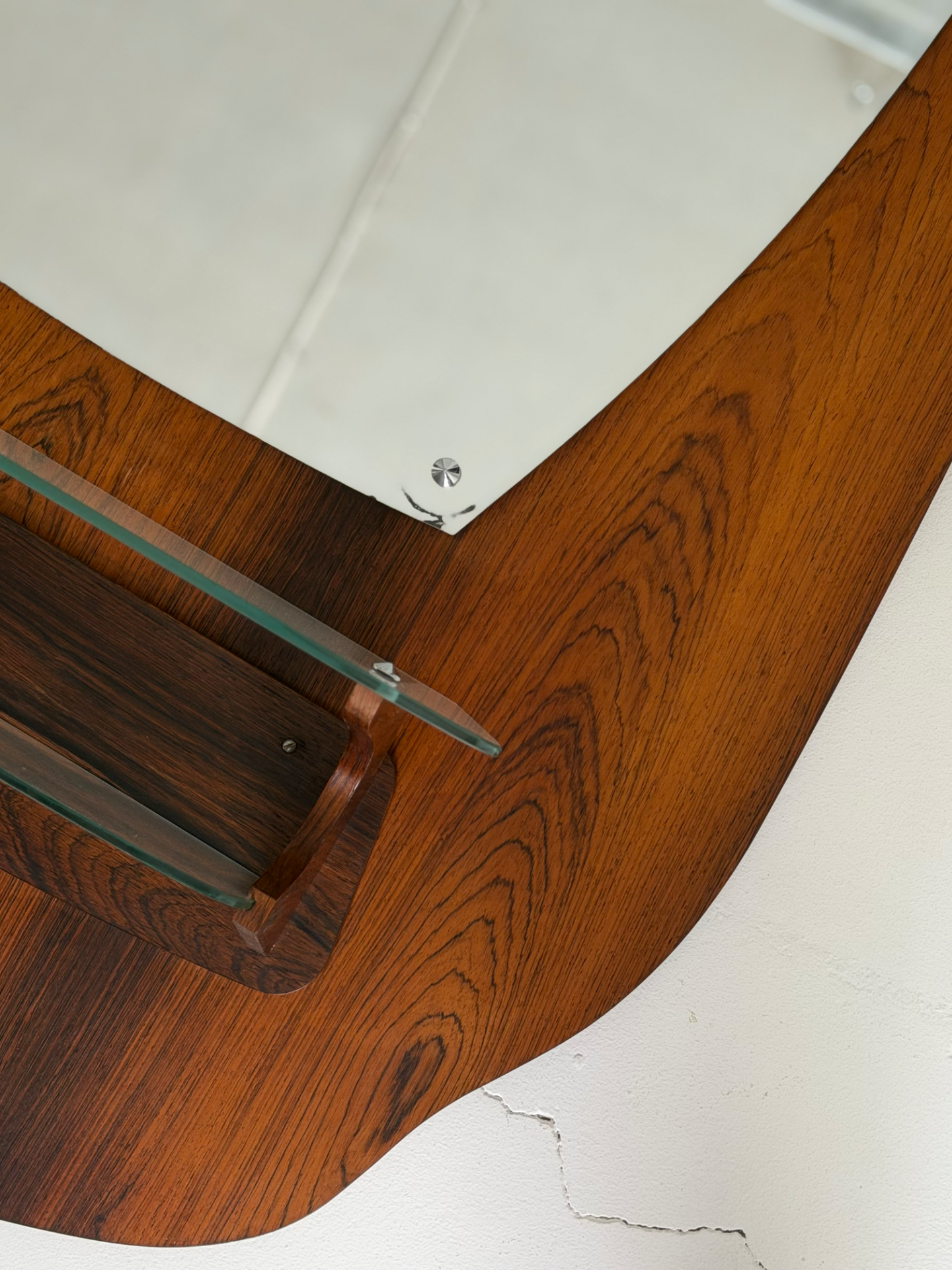 A stunning and one-of-a-kind vintage mirror, originally custom-made for a hair salon in Esbjerg, Denmark. The piece features a beautifully contoured rosewood backplate and two slim glass shelves for storage or display. A striking combination of craftsmanship and Scandinavian elegance — perfect for hallways, dressing areas, or bathrooms.