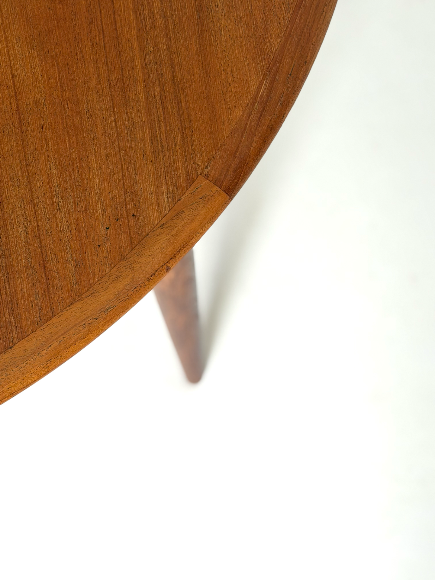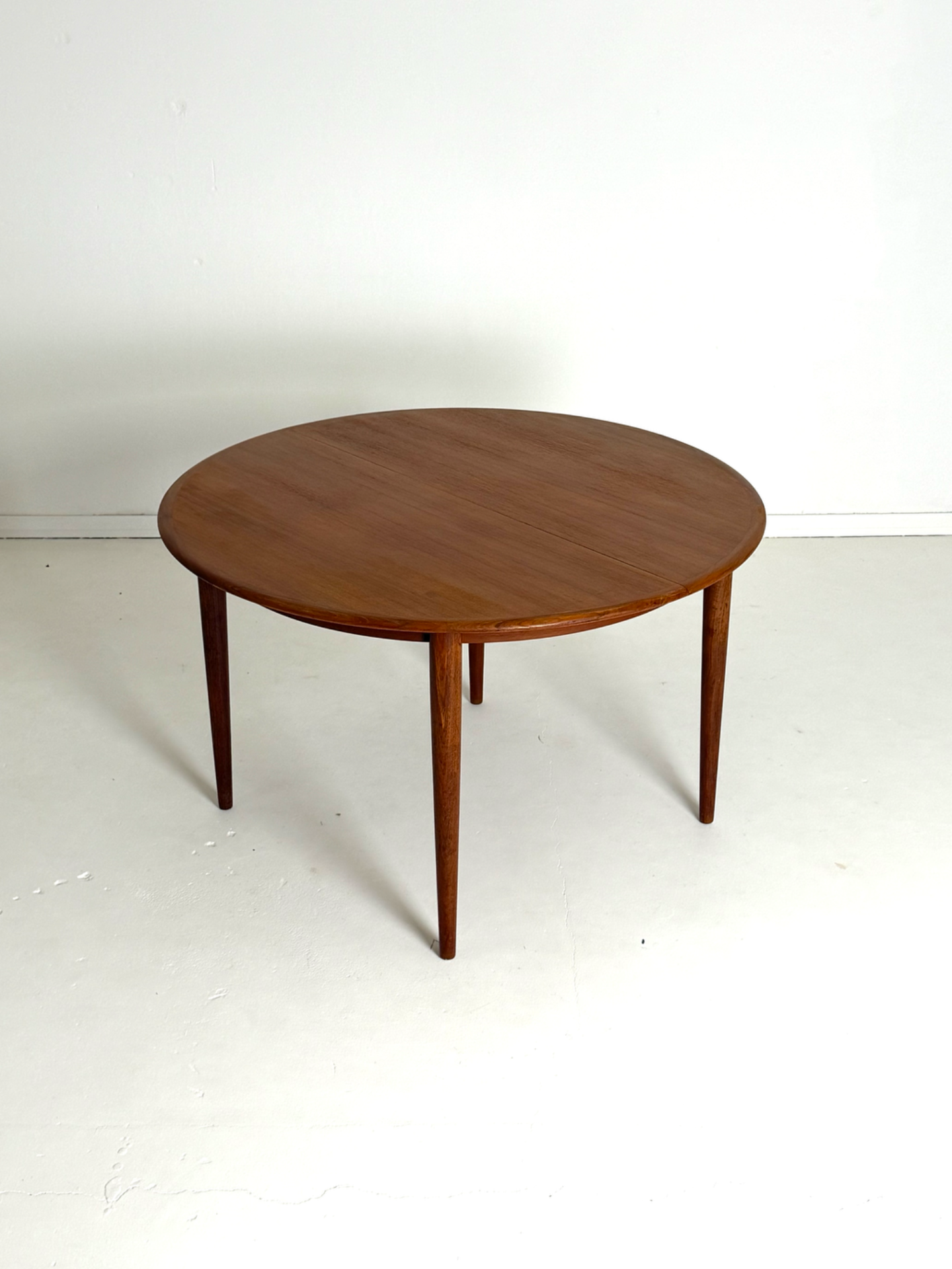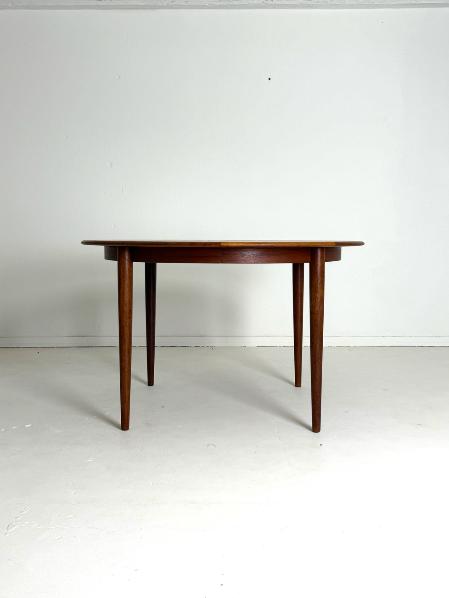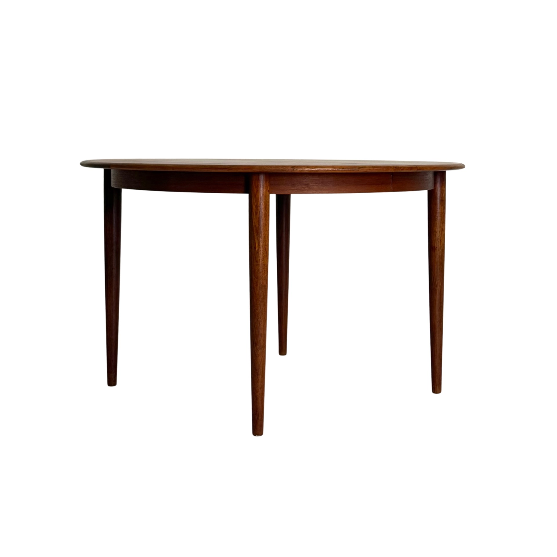 Elegant round teak dining table from 1960s Denmark, crafted by renowned maker Skovmand & Andersen. Includes two extension leaves, allowing the table to extend up to 220 cm in length. The clean lines, tapered legs and warm teak wood grain offer timeless mid-century appeal. A functional and stylish piece for both daily use and entertaining.