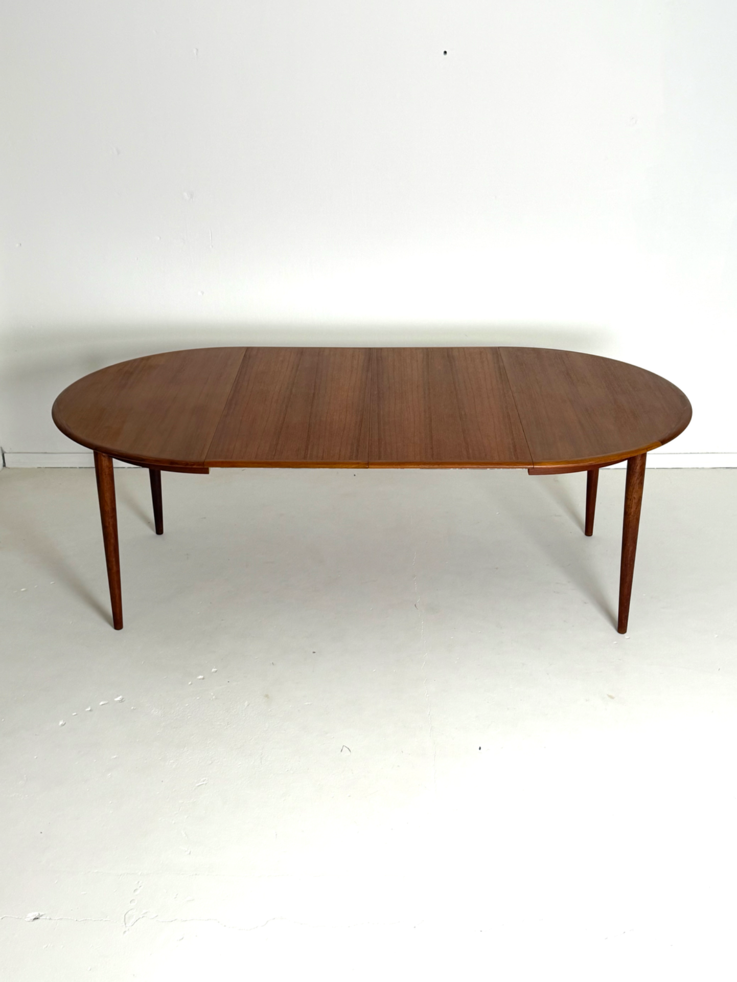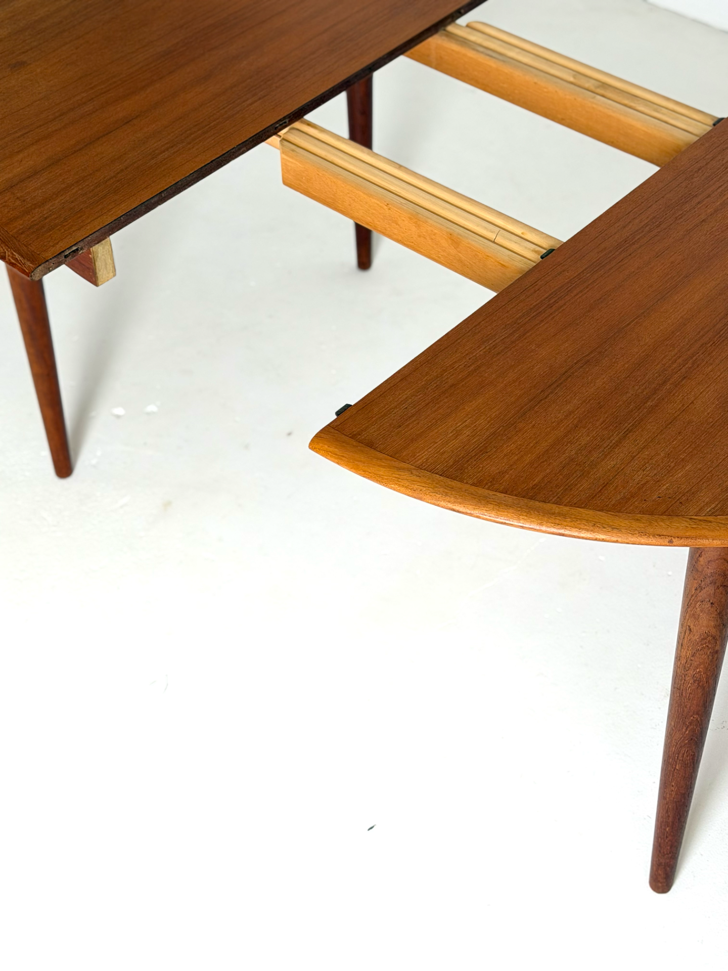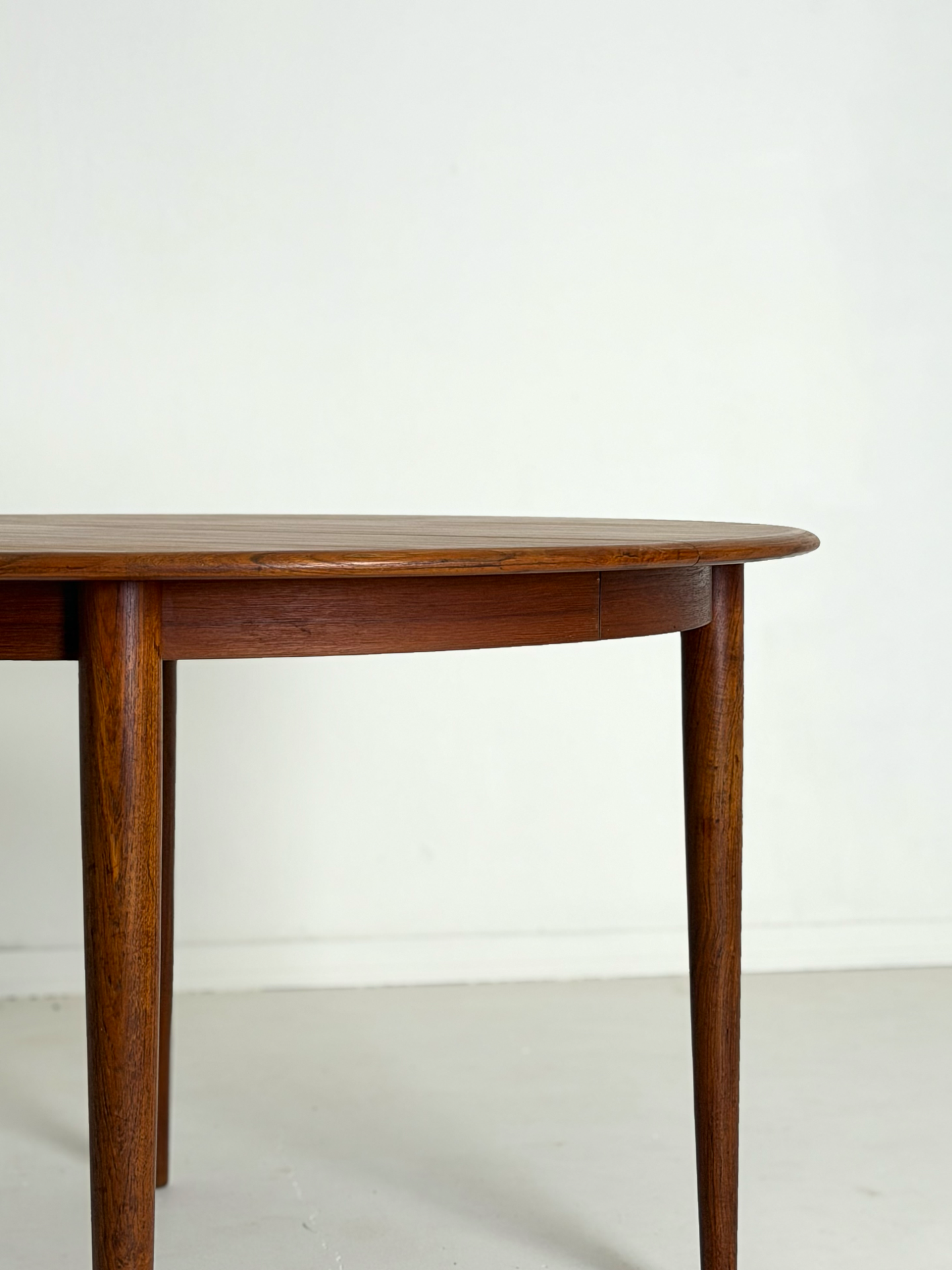 Elegant round teak dining table from 1960s Denmark, crafted by renowned maker Skovmand & Andersen. Includes two extension leaves, allowing the table to extend up to 220 cm in length. The clean lines, tapered legs and warm teak wood grain offer timeless mid-century appeal. A functional and stylish piece for both daily use and entertaining.