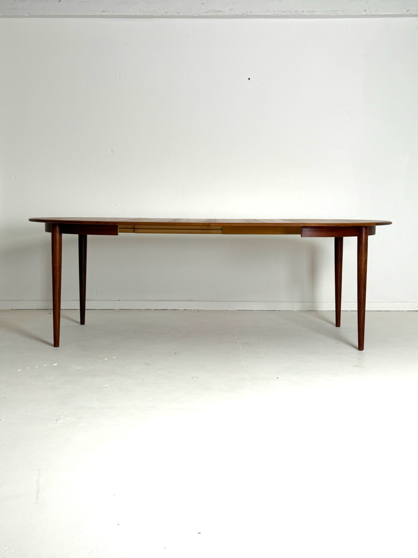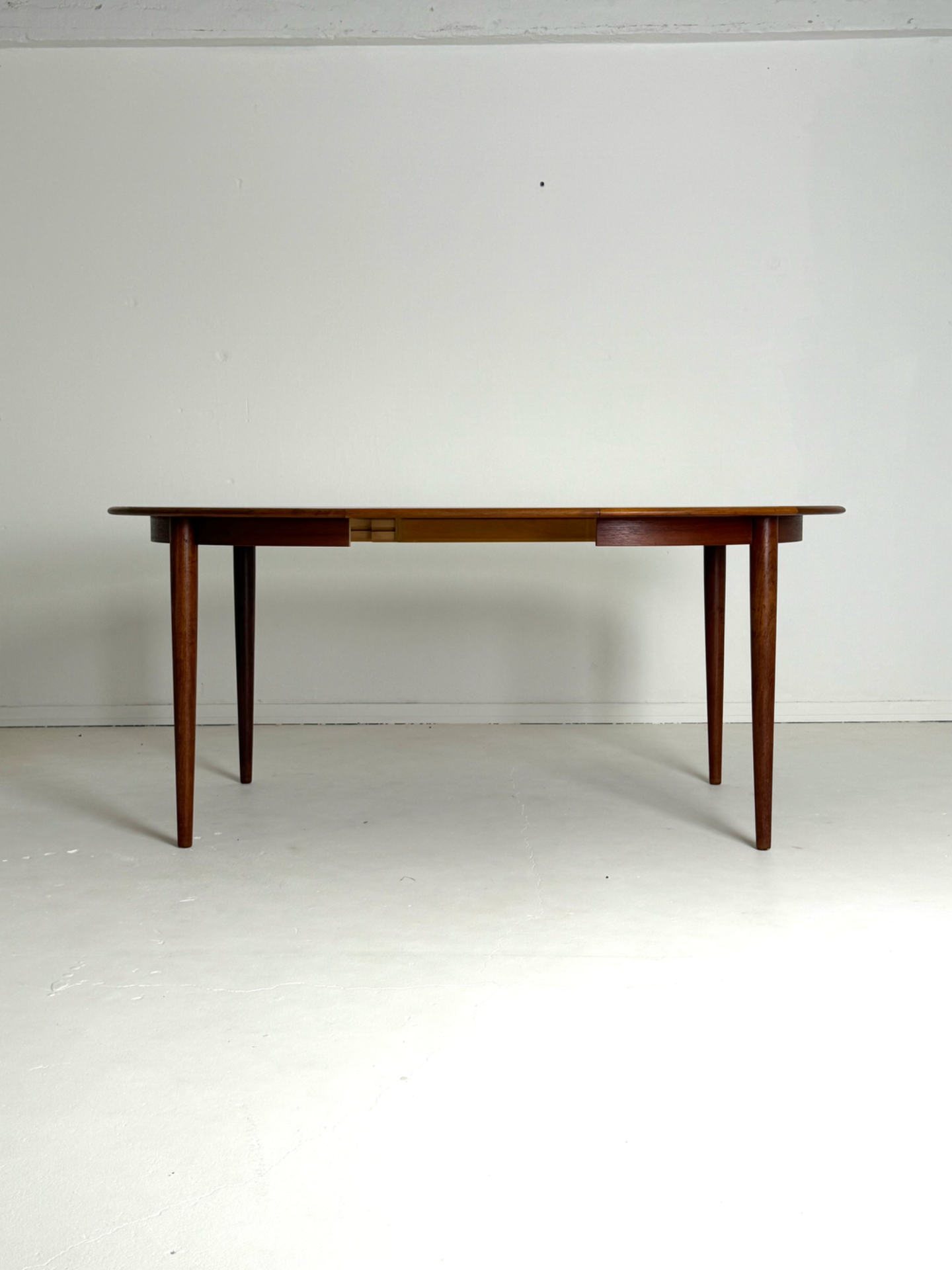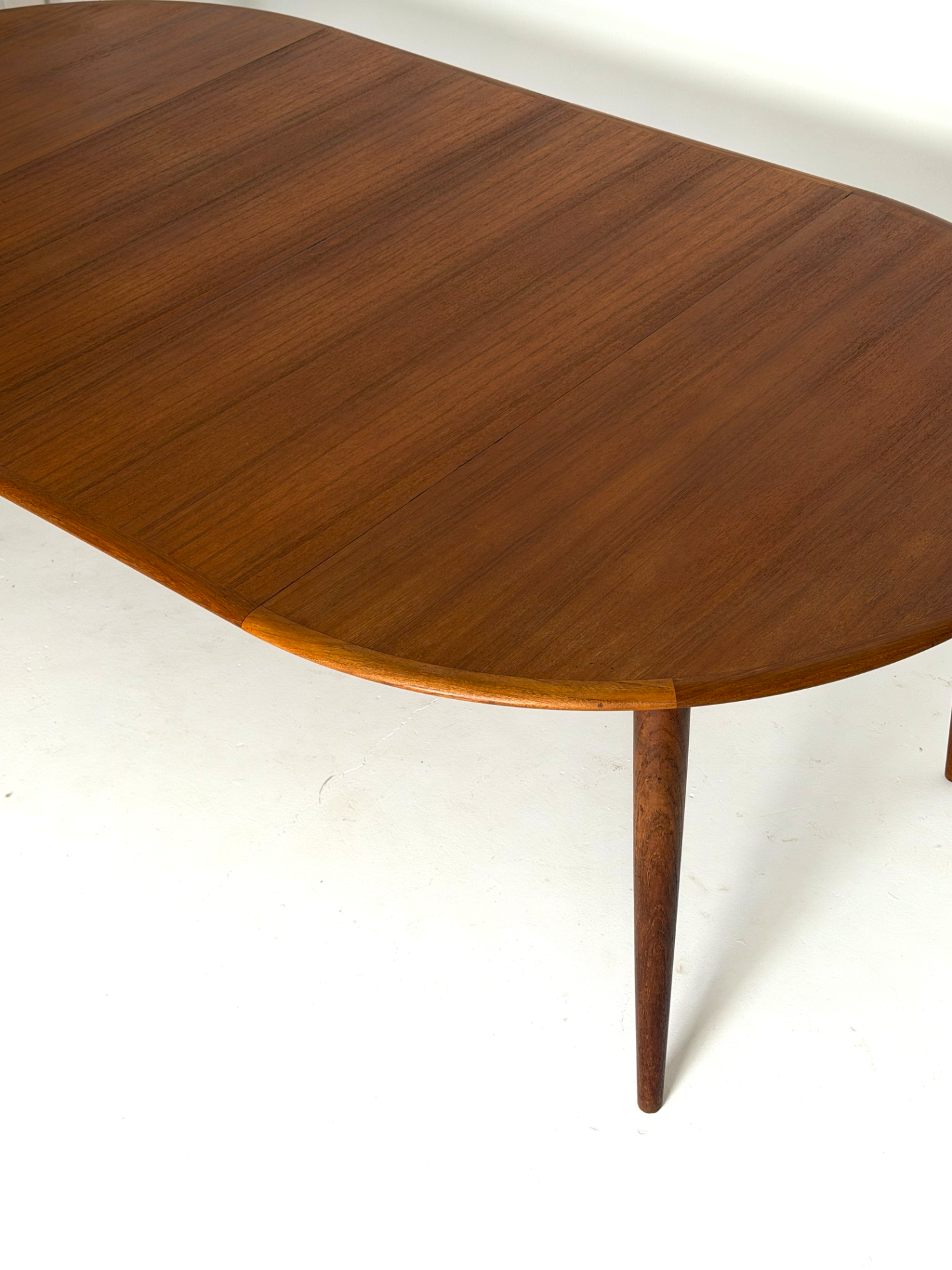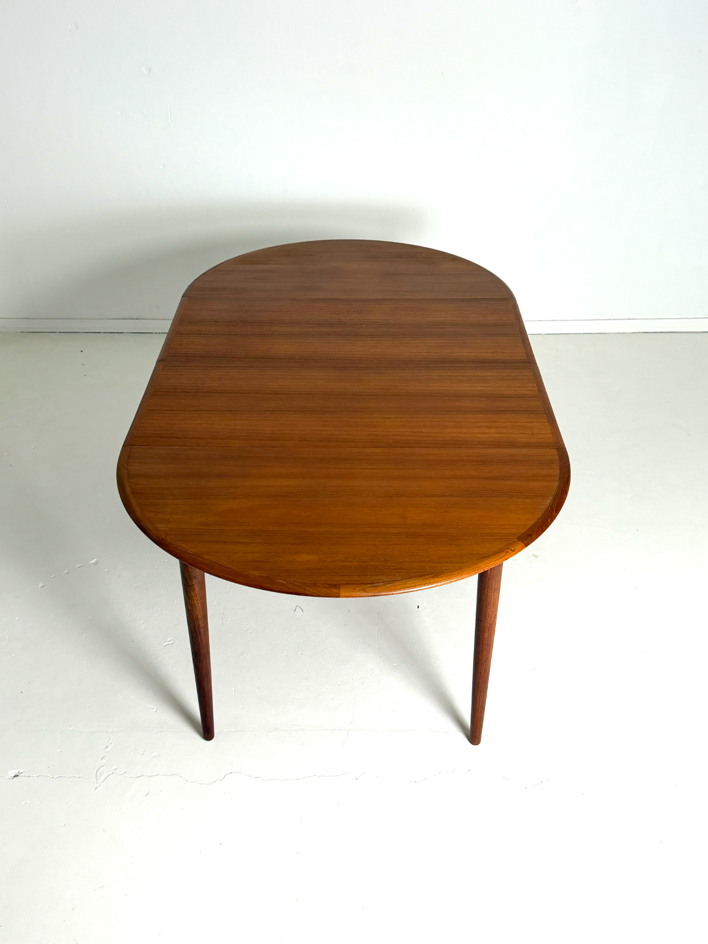 Elegant round teak dining table from 1960s Denmark, crafted by renowned maker Skovmand & Andersen. Includes two extension leaves, allowing the table to extend up to 220 cm in length. The clean lines, tapered legs and warm teak wood grain offer timeless mid-century appeal. A functional and stylish piece for both daily use and entertaining.