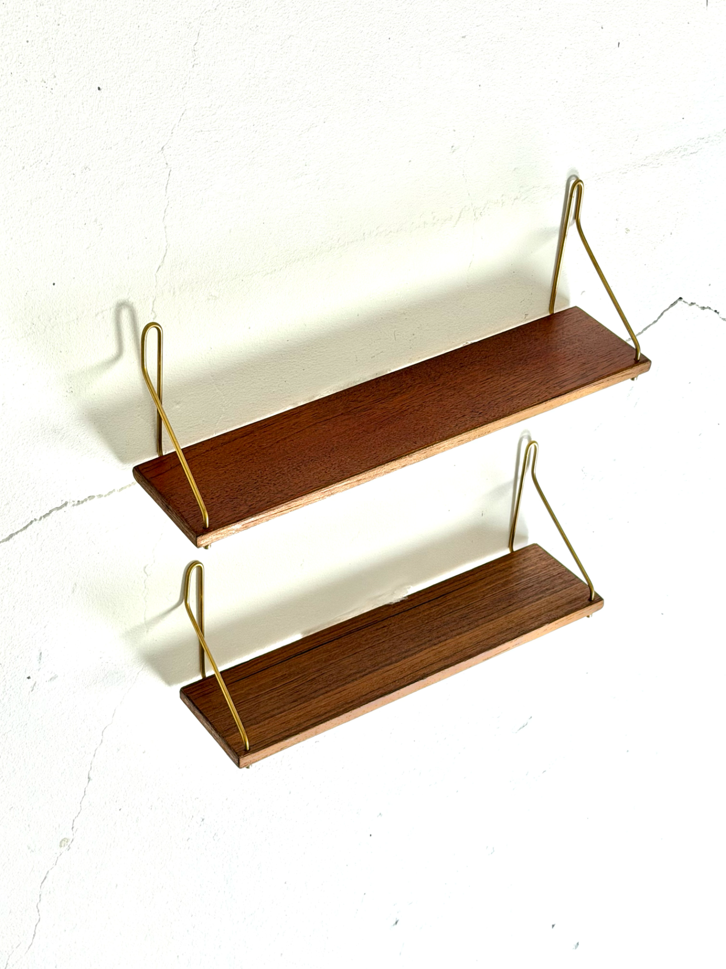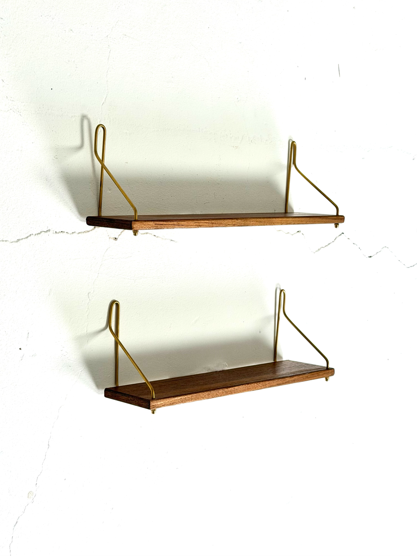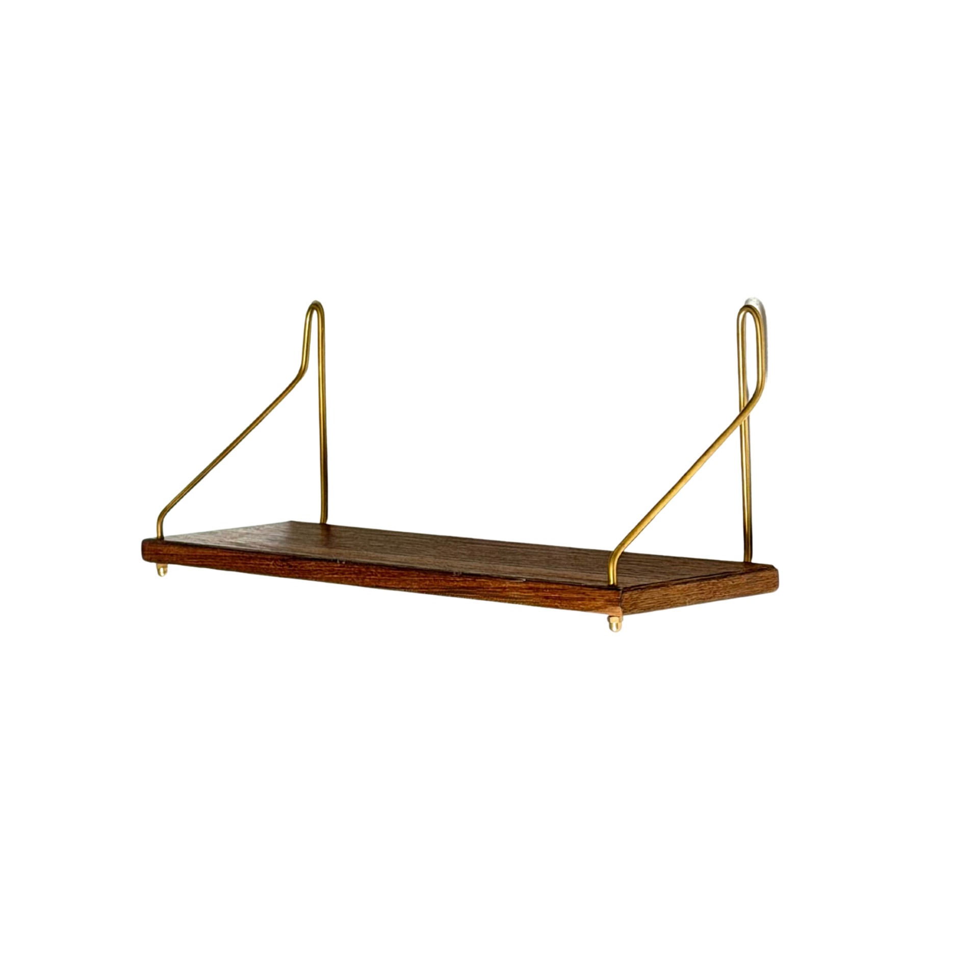 Elegant and slim teak wall shelf from the 1960s with brass-colored brackets. Its compact size makes it ideal for small spaces like hallways, kitchens, or as a bedside shelf. A beautiful detail for Scandinavian-style interiors.