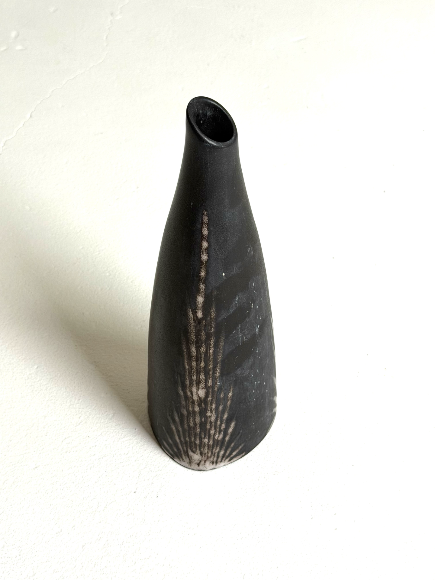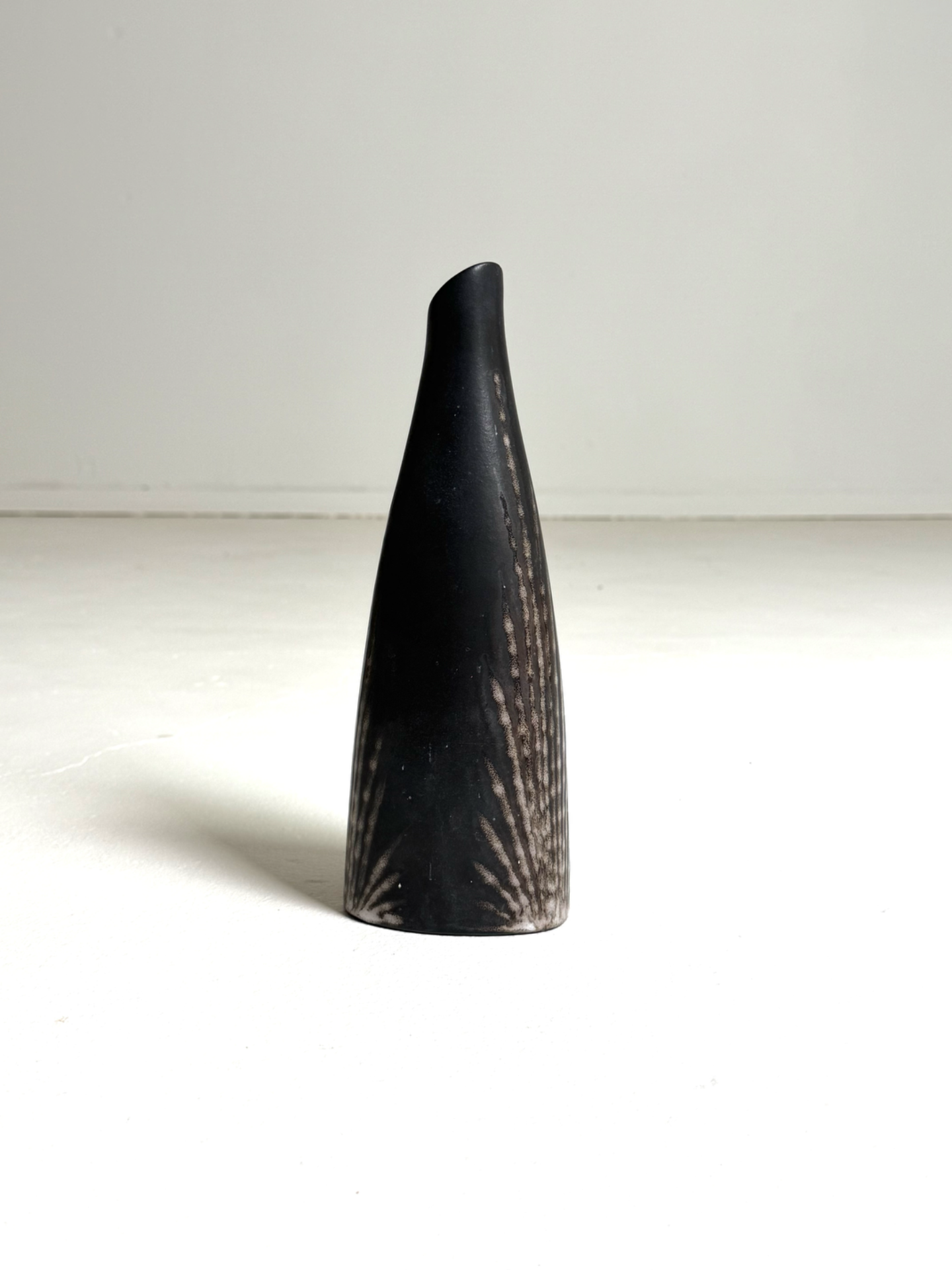 Tyylikäs ja veistoksellinen Søholm Keramik -maljakko 1970-luvulta. Maljakon elegantti, kapea muoto ja mustan sekä beigen sävyissä toteutettu lasite antavat esineelle voimakkaan graafisen ilmeen. Tämä vintage-maljakko toimii upeasti niin yksittäisen oksan kanssa kuin koriste-esineenä sellaisenaan. Tanskalainen muotoiluperinne parhaimmillaan.