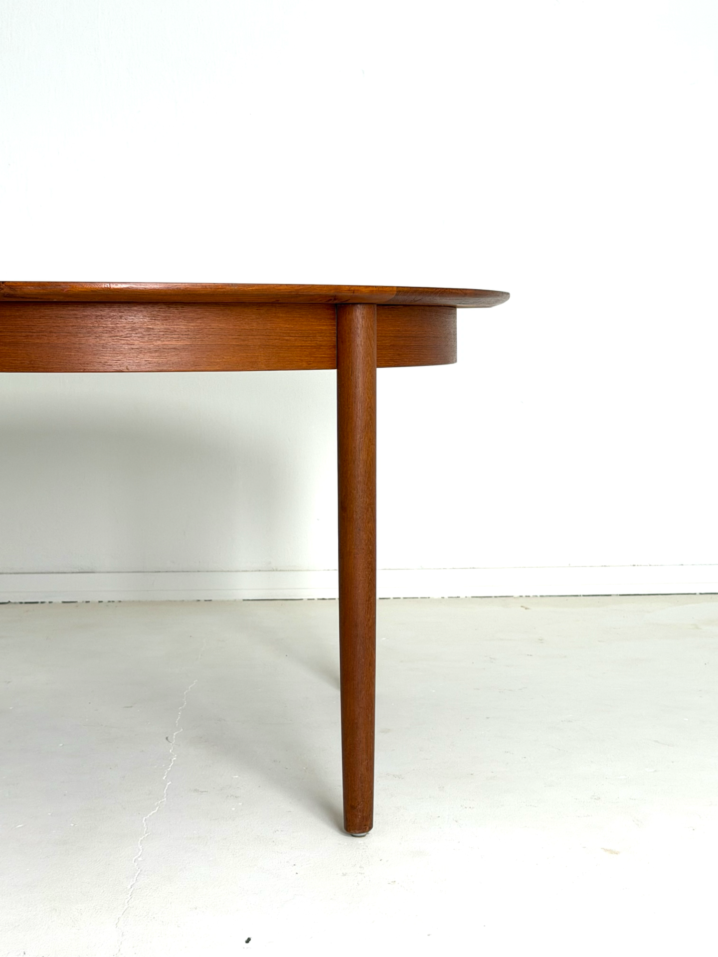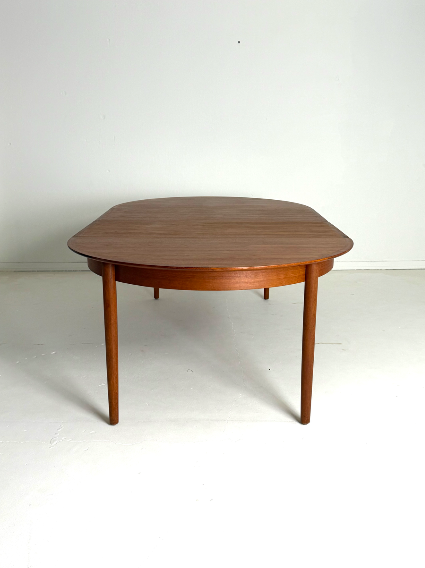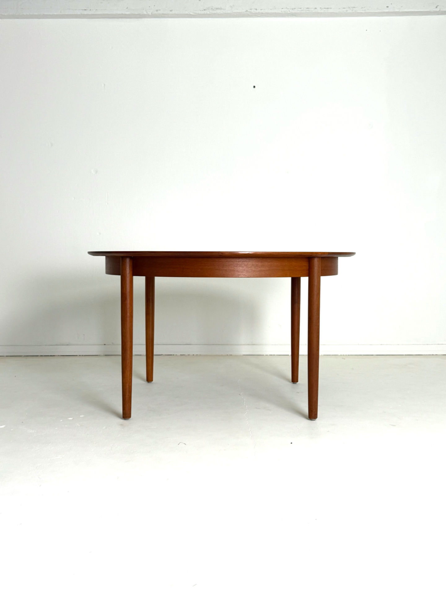 Tyylikäs ja tilava pyöreä ruokapöytä 1960-luvun Tanskasta. Pöytä on valmistettu lämpimän sävyisestä tiikistä, ja sen mukana tulee kaksi jatkopalaa, joiden ansiosta pöydän ympärille mahtuu useampikin ruokailija. Kunnostettu huolellisesti säilyttäen alkuperäinen vintage-ilme. Elegantit, kartiomaiset jalat ja kaunis puunsyy tekevät tästä pöydästä ajattoman katseenvangitsijan ruokailutilaan.