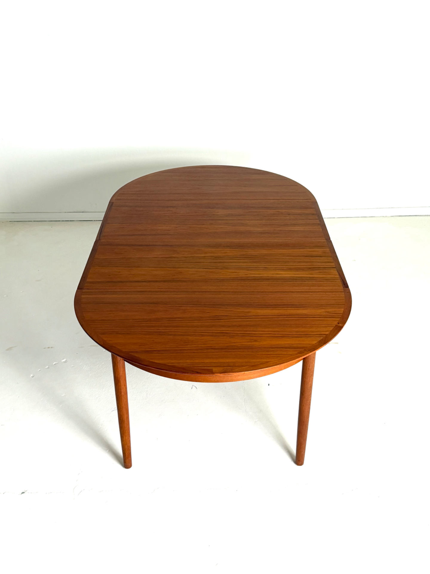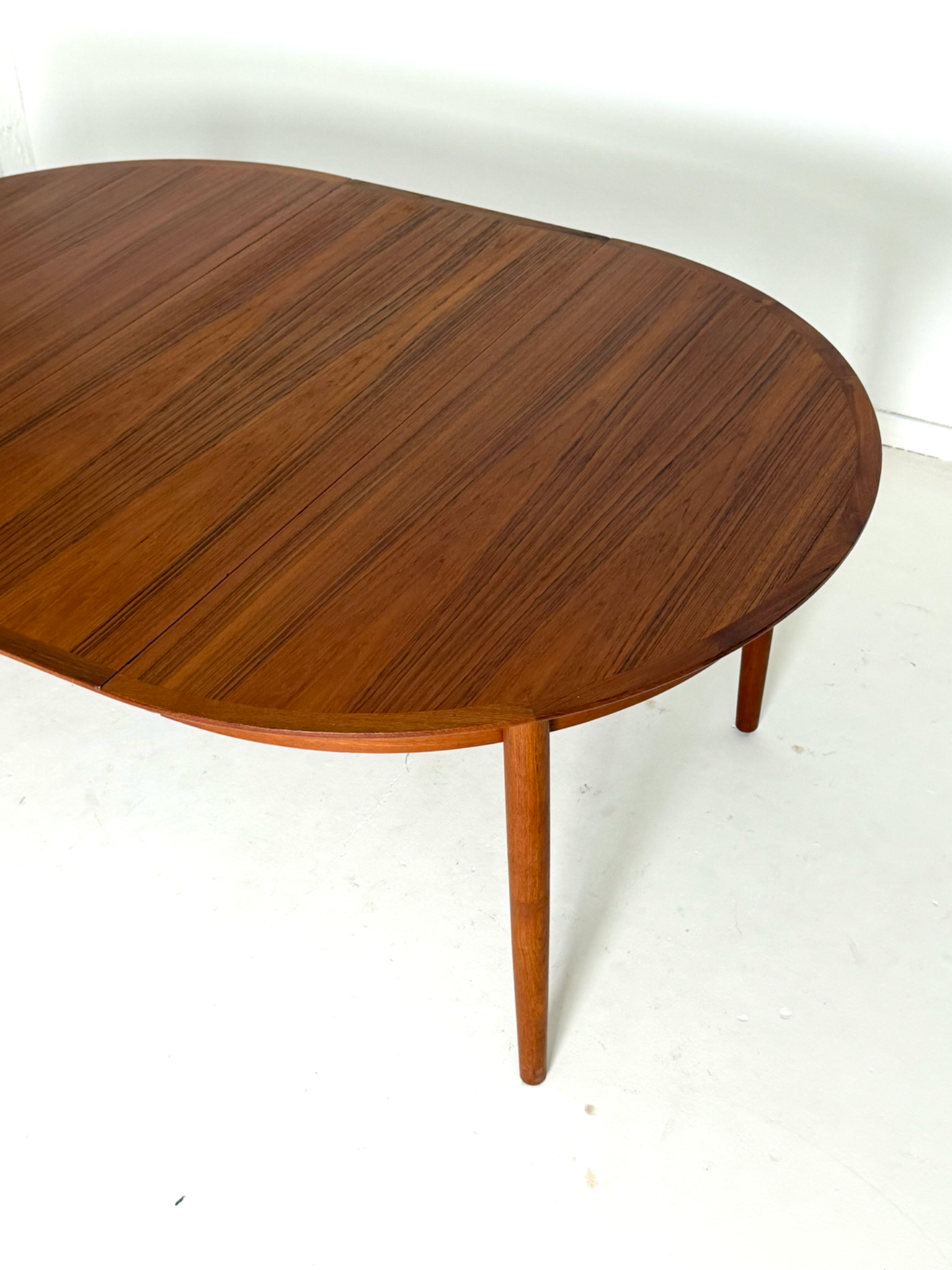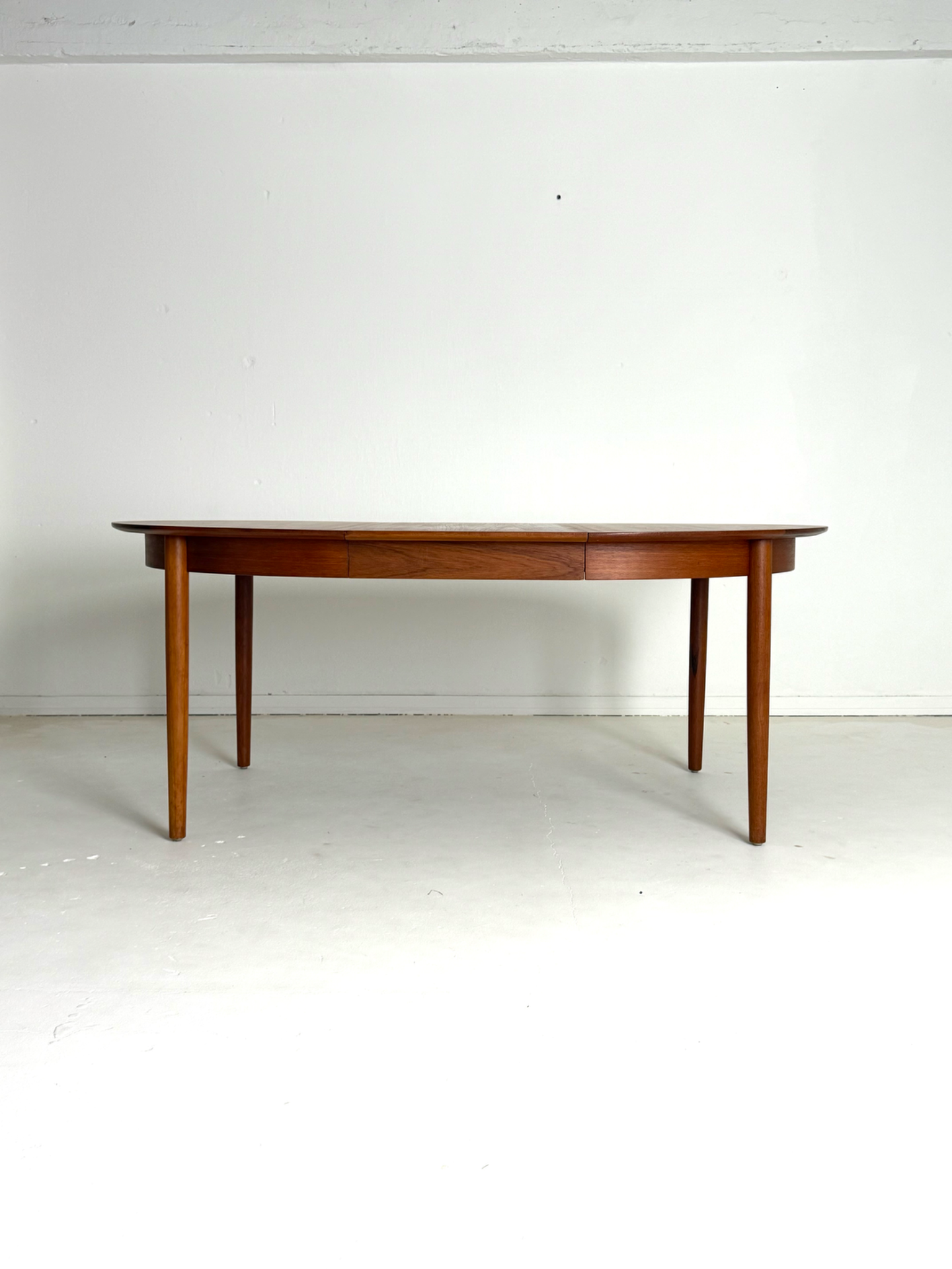 Tyylikäs ja tilava pyöreä ruokapöytä 1960-luvun Tanskasta. Pöytä on valmistettu lämpimän sävyisestä tiikistä, ja sen mukana tulee kaksi jatkopalaa, joiden ansiosta pöydän ympärille mahtuu useampikin ruokailija. Kunnostettu huolellisesti säilyttäen alkuperäinen vintage-ilme. Elegantit, kartiomaiset jalat ja kaunis puunsyy tekevät tästä pöydästä ajattoman katseenvangitsijan ruokailutilaan.