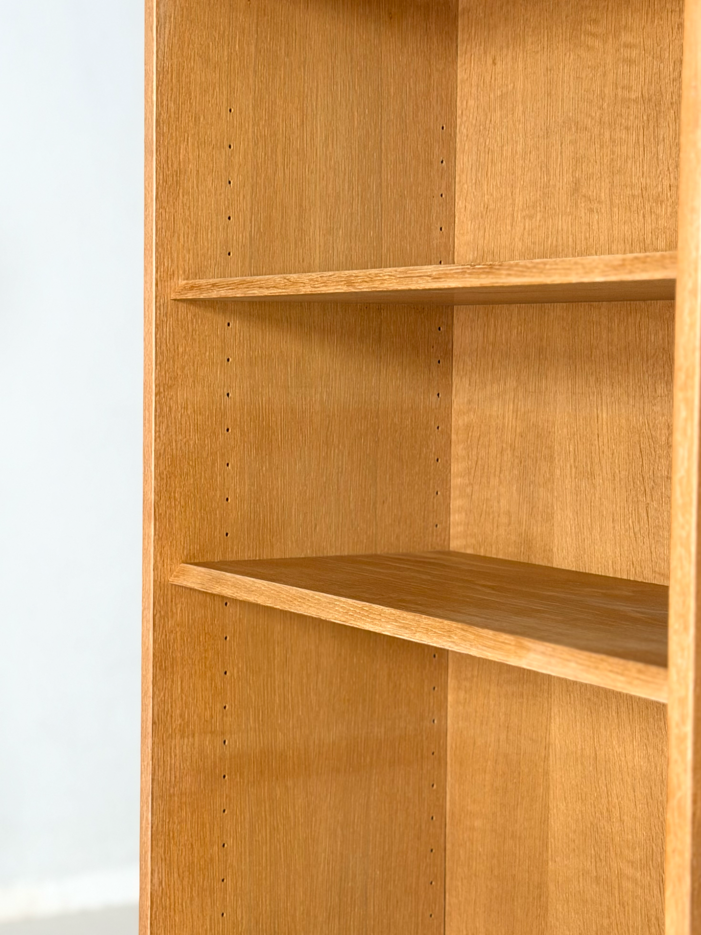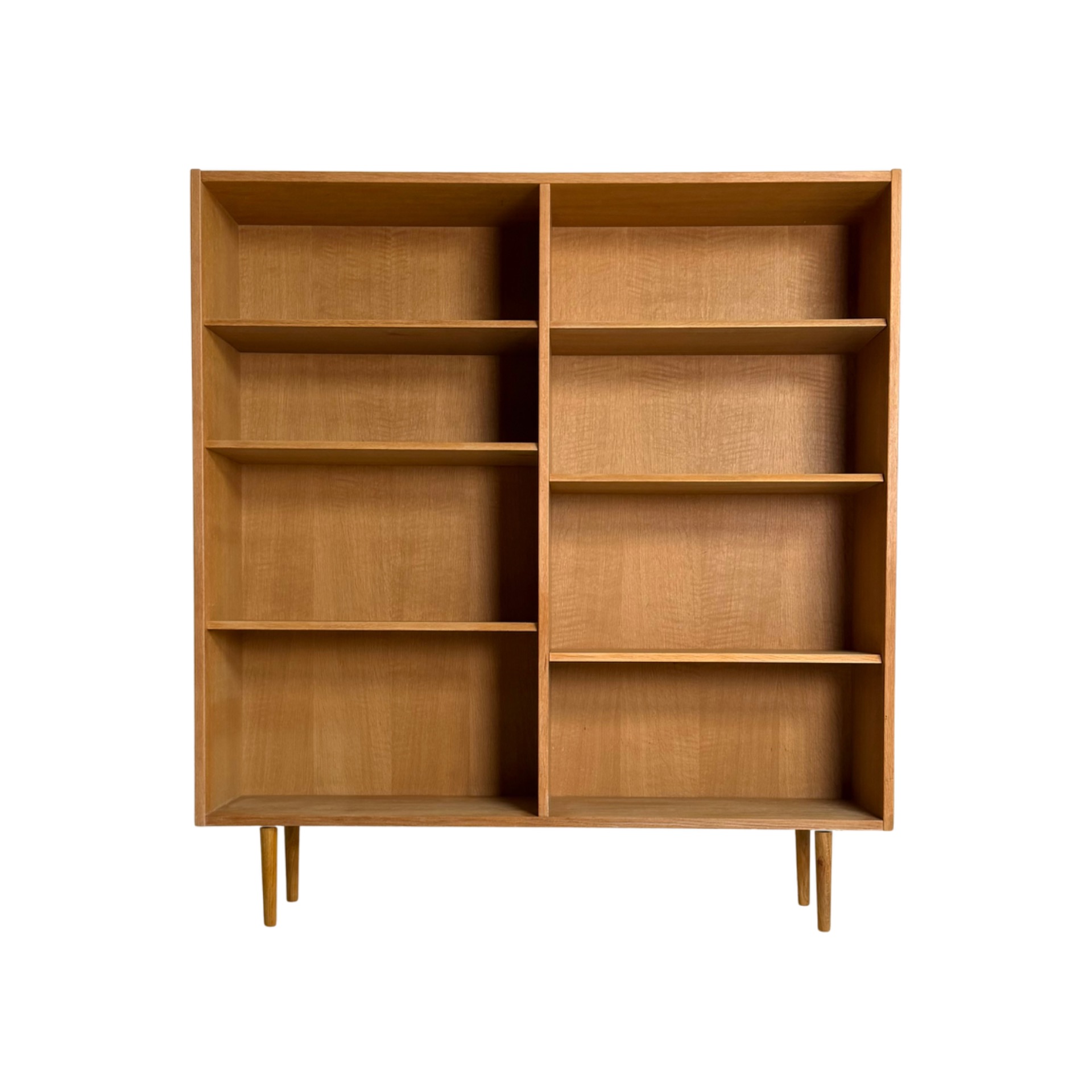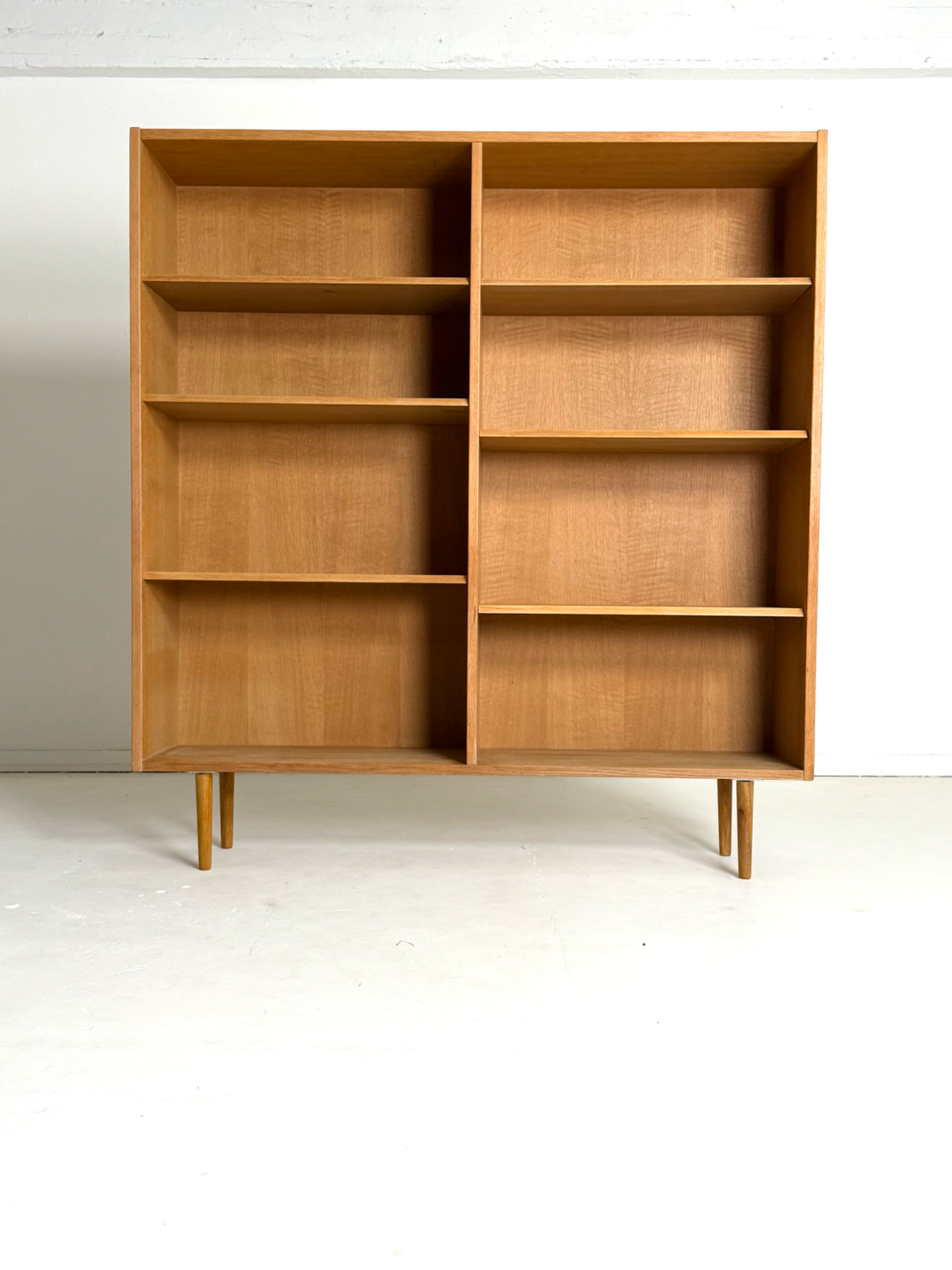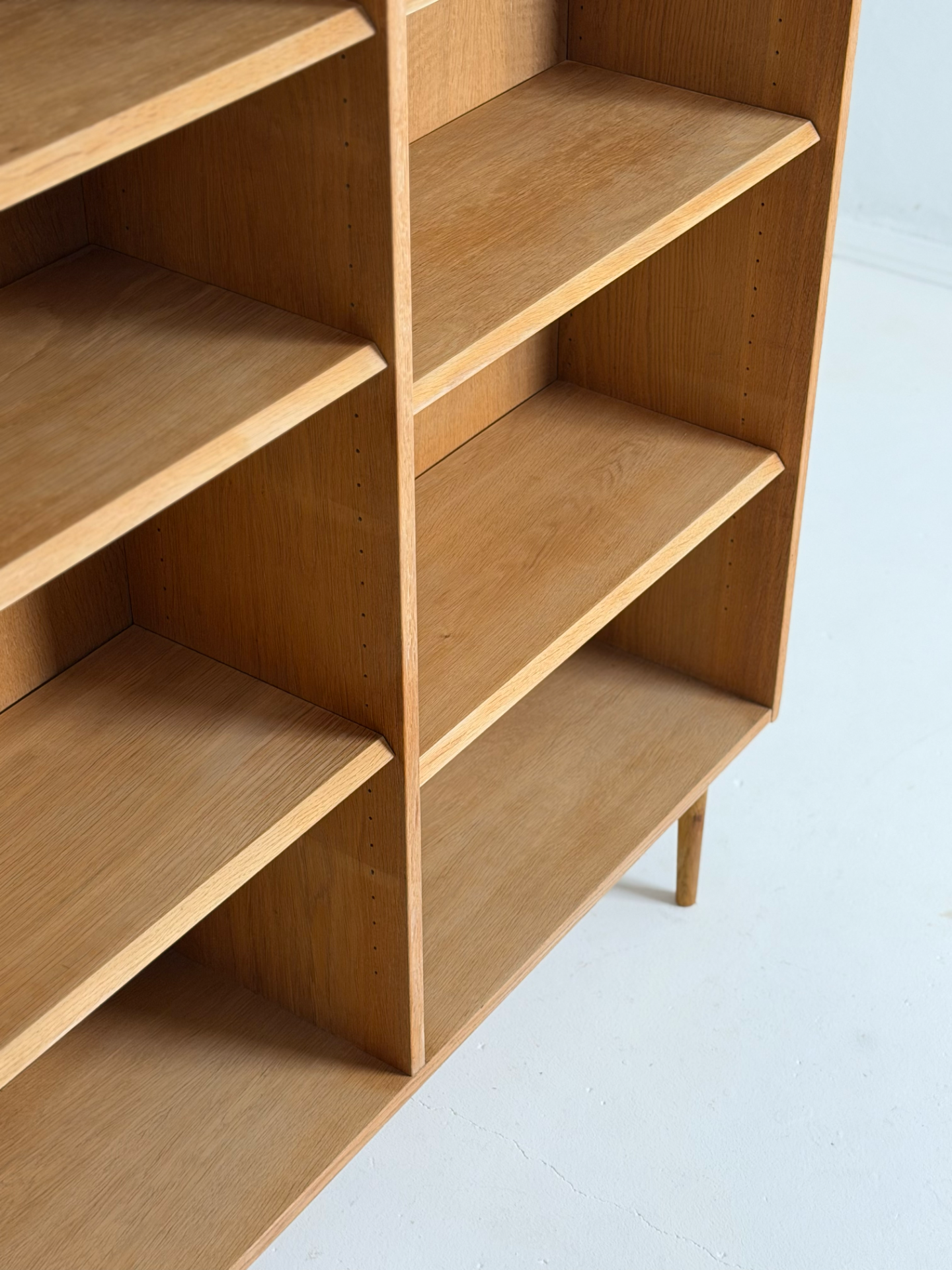 Elegantti ja tilava vintage-hyllykkö 1960-luvun Tanskasta. Hyllykkö on valmistettu kauniista vaaleasta tammesta, ja sen ajaton, selkeälinjainen muotoilu tekee siitä täydellisen valinnan niin kirjoille, esineille kuin sisustuselementeille. Hyllyt ovat säädettäviä.