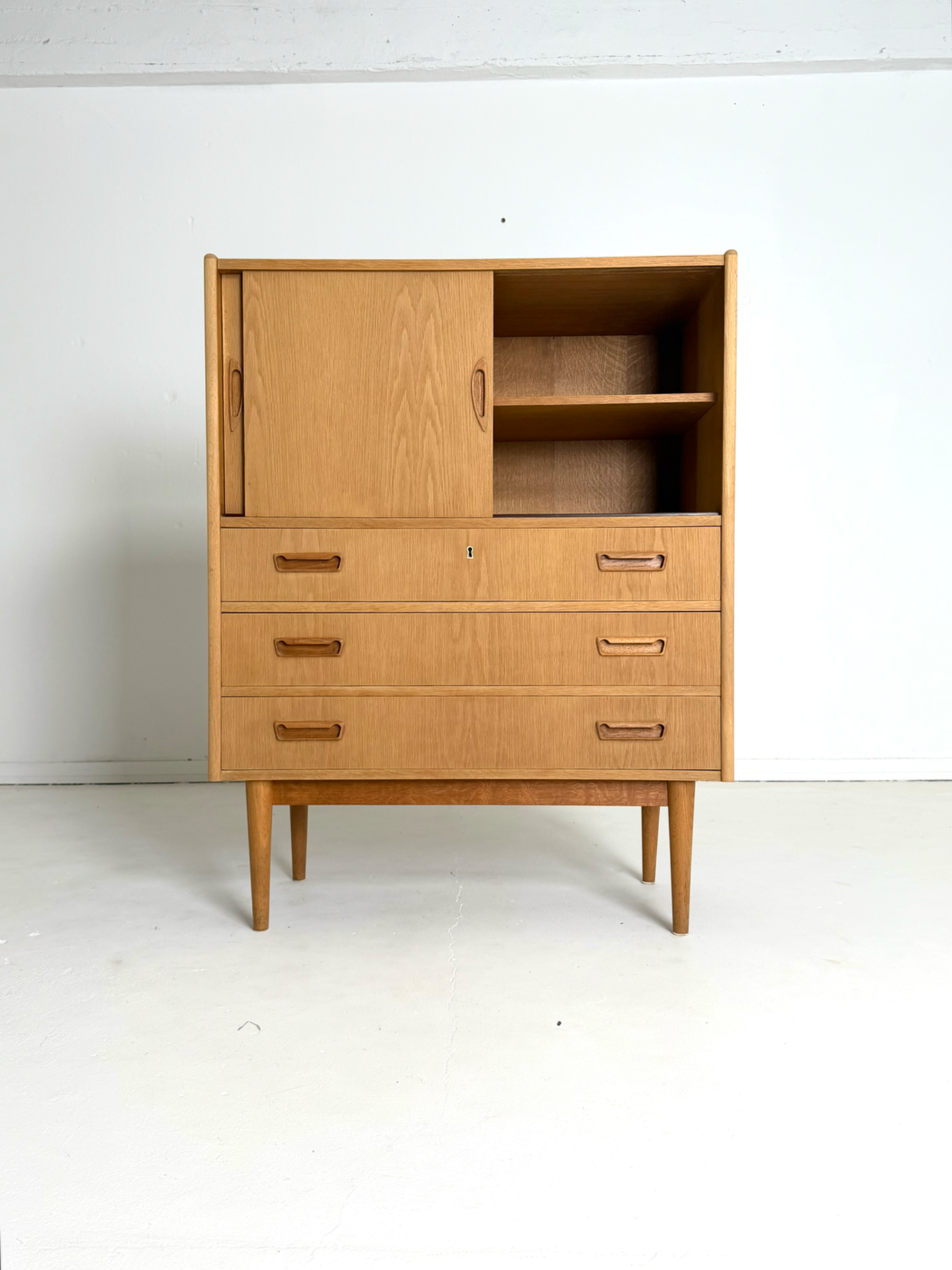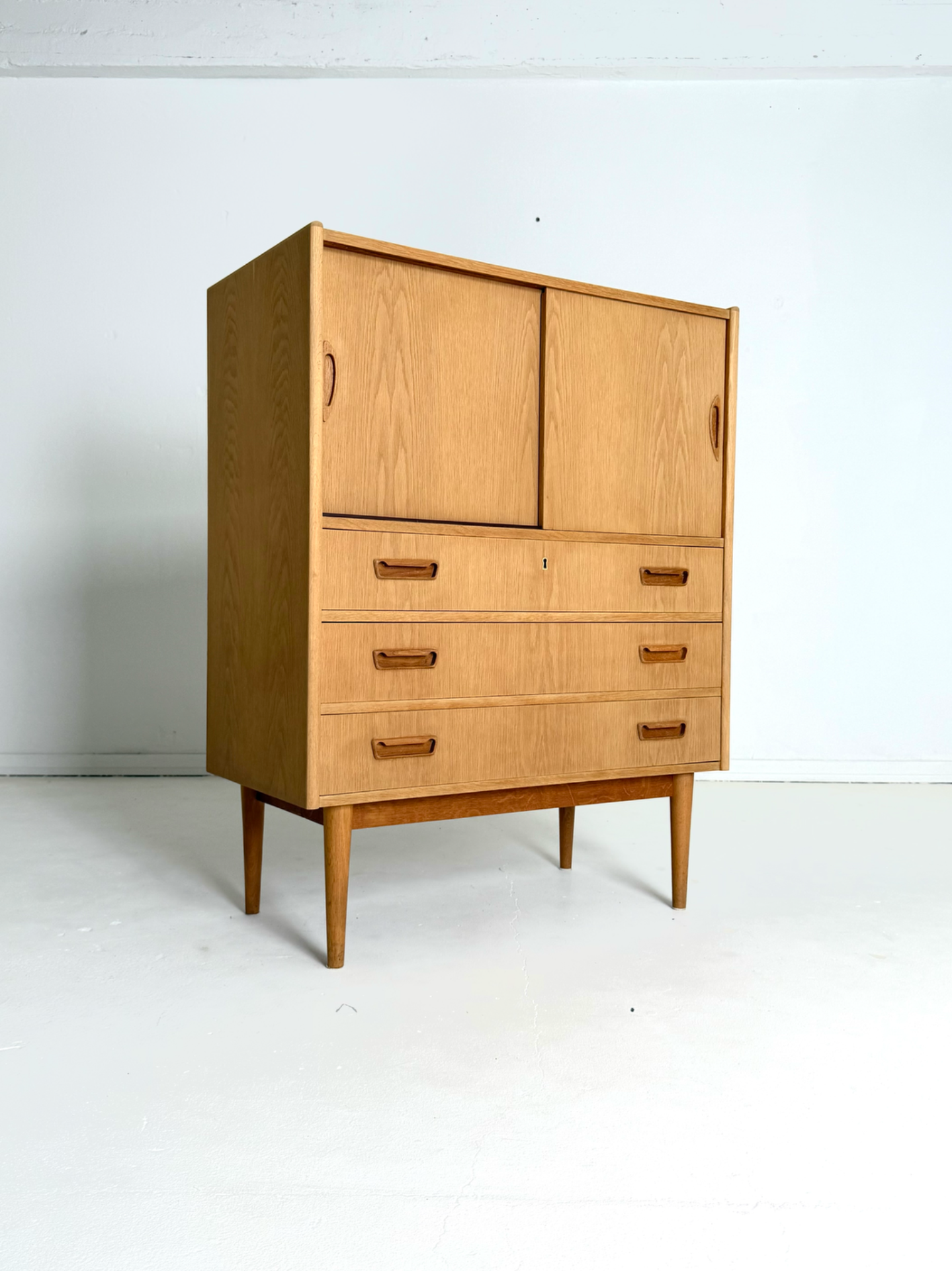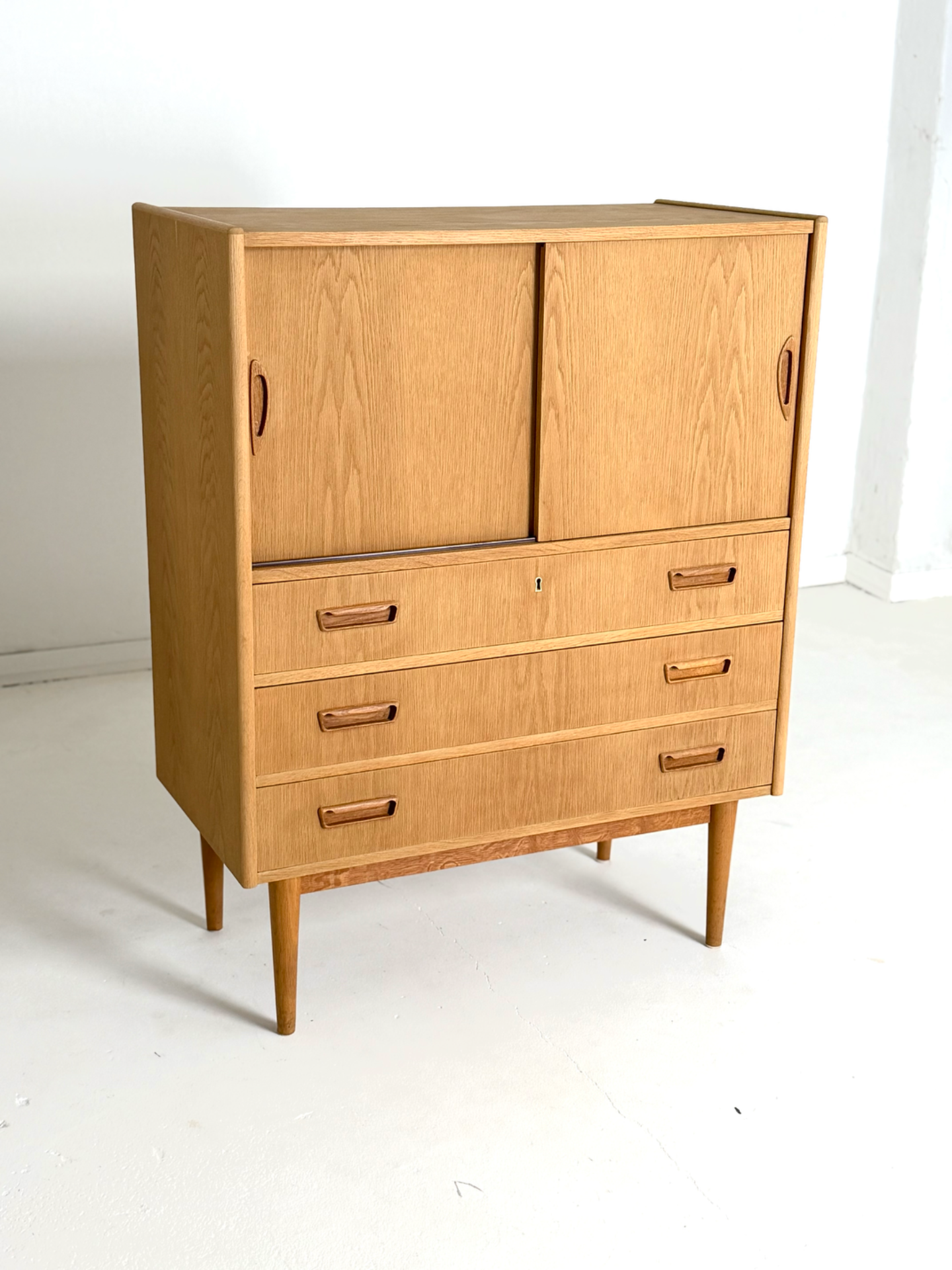 Elegantti ja pelkistetty vintage-kaapisto, suunnittelijana Gunnar Nielsen. Valmistajana Tibergaards Møbelfabrik, Tanska. Kaapisto on valmistettu tammesta ja käsitelty huonekalusaippualla. Siinä on liukuovet sekä kolme tilavaa vetolaatikkoa. Muotoilun tunnusmerkkejä ovat pyöristetyt reunat, integroidut vetimet ja siro jalkarakenne – tyylikäs esimerkki tanskalaisesta funktionalistisesta muotoilusta 1960-luvulta. Soveltuu erinomaisesti esimerkiksi makuuhuoneeseen tai olohuoneeseen säilytyskalusteeksi.