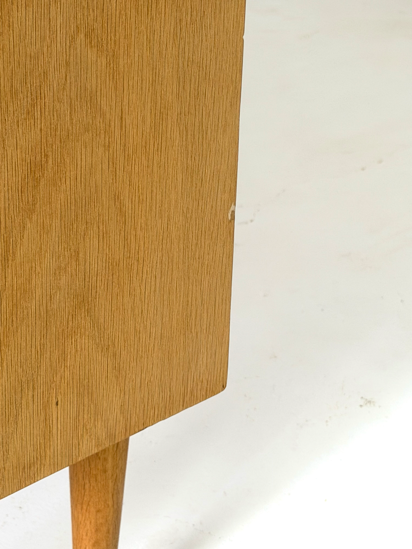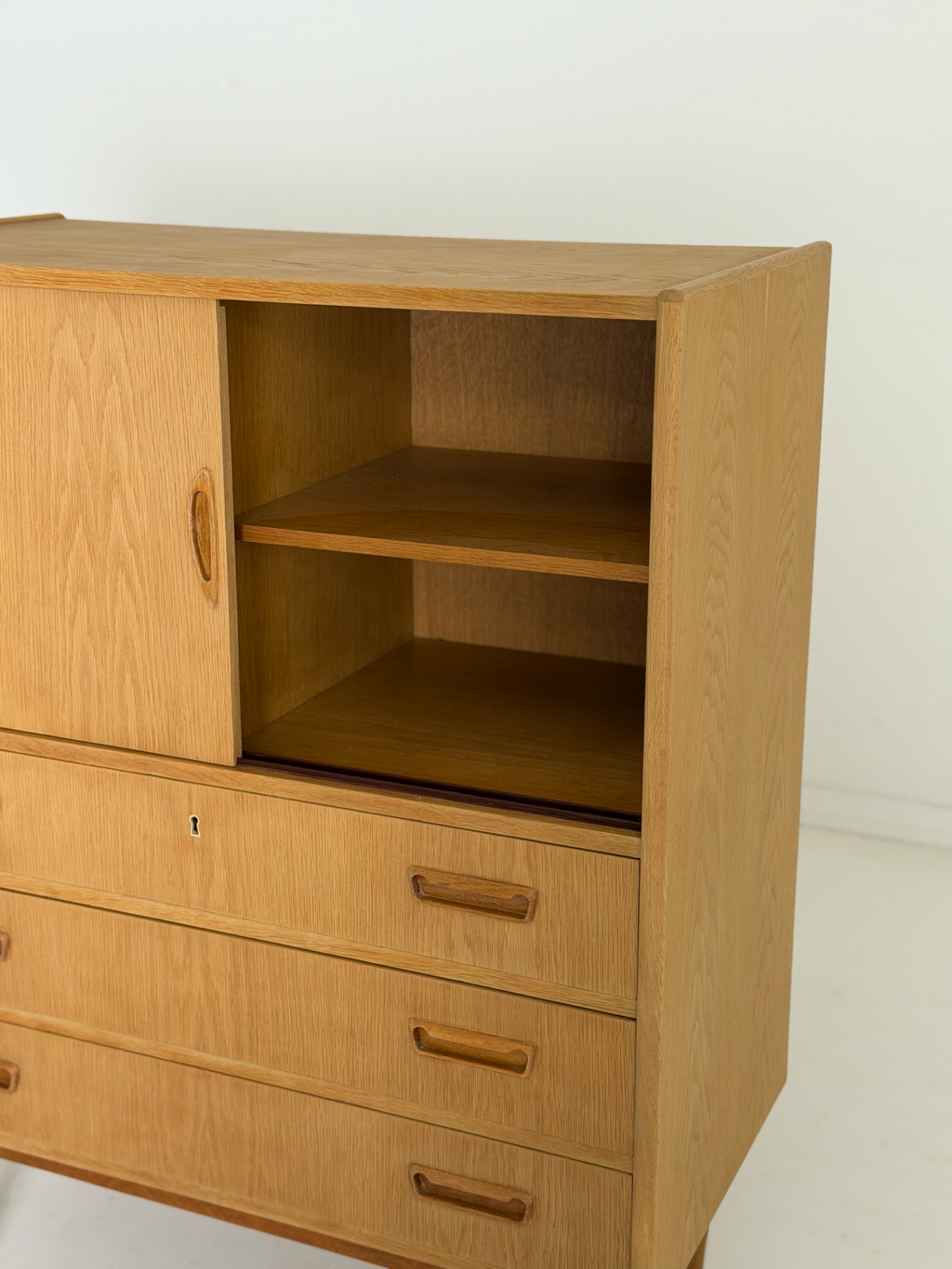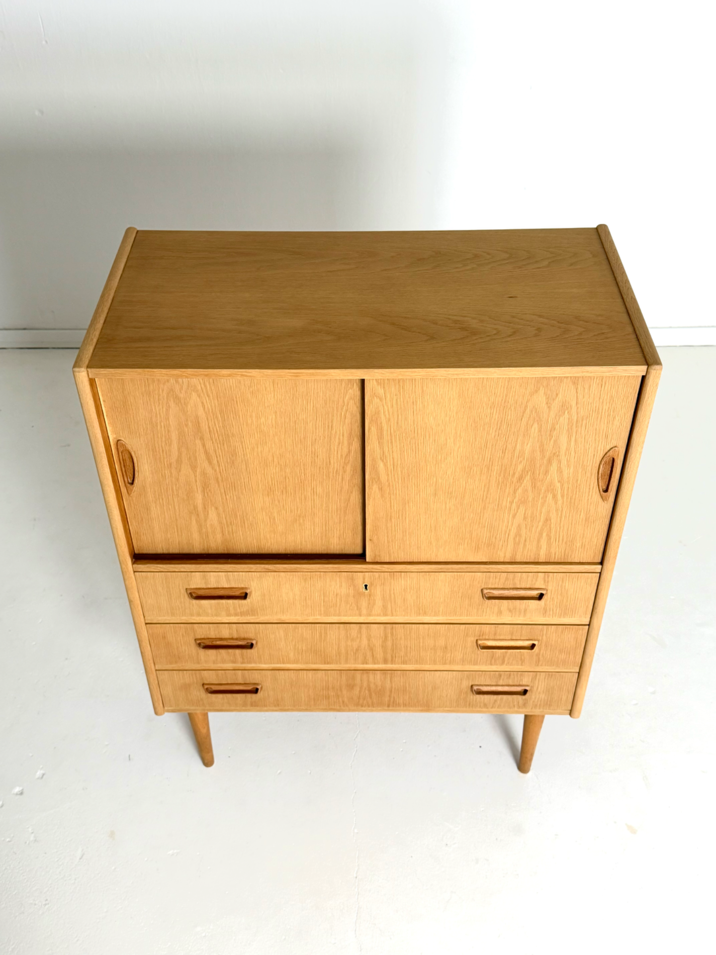 Elegantti ja pelkistetty vintage-kaapisto, suunnittelijana Gunnar Nielsen. Valmistajana Tibergaards Møbelfabrik, Tanska. Kaapisto on valmistettu tammesta ja käsitelty huonekalusaippualla. Siinä on liukuovet sekä kolme tilavaa vetolaatikkoa. Muotoilun tunnusmerkkejä ovat pyöristetyt reunat, integroidut vetimet ja siro jalkarakenne – tyylikäs esimerkki tanskalaisesta funktionalistisesta muotoilusta 1960-luvulta. Soveltuu erinomaisesti esimerkiksi makuuhuoneeseen tai olohuoneeseen säilytyskalusteeksi.