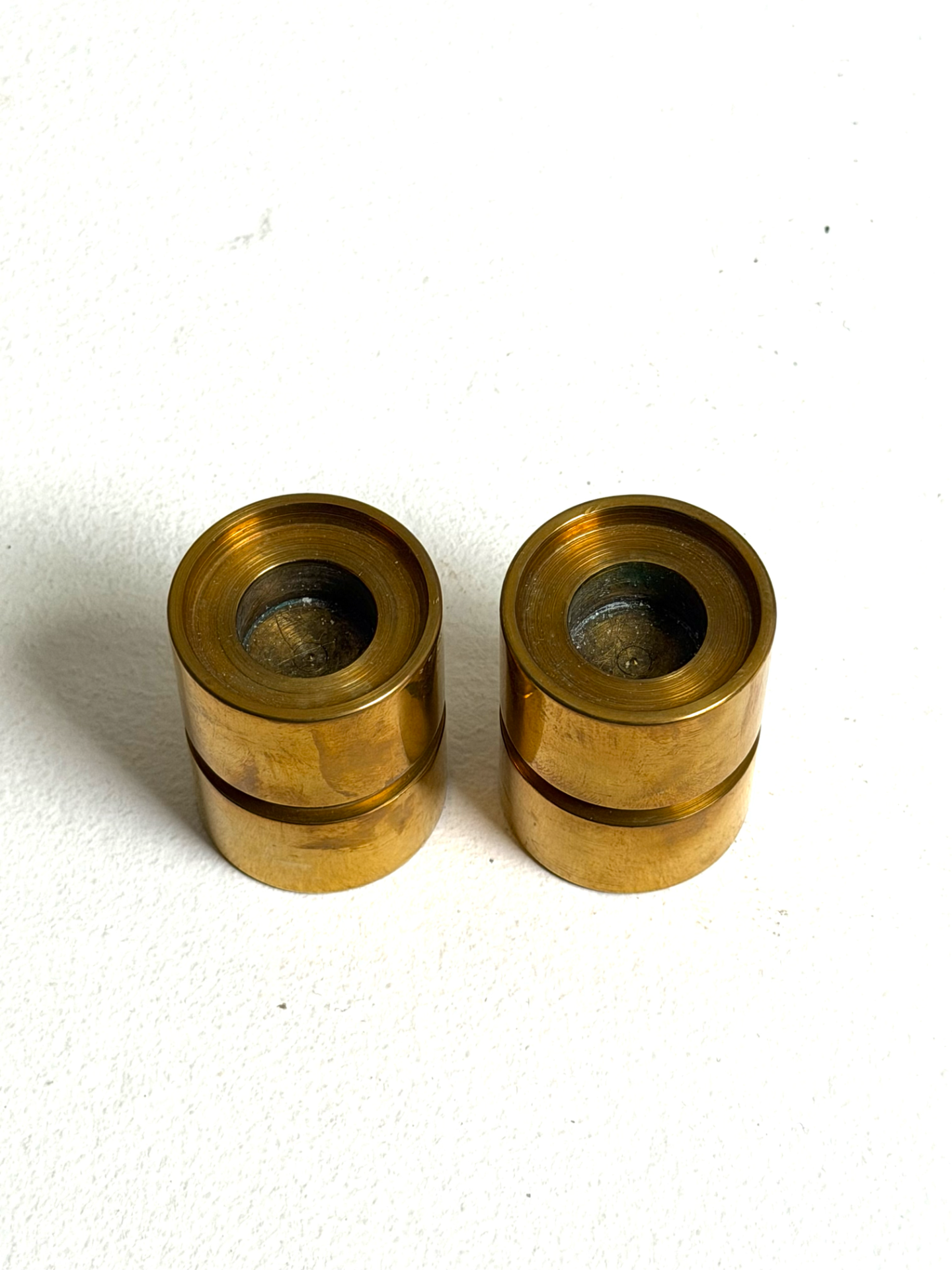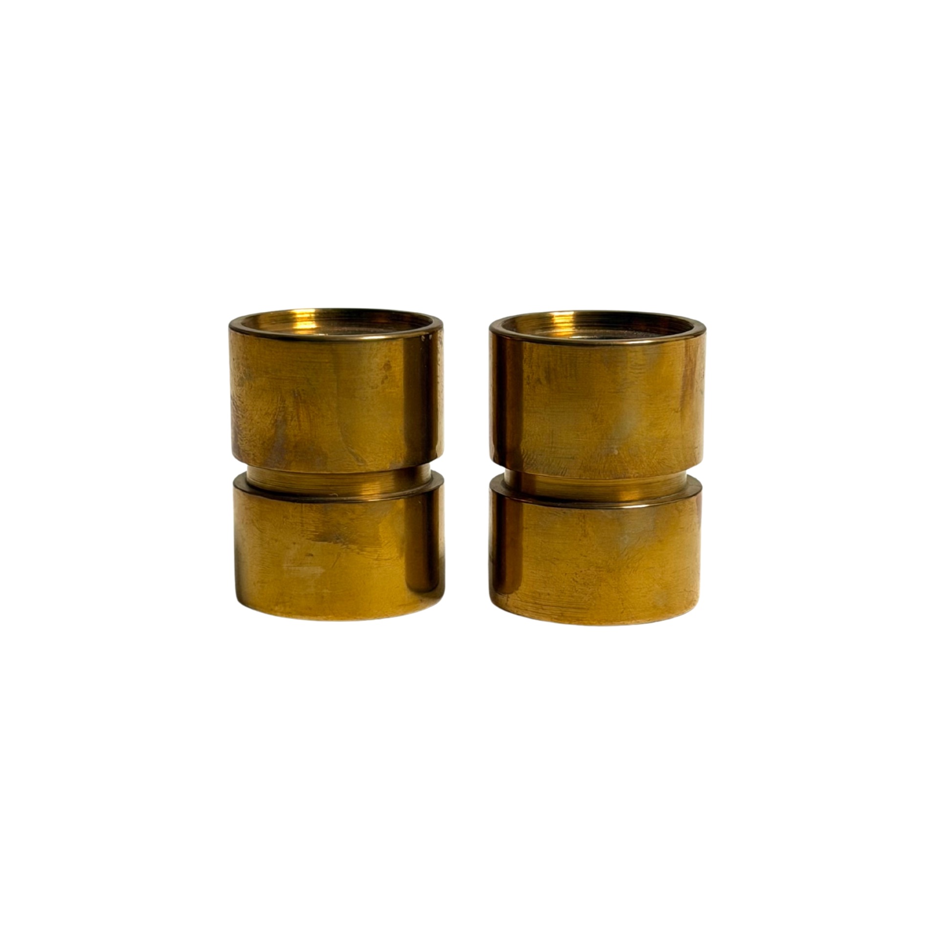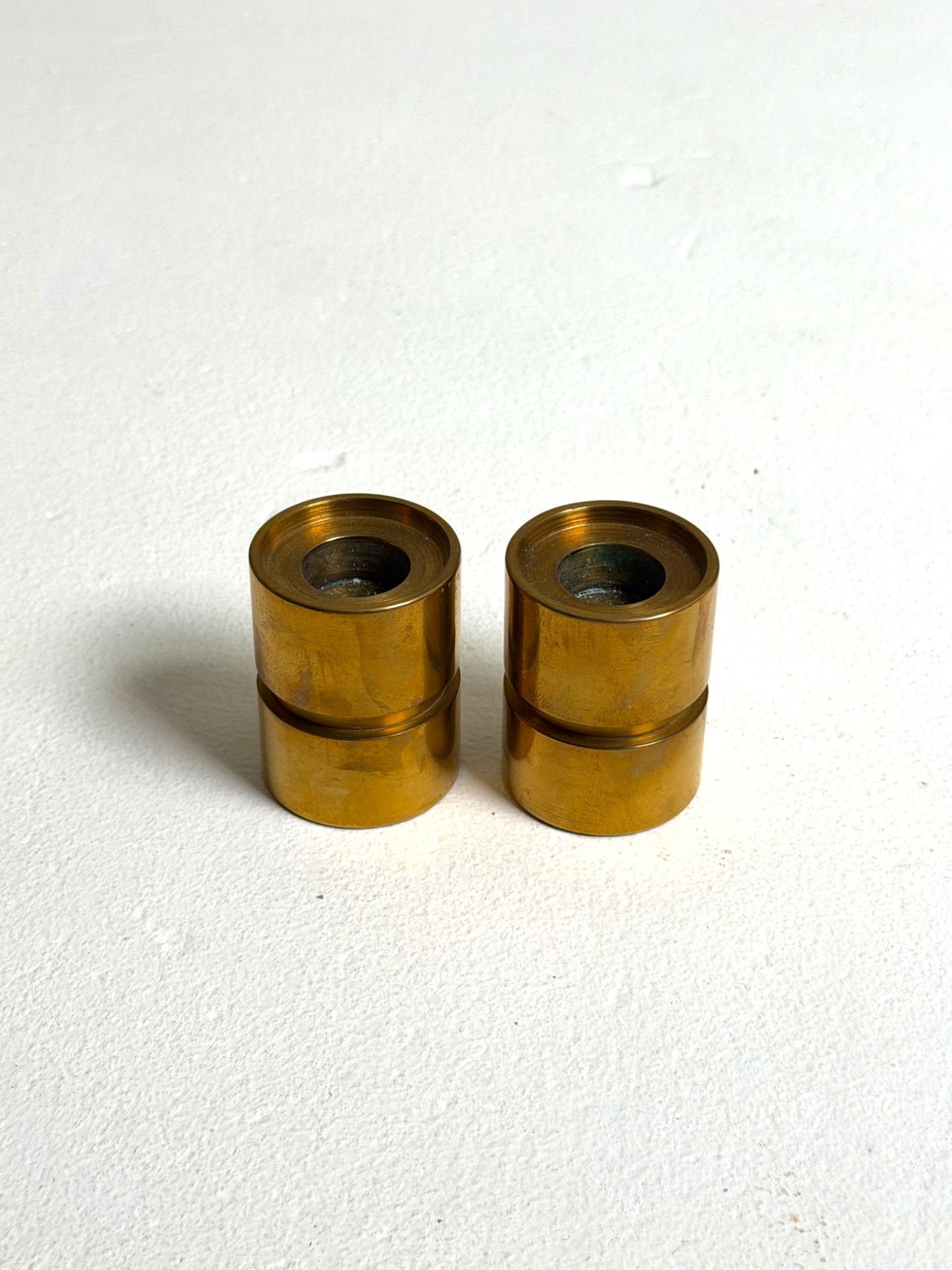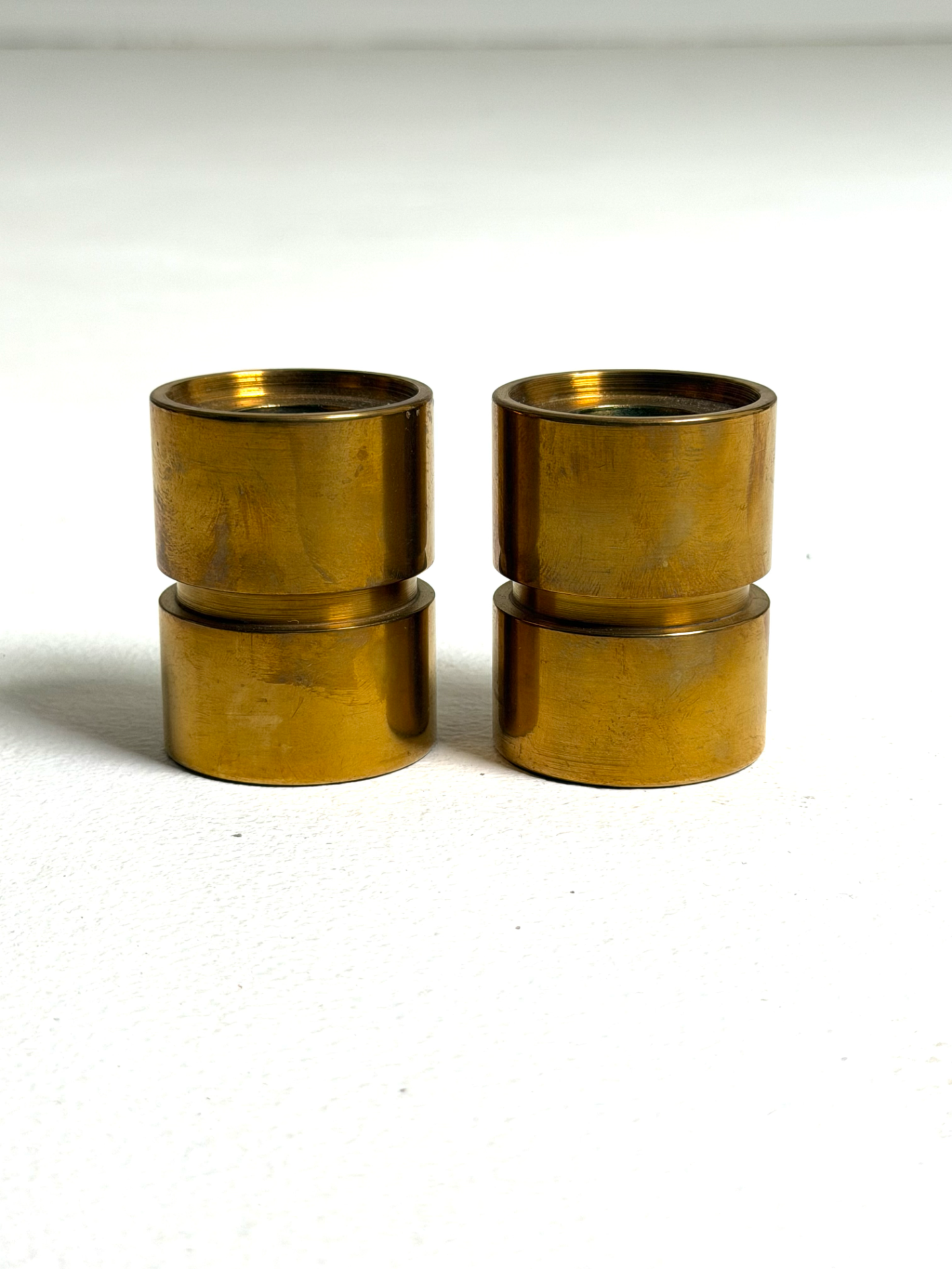 Kaksiosainen kynttilänjalkapari 1960–70-luvun Tanskasta. Täysmessinki antaa niille painoa, laatua ja ajattoman ilmeen. Siluetti on pelkistetty ja moderni, mutta samalla tyylikkään näyttävä. Kaunis patina korostaa materiaalin ikää ja arvokkuutta. Sopivat kapeille kynttilöille tai tuikkukynttilöille.