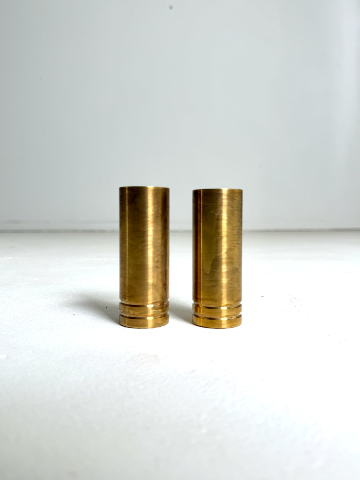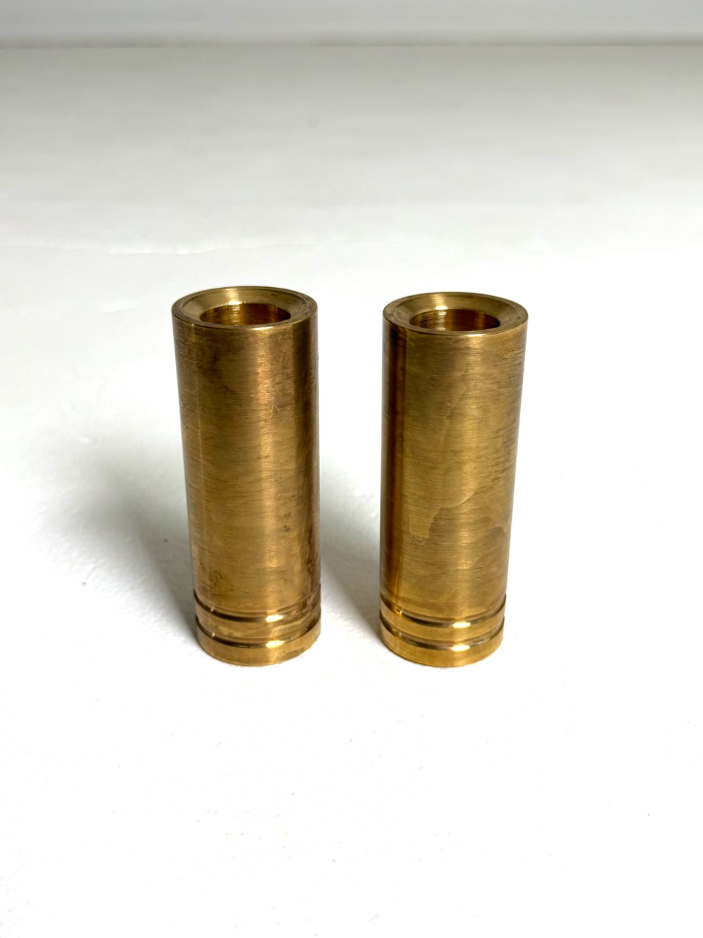 Minimalistinen ja painava täysmessinkinen kynttilänjalkapari 1960–70-luvun Tanskasta. Sylinterimäinen muotoilu ja hienovaraiset urakoristeet luovat pelkistetyn mutta tyylikkään ilmeen. Näissä kynttilänjaloissa yhdistyvät ajaton muotokieli ja laadukas materiaali. Sopivat täydellisesti sekä moderniin että klassisempaan sisustukseen.