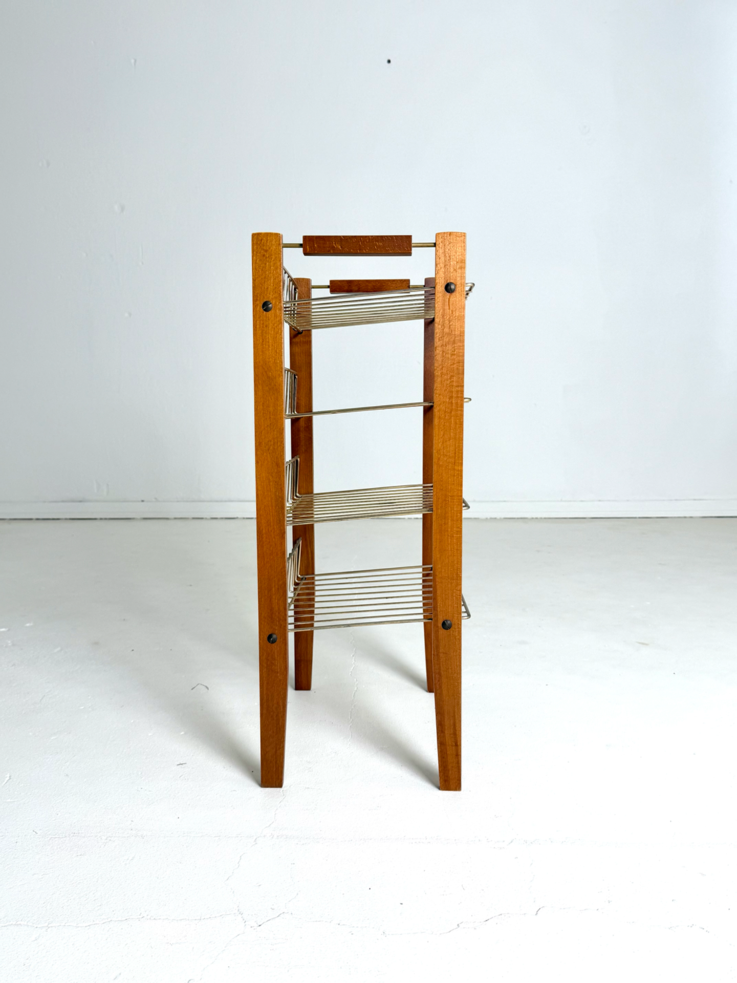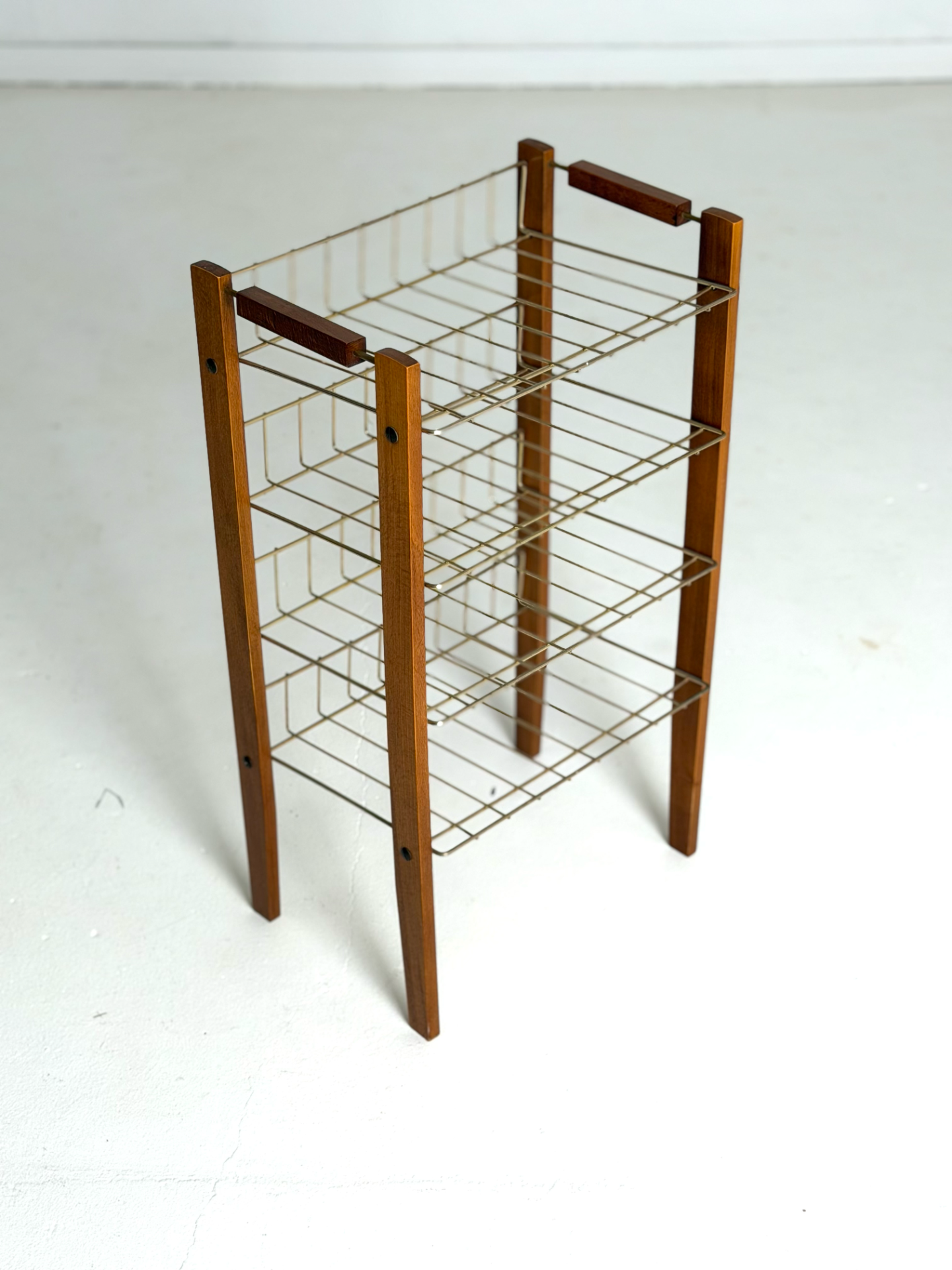 A stylish Danish magazine rack from the 1960s featuring a warm teak frame and brass wire shelves. The four-tier design offers ample storage for magazines, vinyls, or documents. Lightweight yet sturdy, this vintage piece adds elegance and functionality to any living room or office.