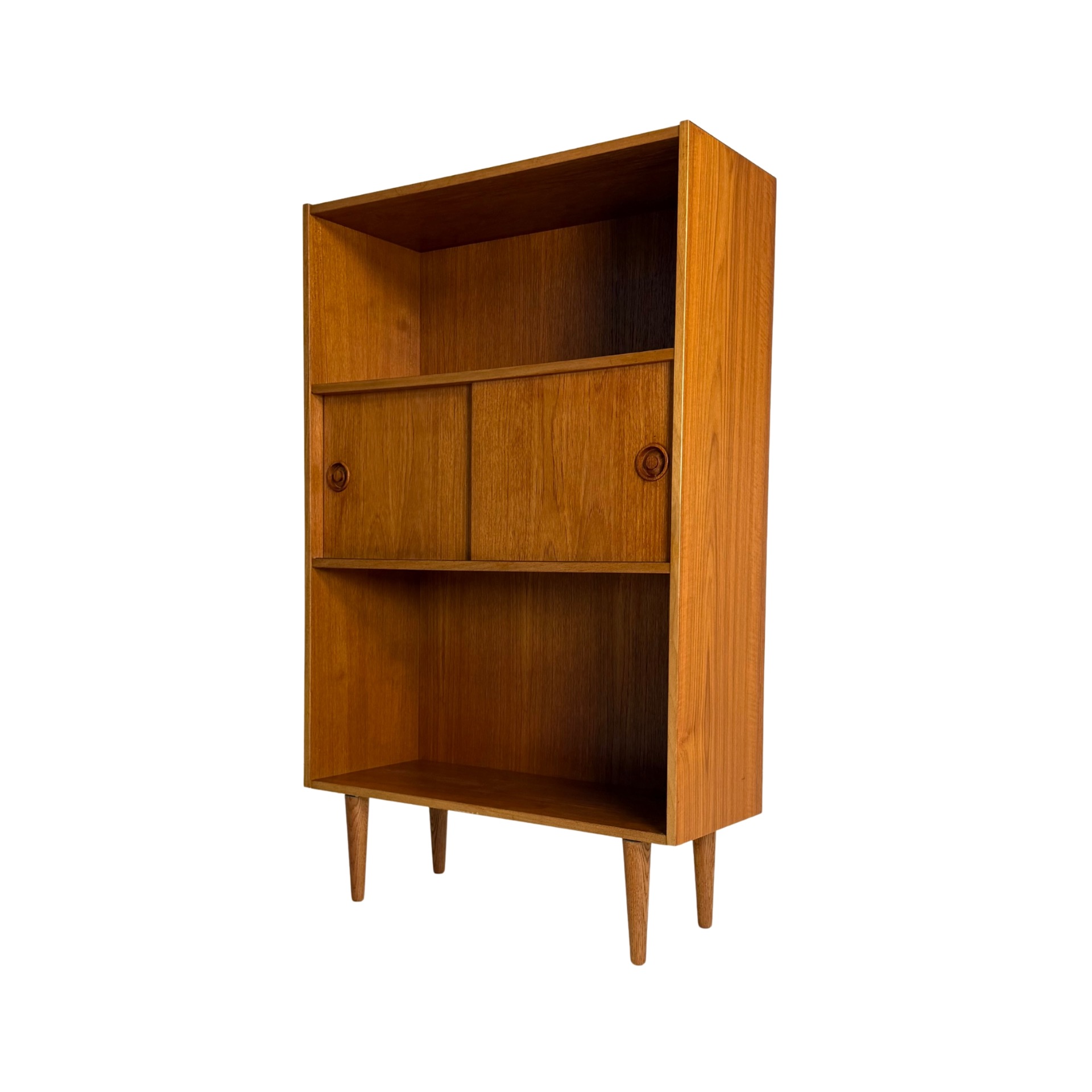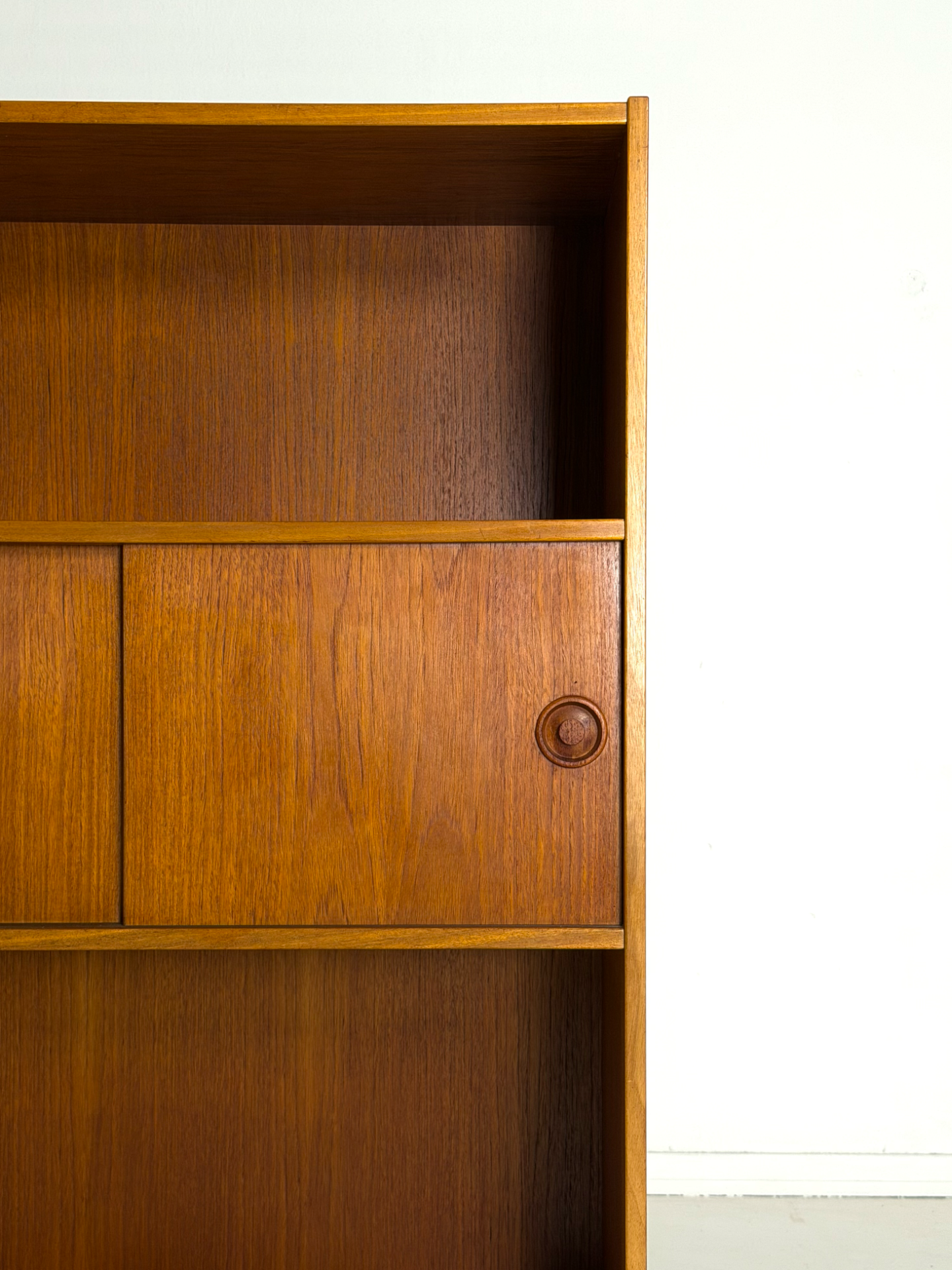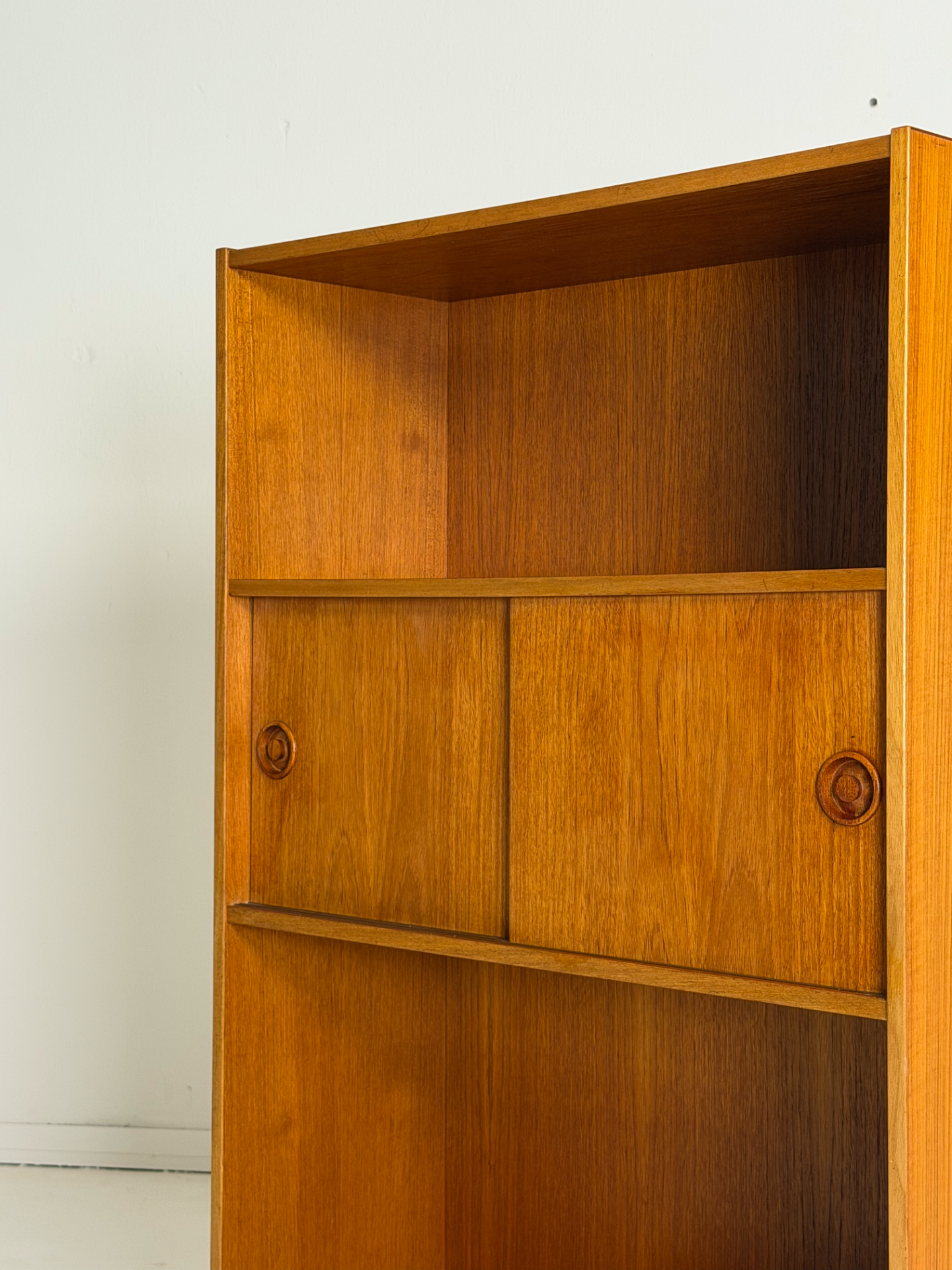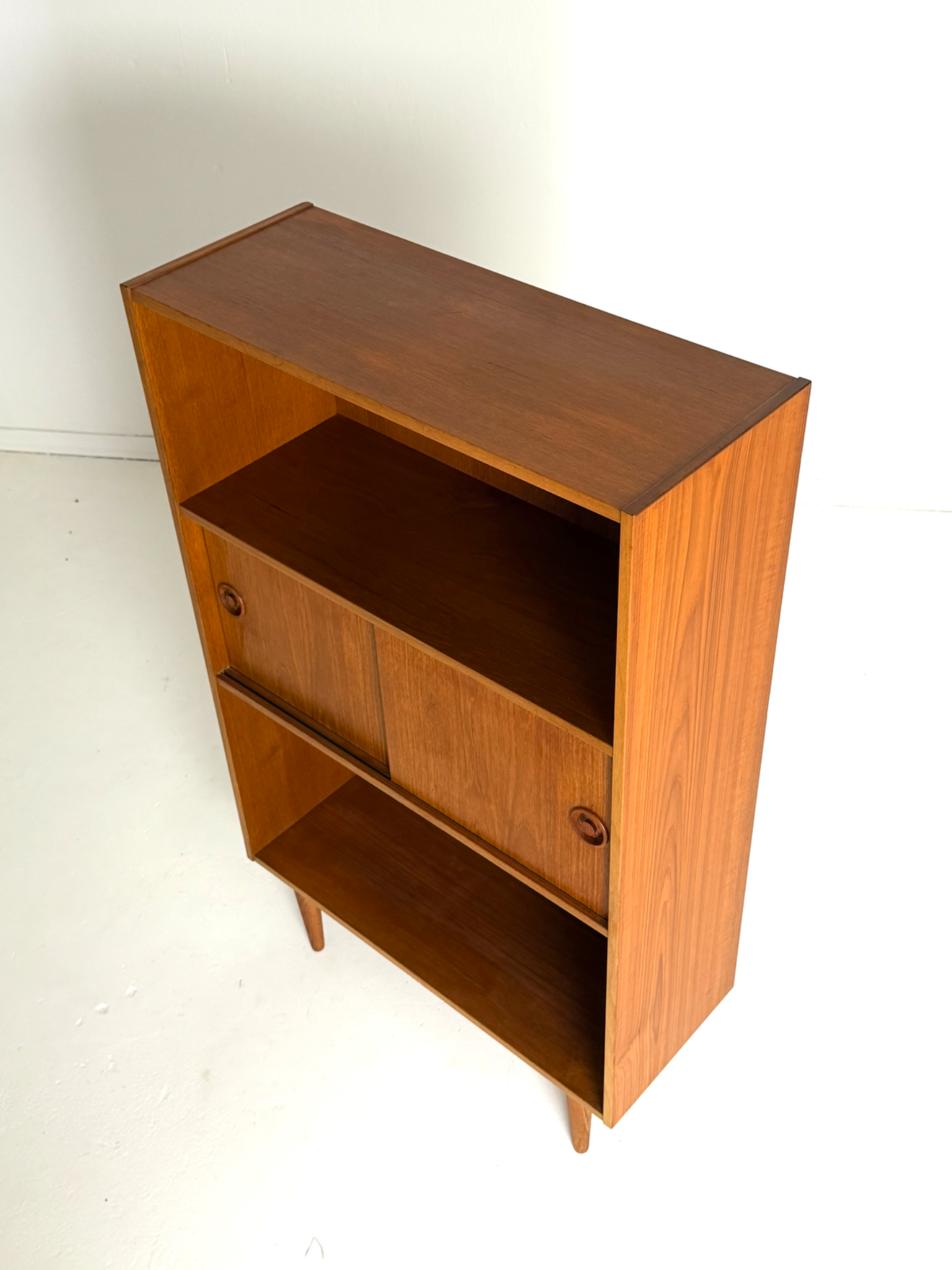 A beautiful Danish teak shelf from the late 1960s. Features sliding doors with round recessed handles and three open compartments. Its classic and timeless design makes it a versatile piece for books, display, or storage.