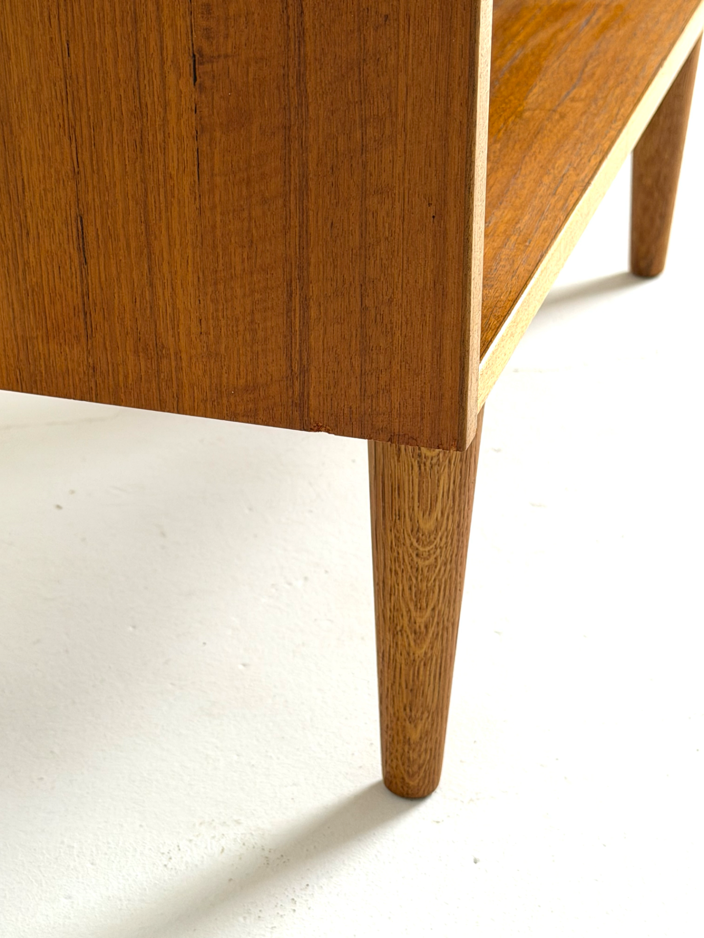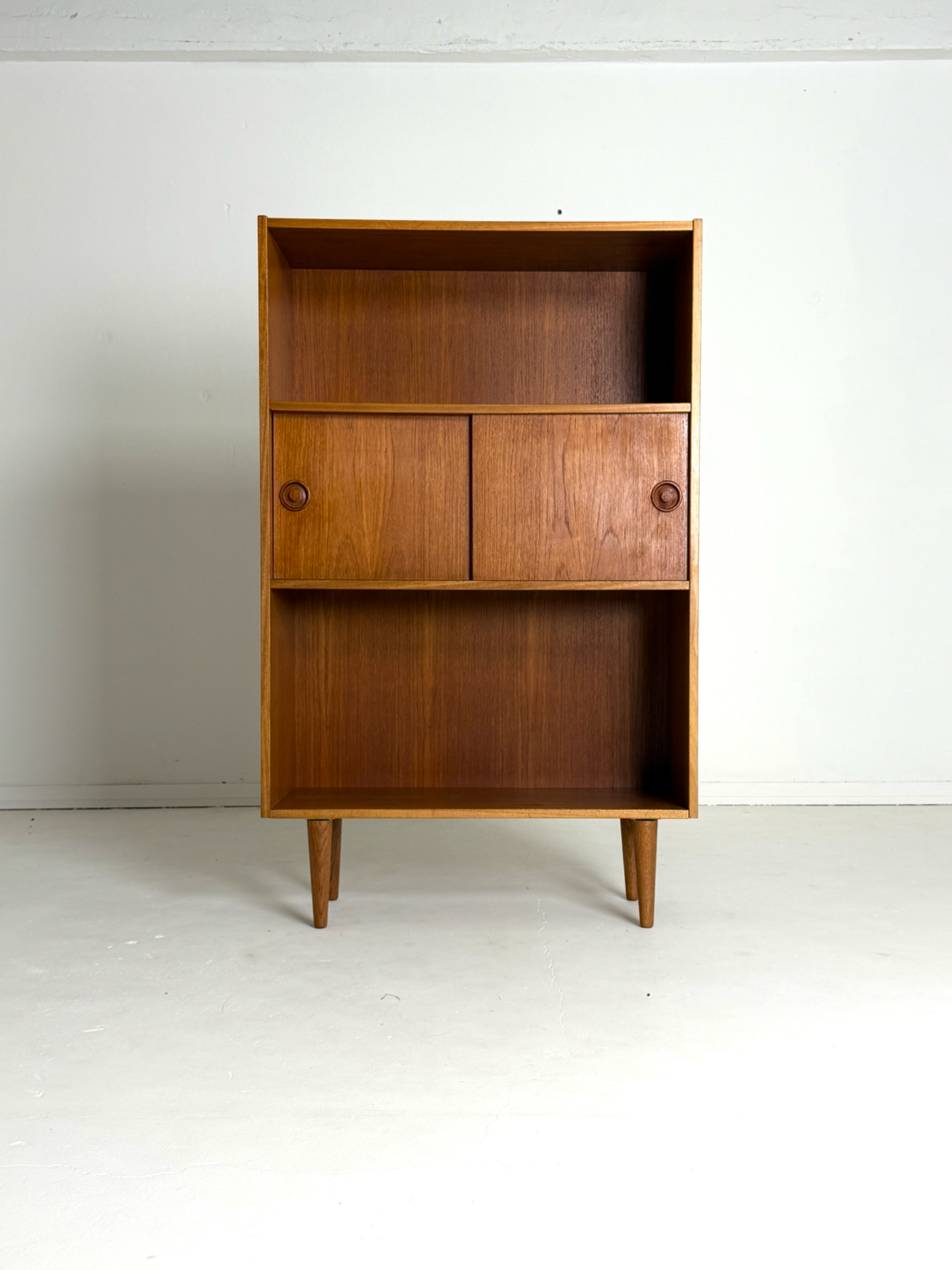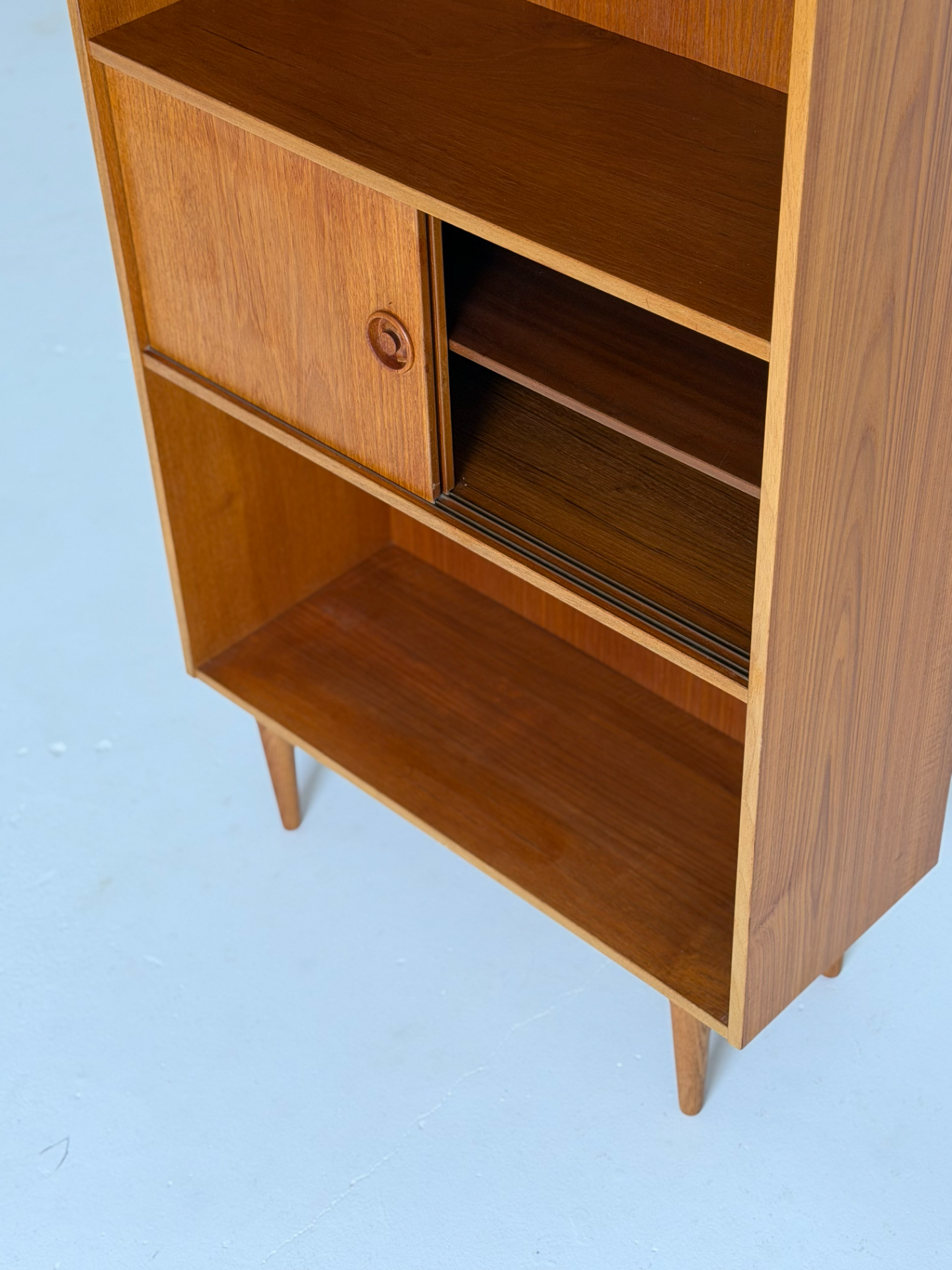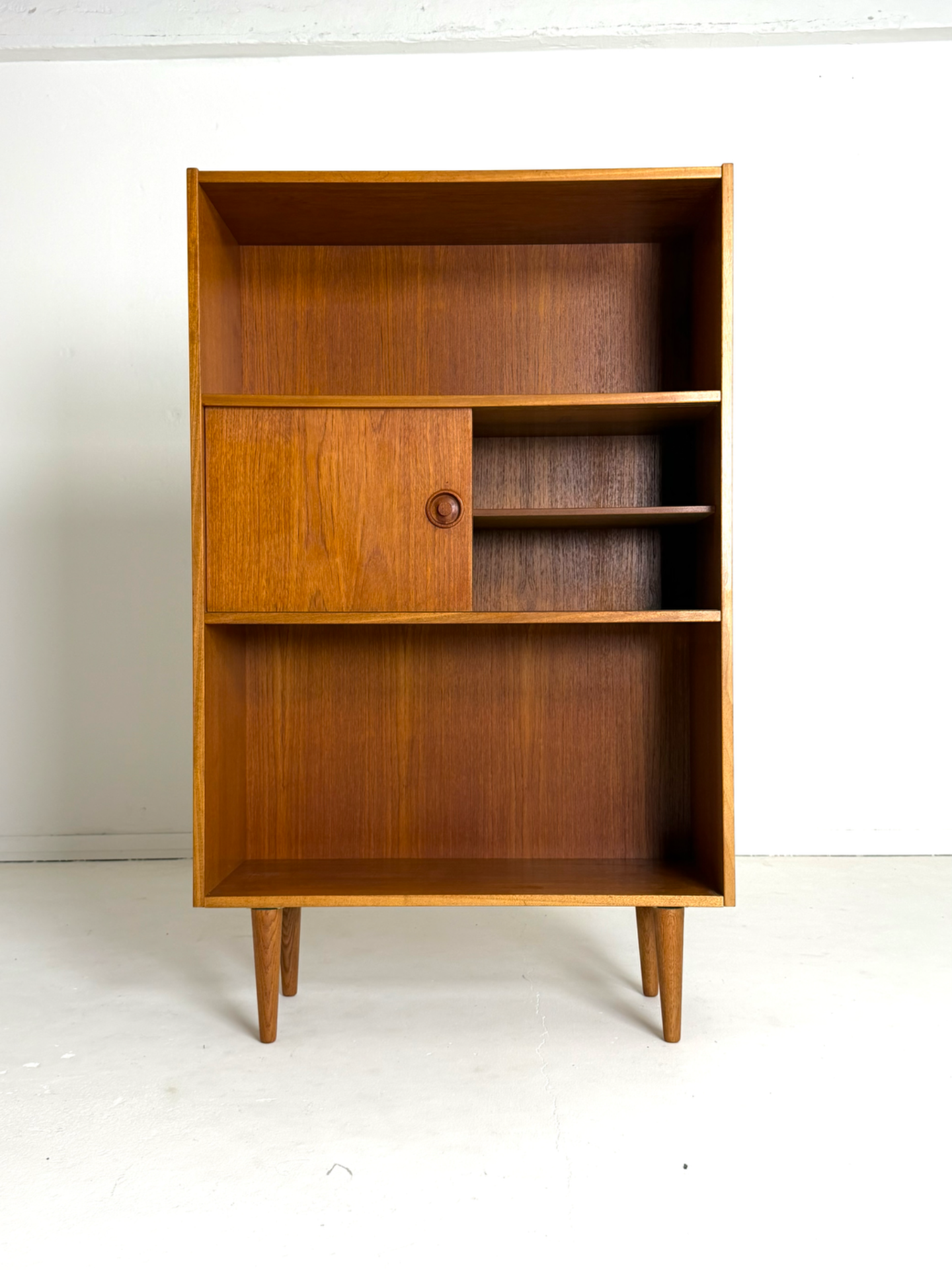 A beautiful Danish teak shelf from the late 1960s. Features sliding doors with round recessed handles and three open compartments. Its classic and timeless design makes it a versatile piece for books, display, or storage.