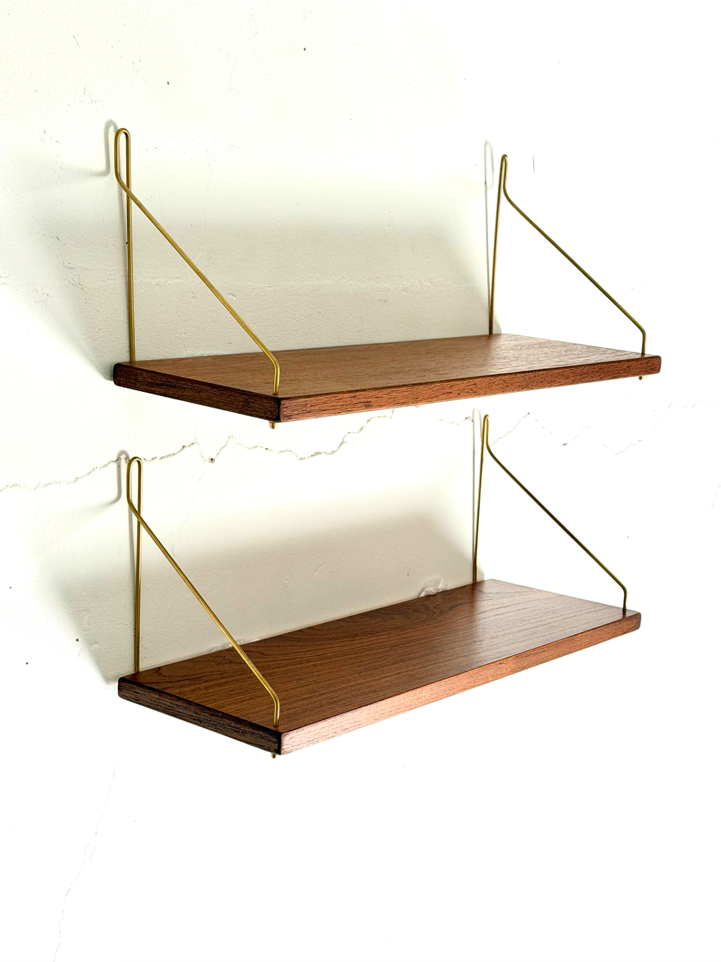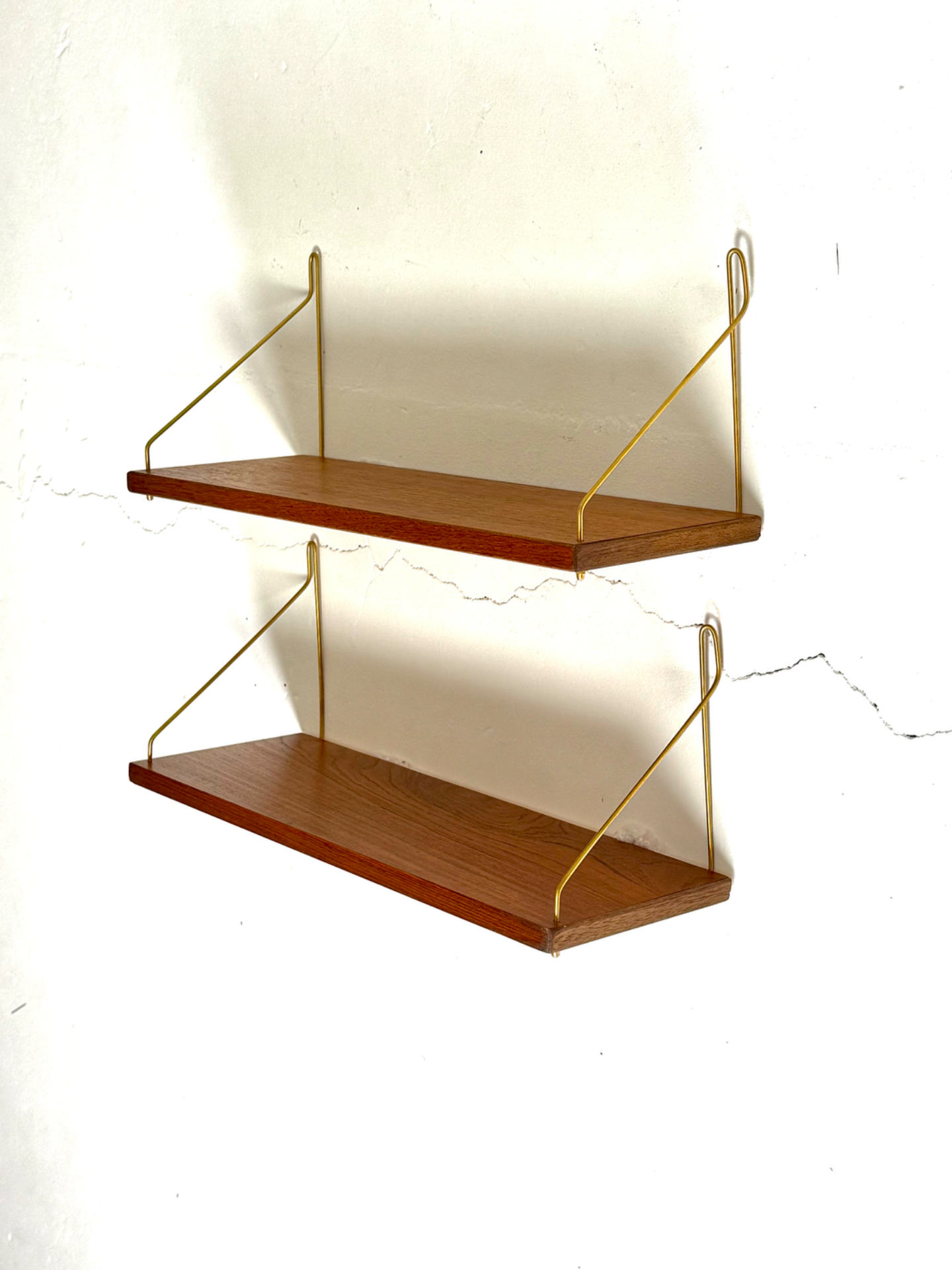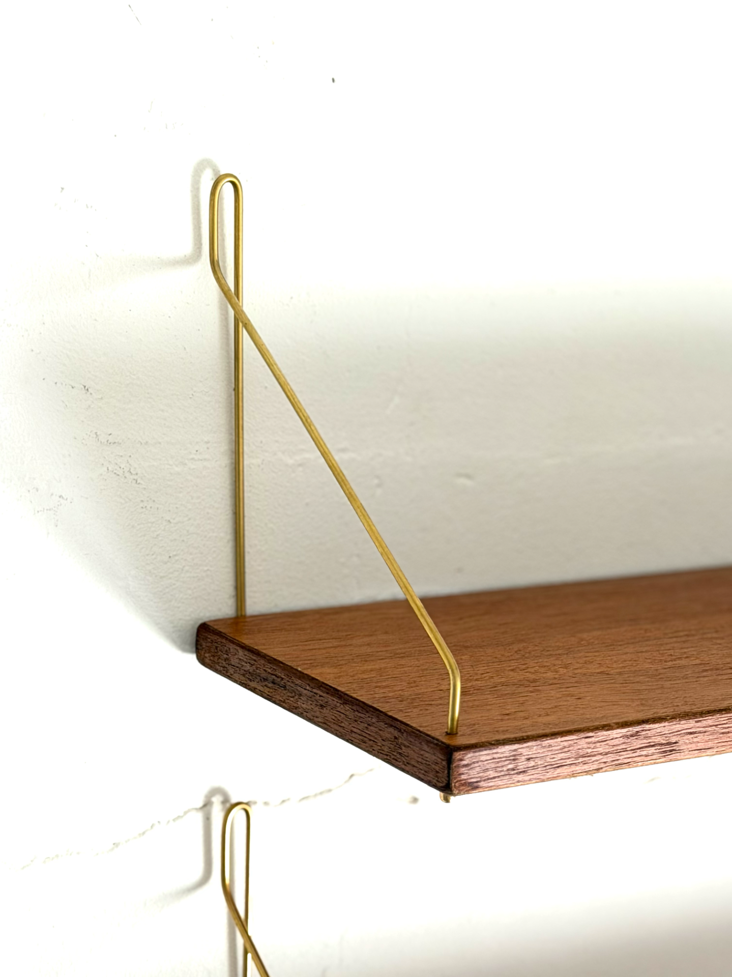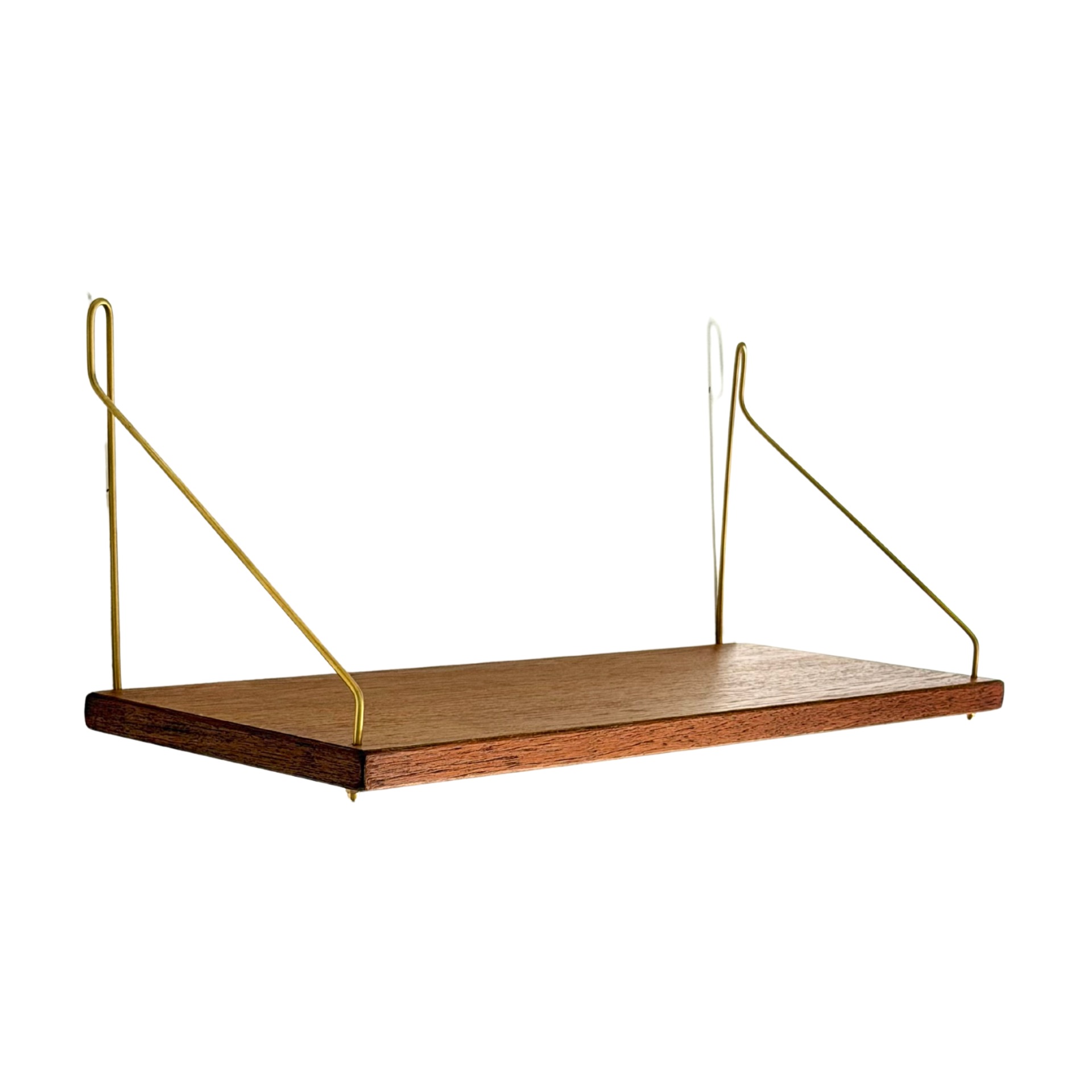 Klassinen 1960-luvun tiikkinen seinähylly messinginvärisillä metallikannakkeilla. Hyllyn keveys ja selkeä muotoilu tekevät siitä monikäyttöisen ja ajattoman sisustuselementin. Sopivat loistavasti keittiöön, olohuoneeseen tai eteiseen.