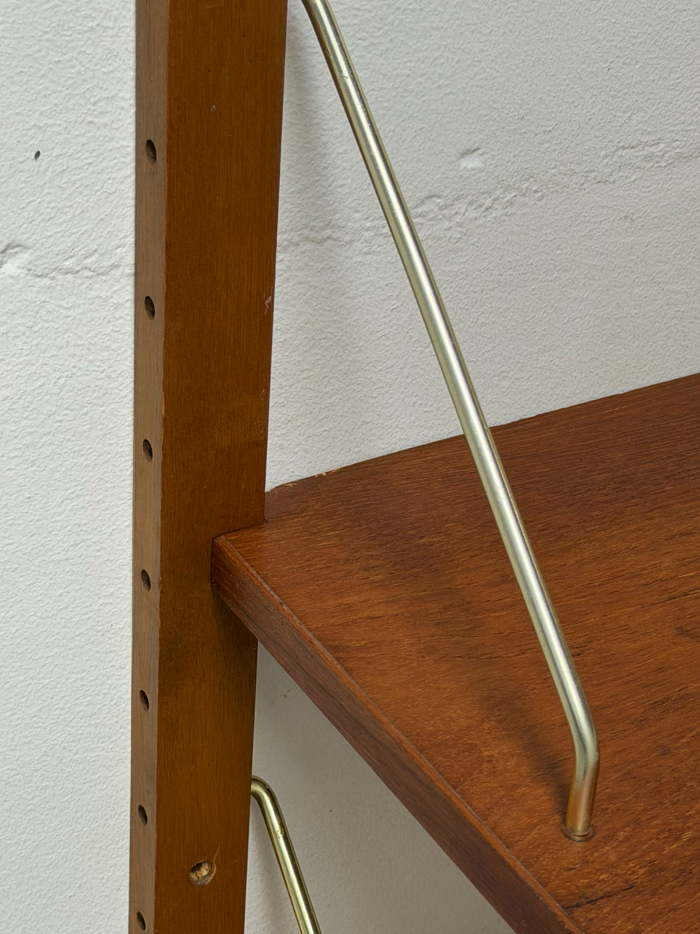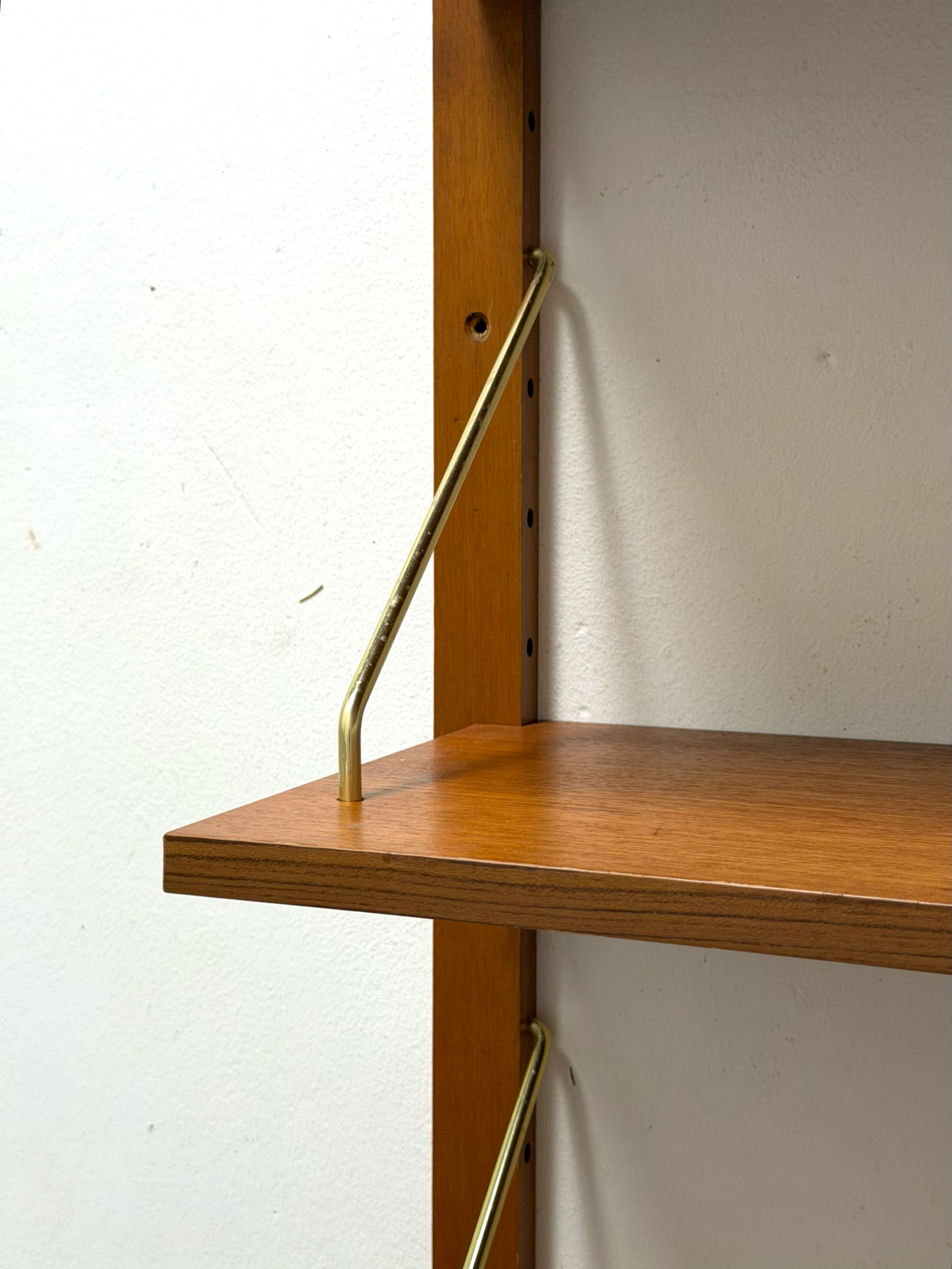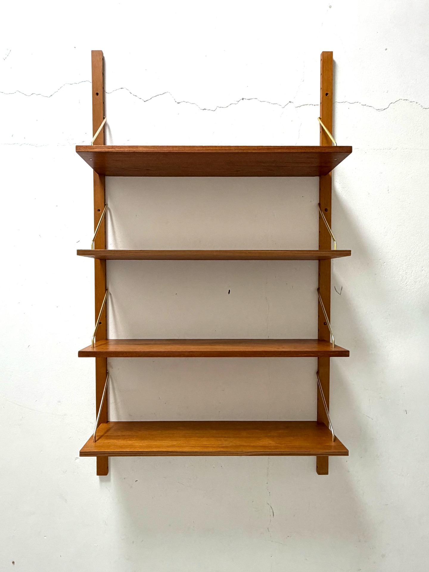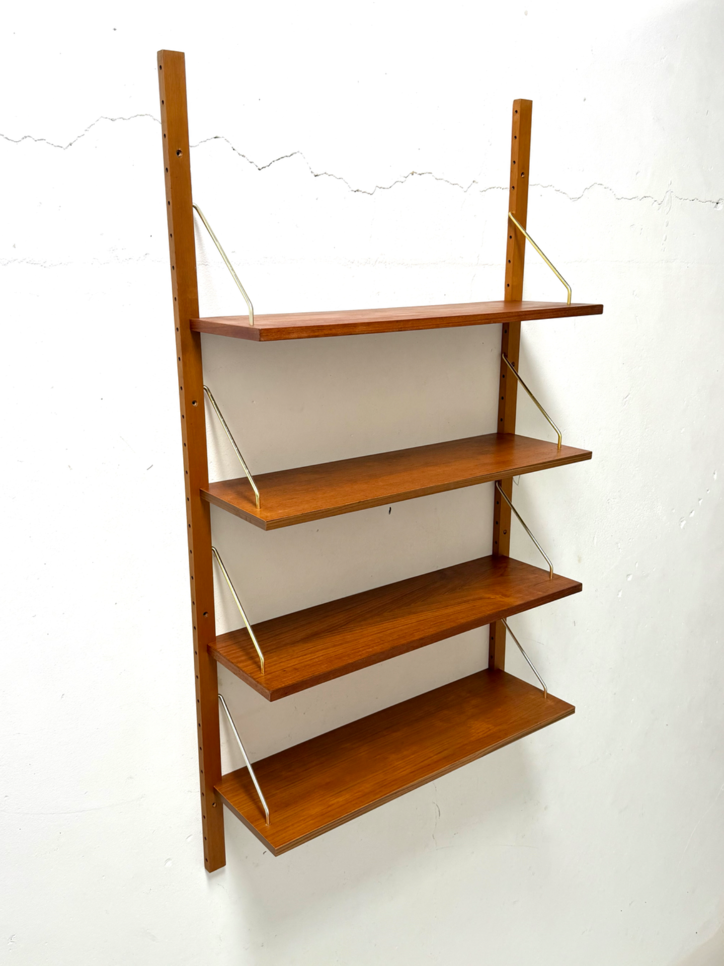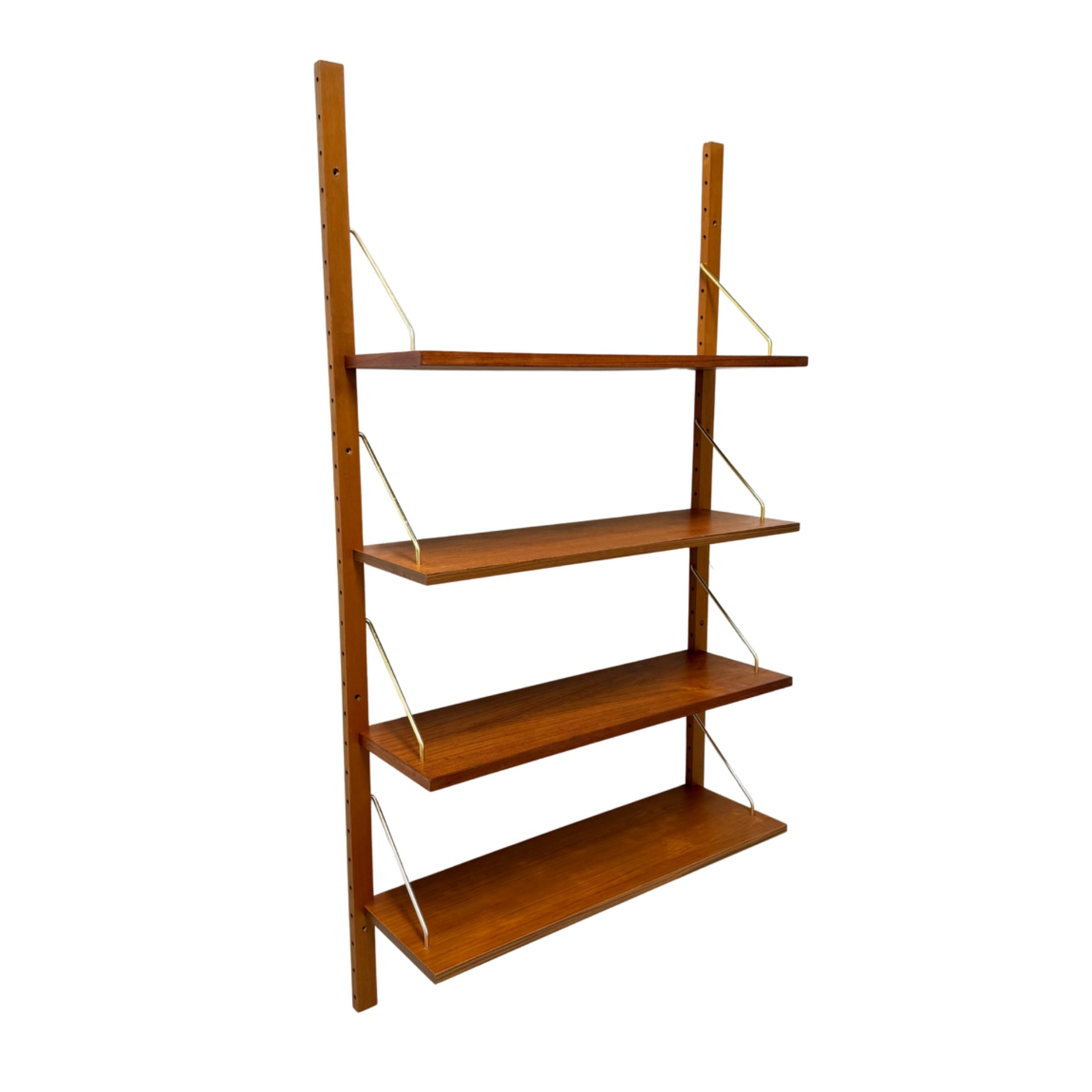 A refined Danish wall-mounted shelving unit from the 1960s–70s, crafted in warm teak and complemented by elegant brass supports. The system consists of two vertical rails and four adjustable shelves, offering flexible storage and display options.