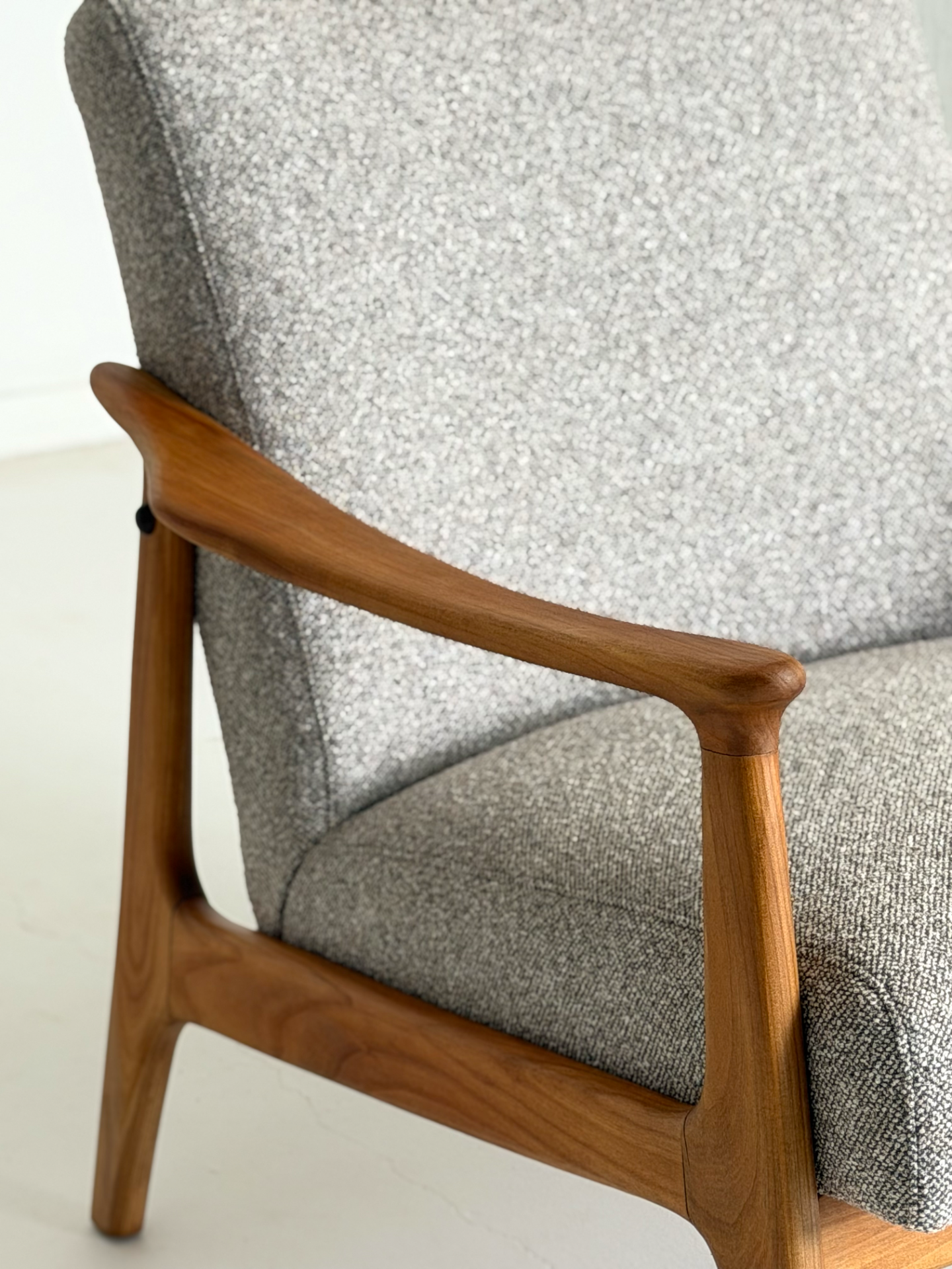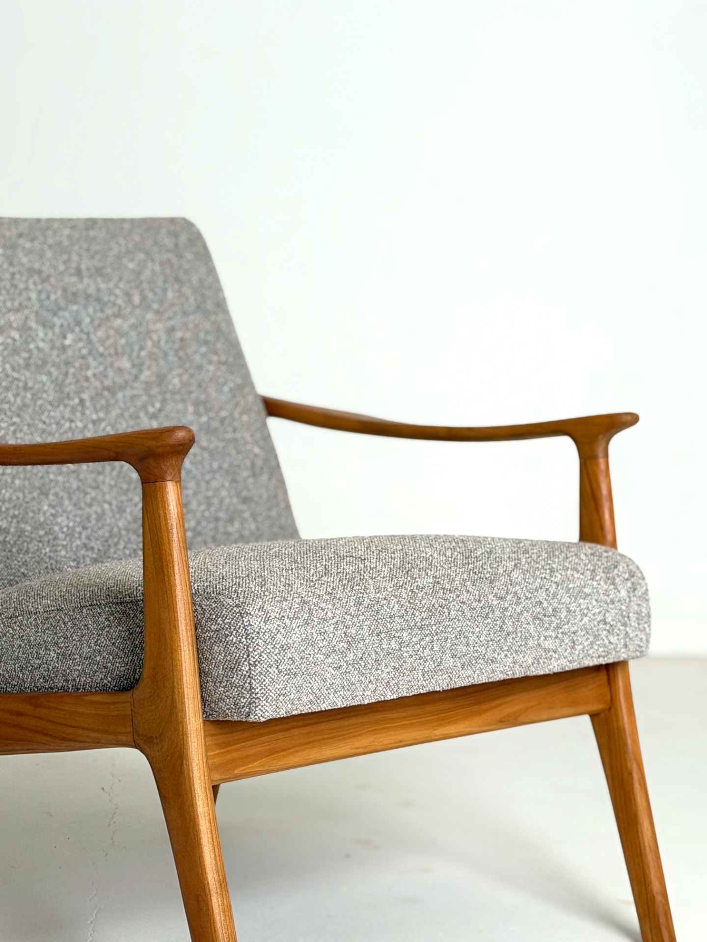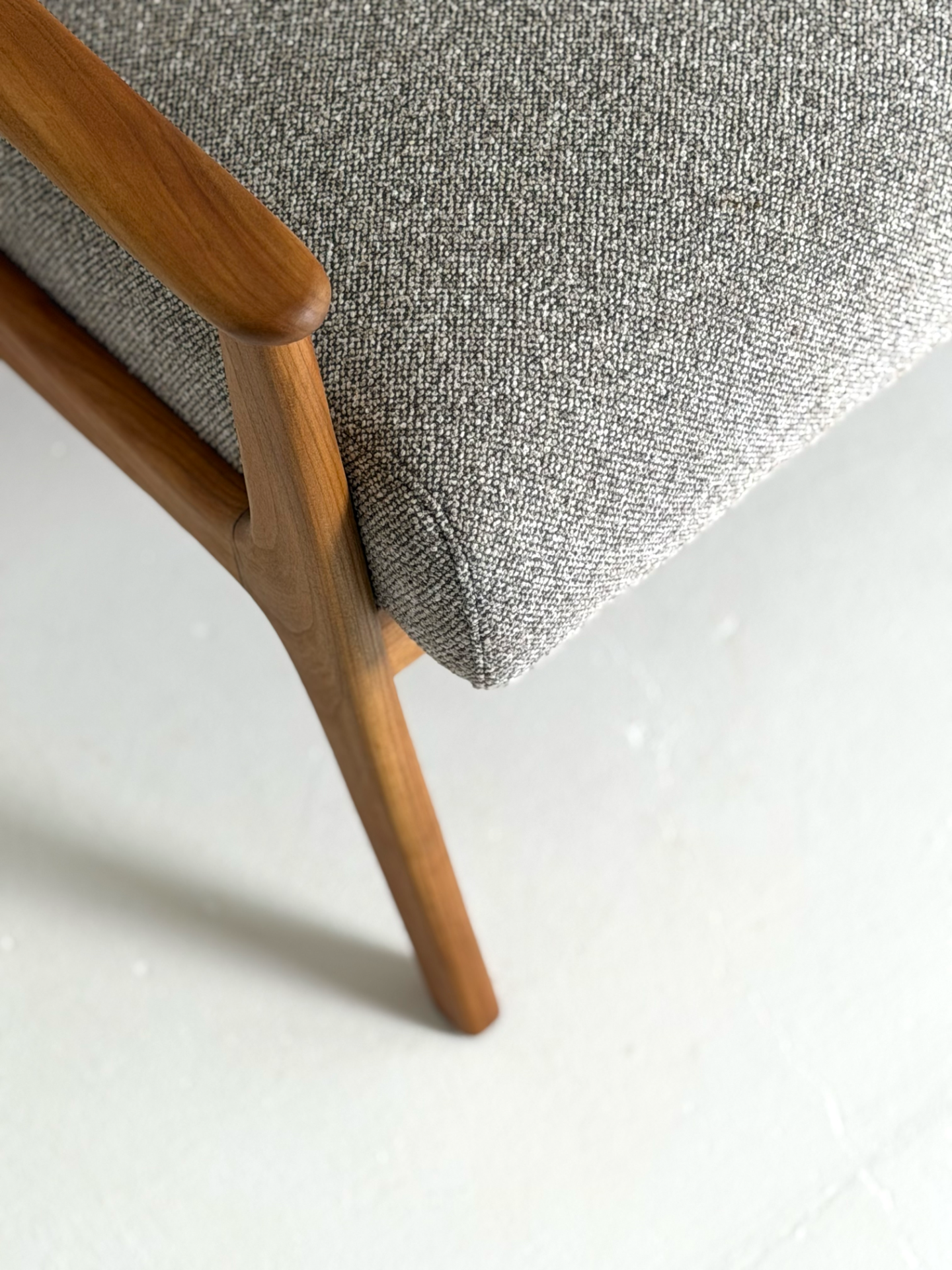 Elegantti ja ajaton tiikkirunkoinen nojatuoli 1960-luvun Tanskasta. Veistoksellinen runko korostaa kauniisti puun luonnollista syykuviota. Tuoli on juuri uudelleenverhoiltu laadukkaalla harmaan beigellä puuvillakankaalla, joka tuo pehmeyttä ja raikkautta kokonaisuuteen. Matalalinjainen ja mukava istuin tekee tästä tuolista täydellisen lisän olohuoneeseen tai lukunurkkaukseen – hieno esimerkki tanskalaisesta modernista muotoilusta.