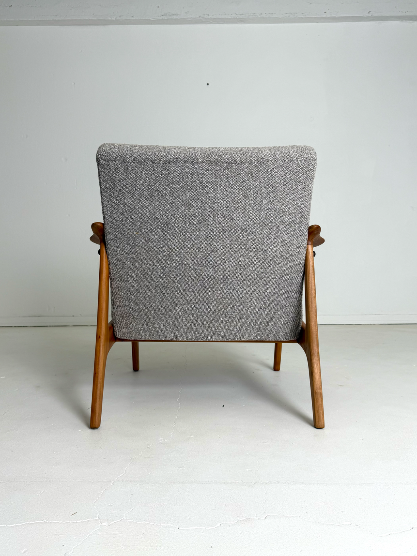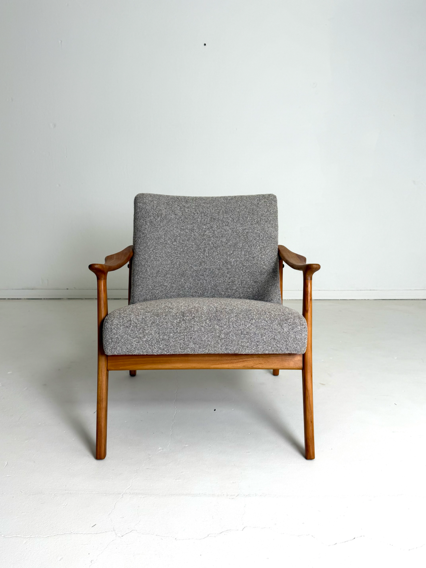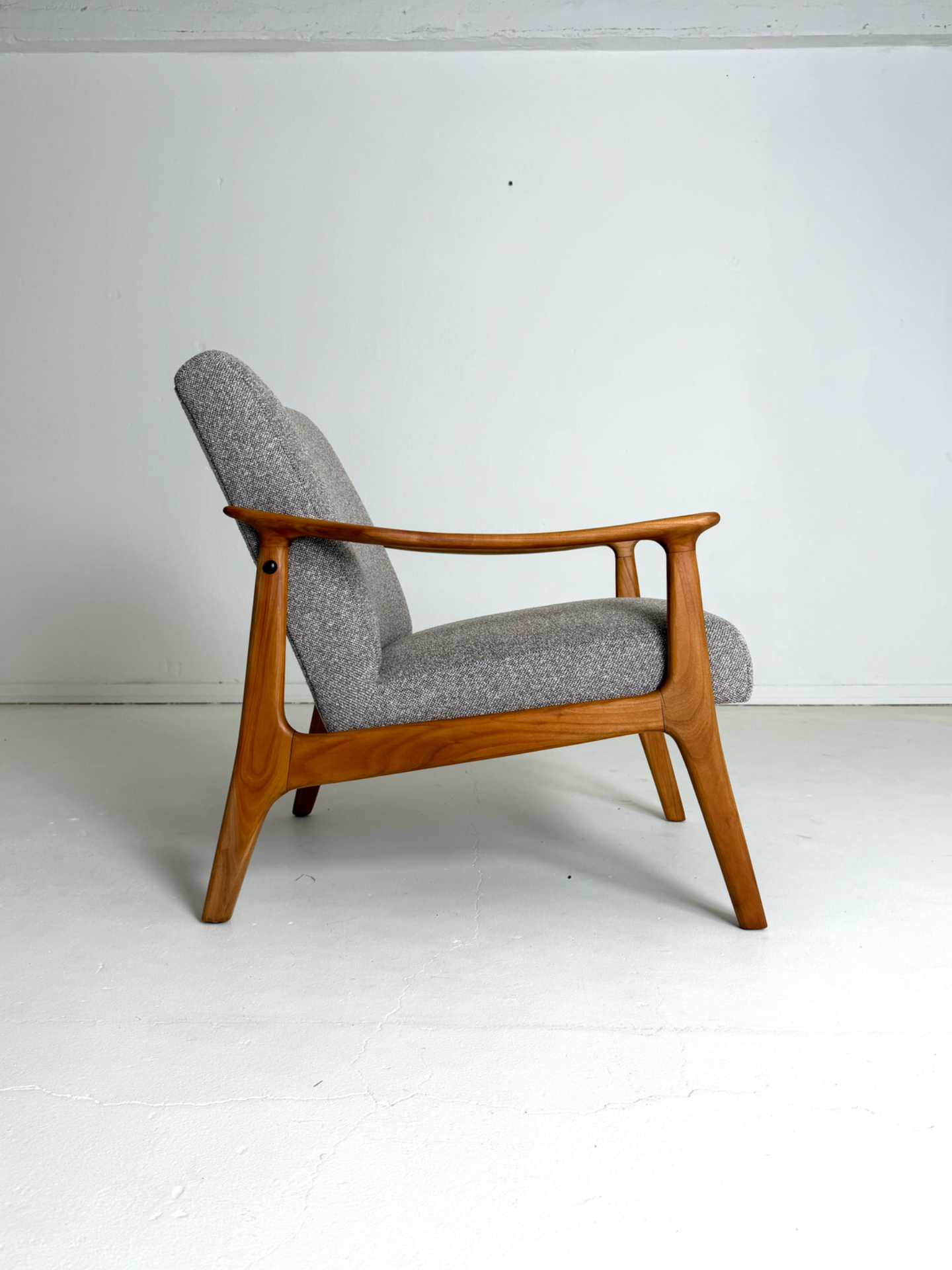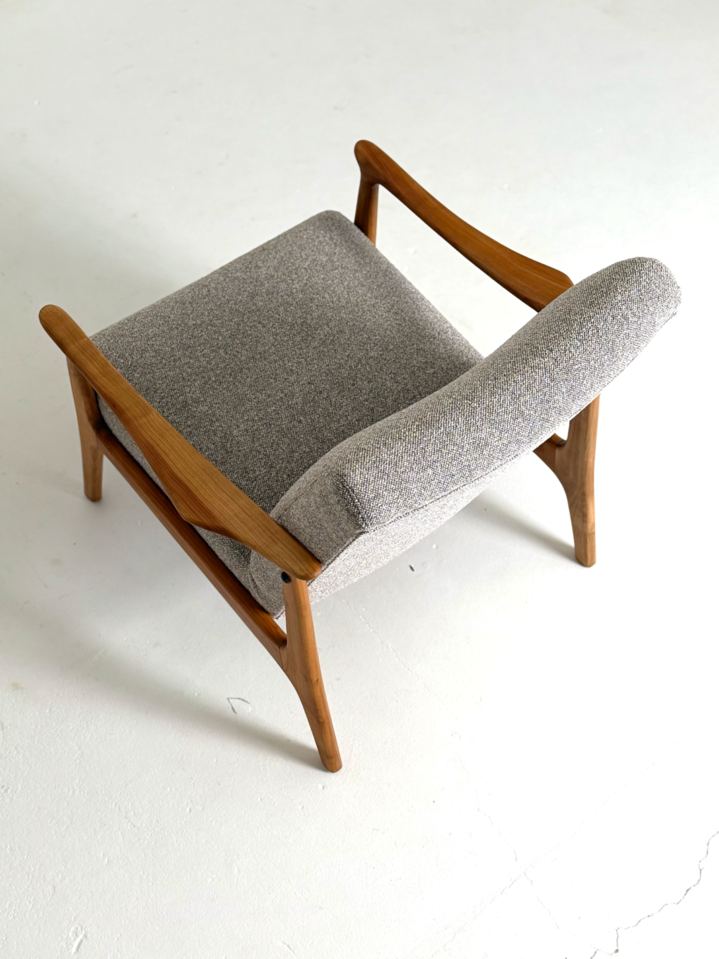 Elegantti ja ajaton tiikkirunkoinen nojatuoli 1960-luvun Tanskasta. Veistoksellinen runko korostaa kauniisti puun luonnollista syykuviota. Tuoli on juuri uudelleenverhoiltu laadukkaalla harmaan beigellä puuvillakankaalla, joka tuo pehmeyttä ja raikkautta kokonaisuuteen. Matalalinjainen ja mukava istuin tekee tästä tuolista täydellisen lisän olohuoneeseen tai lukunurkkaukseen – hieno esimerkki tanskalaisesta modernista muotoilusta.