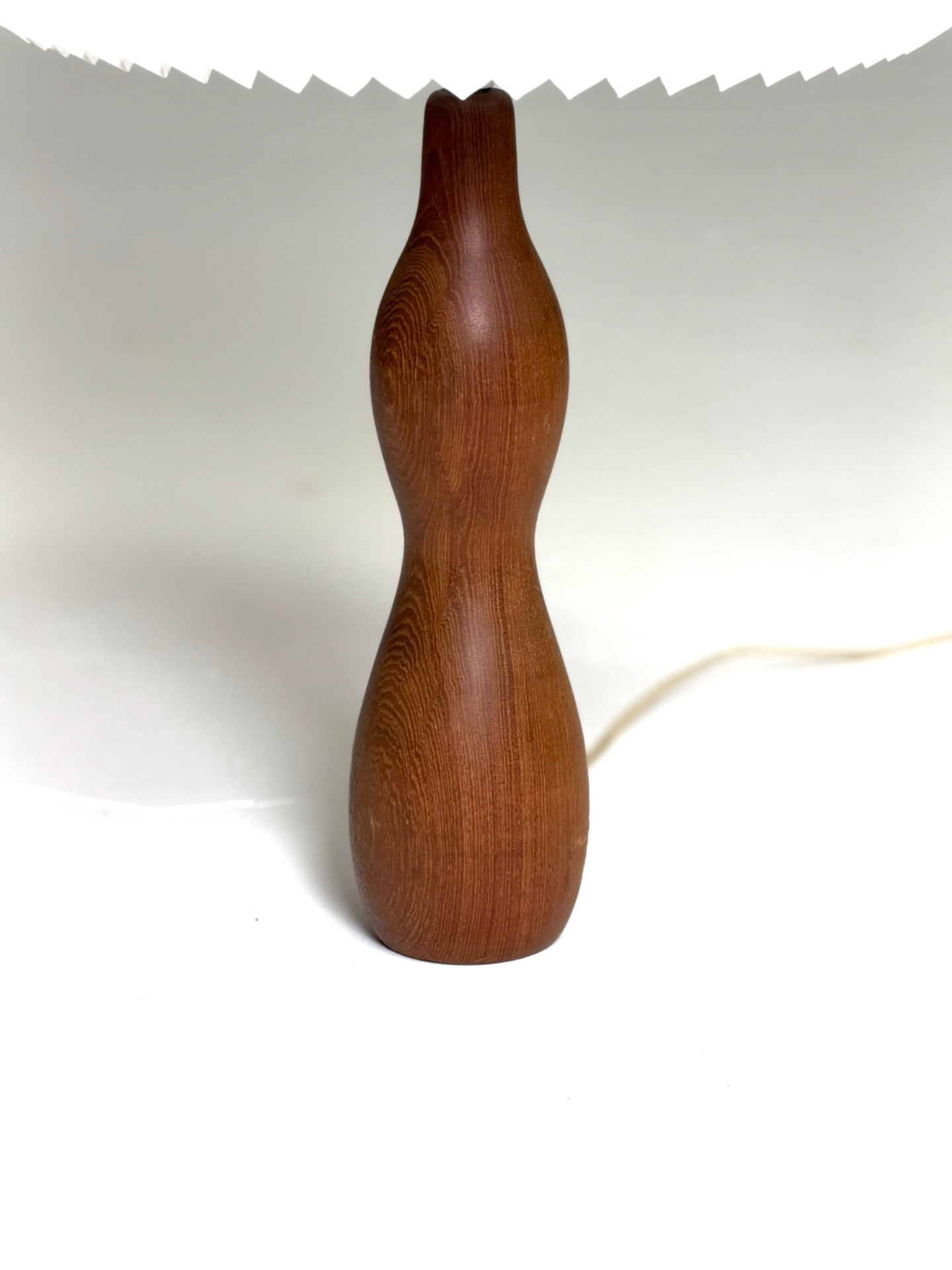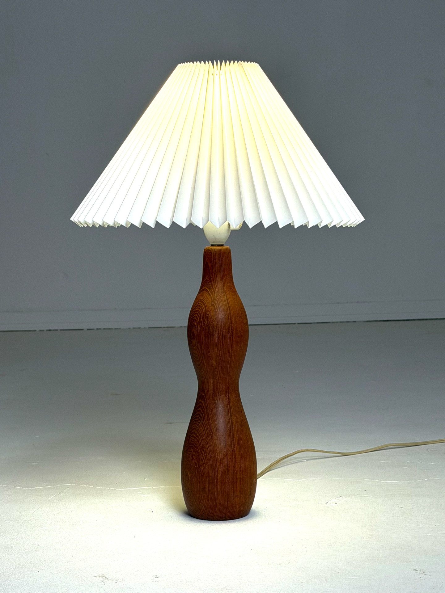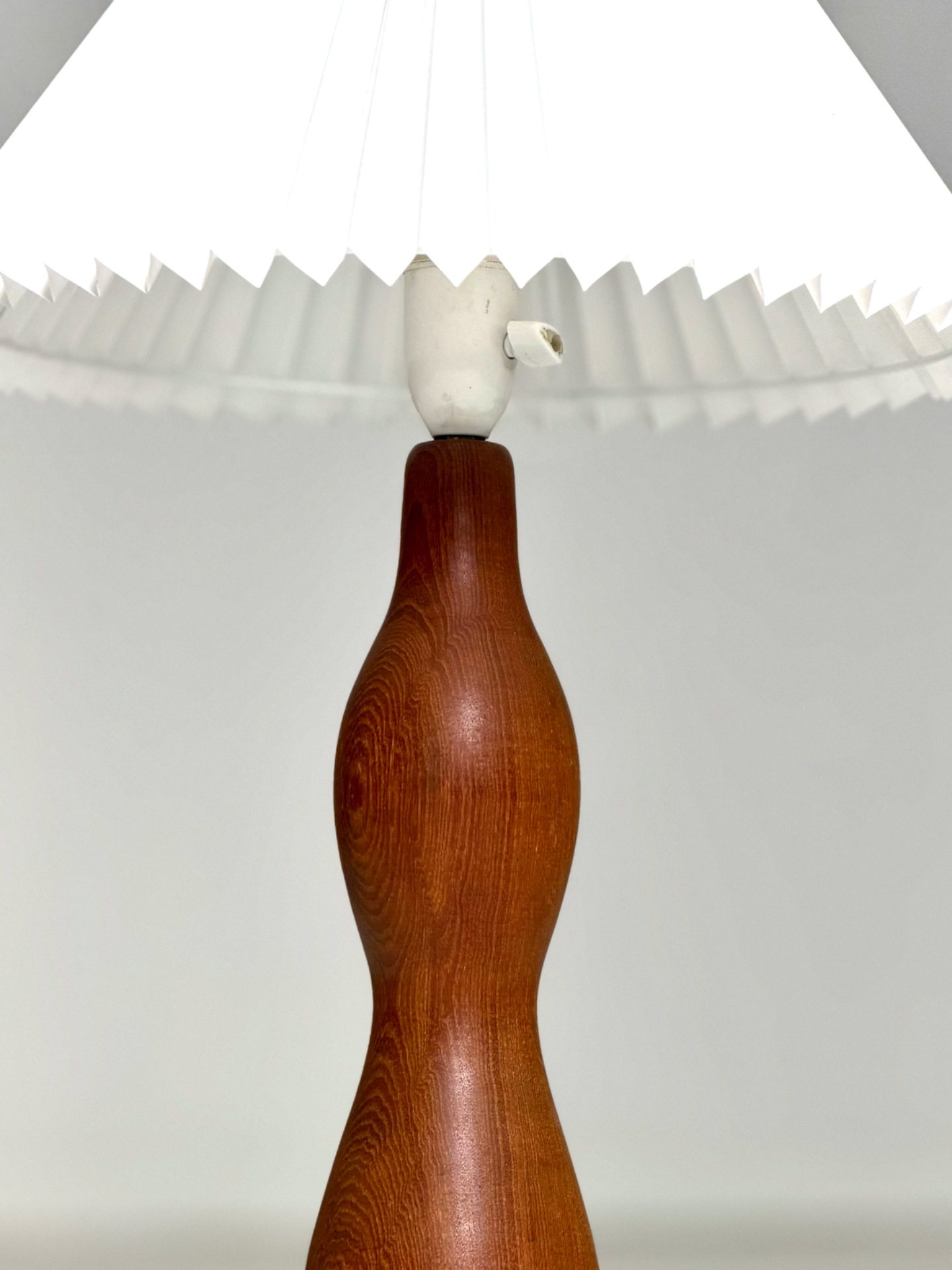 Tanskalainen vintage-pöytävalaisin 1960-luvulta. Veistoksellinen tiikkirunko tuo luonnonläheistä lämpöä sisustukseen, ja valkoisen LeKlint-tyylisen varjostimen laskokset tuovat klassista ilmettä. Harmoninen muotoilu tekee valaisimesta sekä käytännöllisen että sisustuksellisen elementin.