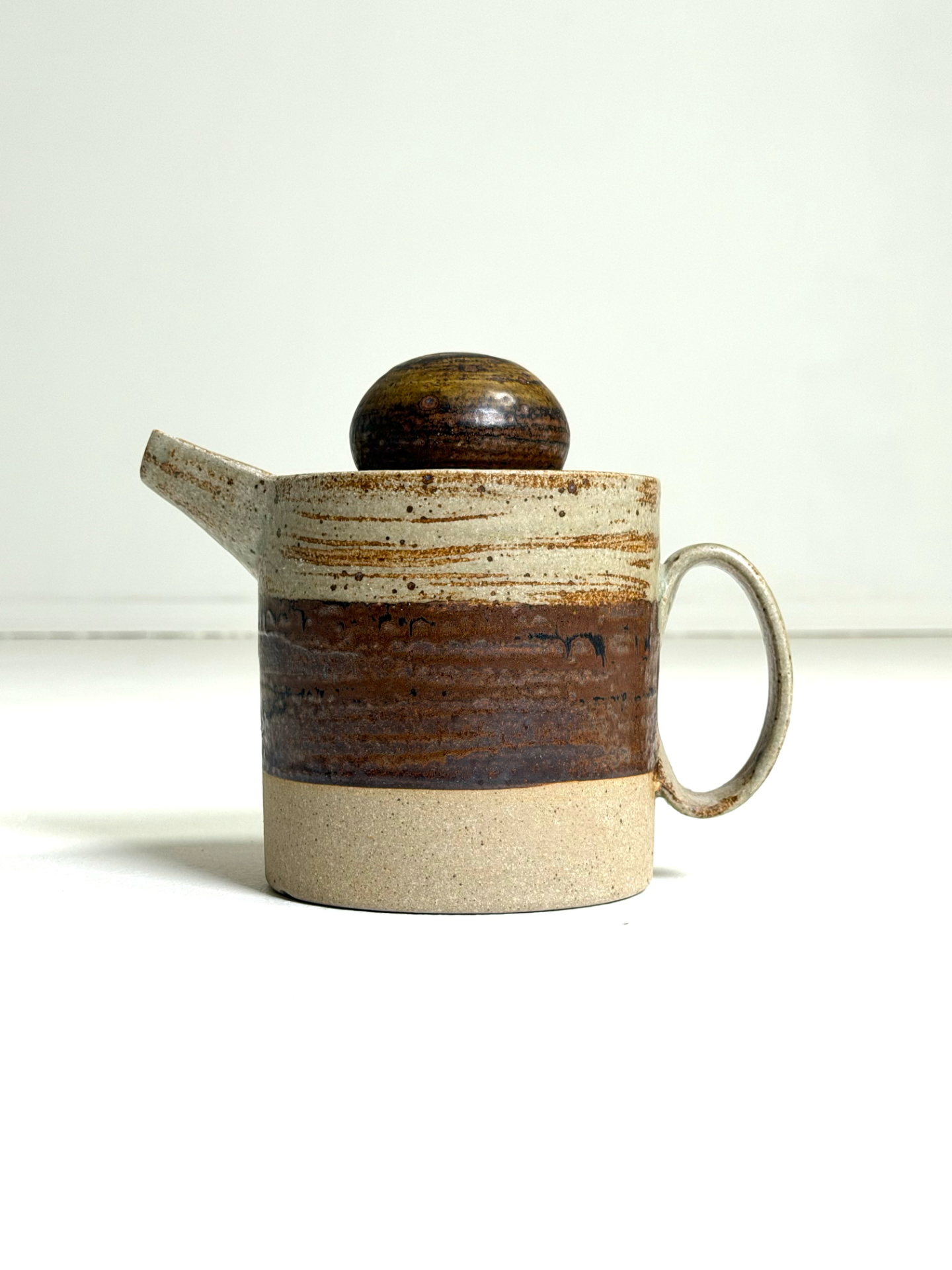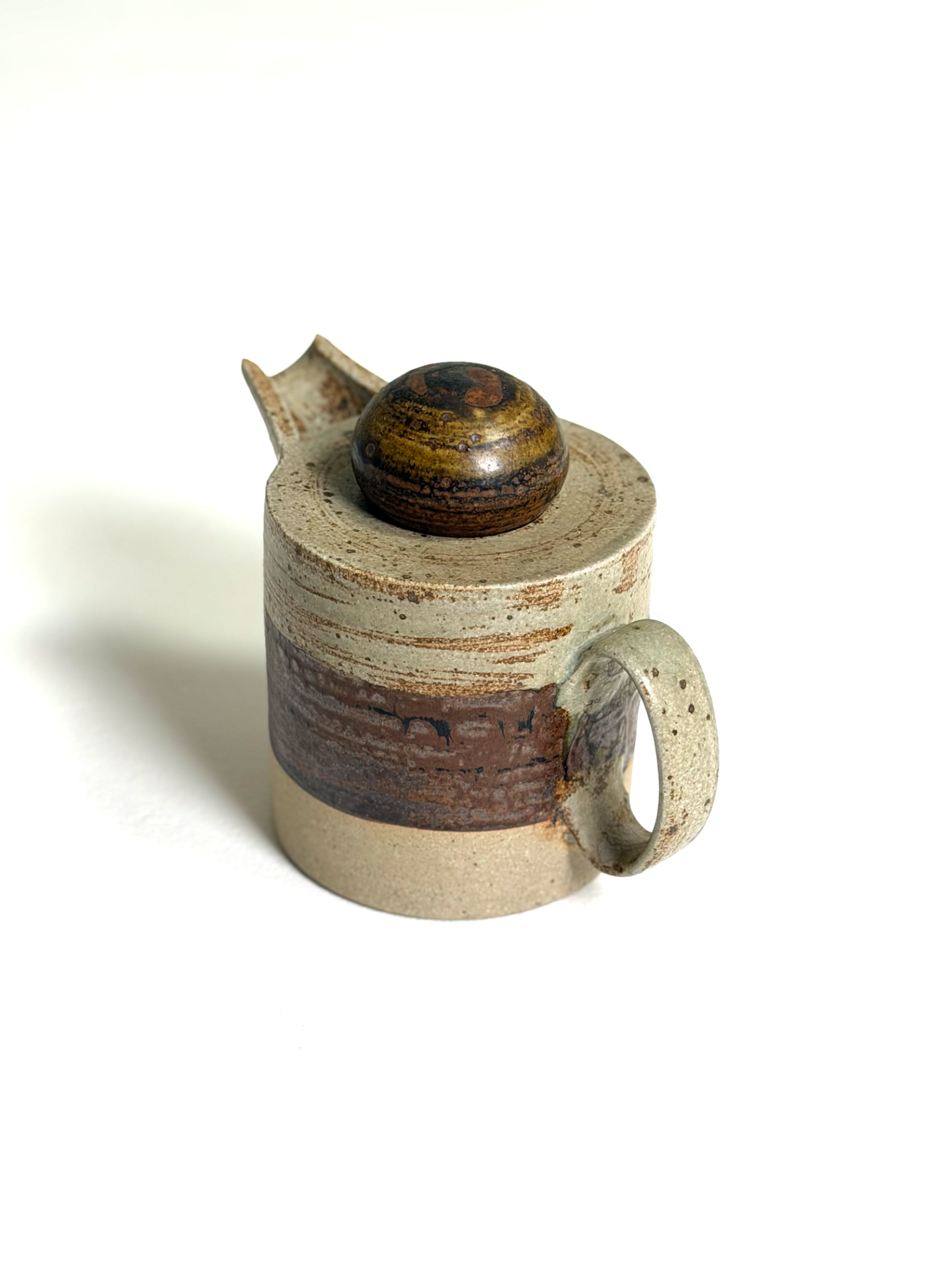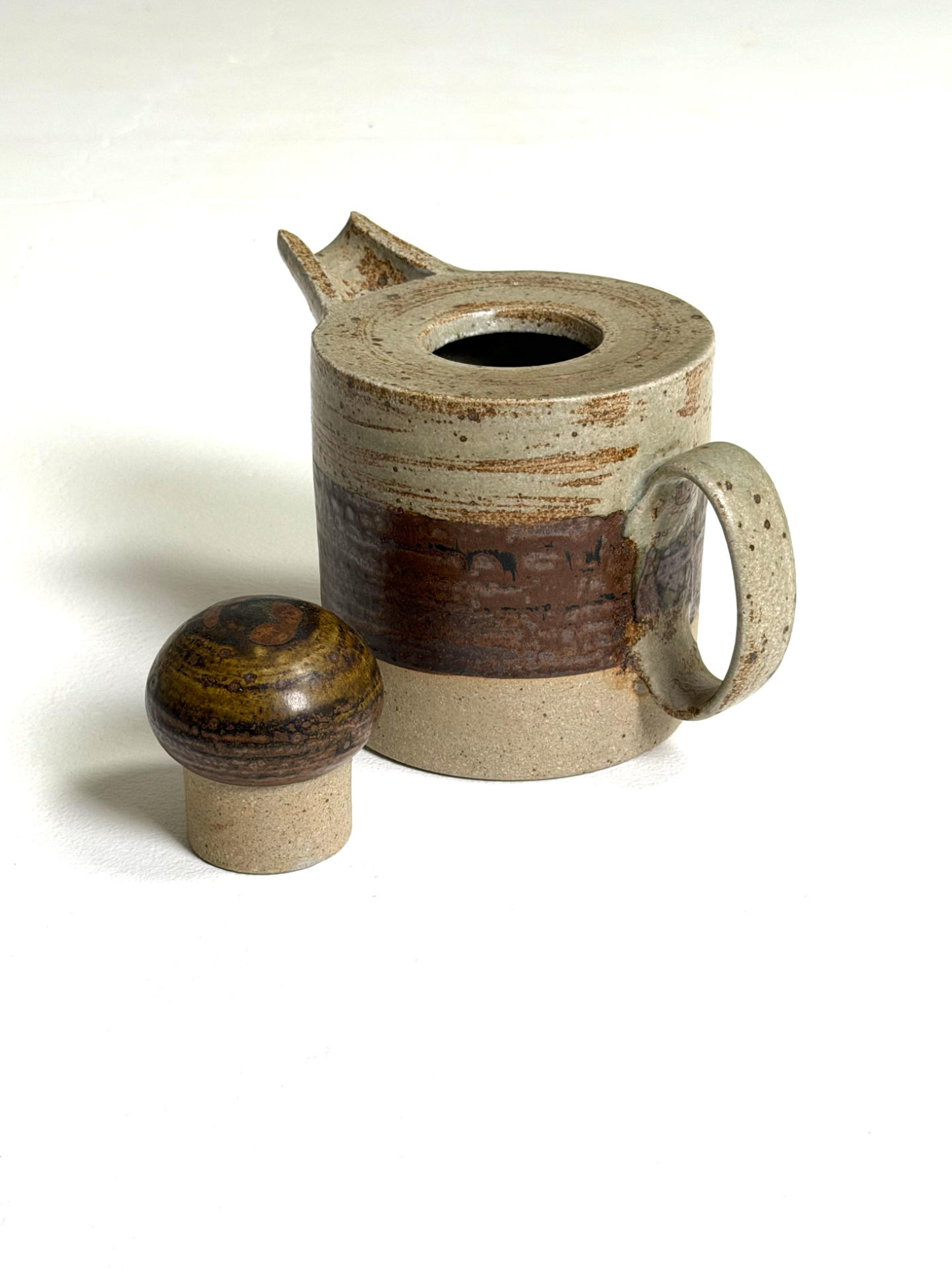 Tue Keramikin valmistama, Tue Poulsenin suunnittelema keraaminen kannu tai kahvipannu 1960-luvulta. Ruskea- ja hiekkasävyinen lasitus tuo esiin kauniit käsityön jäljet ja ajan patinan. Veistoksellinen nuppi ja pelkistetty muotoilu tekevät tästä käyttöesineestä myös upean sisustuselementin.