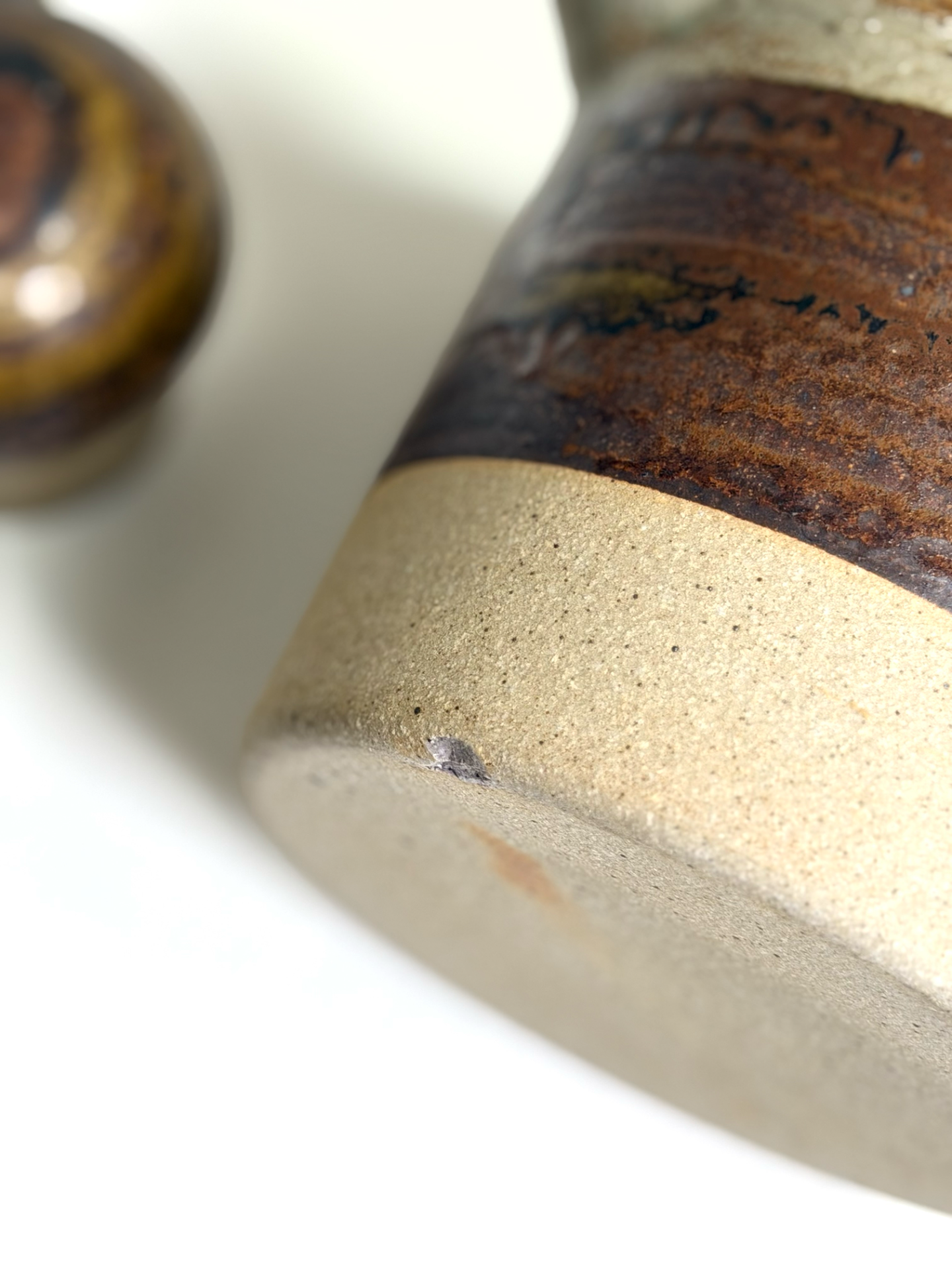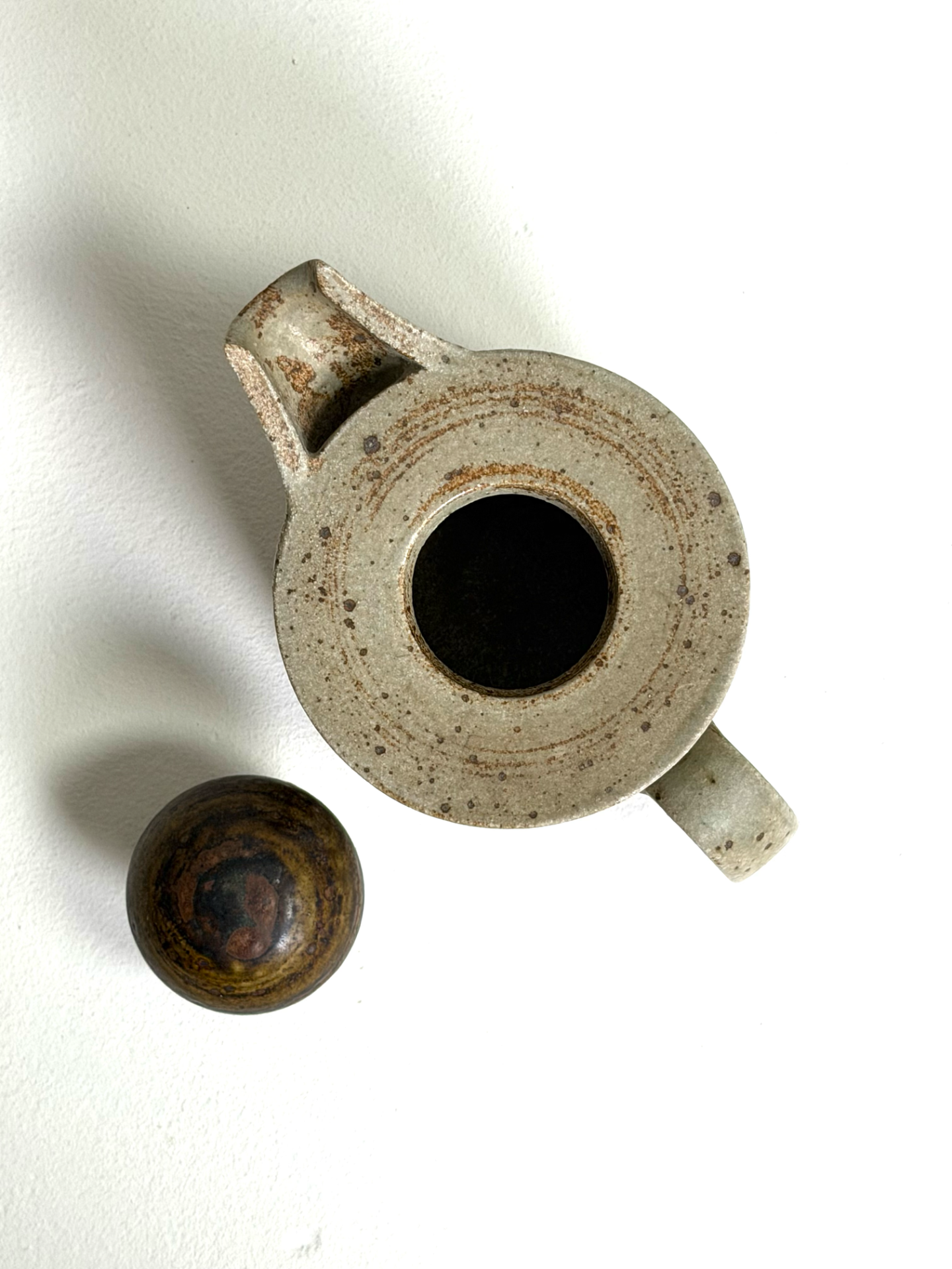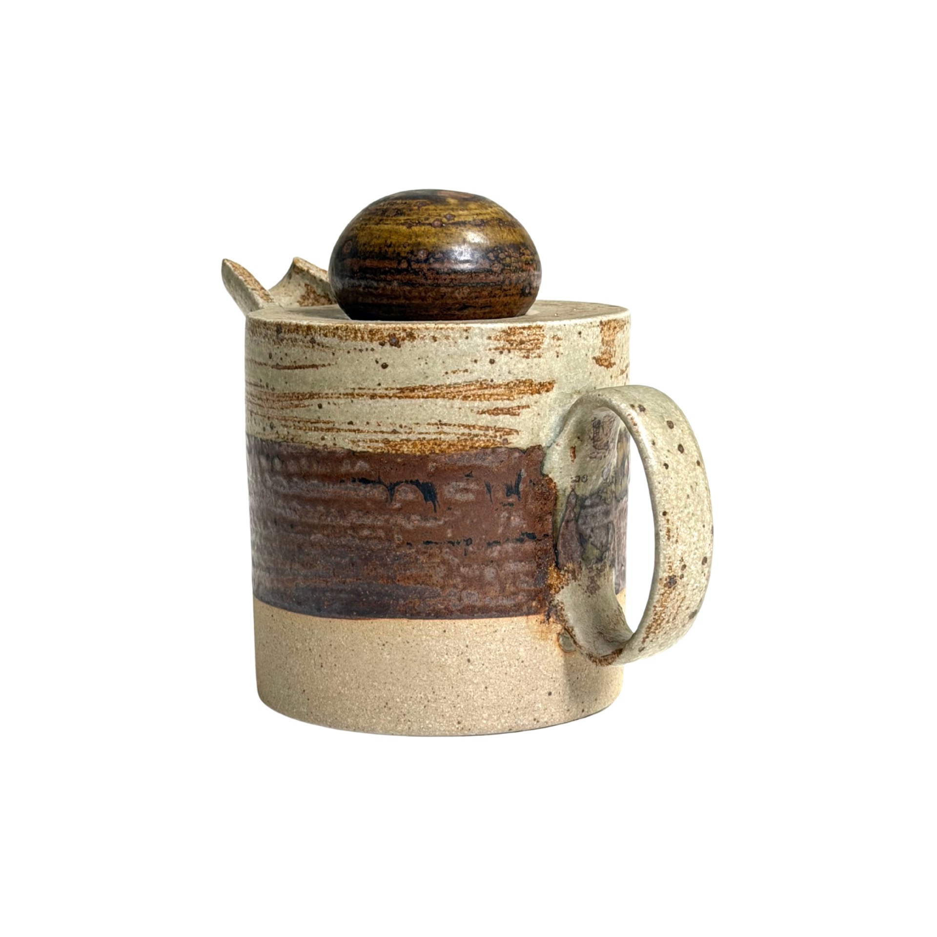 Tue Keramikin valmistama, Tue Poulsenin suunnittelema keraaminen kannu tai kahvipannu 1960-luvulta. Ruskea- ja hiekkasävyinen lasitus tuo esiin kauniit käsityön jäljet ja ajan patinan. Veistoksellinen nuppi ja pelkistetty muotoilu tekevät tästä käyttöesineestä myös upean sisustuselementin.