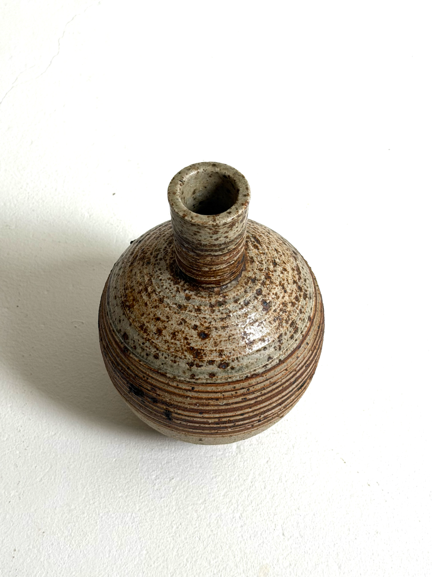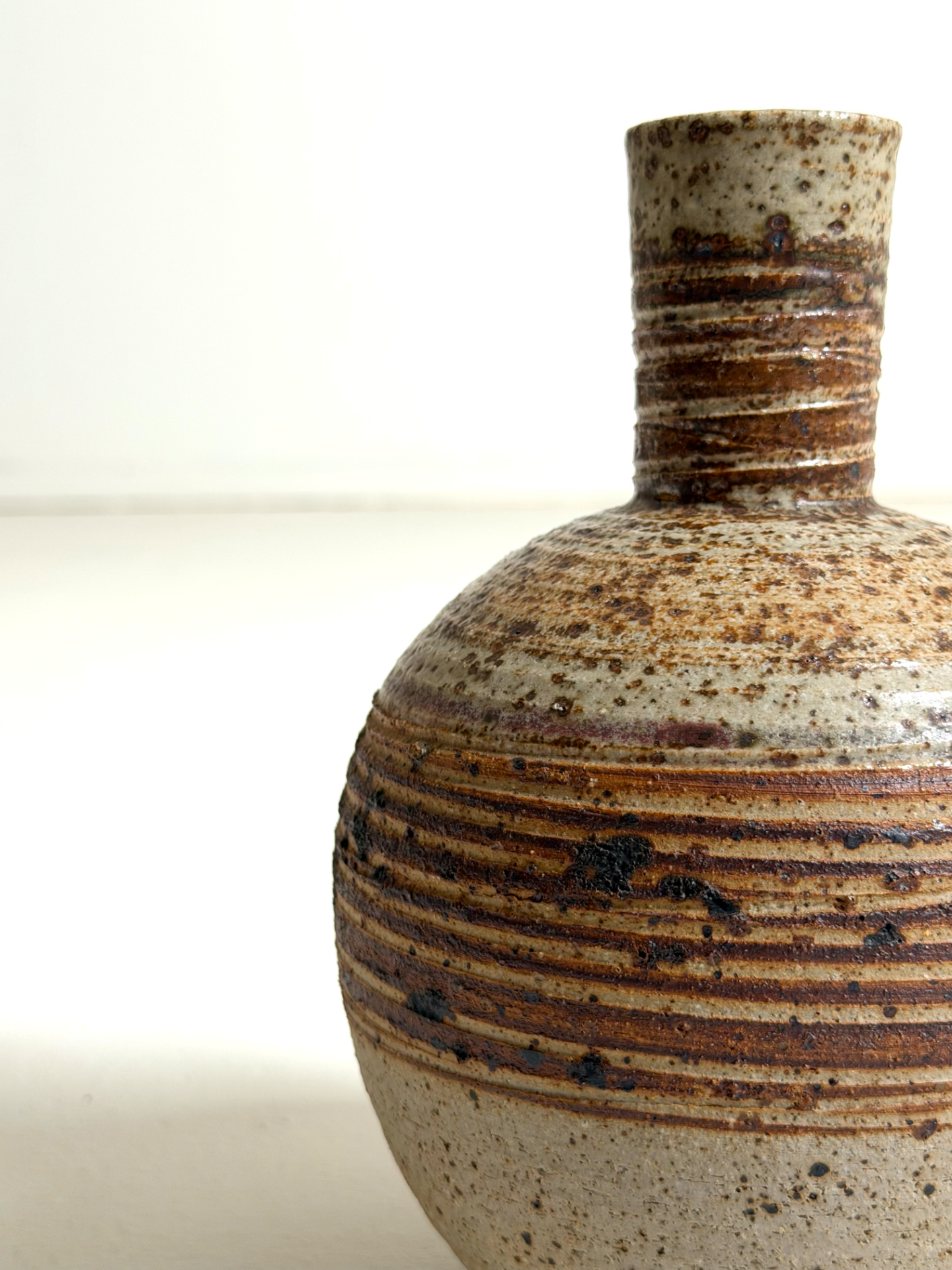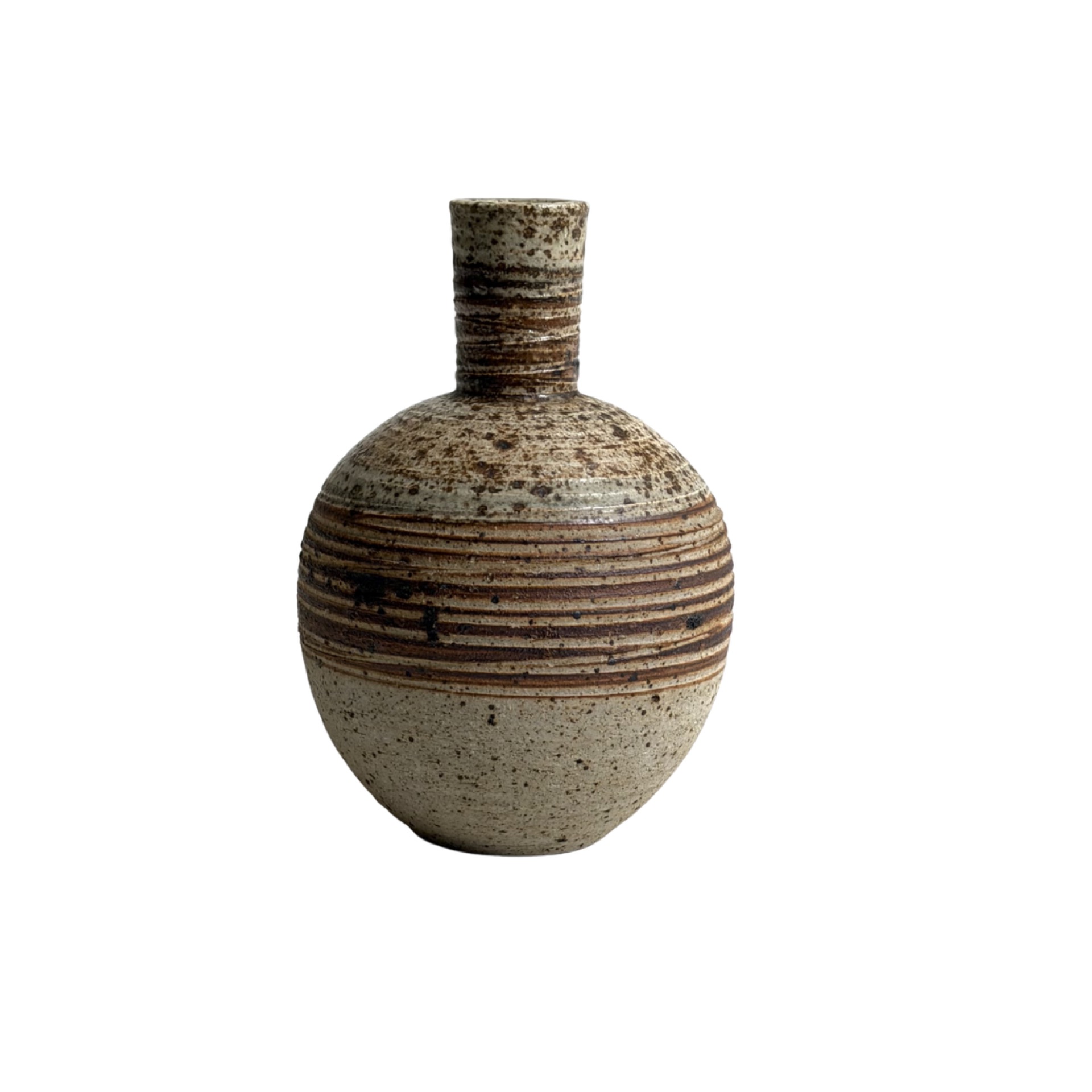 Muoto on harmoninen ja tasapainoinen: pyöreä, täyteläinen runko yhdistyy kapeaan kaulaan, luoden klassisen mutta persoonallisen siluetin. Lasitus on rikas ja elävä – hiekan sävyt, ruskeat raidat ja roiskeinen pinta tuovat esineeseen syvyyttä ja käsityön tuntua.