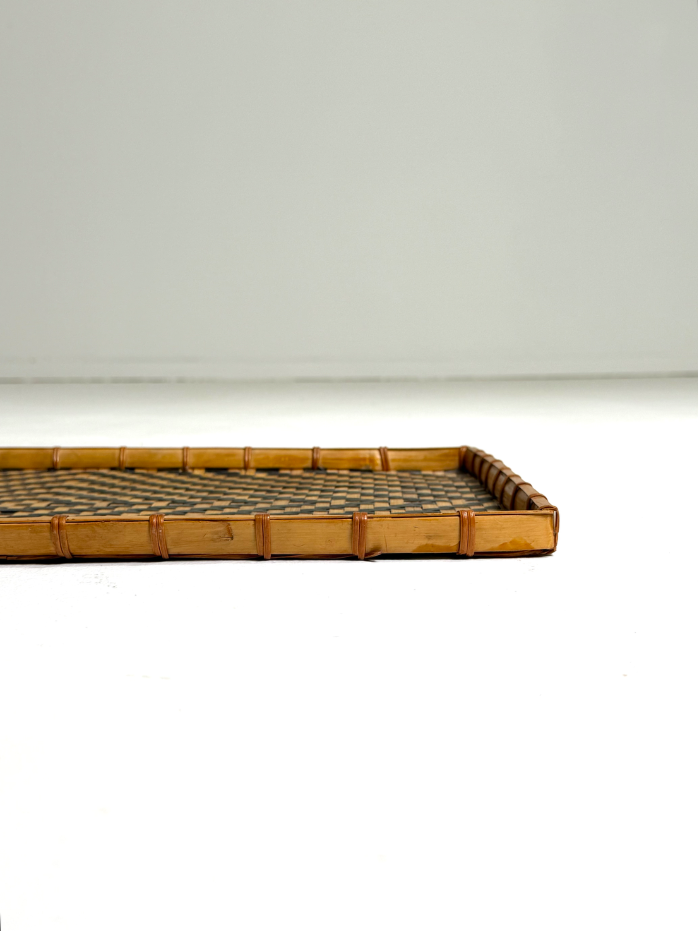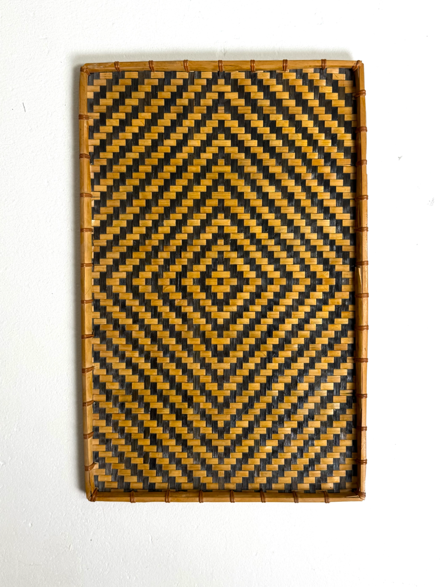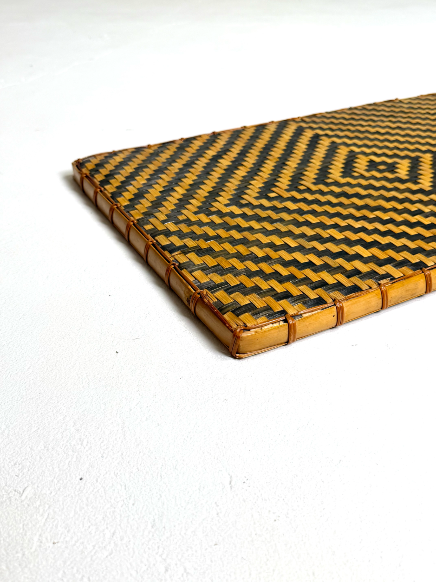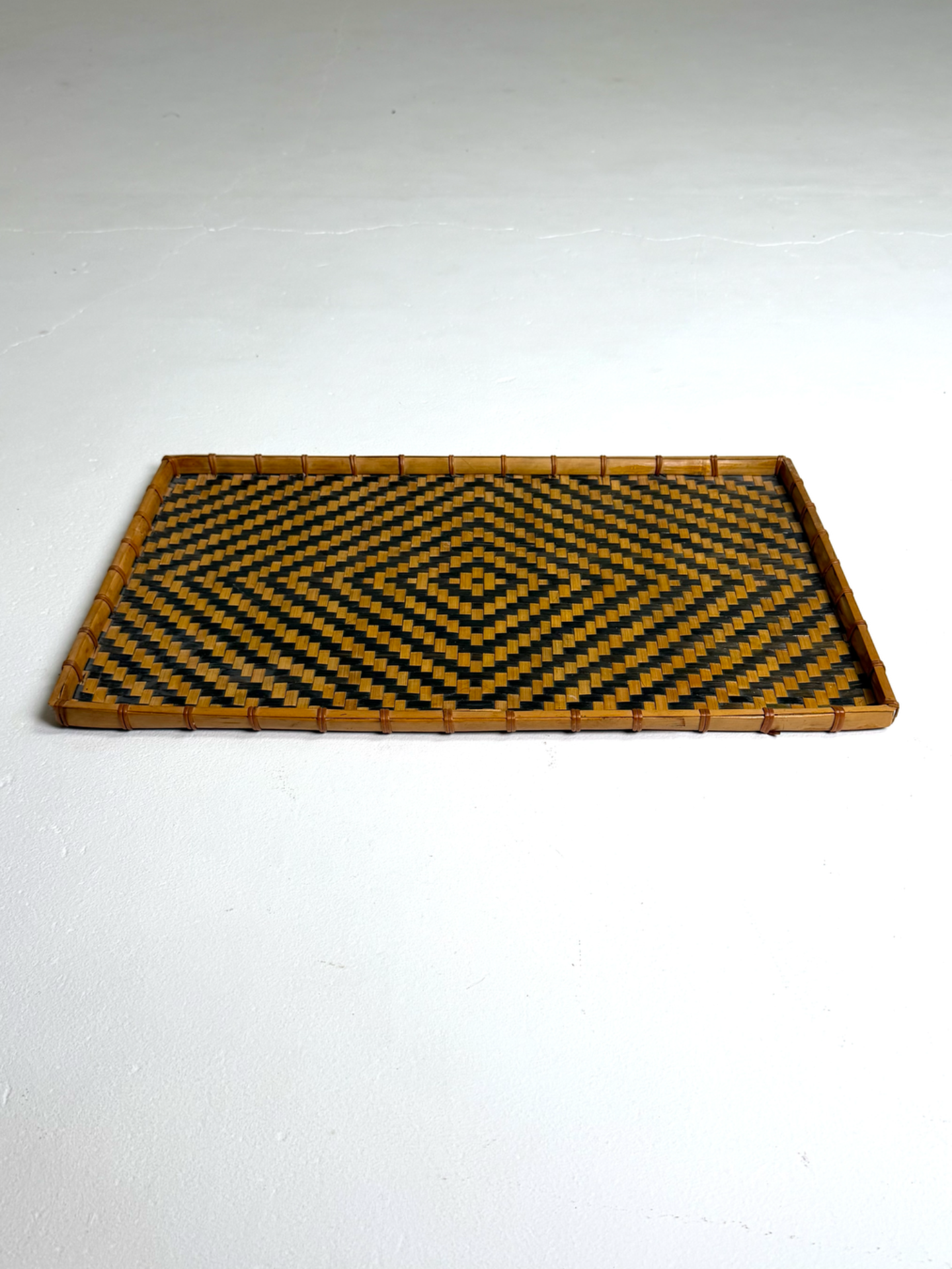 Kaunis vintage-tarjotin 1970-luvulta. Materiaalina luonnollinen rottinki ja bambu, joiden kudottu kuviointi luo näyttävän geometrisen ilmeen. Soveltuu hyvin tarjoiluun tai sisustuselementiksi esimerkiksi kahvipöydälle.